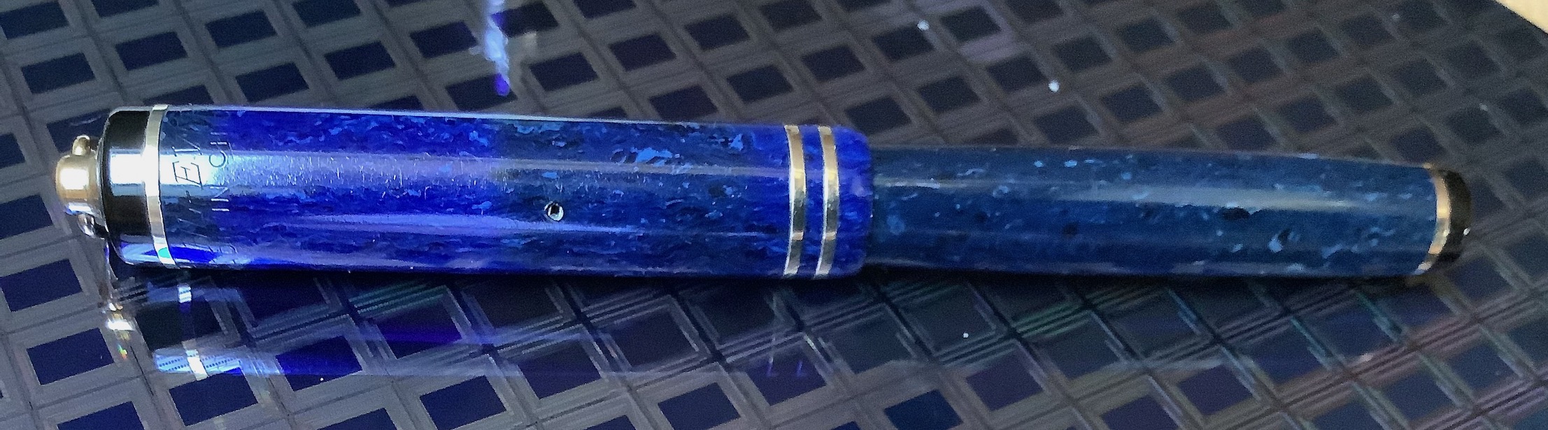 La colorazione originaria di questa penna doveva essere non molto dissimile dal colore dei cristalli di azzurrite , virata poi nel tempo in un colore molto più scuro e tendente al nero in alcune zone del fusto e del cappuccio.