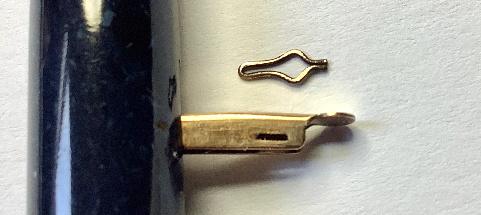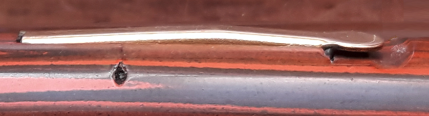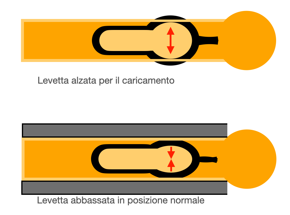 Terminata questa mera speculazione sul perchè della gobbetta , altra peculiarità di questo sistema è la presenza di una sorta di copiglia o anello in metallo elastico (non saprei come altro definirne la forma) inserito sotto le pareti interne alla levetta e dalle quali sbuca fuori una piccola porzione del tondo della copiglia che funge da fermo a molla quando la leva è in posizione abbassata : le porzioni di copiglia spingono leggermente sulle pareti interne del fusto della penna tenendo fermo ed in posizione la levetta, non consentendo che questa si alzi accidentalmente, anche di poco.