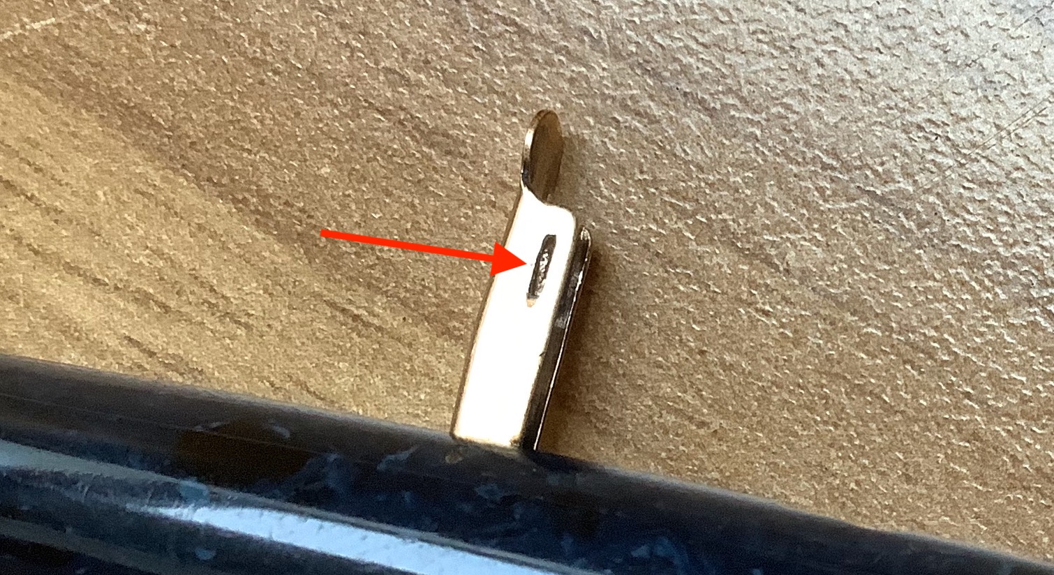 Copiglia estratta dalla sede. Si può notare sulla parete della levetta la fessura dalla quale si affaccia parte della copiglia