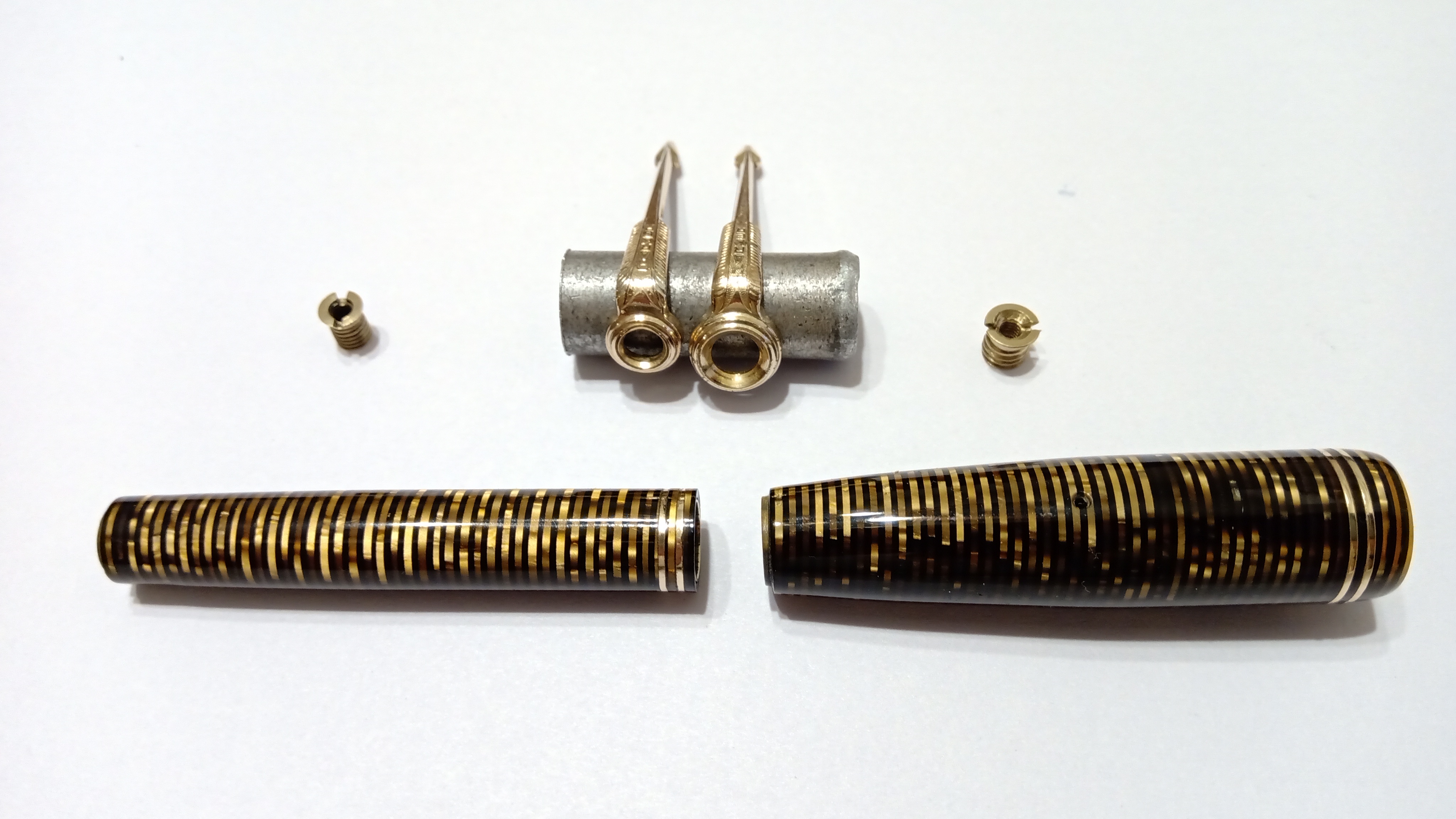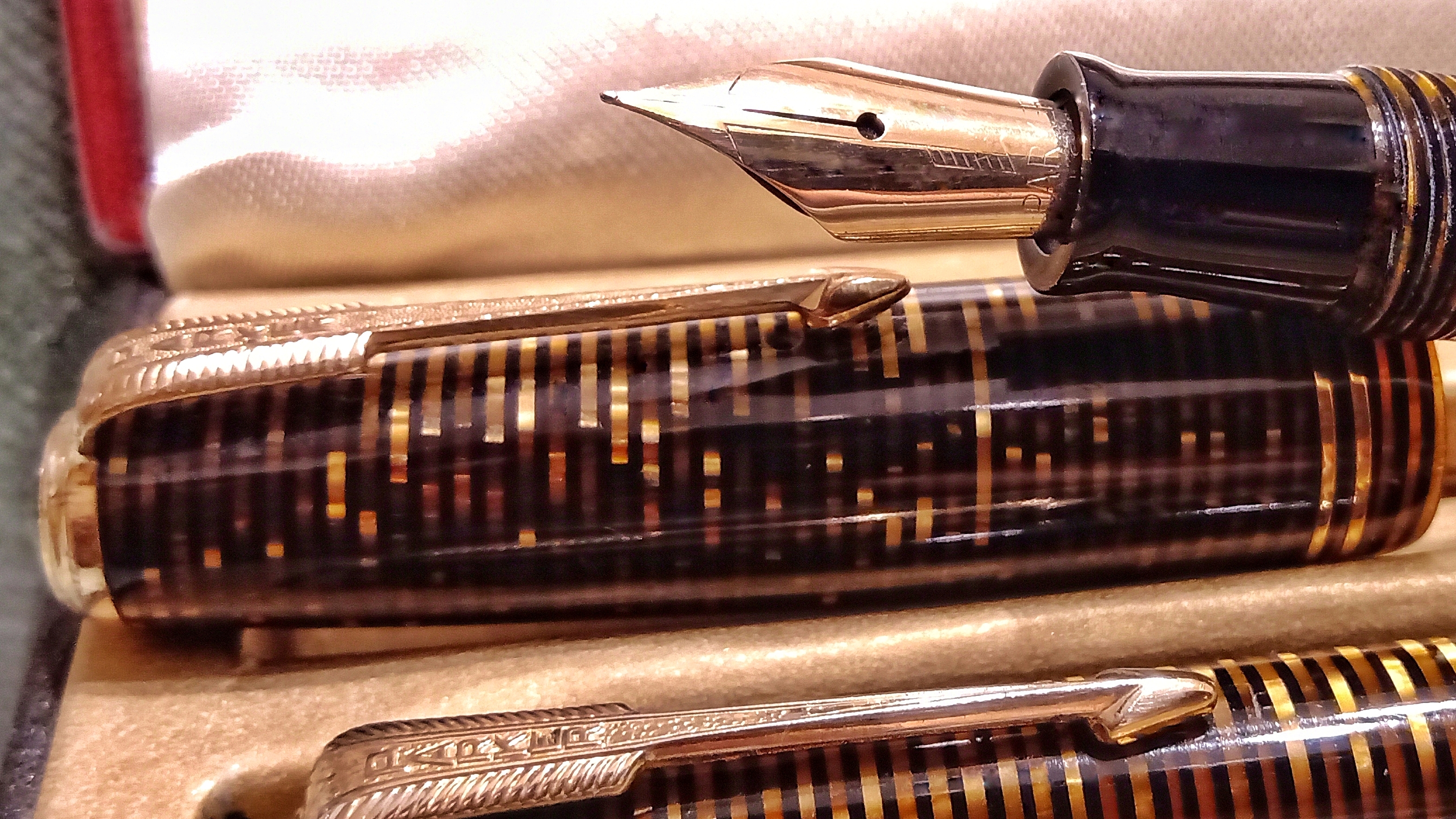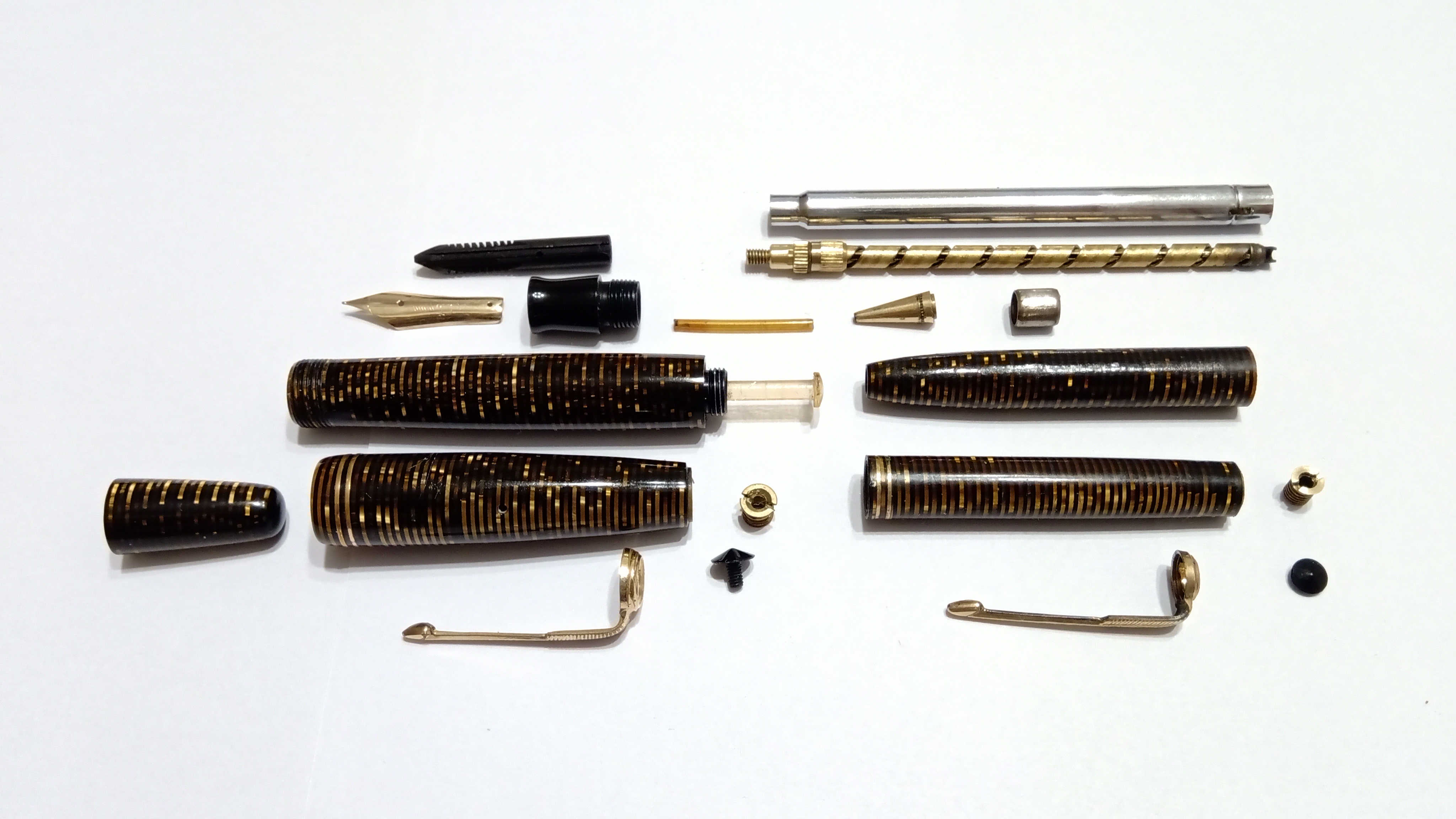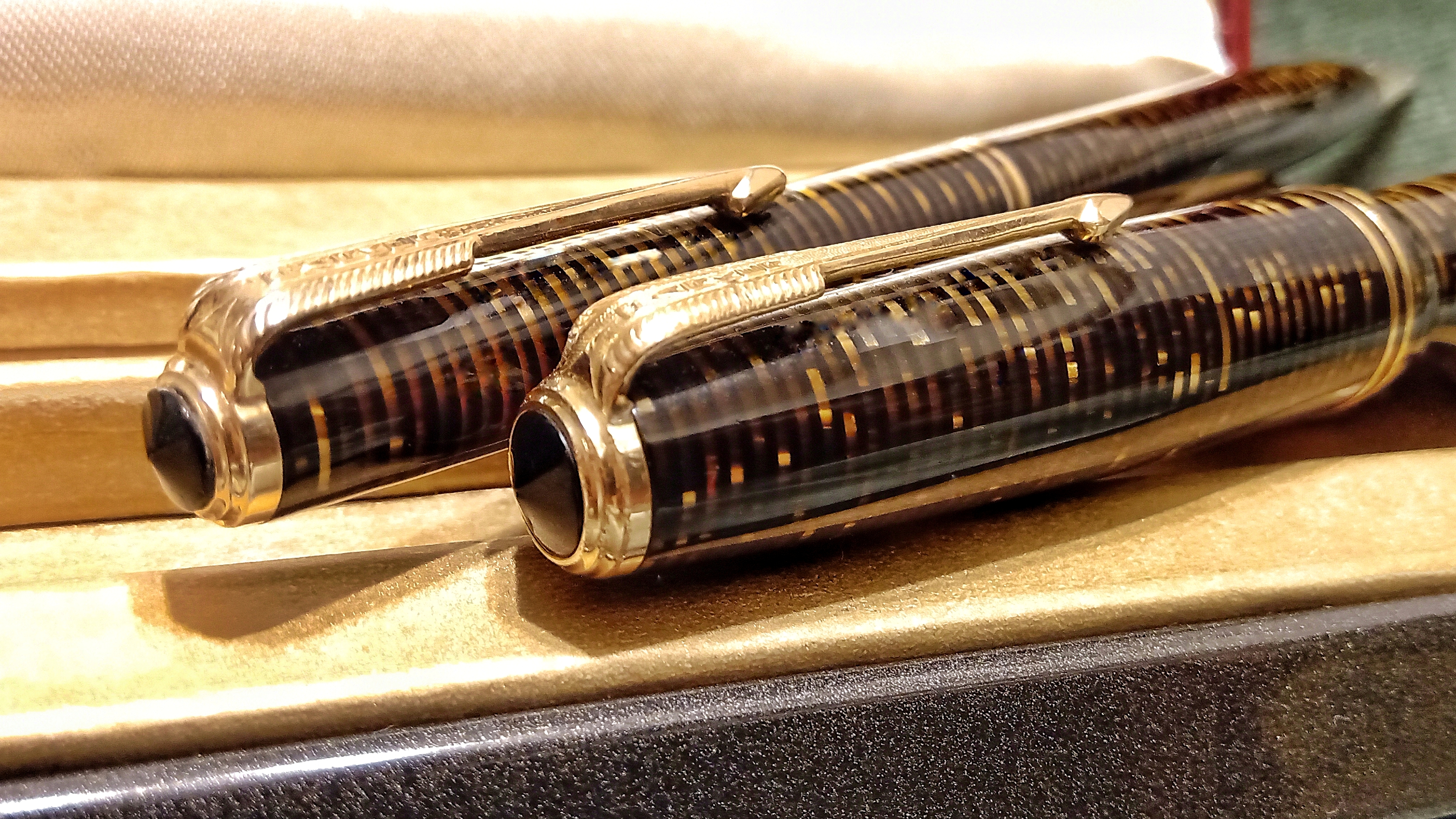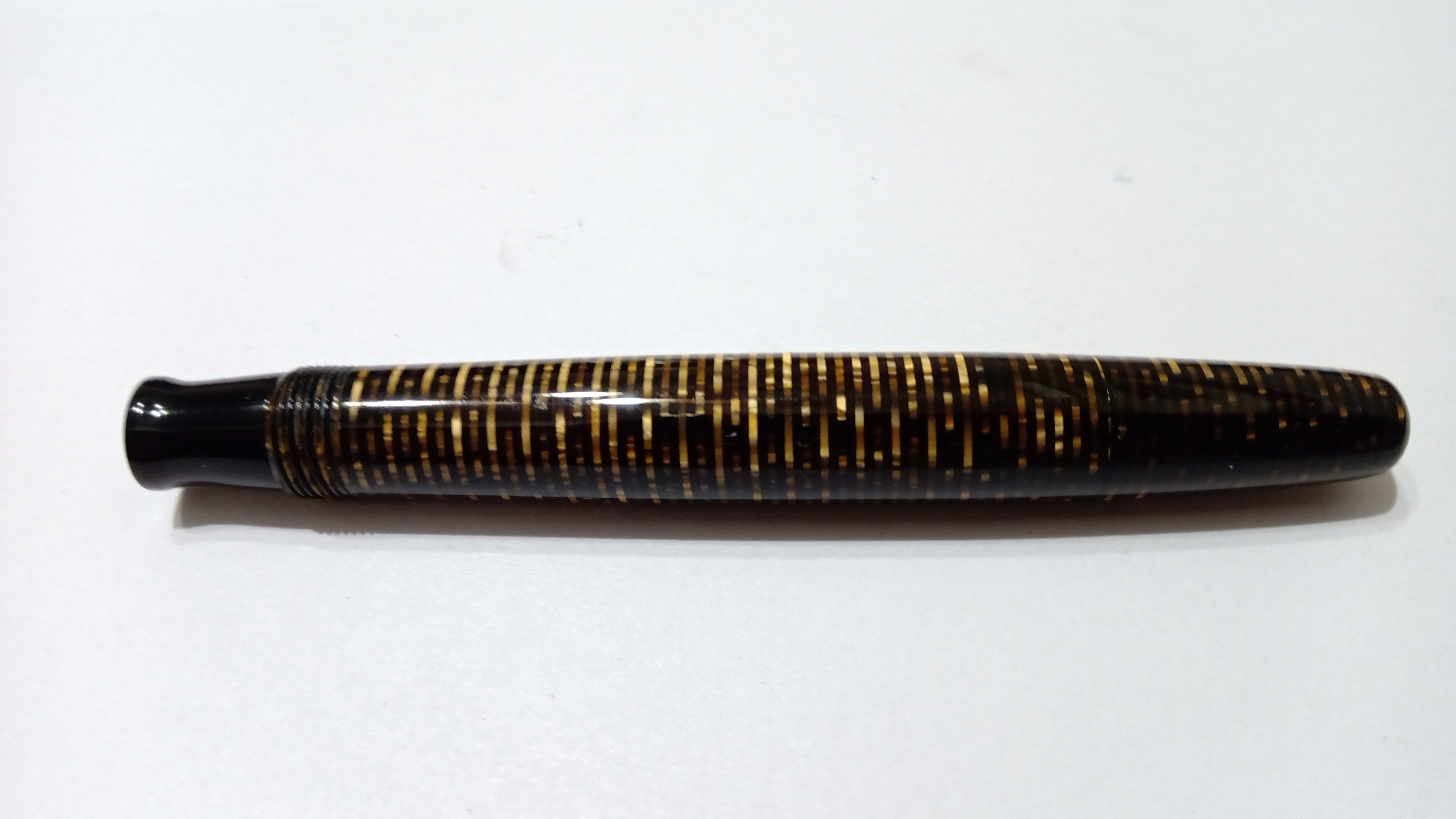 Oggi volevo condividere con voi il restauro di una penna stilografica, portamine e cofanetto, di un prodotto Parker che si chiamava Vacumatic Debutante Junior, una bellissima penna realizzata in celluloide laminata con anelli dorati sulla sua struttura, sistema di ricarica vacumatic, a vista pennino semiflessibile in oro, serbatoio dell'inchiostro traslucido, cappuccio con doppi anelli laminati in oro e un semplice gioiello nero a coronamento della sua clip, anch'esso in oro laminato.