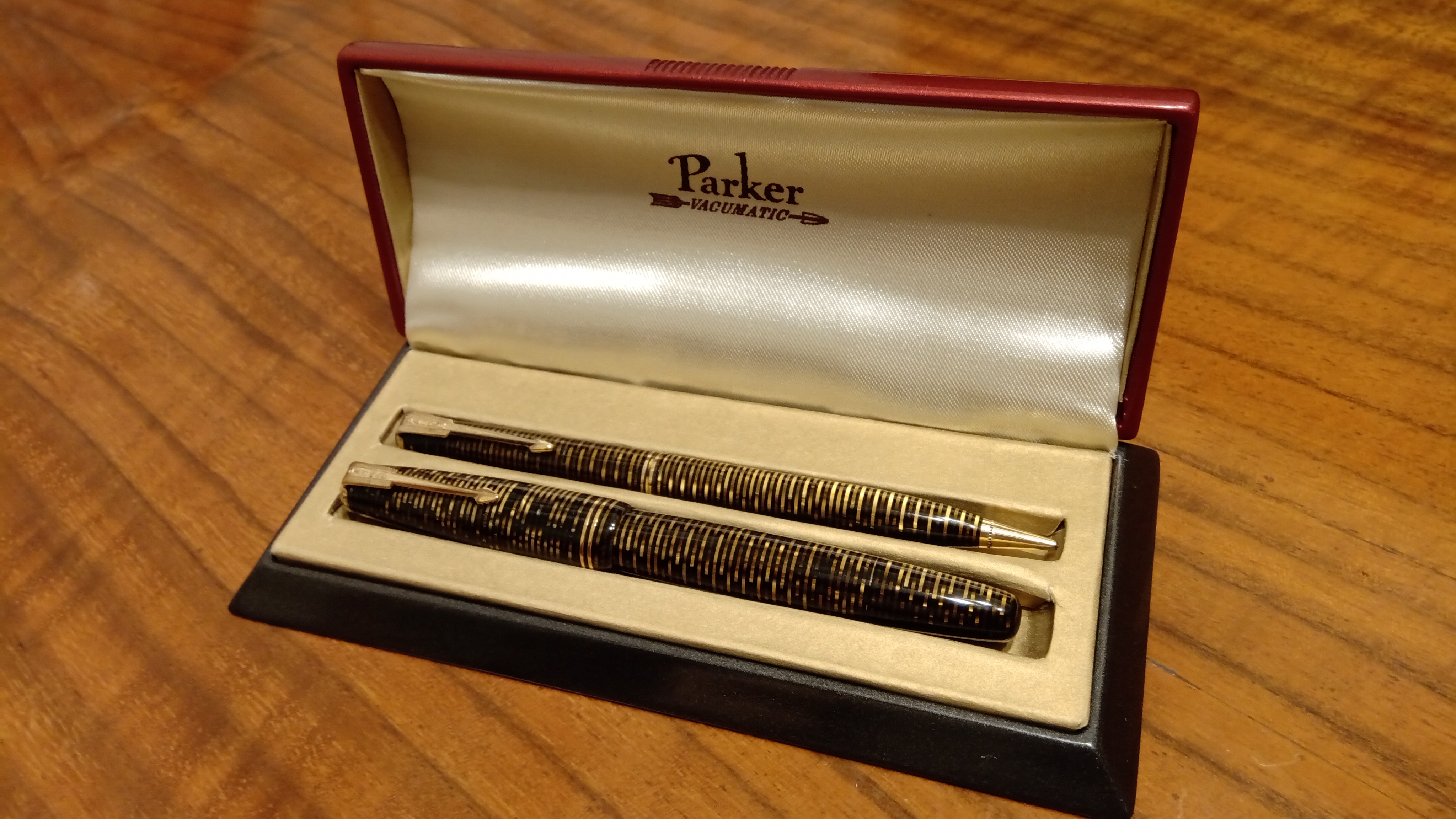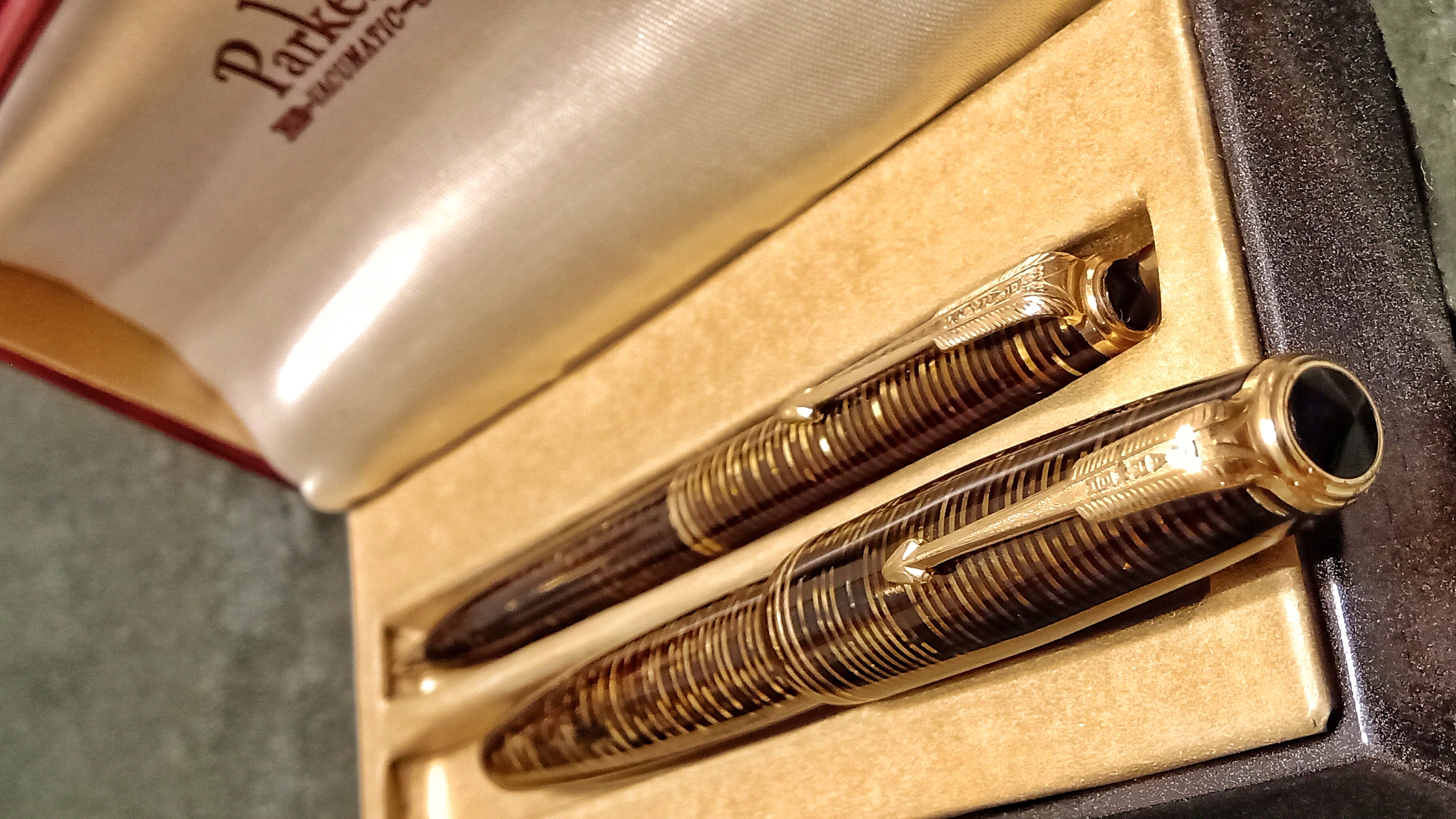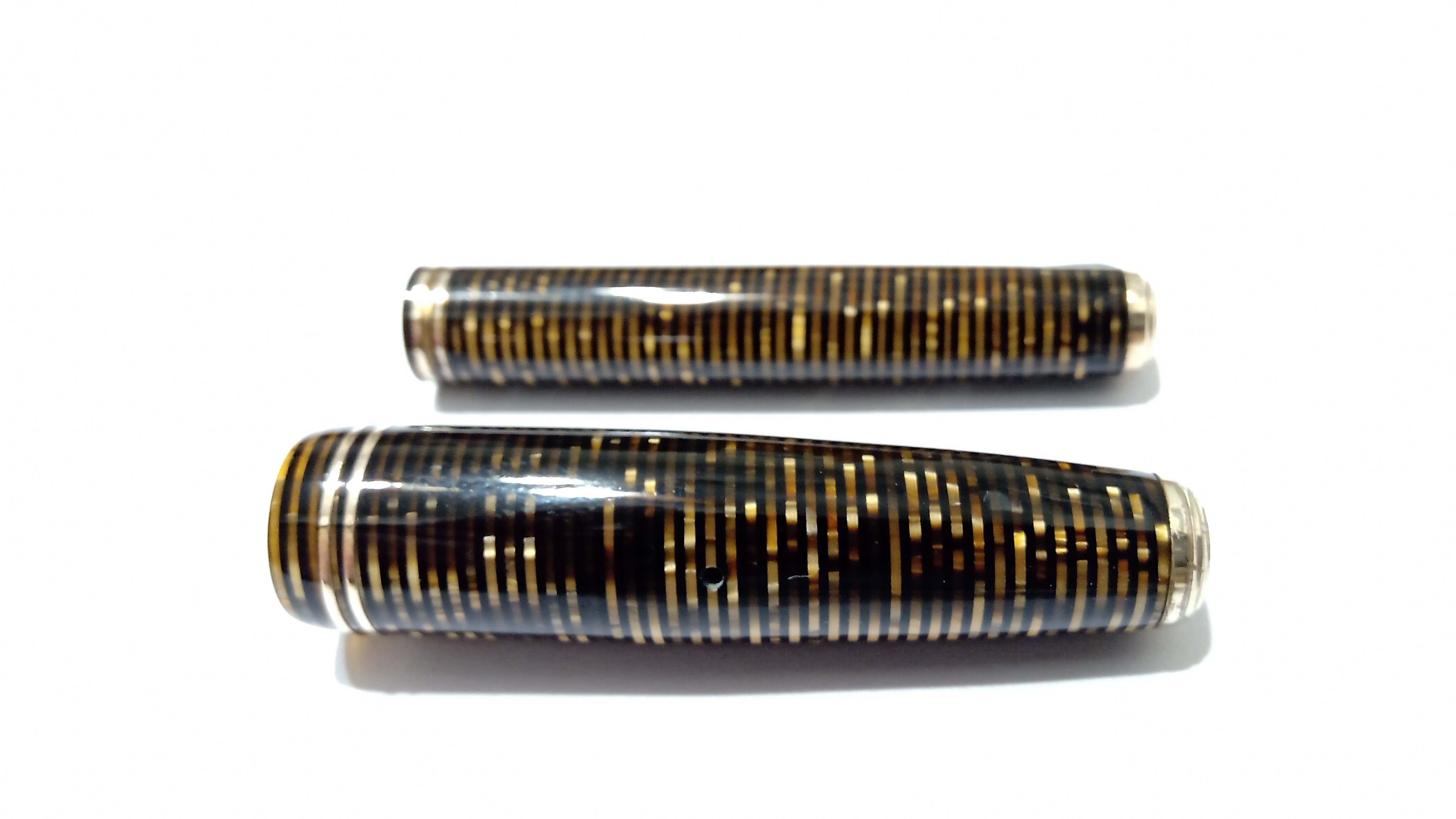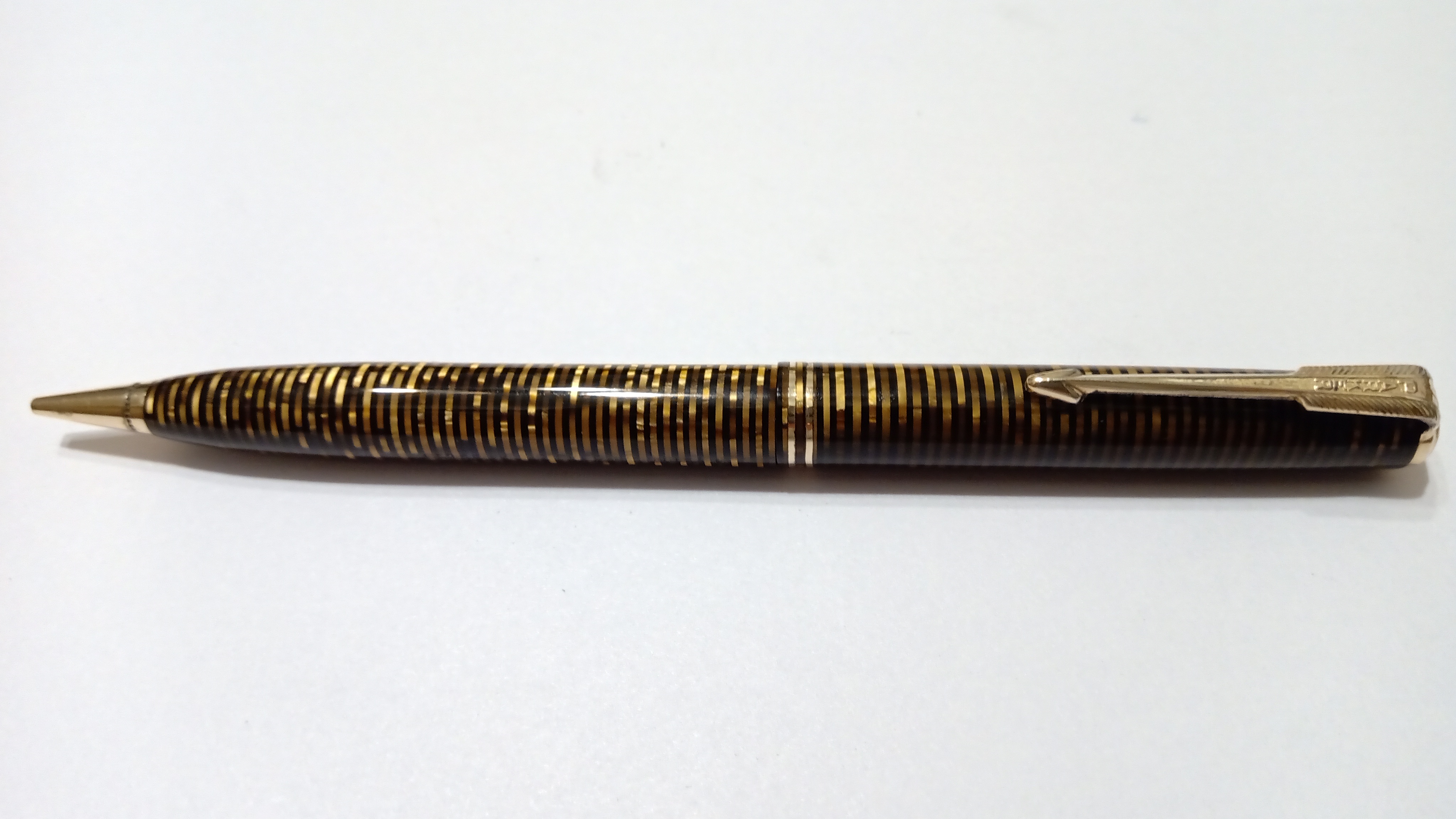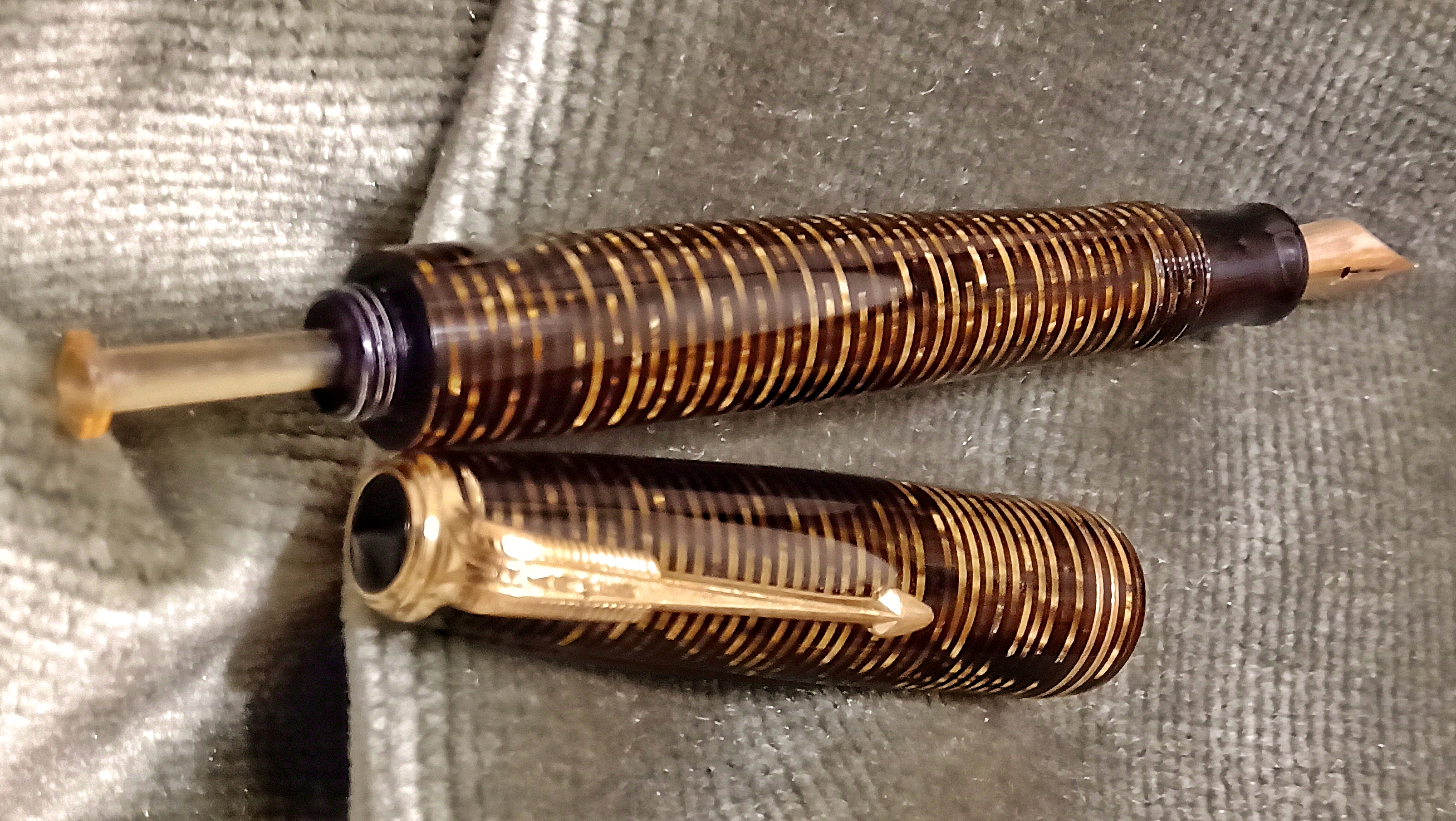 Oggi volevo condividere con voi il restauro di una penna stilografica, portamine e cofanetto, di un prodotto Parker che si chiamava Vacumatic Debutante Junior, una bellissima penna realizzata in celluloide laminata con anelli dorati sulla sua struttura, sistema di ricarica vacumatic, a vista pennino semiflessibile in oro, serbatoio dell'inchiostro traslucido, cappuccio con doppi anelli laminati in oro e un semplice gioiello nero a coronamento della sua clip, anch'esso in oro laminato.