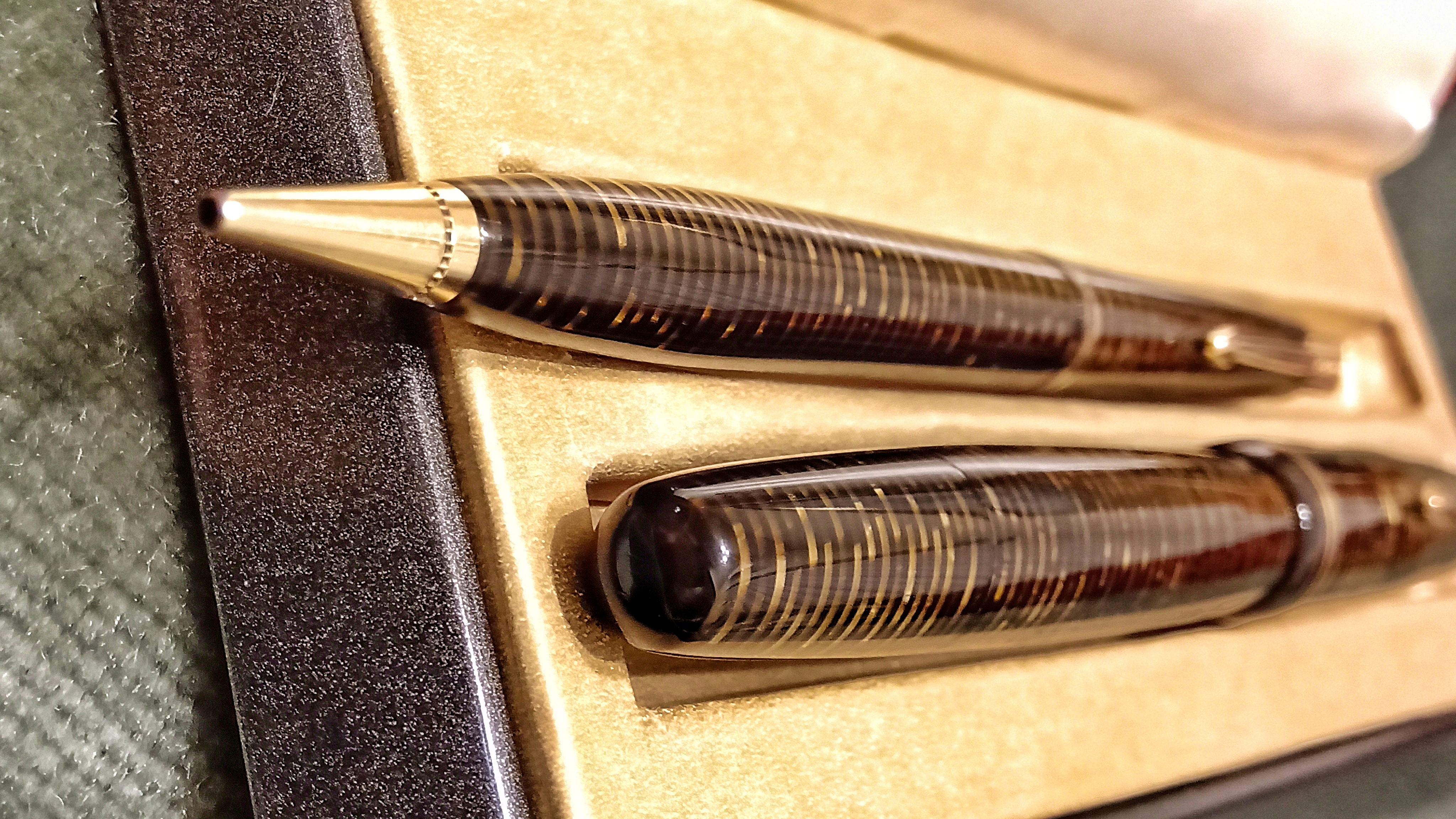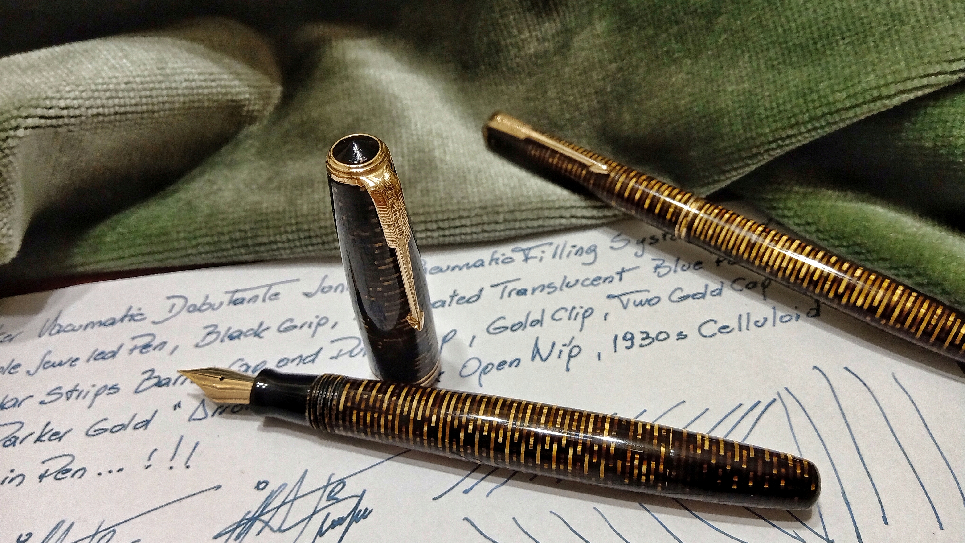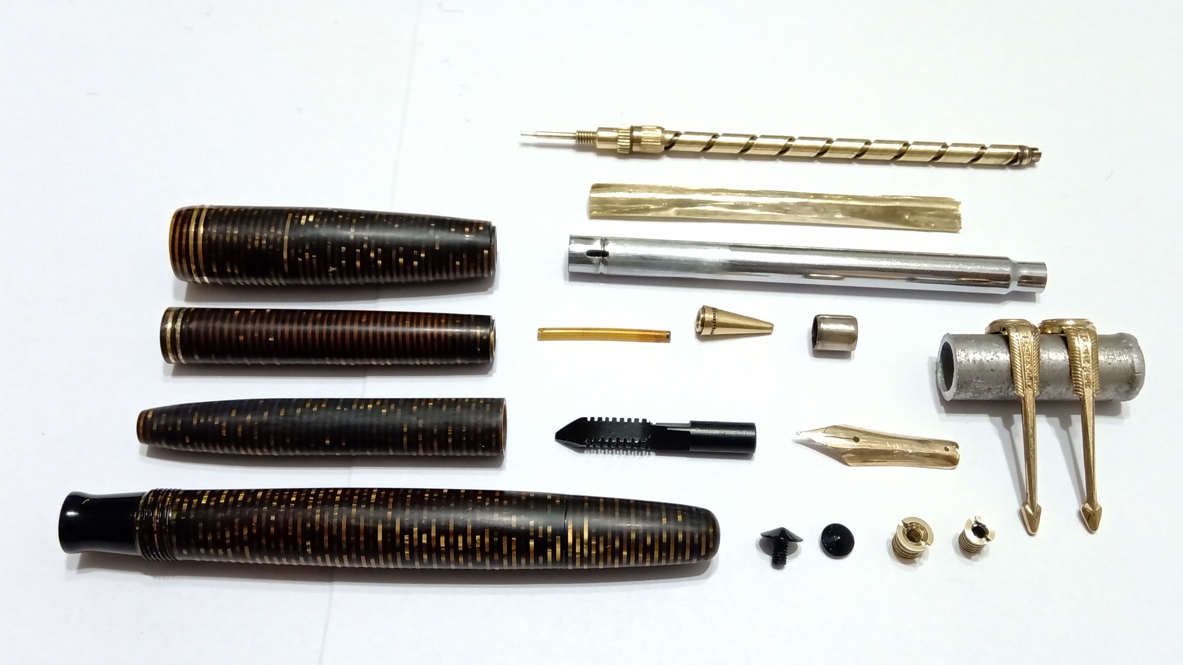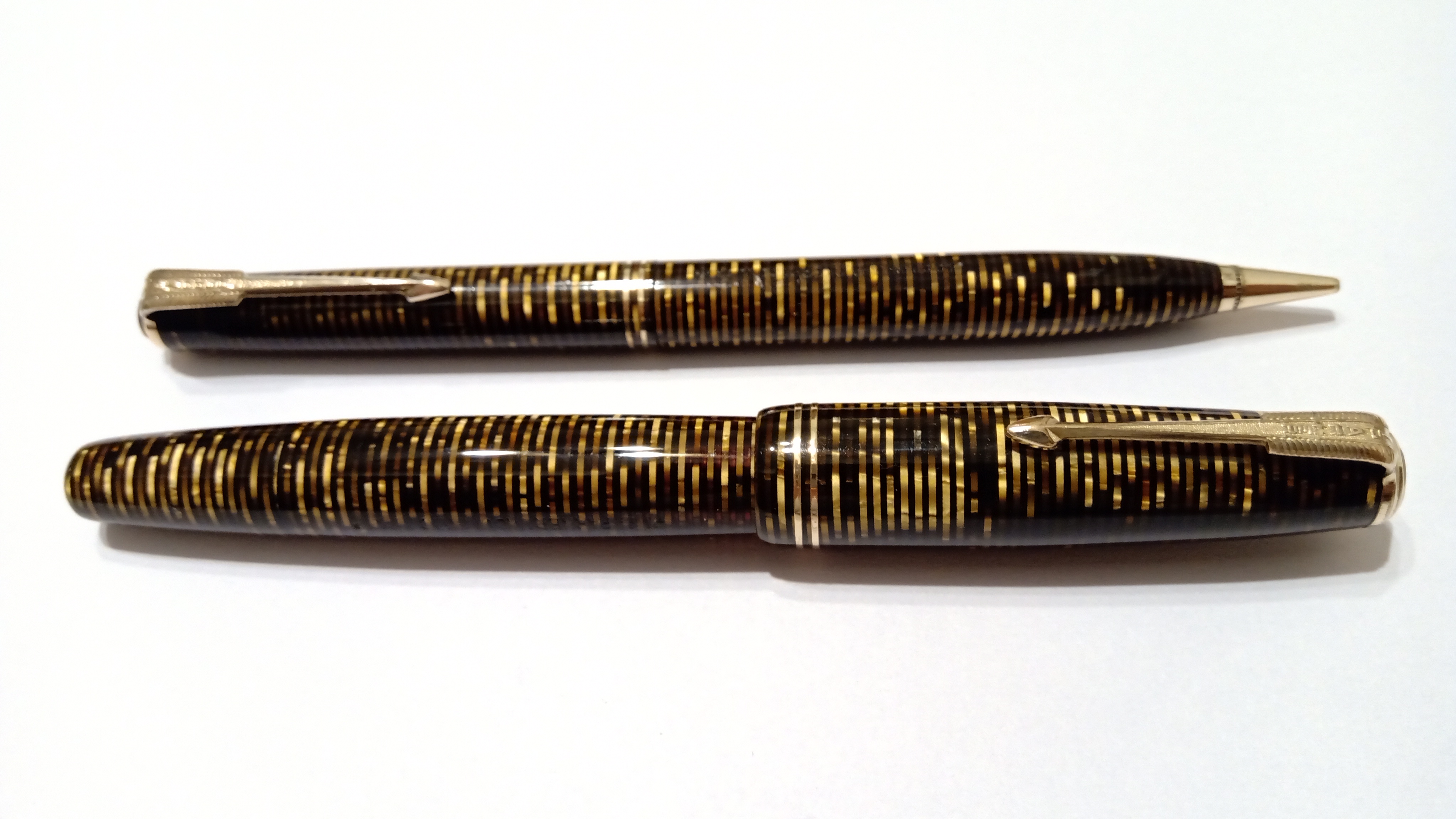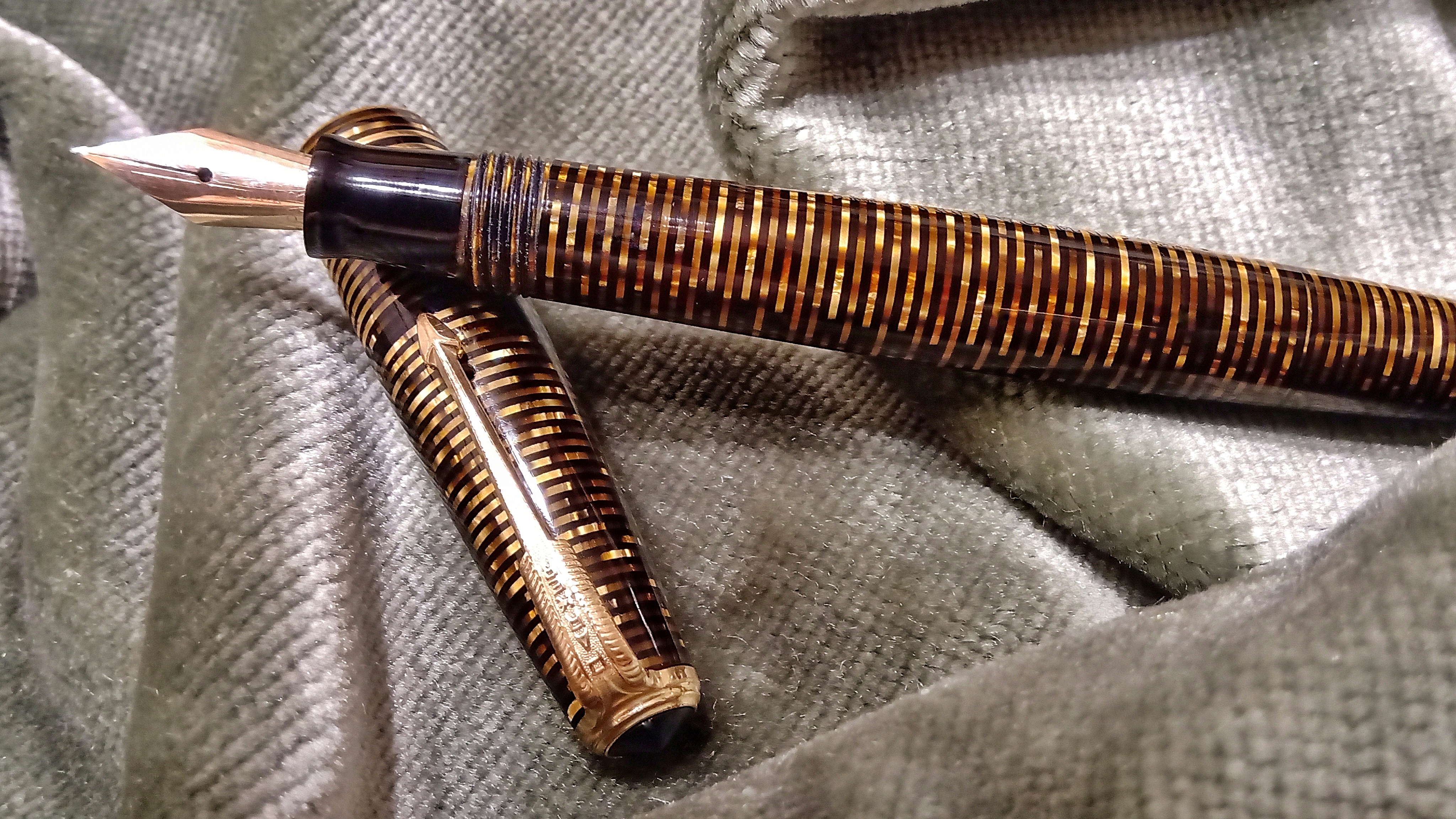 Oggi volevo condividere con voi il restauro di una penna stilografica, portamine e cofanetto, di un prodotto Parker che si chiamava Vacumatic Debutante Junior, una bellissima penna realizzata in celluloide laminata con anelli dorati sulla sua struttura, sistema di ricarica vacumatic, a vista pennino semiflessibile in oro, serbatoio dell'inchiostro traslucido, cappuccio con doppi anelli laminati in oro e un semplice gioiello nero a coronamento della sua clip, anch'esso in oro laminato.