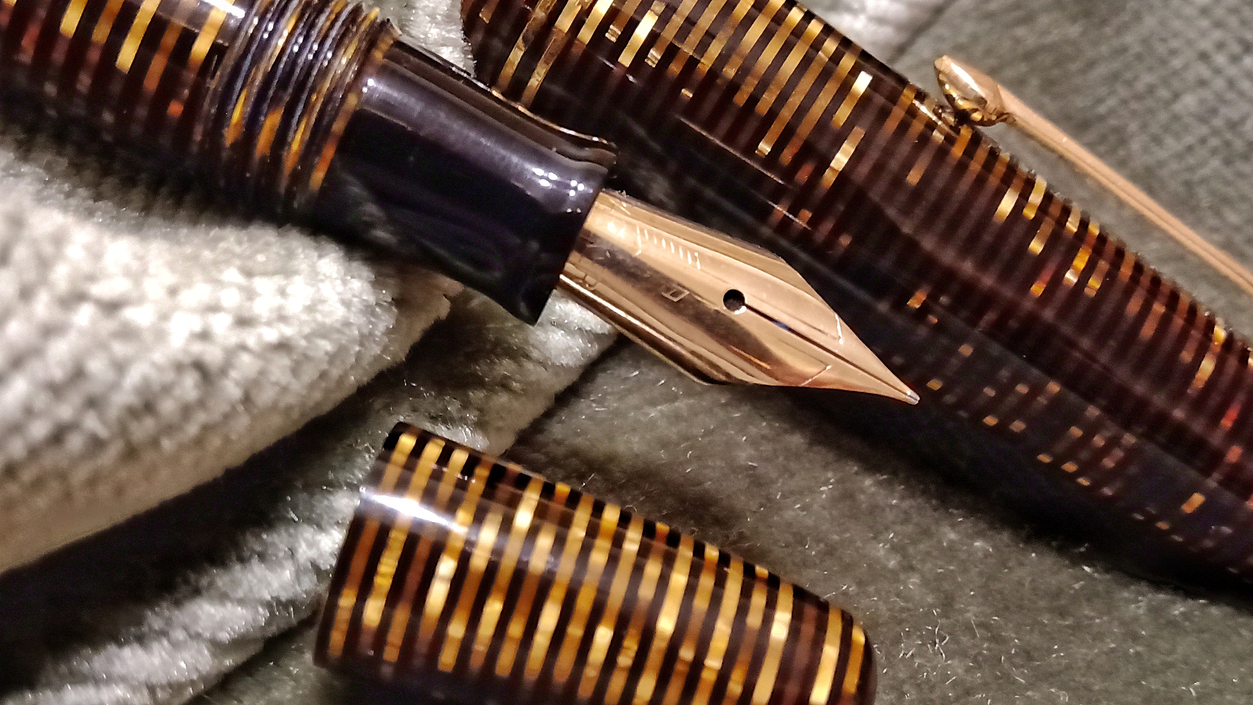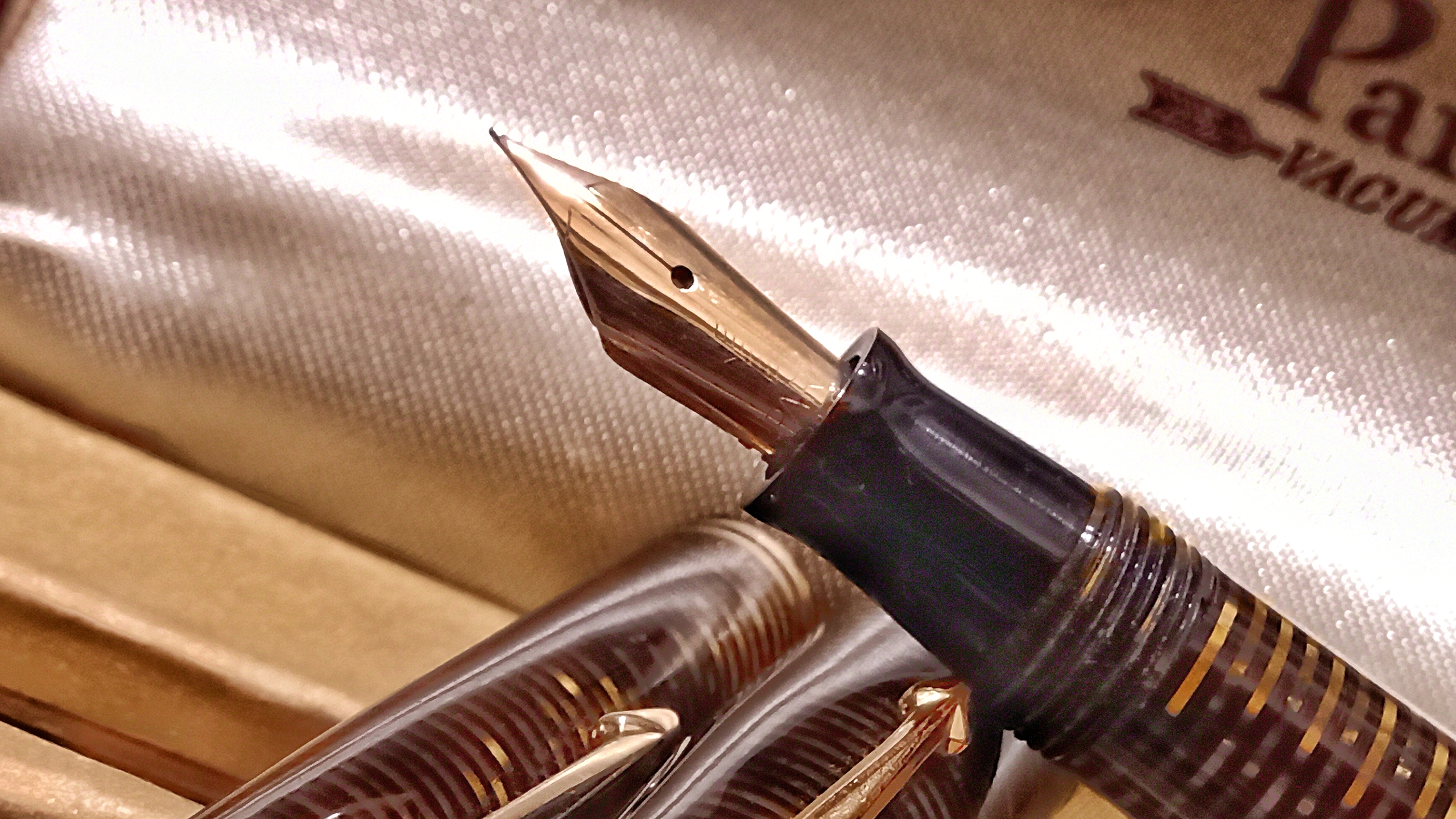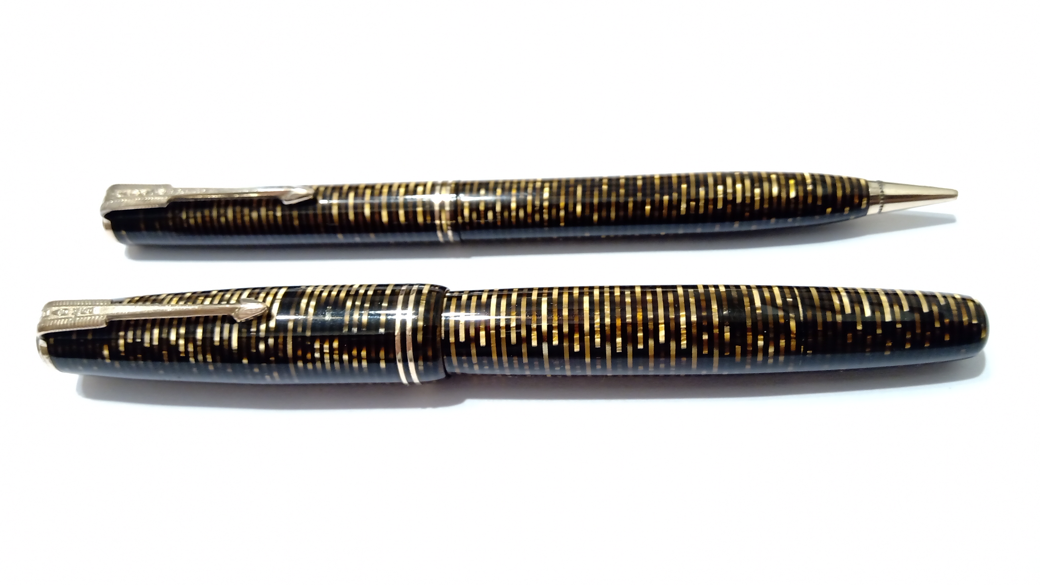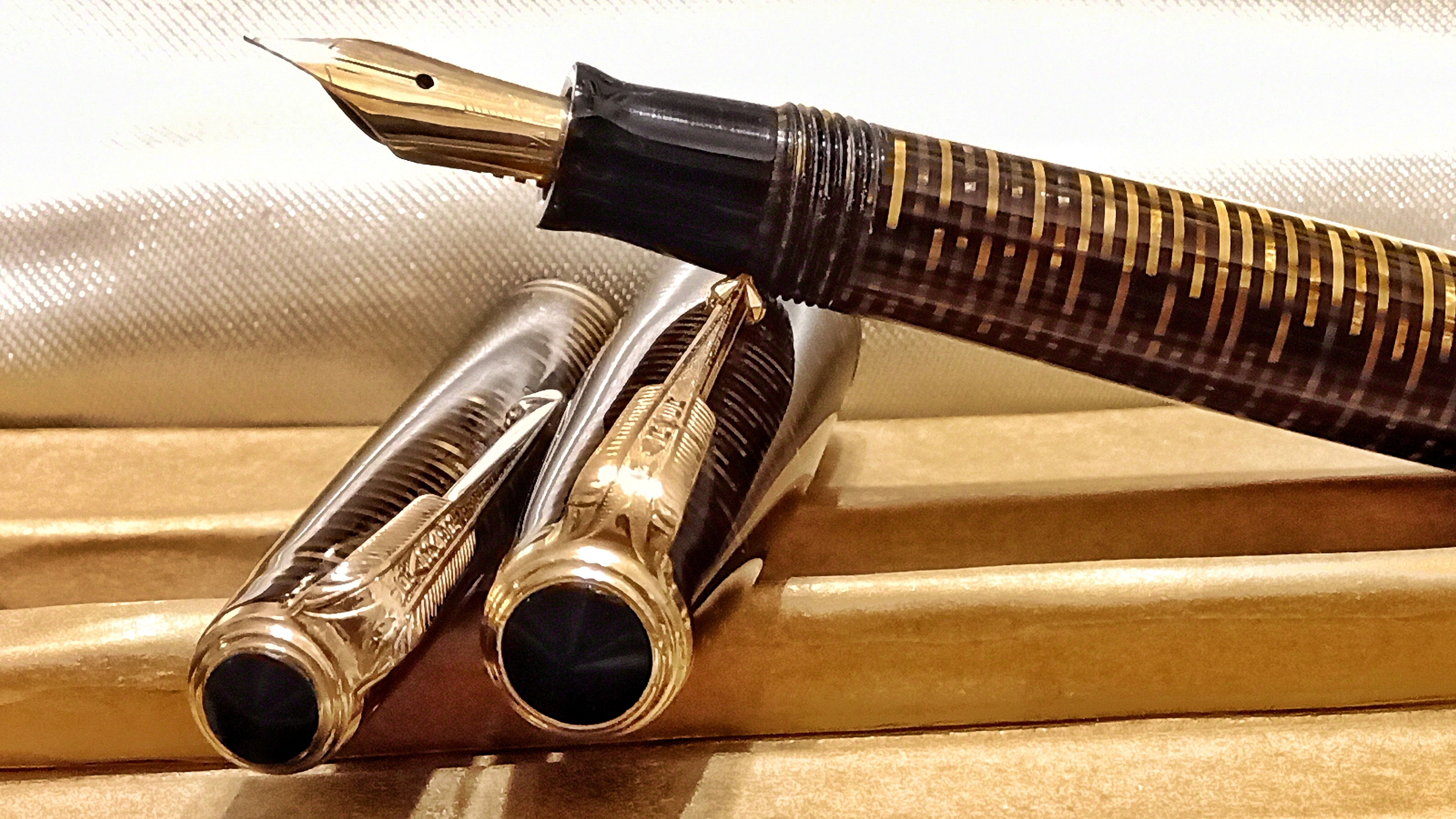 Oggi volevo condividere con voi il restauro di una penna stilografica, portamine e cofanetto, di un prodotto Parker che si chiamava Vacumatic Debutante Junior, una bellissima penna realizzata in celluloide laminata con anelli dorati sulla sua struttura, sistema di ricarica vacumatic, a vista pennino semiflessibile in oro, serbatoio dell'inchiostro traslucido, cappuccio con doppi anelli laminati in oro e un semplice gioiello nero a coronamento della sua clip, anch'esso in oro laminato.