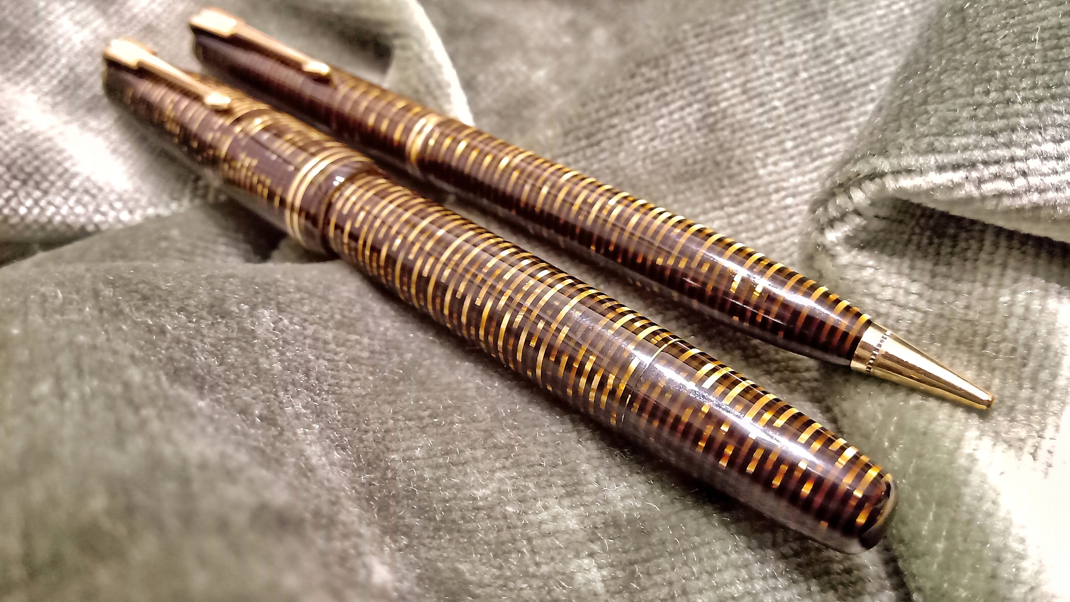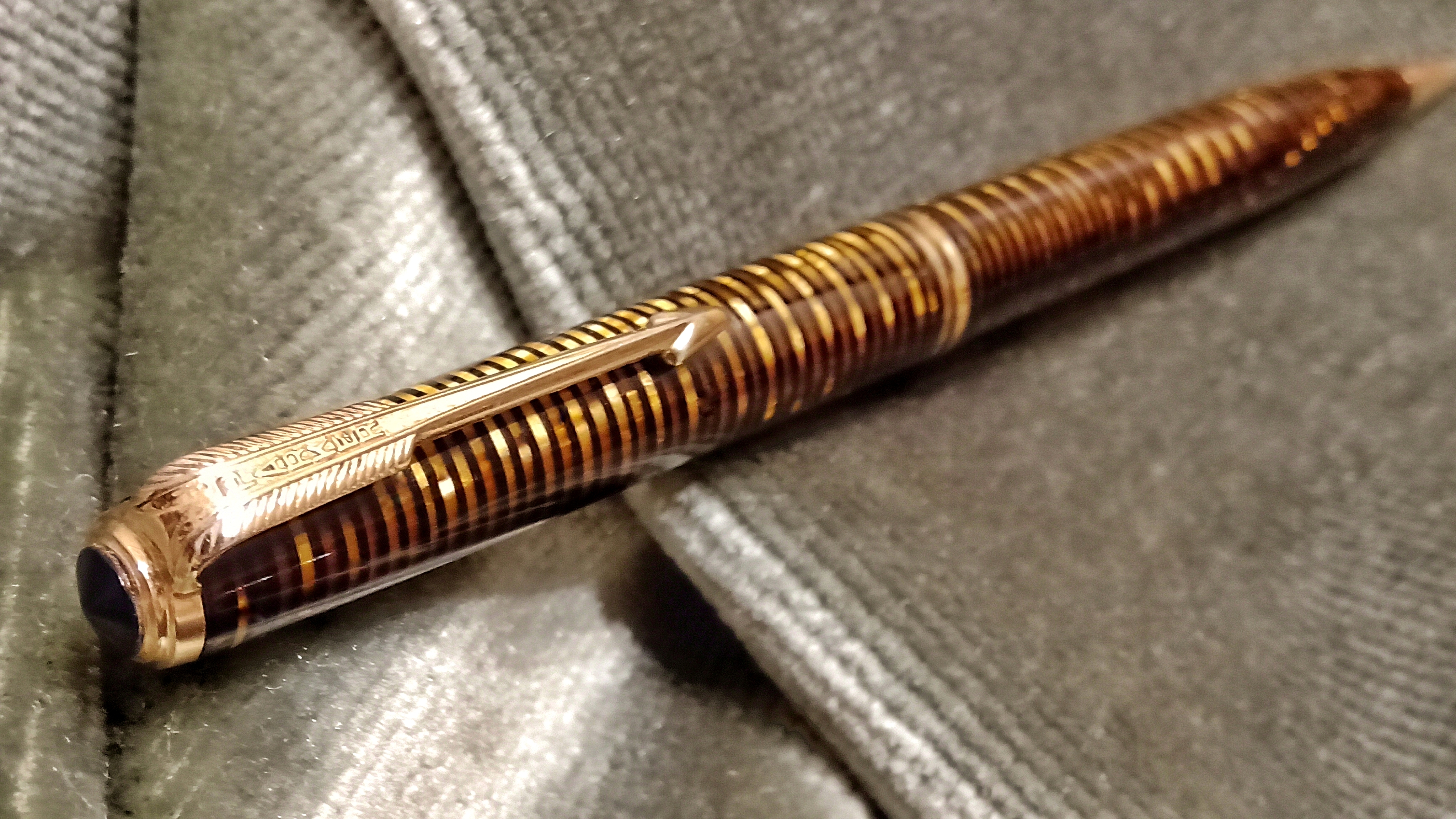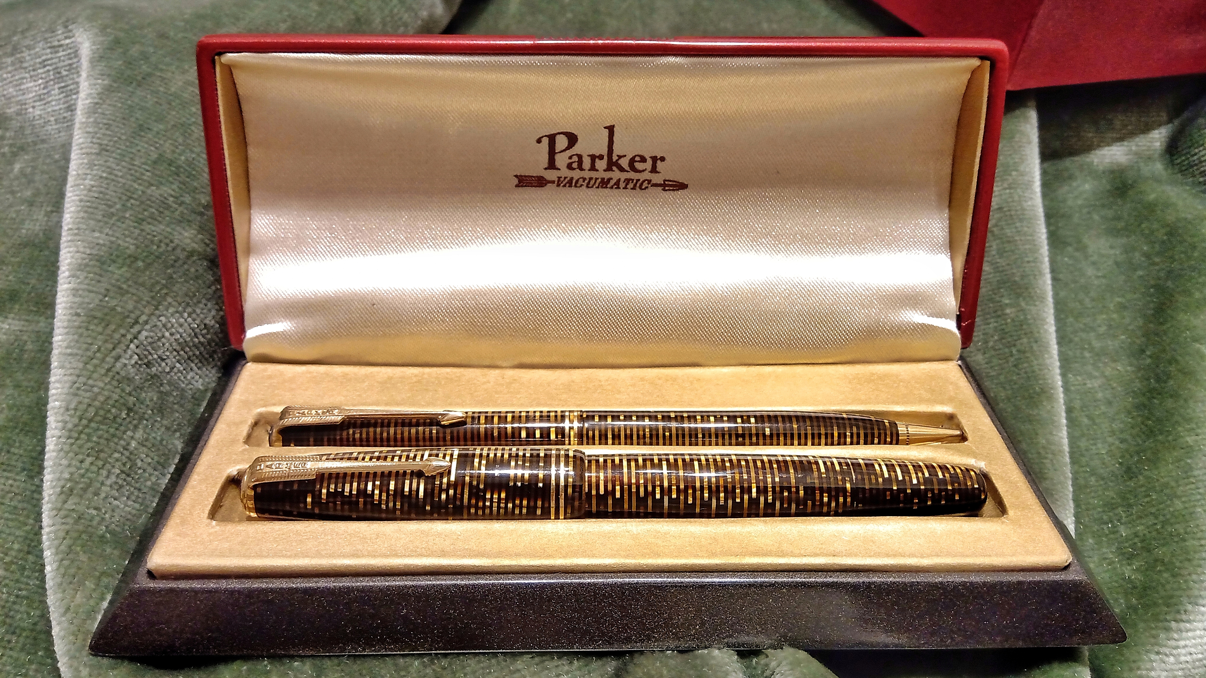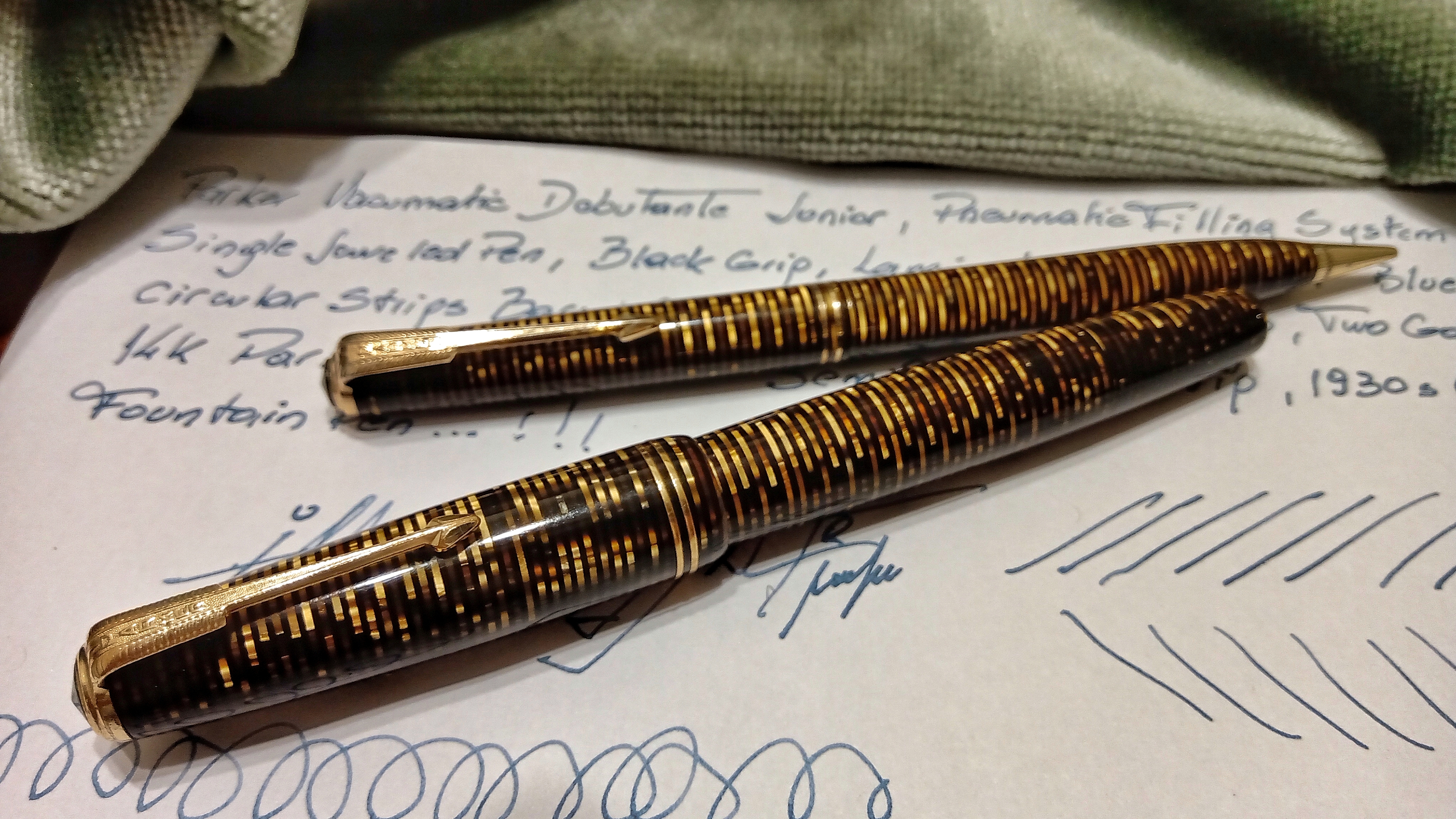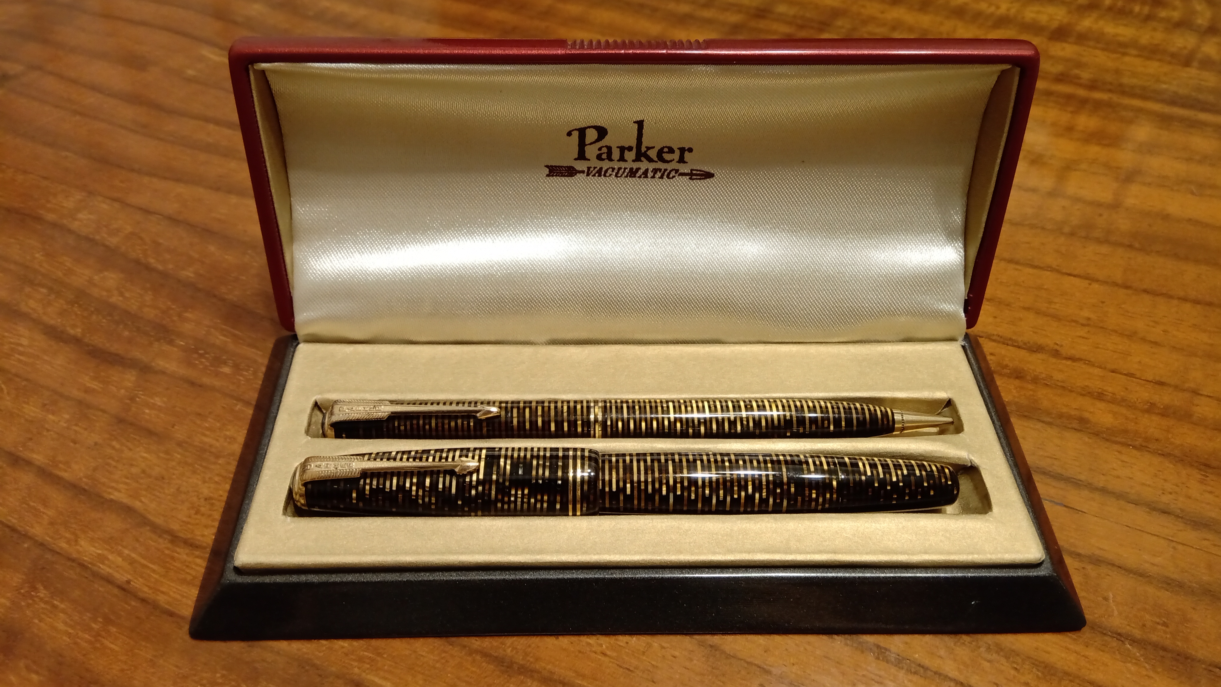 Oggi volevo condividere con voi il restauro di una penna stilografica, portamine e cofanetto, di un prodotto Parker che si chiamava Vacumatic Debutante Junior, una bellissima penna realizzata in celluloide laminata con anelli dorati sulla sua struttura, sistema di ricarica vacumatic, a vista pennino semiflessibile in oro, serbatoio dell'inchiostro traslucido, cappuccio con doppi anelli laminati in oro e un semplice gioiello nero a coronamento della sua clip, anch'esso in oro laminato.