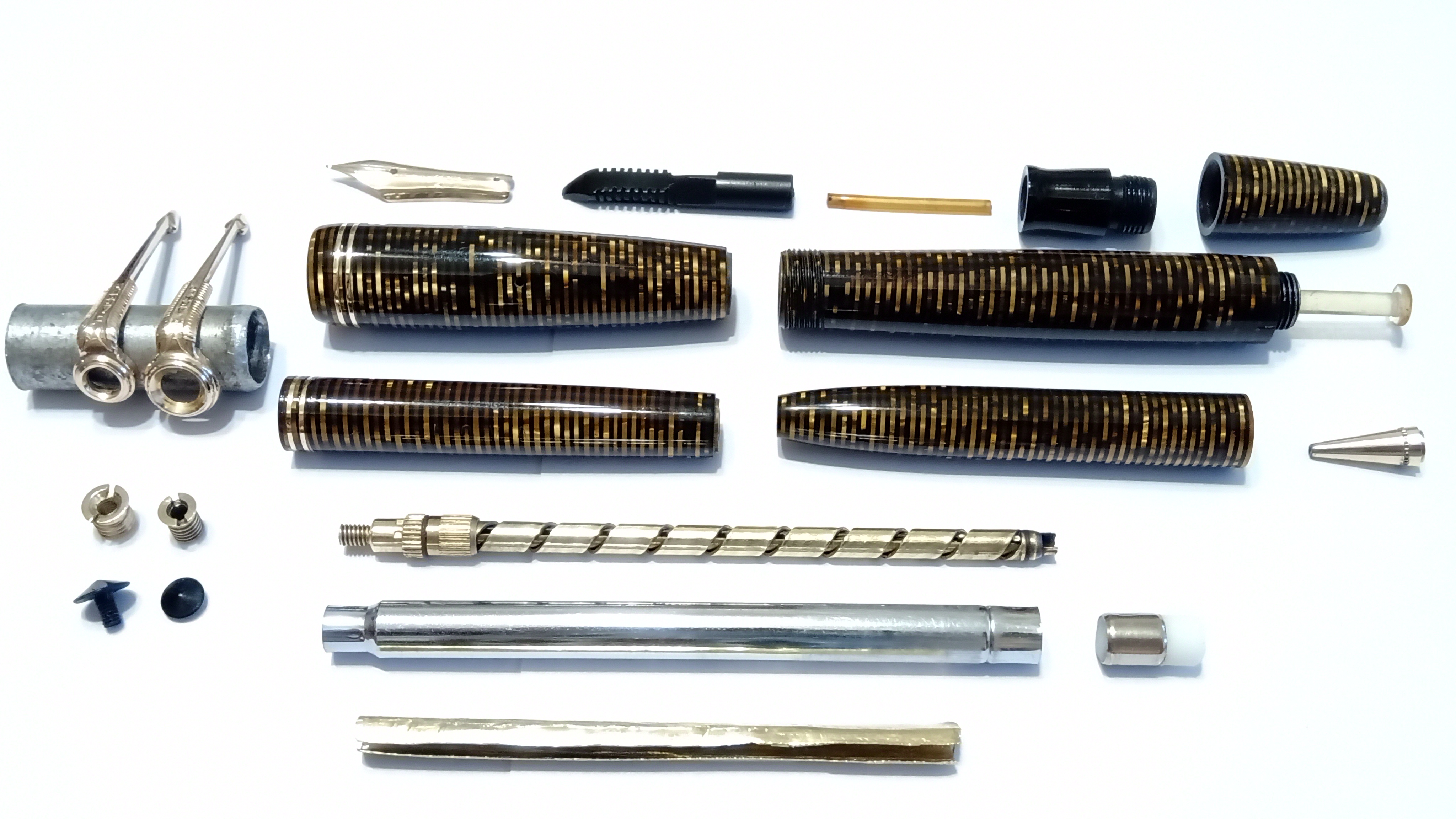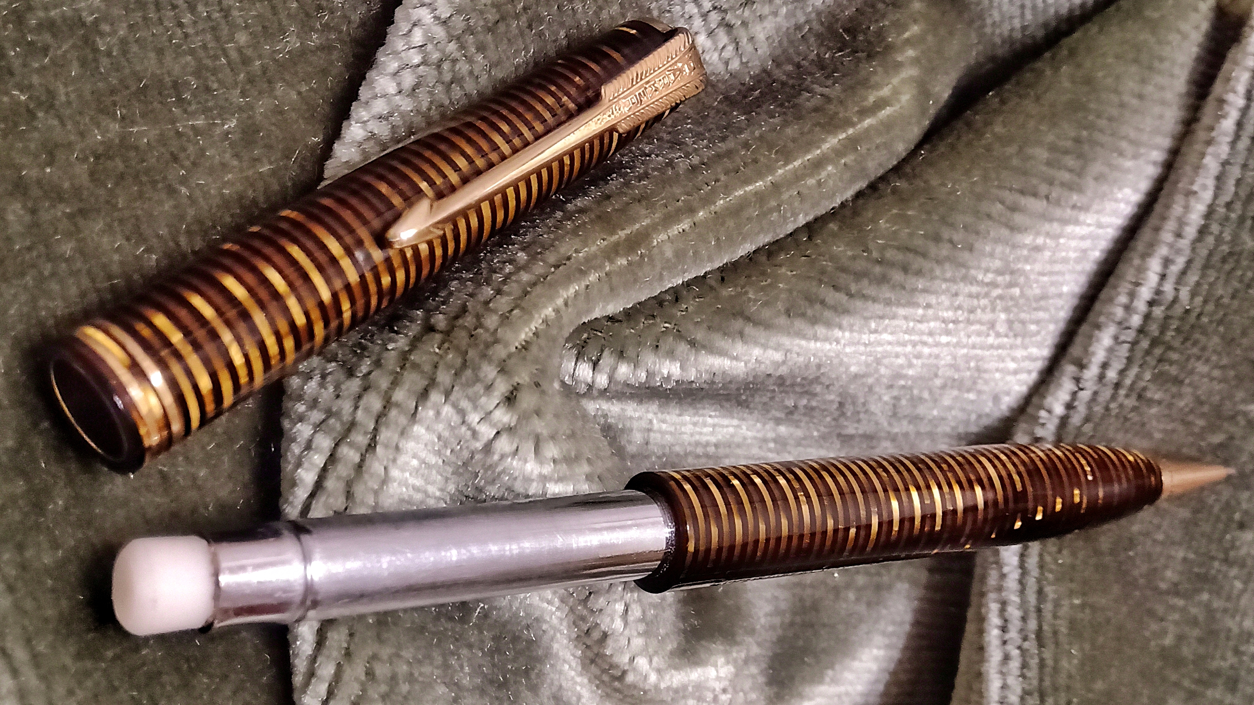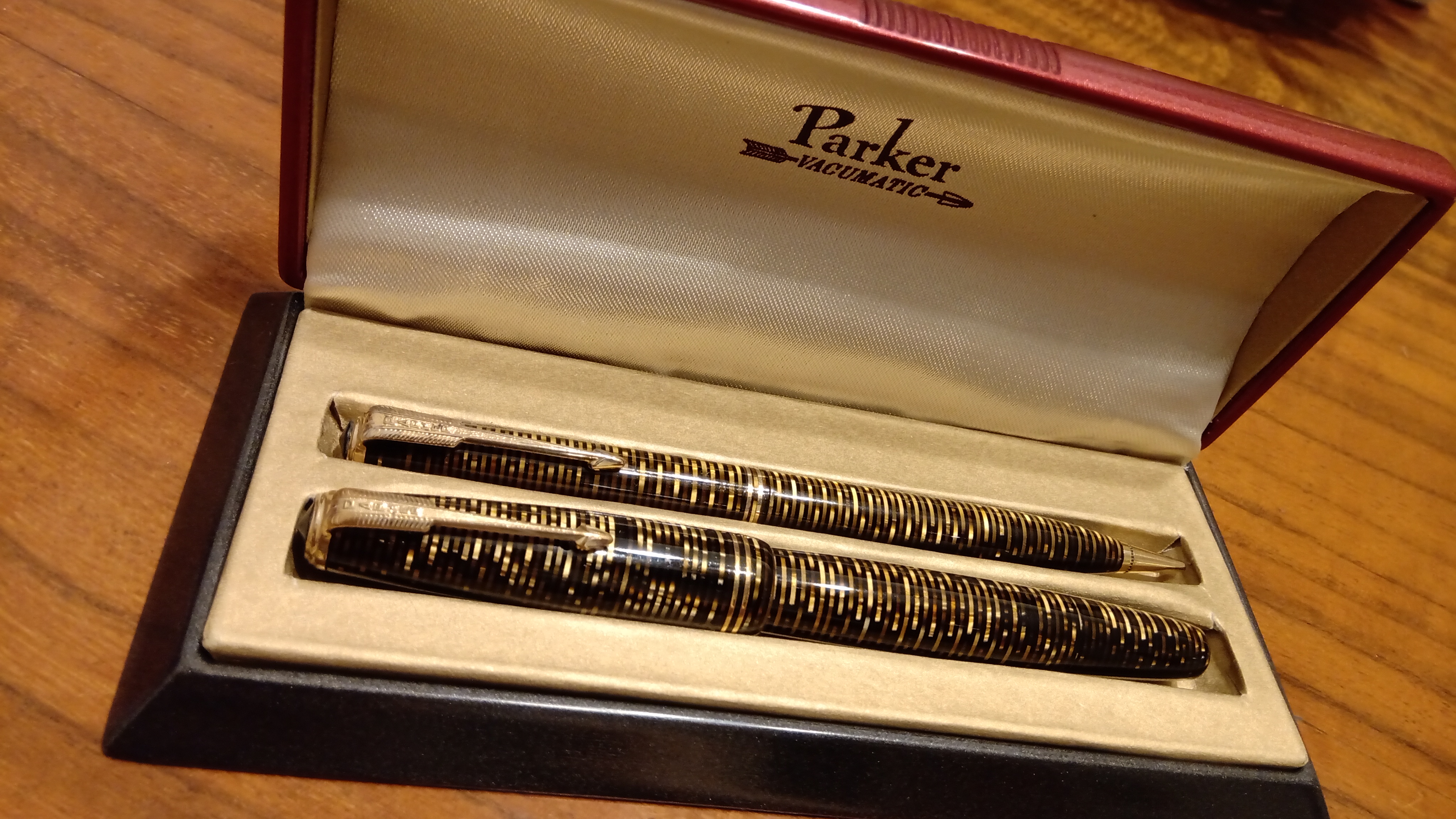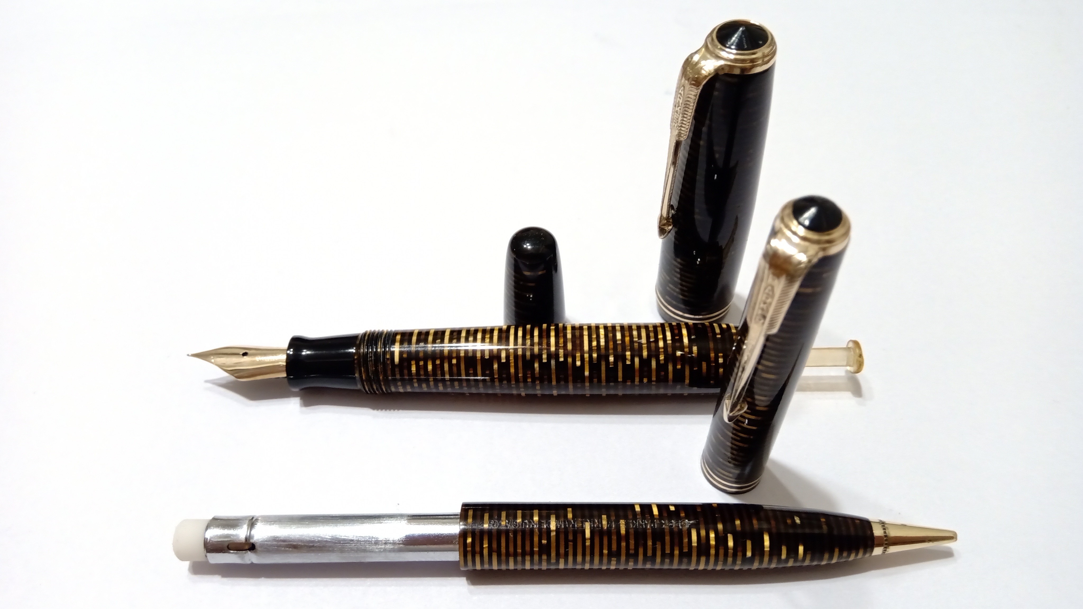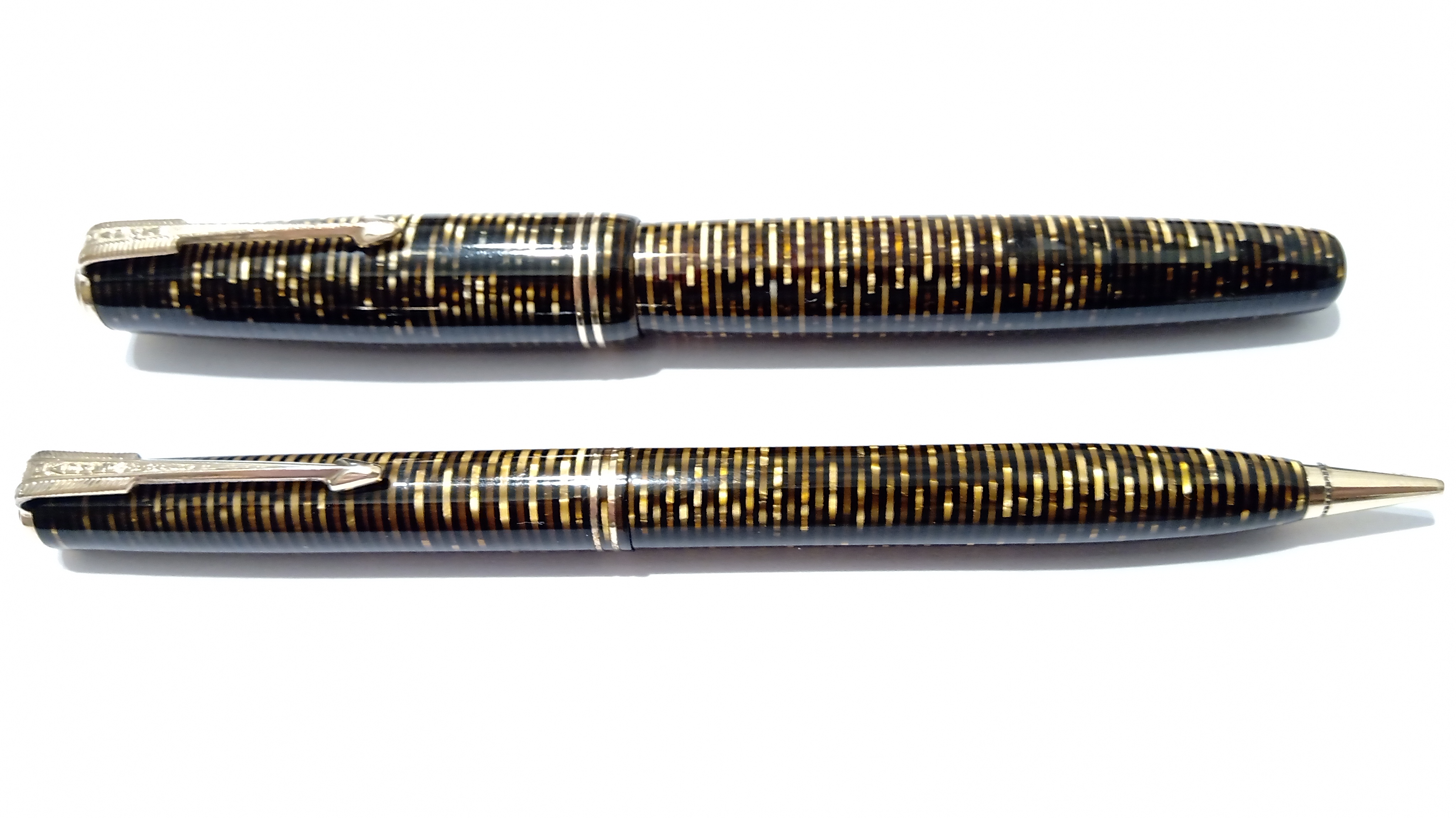 Oggi volevo condividere con voi il restauro di una penna stilografica, portamine e cofanetto, di un prodotto Parker che si chiamava Vacumatic Debutante Junior, una bellissima penna realizzata in celluloide laminata con anelli dorati sulla sua struttura, sistema di ricarica vacumatic, a vista pennino semiflessibile in oro, serbatoio dell'inchiostro traslucido, cappuccio con doppi anelli laminati in oro e un semplice gioiello nero a coronamento della sua clip, anch'esso in oro laminato.