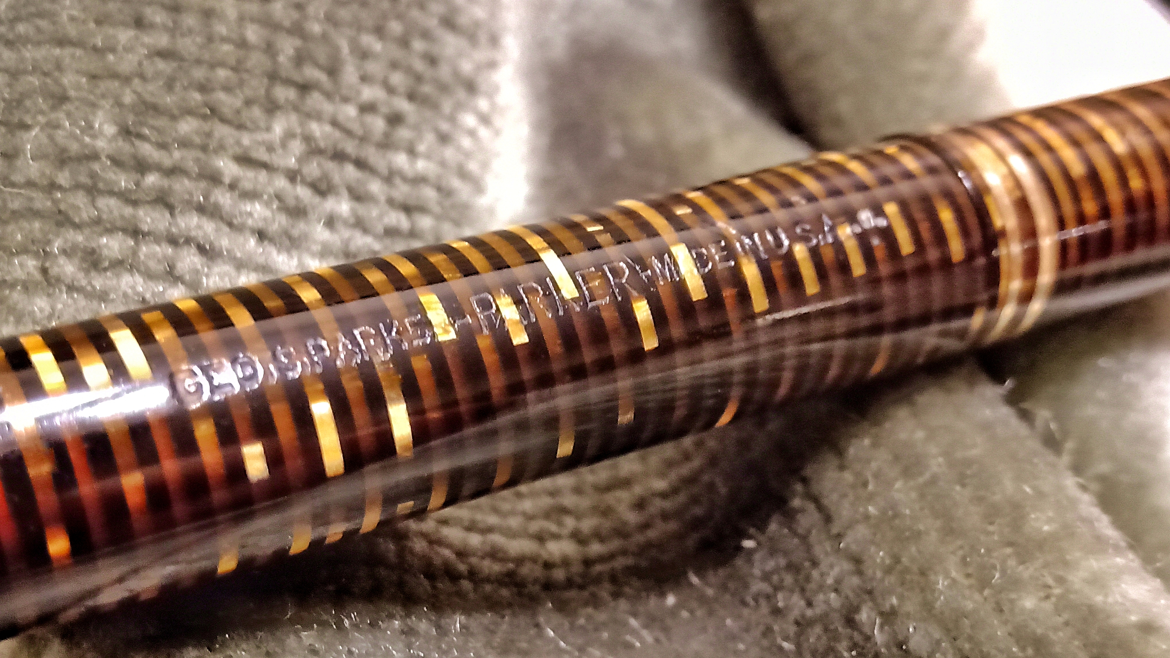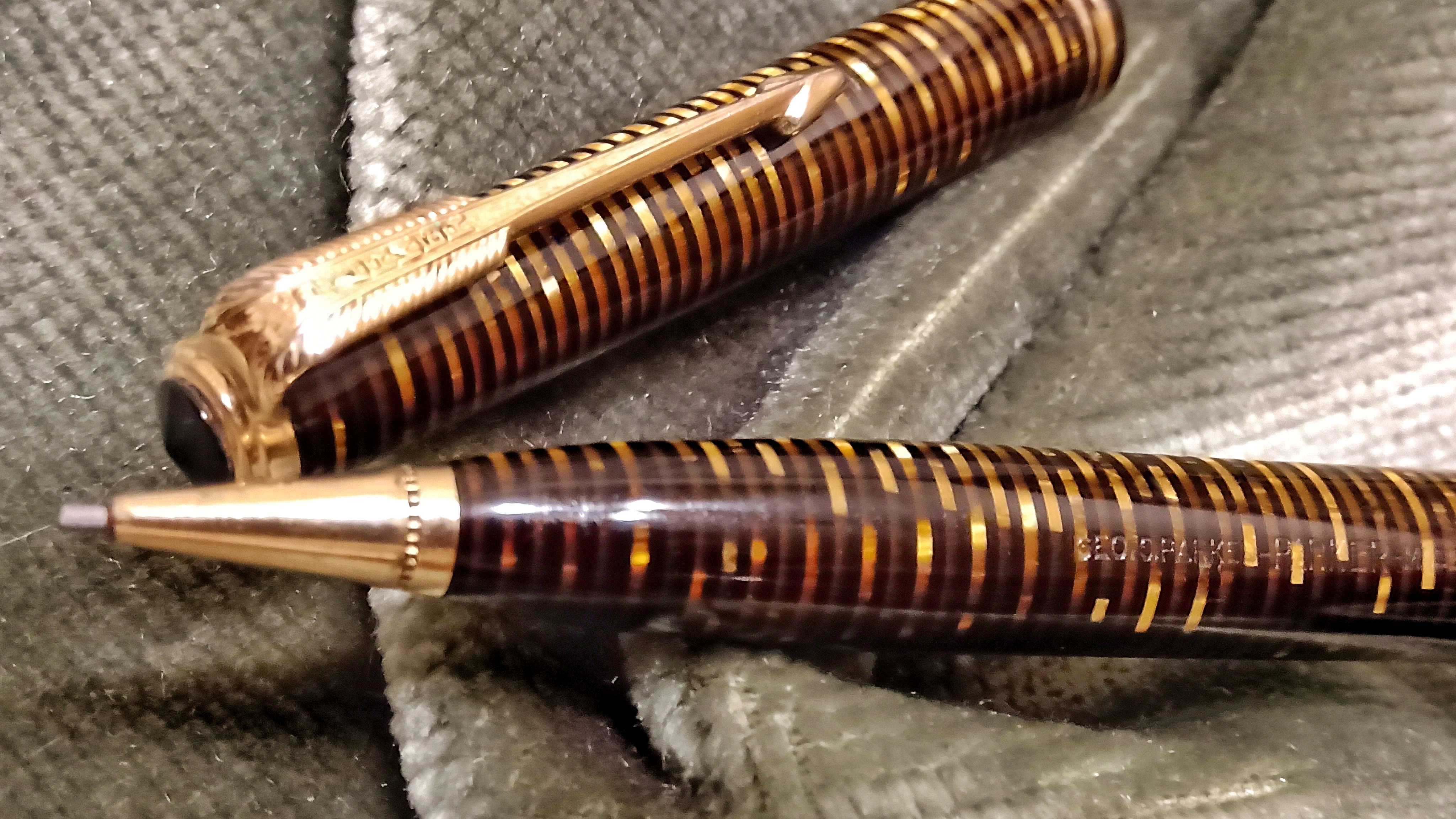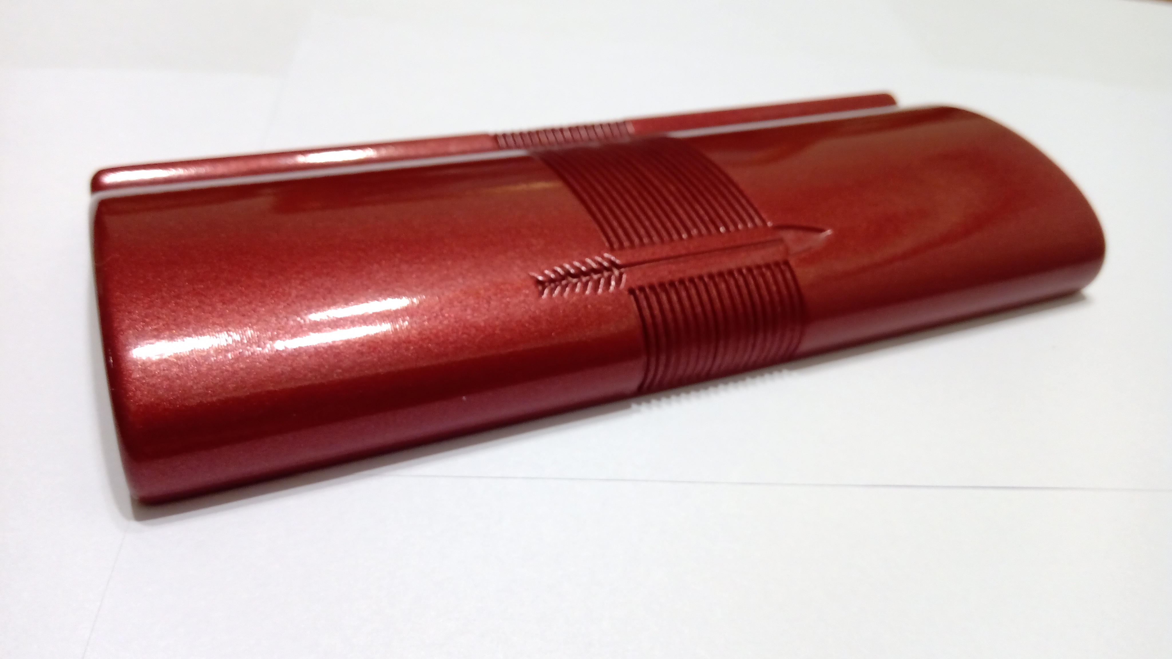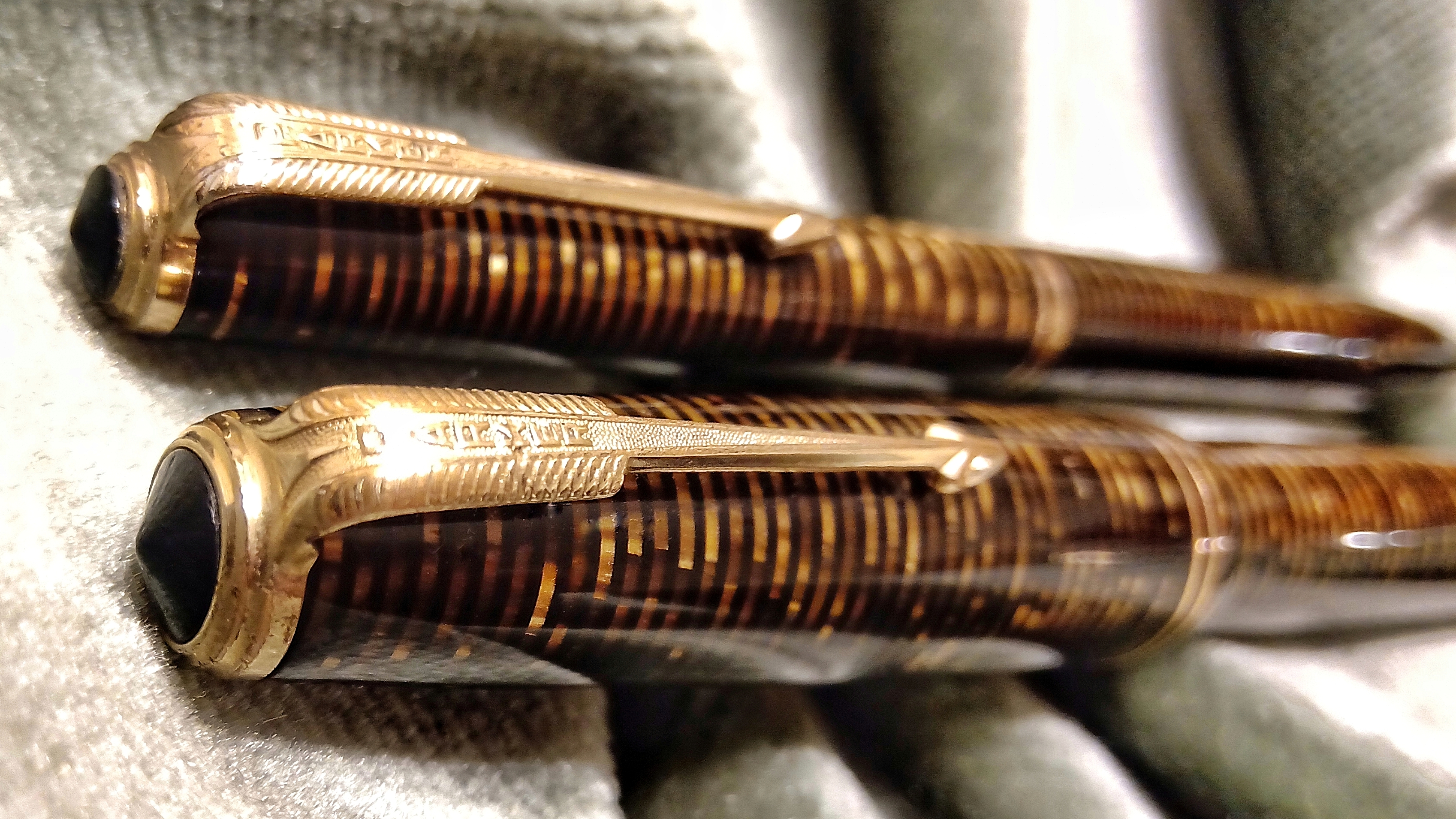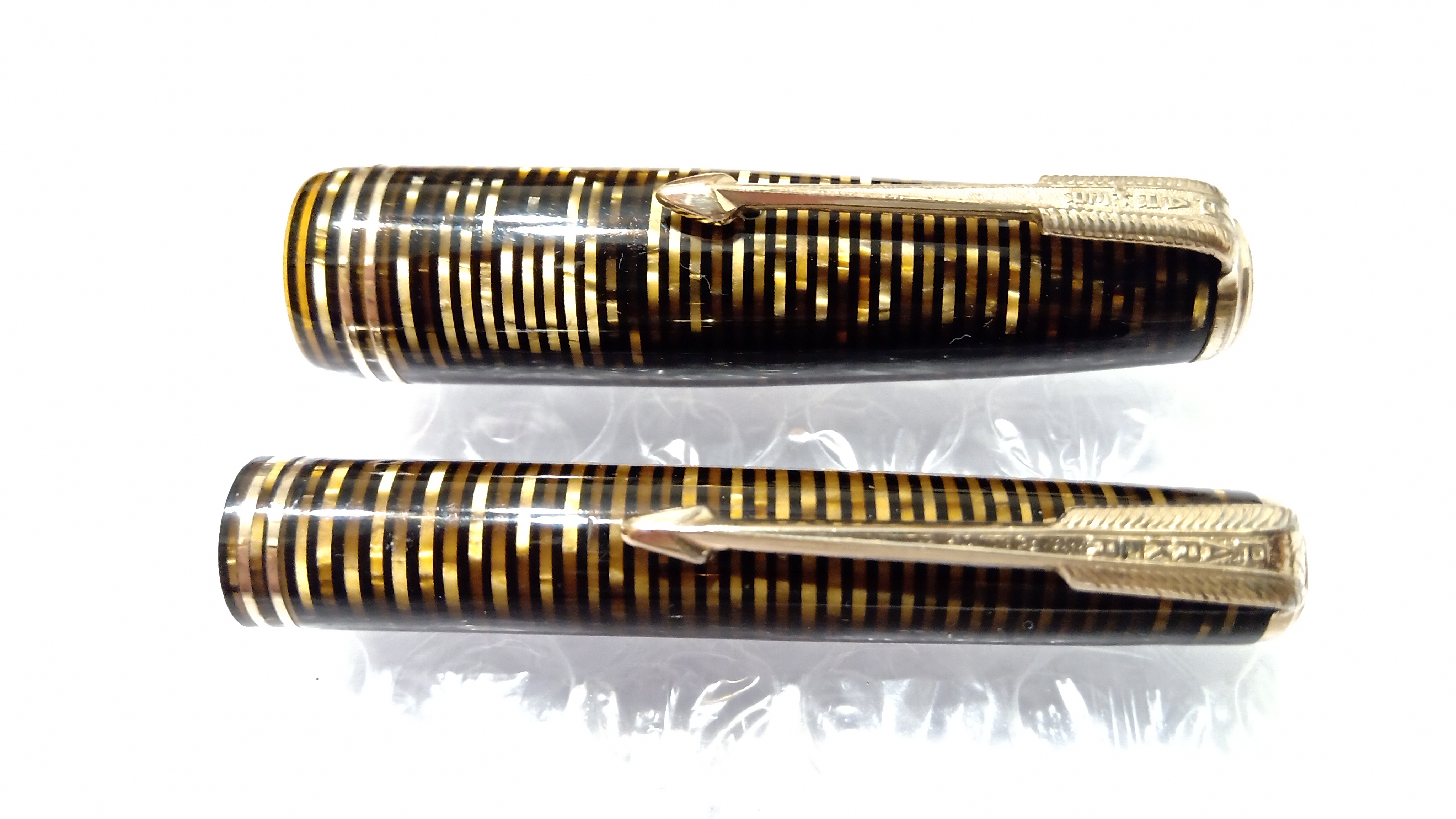 Oggi volevo condividere con voi il restauro di una penna stilografica, portamine e cofanetto, di un prodotto Parker che si chiamava Vacumatic Debutante Junior, una bellissima penna realizzata in celluloide laminata con anelli dorati sulla sua struttura, sistema di ricarica vacumatic, a vista pennino semiflessibile in oro, serbatoio dell'inchiostro traslucido, cappuccio con doppi anelli laminati in oro e un semplice gioiello nero a coronamento della sua clip, anch'esso in oro laminato.