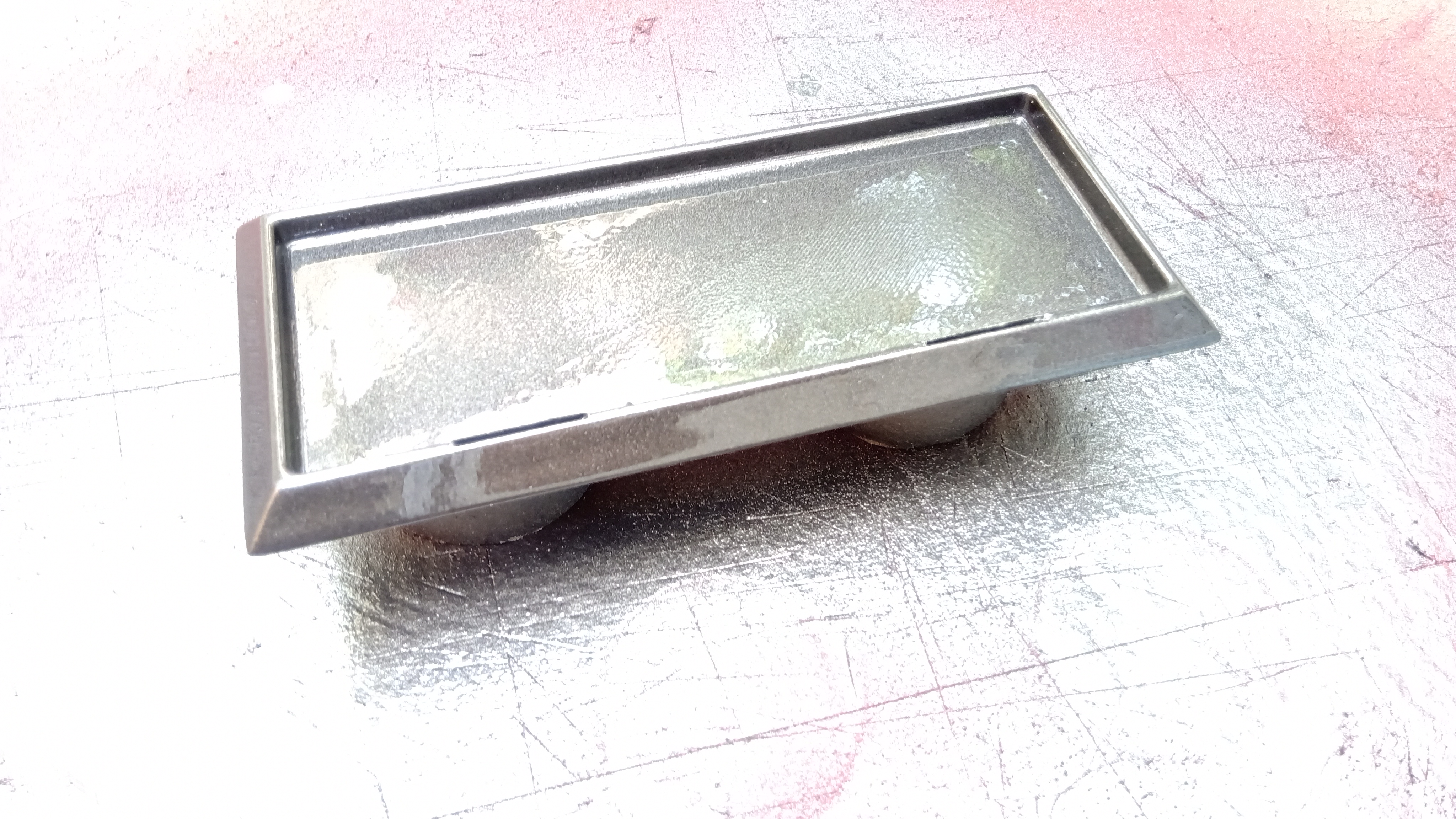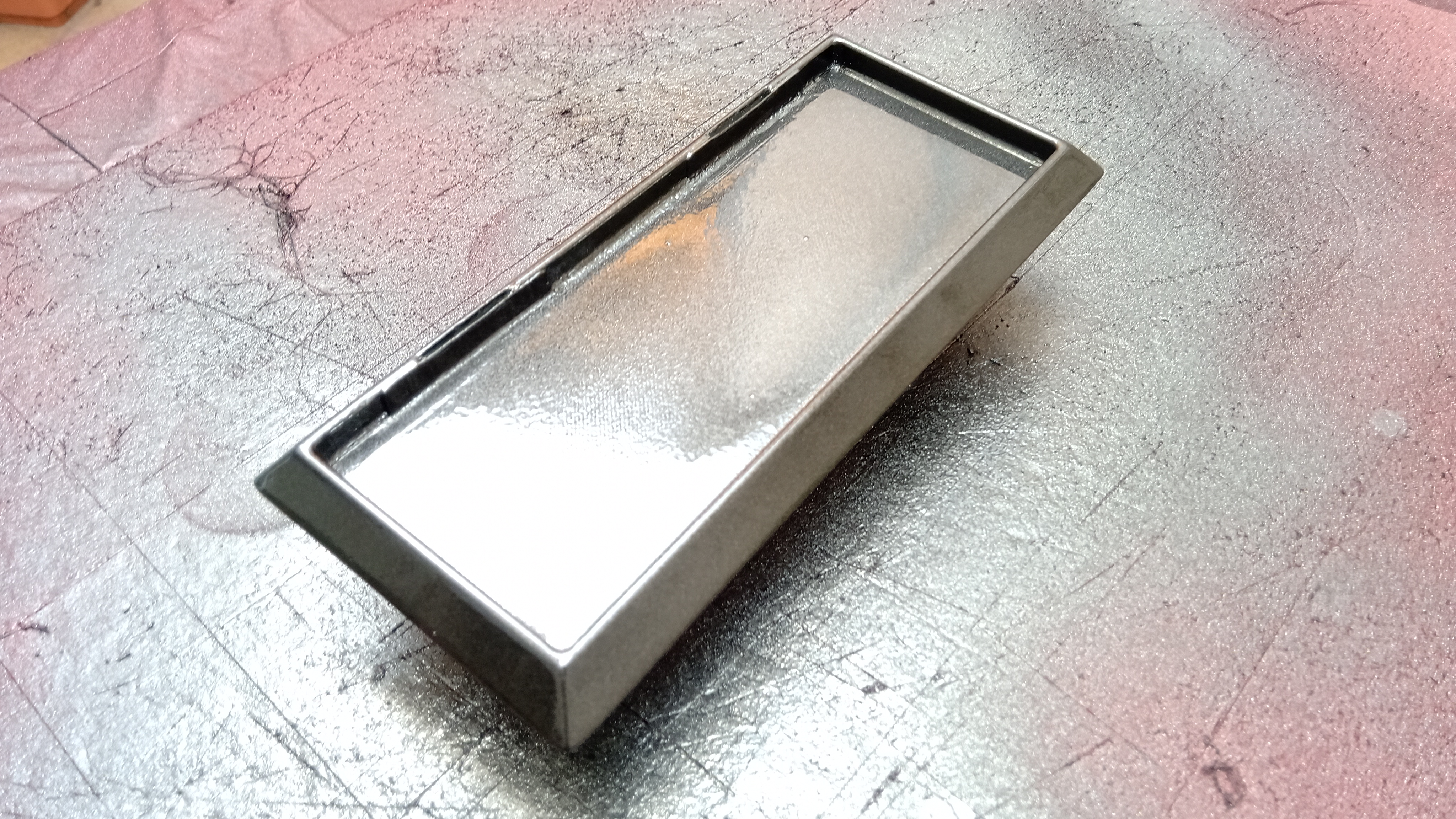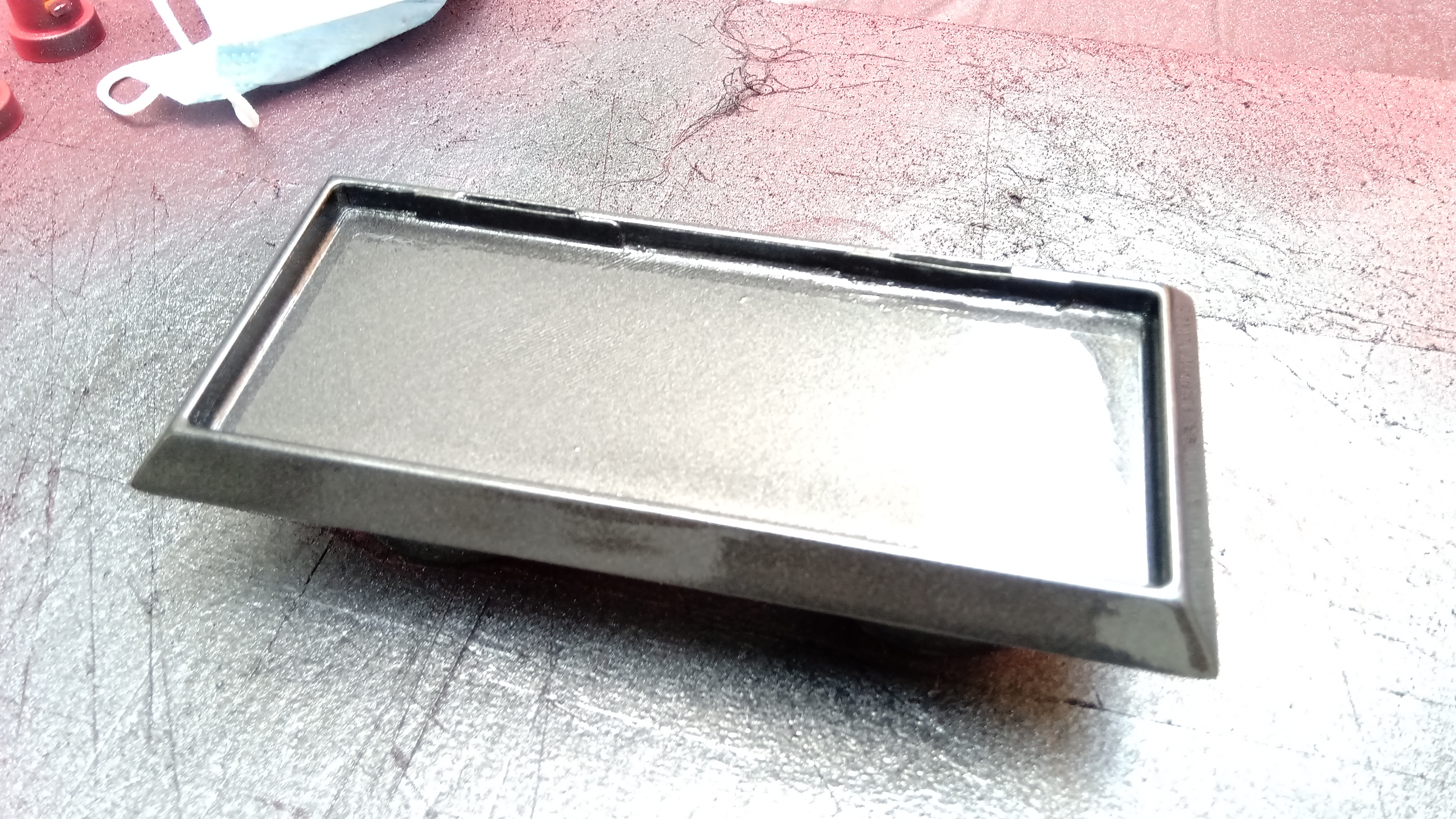 e allo stesso modo, dopo liscia carteggiatura, verrà verniciata di grigio metallizzato la base, alla quale sono stati precedentemente posizionati gli inserti per le cerniere...