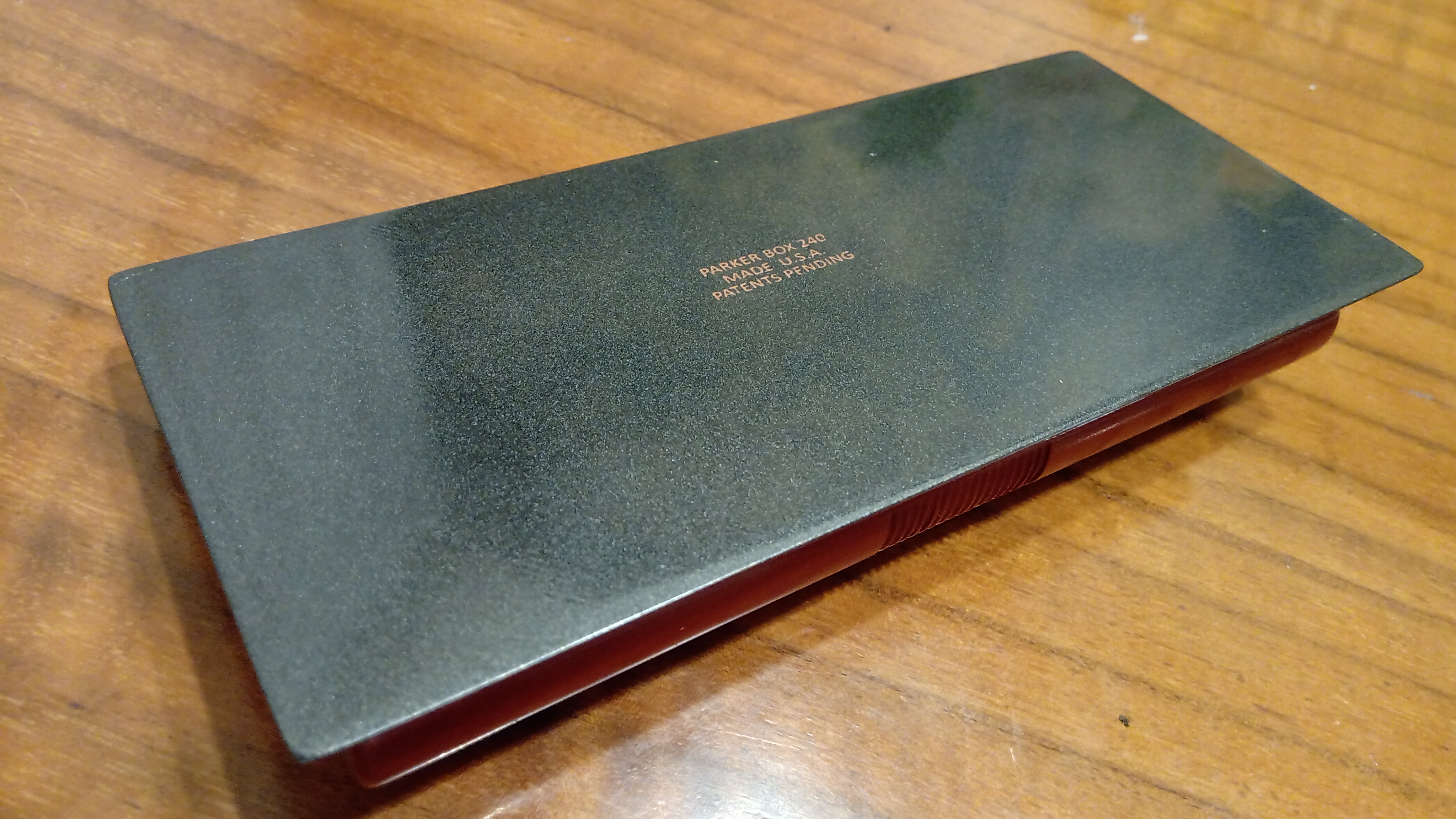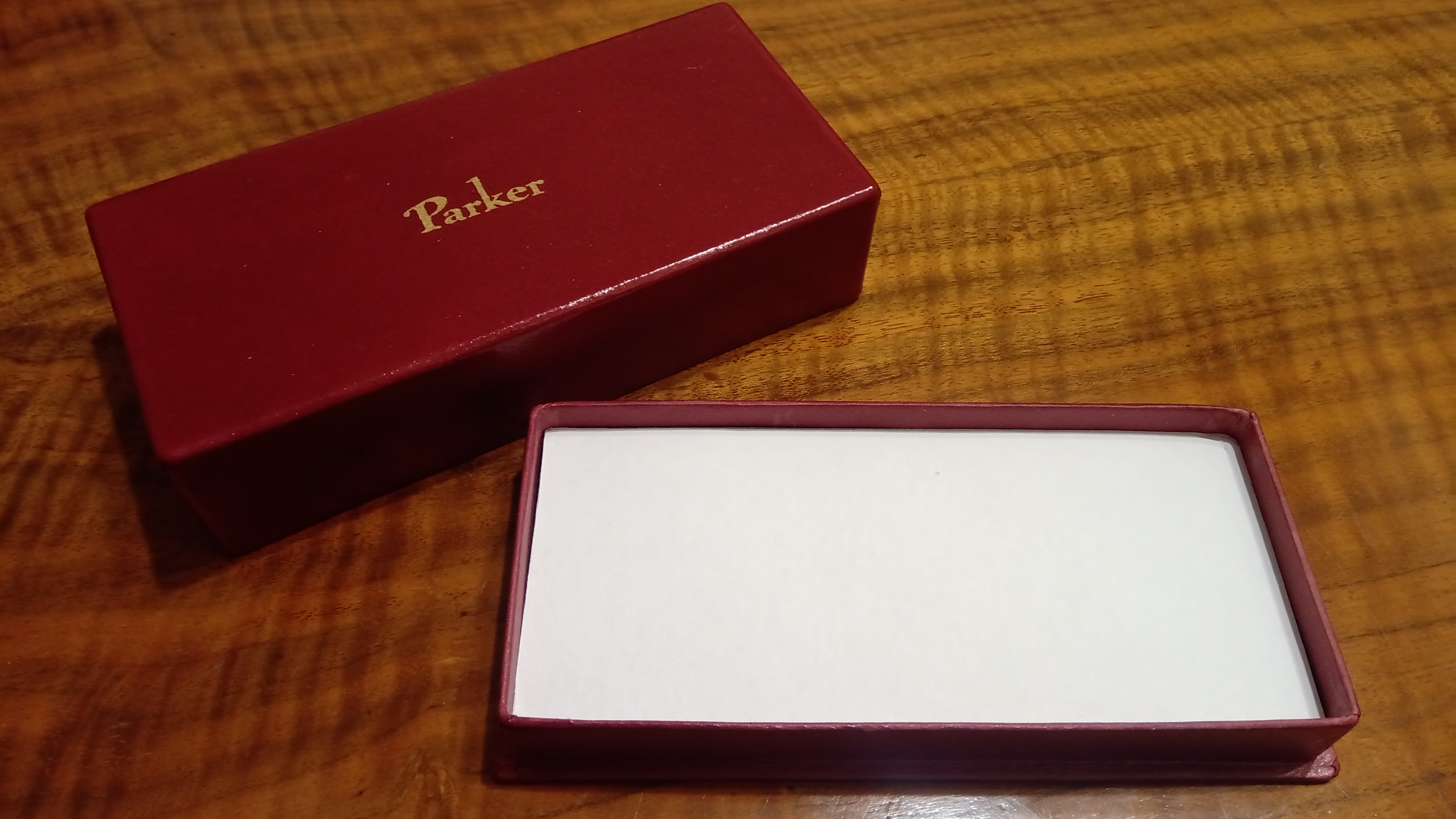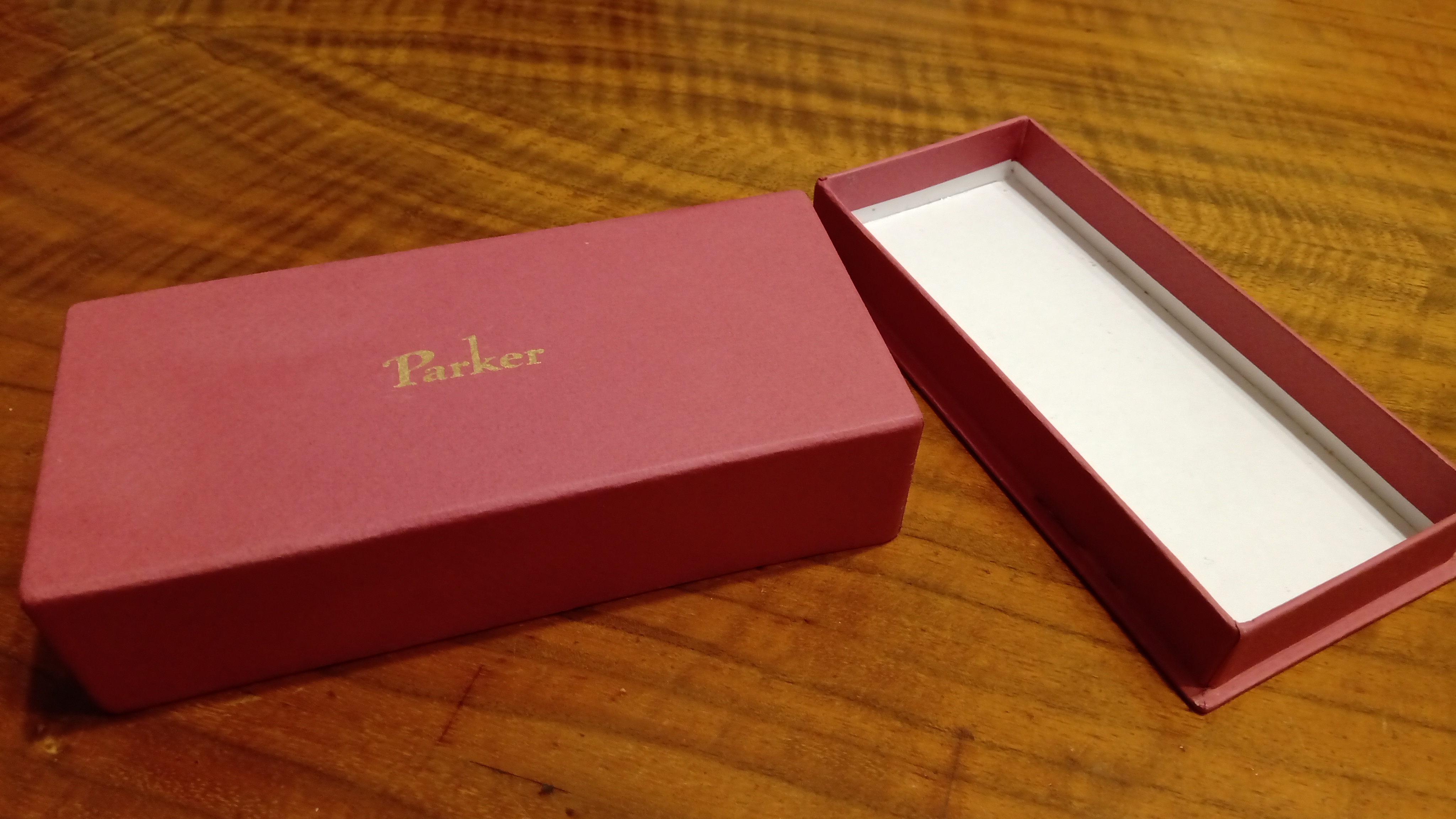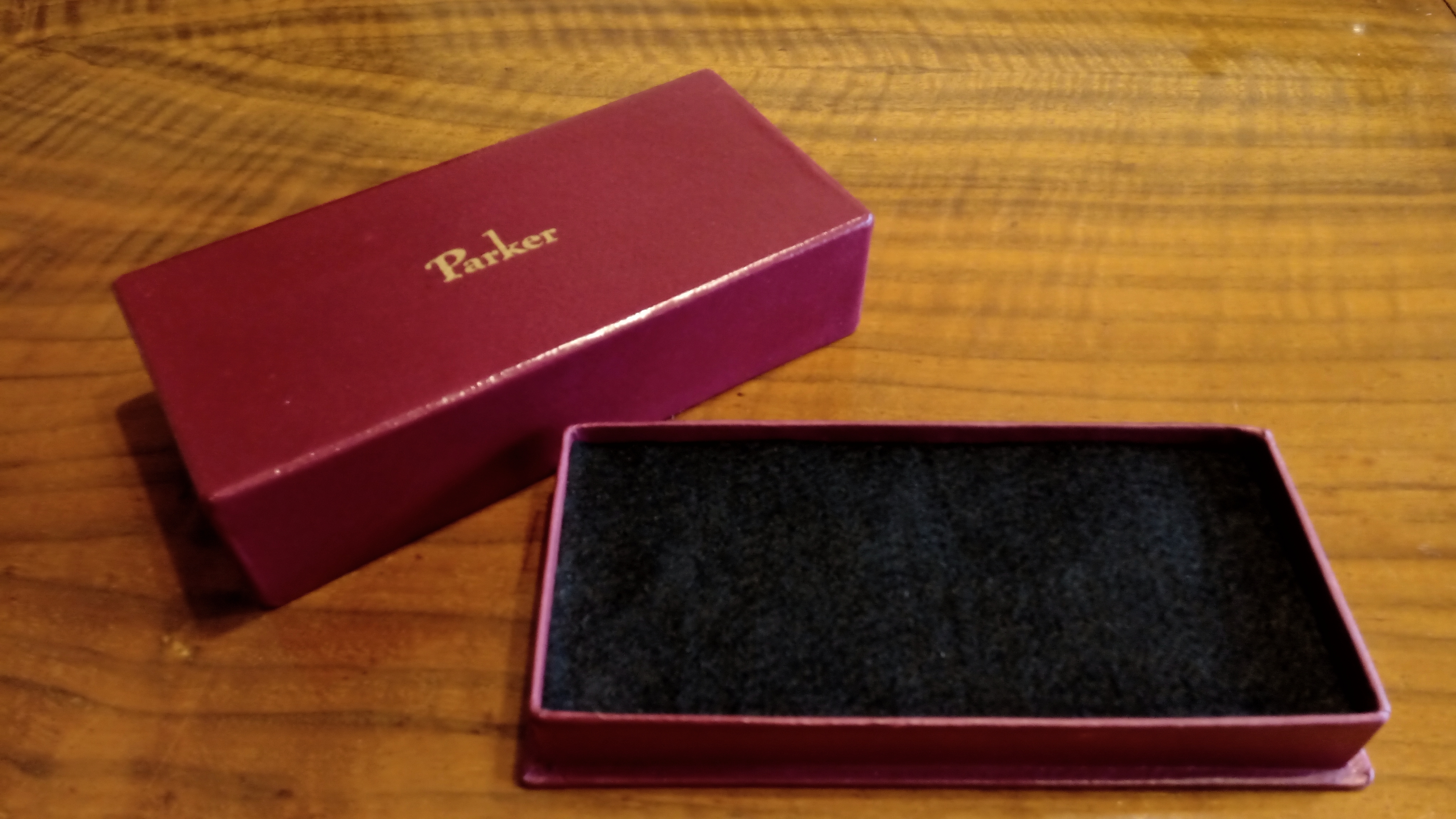 Tra le migliaia di diversi modelli di scatola che Parker aveva progettato e realizzato per le sue penne, aveva conosciuto questa scatola solo attraverso le foto, e le poche che erano state messe in vendita erano totalmente deformate.