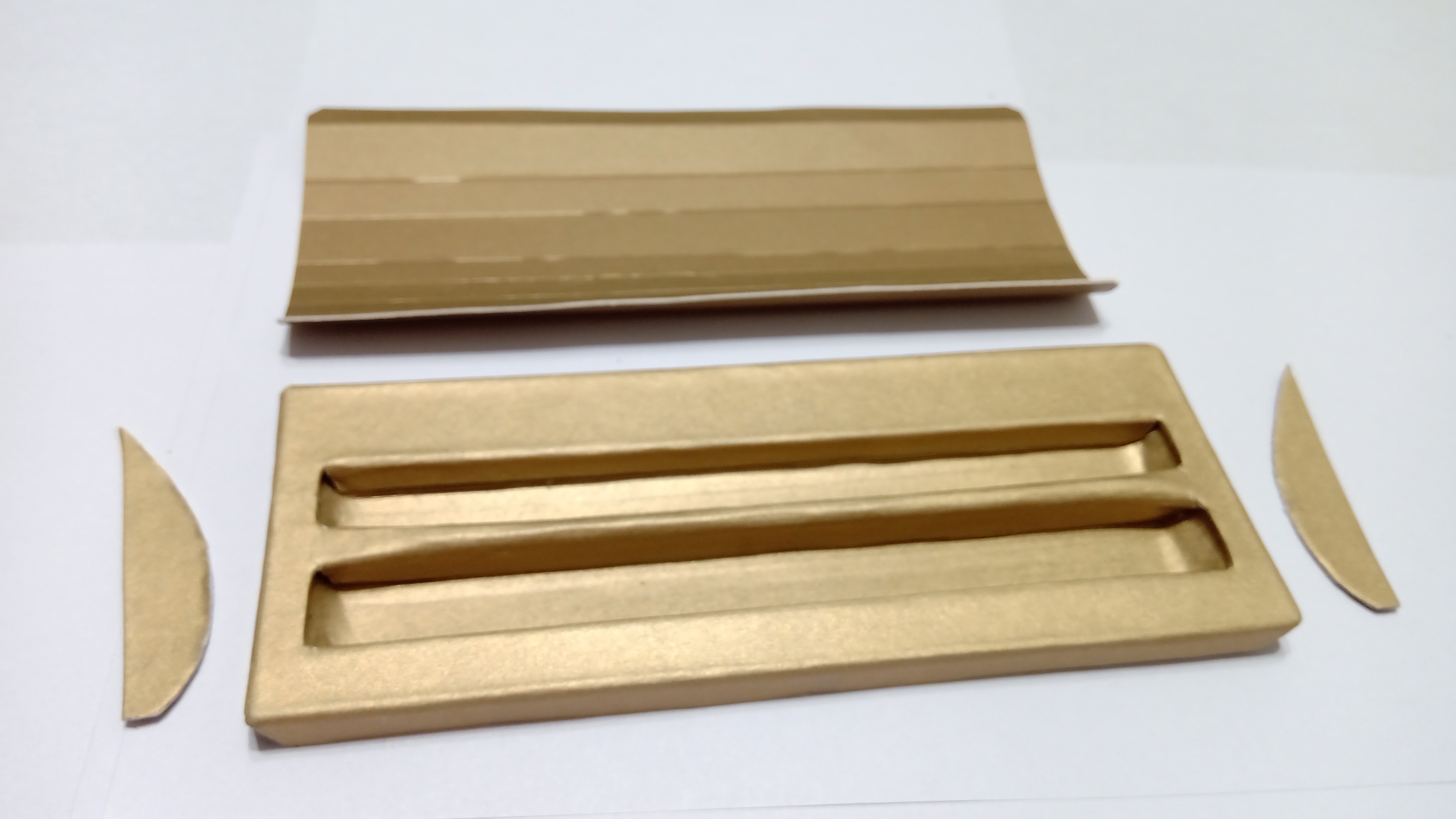 Iniziamo ora la costruzione della parte interna della scatola: una culla in cartone foderato in oro per il set penna più portamine, lati in cartone foderati in oro per il coperchio, e un retro per il coperchio satinato su cui verrà stampato il marchio. e modello...