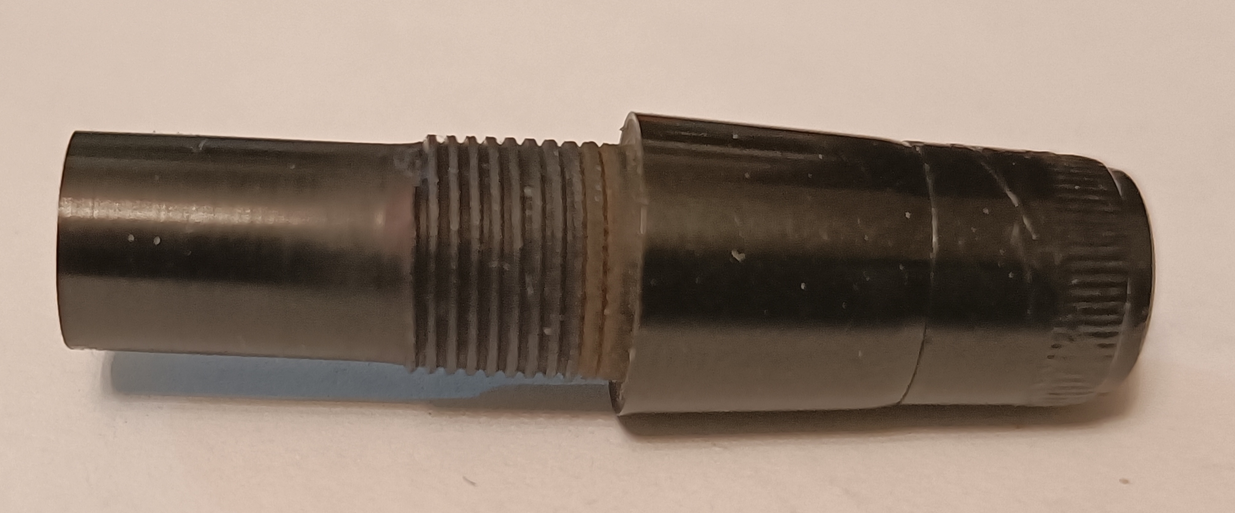 E allora dov'è il problema? nel sistema di riempimento. Il fondello in materiale nero avvitato al fusto, qui sotto ingrandito, è diviso in due sezioni; quella cilindrica in fondo, a destra nella foto, ruota liberamente e fa girare un (per me) misterioso perno all'interno della sezione rastremata e filettata (a sinistra nella foto); questo perno però non sembra fare nulla, a parte ruotare sul suo asse.