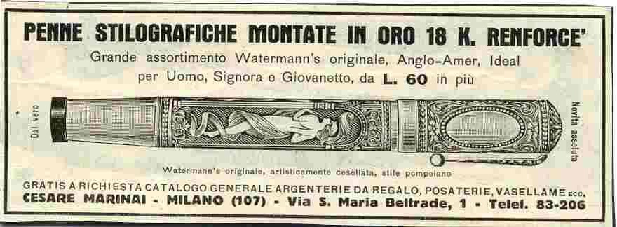 Onestamente non saprei risponderti: Marinai, se non erro insieme a Calderoni e qualche altro, proponeva nei propri cataloghi di vendita per corrispondenza, insieme a gioielli ed argenti, anche penne stilografiche del periodo.