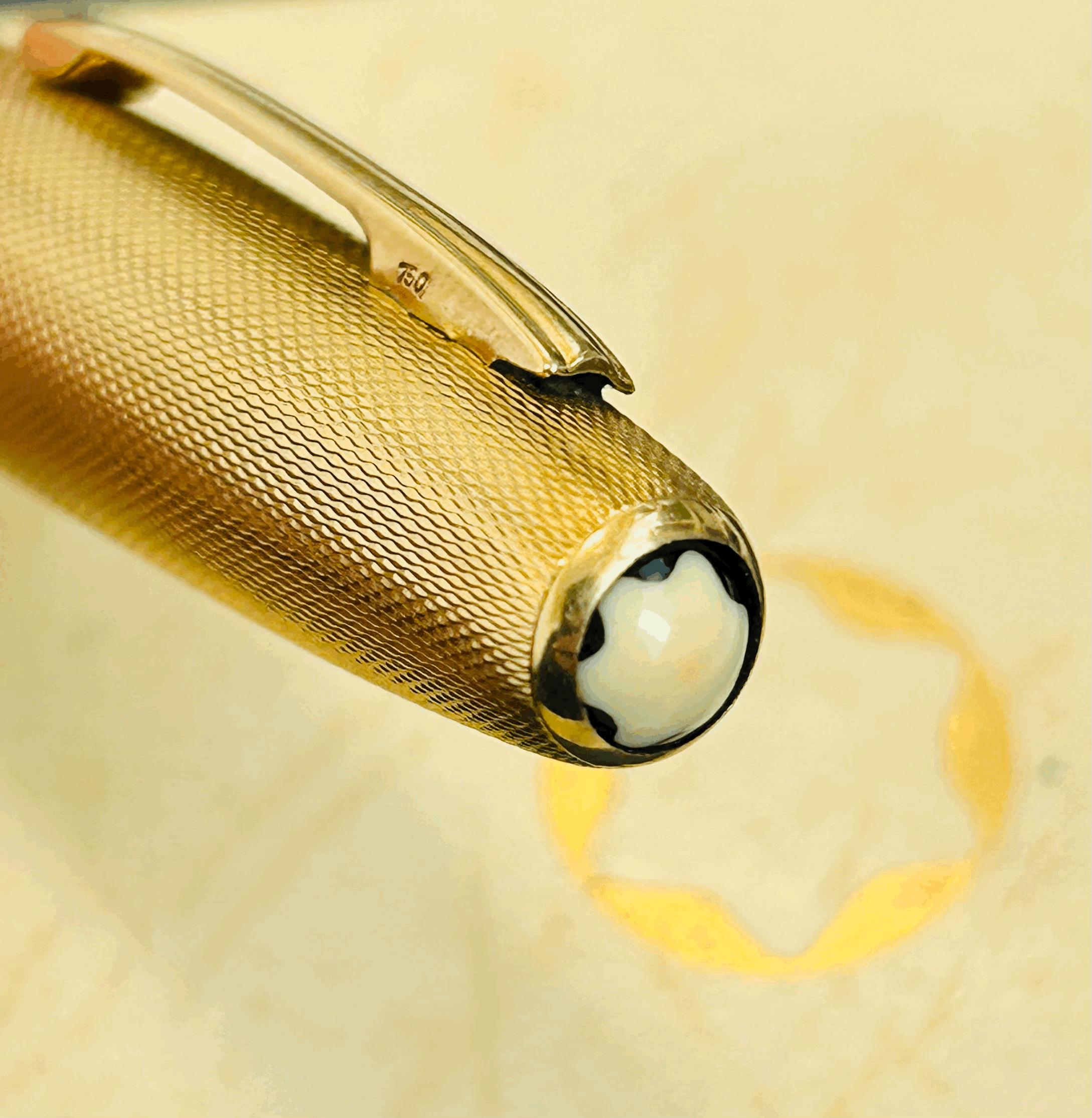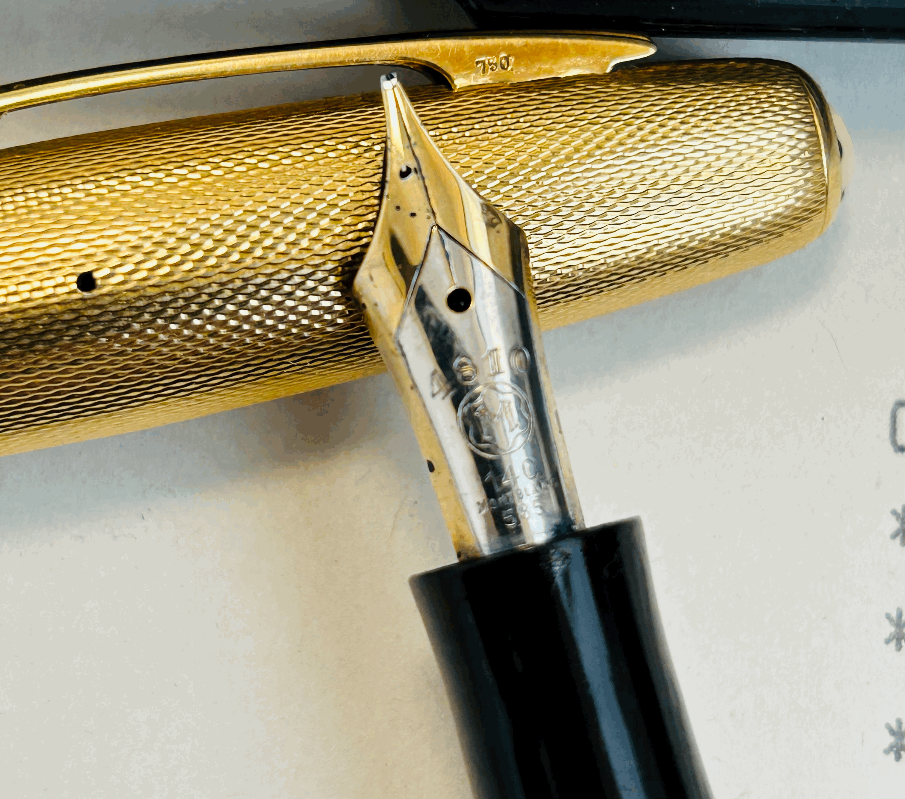 Particolare e raro modello di Montblanc 144 in celluloide, rivestito in oro 18 kt, anni 1950/1960.