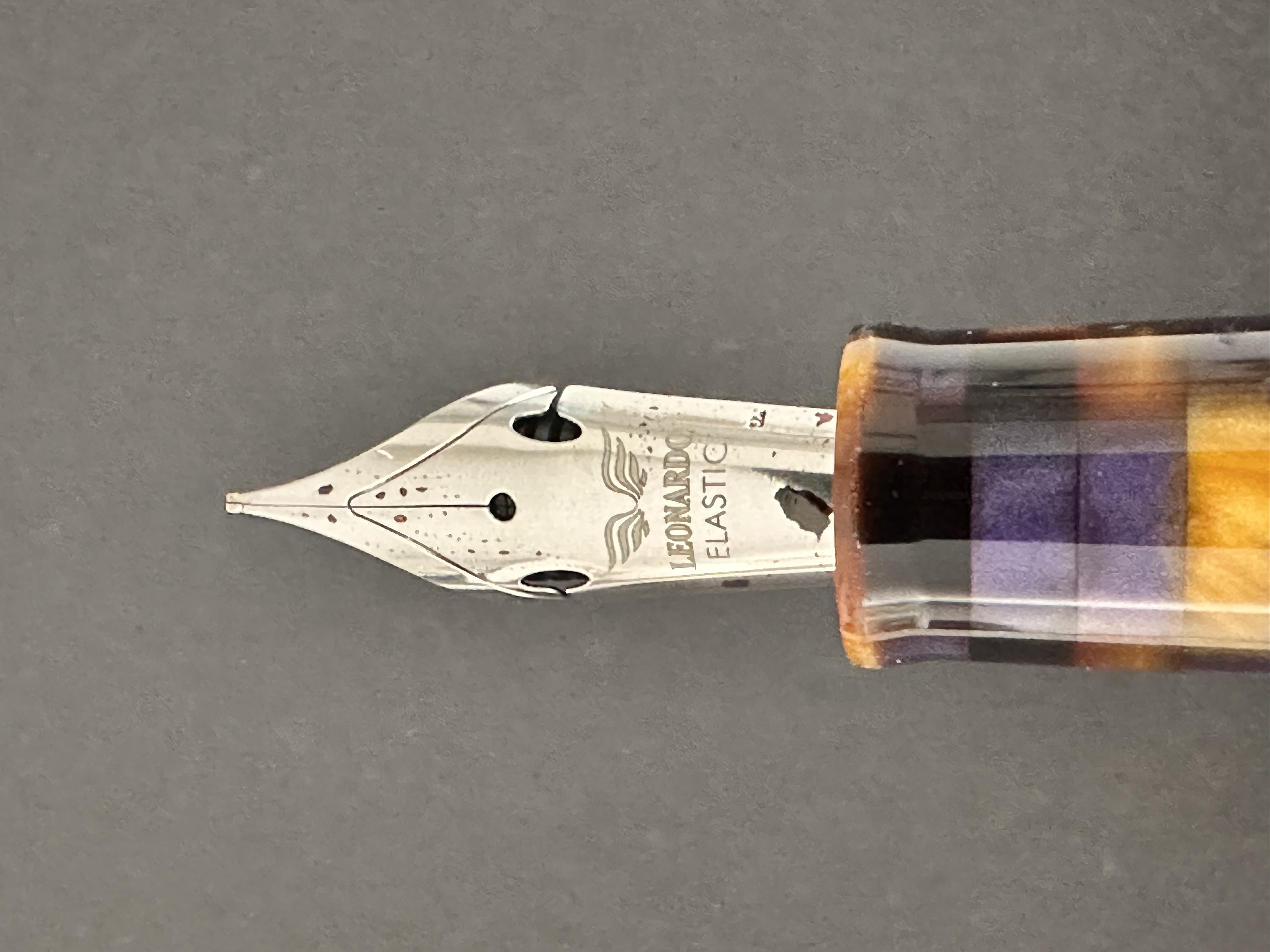La mia Mosaico Anemone monta un pennino in acciaio fine elastico di produzione Jowo, ma gridato, su mia richiesta, in un Cursive Smooth Italic. La qualità di questo grinding è davvero elevatissima, il pennino scorre agevolmente su ogni tipo di carta lasciandosi dietro il solito piacevole feedback che tanto apprezzo e un tratto che ormai credo caratterizzi le penne di Leonardo.