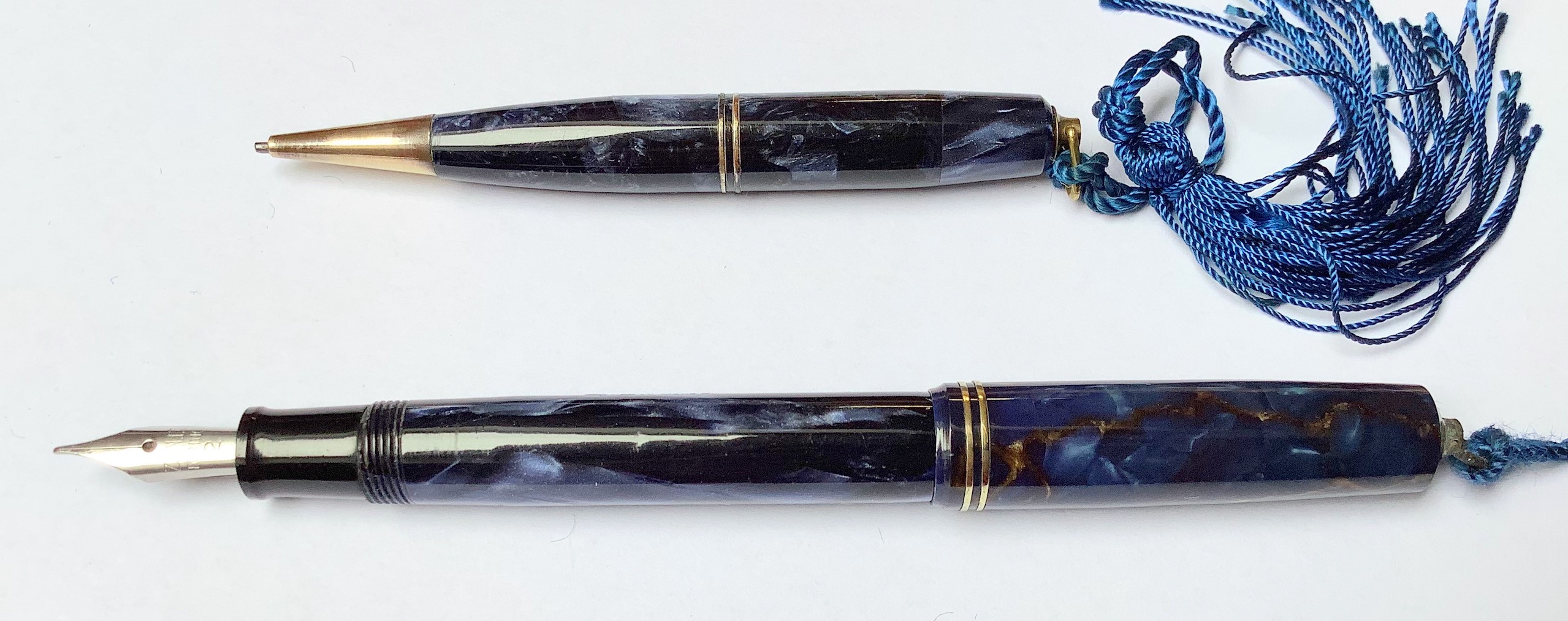 Mi permetto un'osservazione: la celluloide del cappuccio della stilografica (blu marmorizzato con venature bronzo) è diversa da quella del corpo penna (che definirei un blu perlaceo). Dubbi anche sulla matita: il fondello mi sembra fatto con lo stesso materiale del corpo penna e pare diverso dal resto della matita.