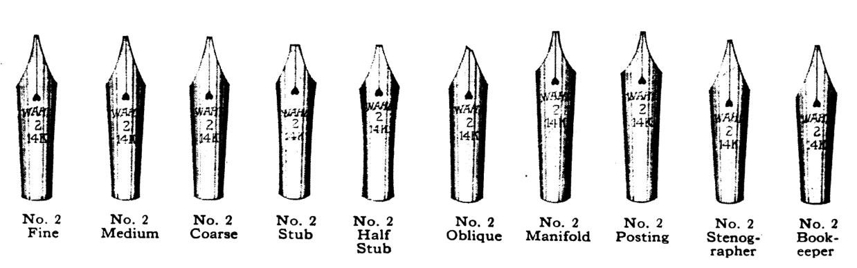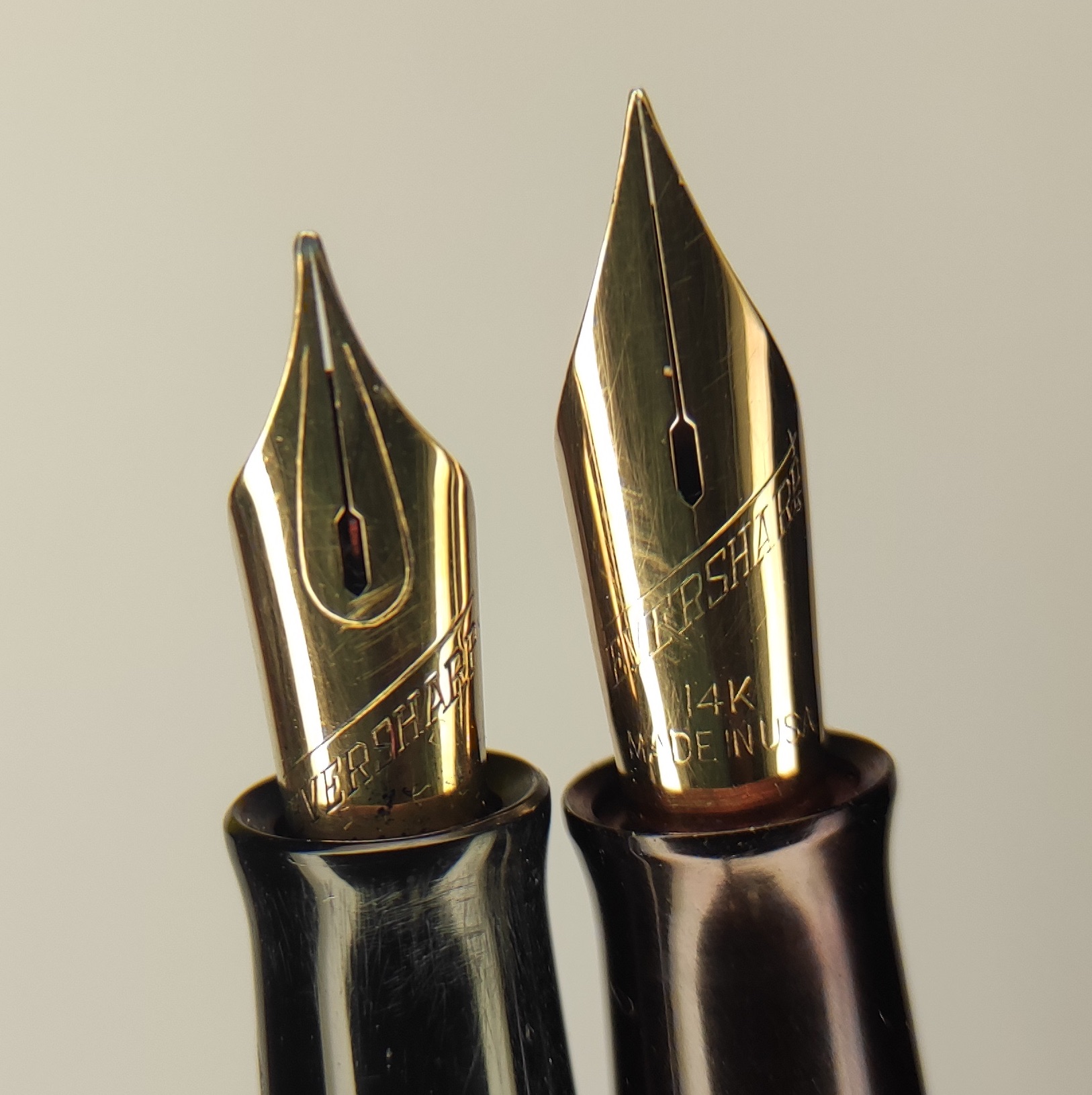 A riguardo dei pennini che sembrano tutti uguali, ti lascio questa mia impressione (definirla regola è forse un azzardo) : i pennini (Wahl/Wahl Eversharp) con la forma (dalle ali alla punta) a triangolo equilatero sono tutti rigidi, pennini a triangolo isoscele sono dal morbido al flessibile (con diverse gradazioni dal Signature al Flexible). Generalmente si nota anche che i pennini rigidi hanno uno spessore della lamina molto maggiore (quasi il doppio) rispetto a quelli morbidi/flessibili.