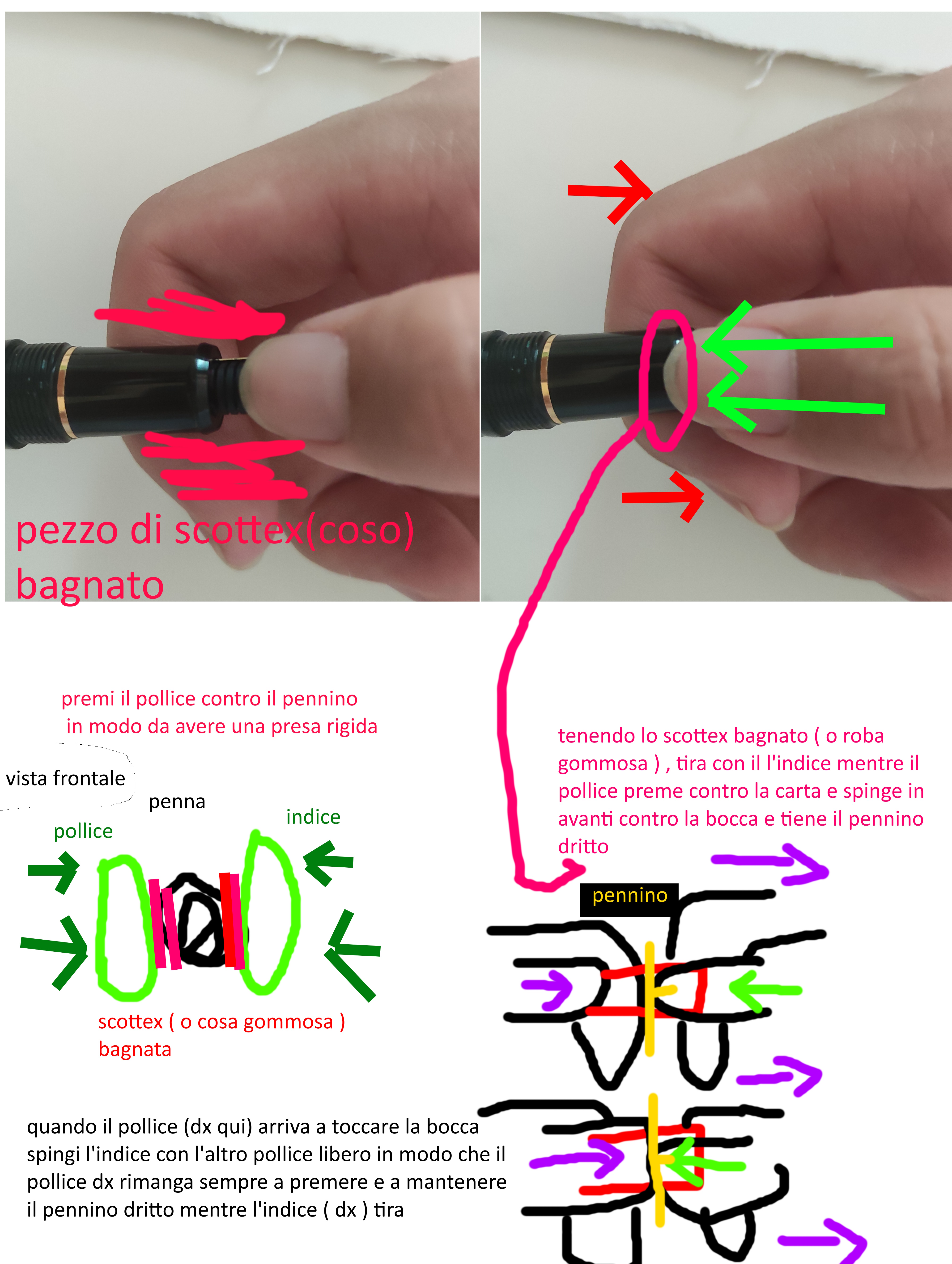 Un video di Marco Chiari mostra come sia 'semplice' smontare il pennino ed il conduttore della penna. Avendo messo un inchiostro carbon ink, il pennino si è intasato. Seguendo le istruzioni sono riuscito solo in parte ad estrarre il pennino senza usare e non vorrei farlo, le maniere forti. A questo punto il pennino non va più ne avanti ne indietro. Come posso fare, senza fare danni, ad estrarre finalmente il pennino, pulirlo bene e rimetterlo al suo posto?