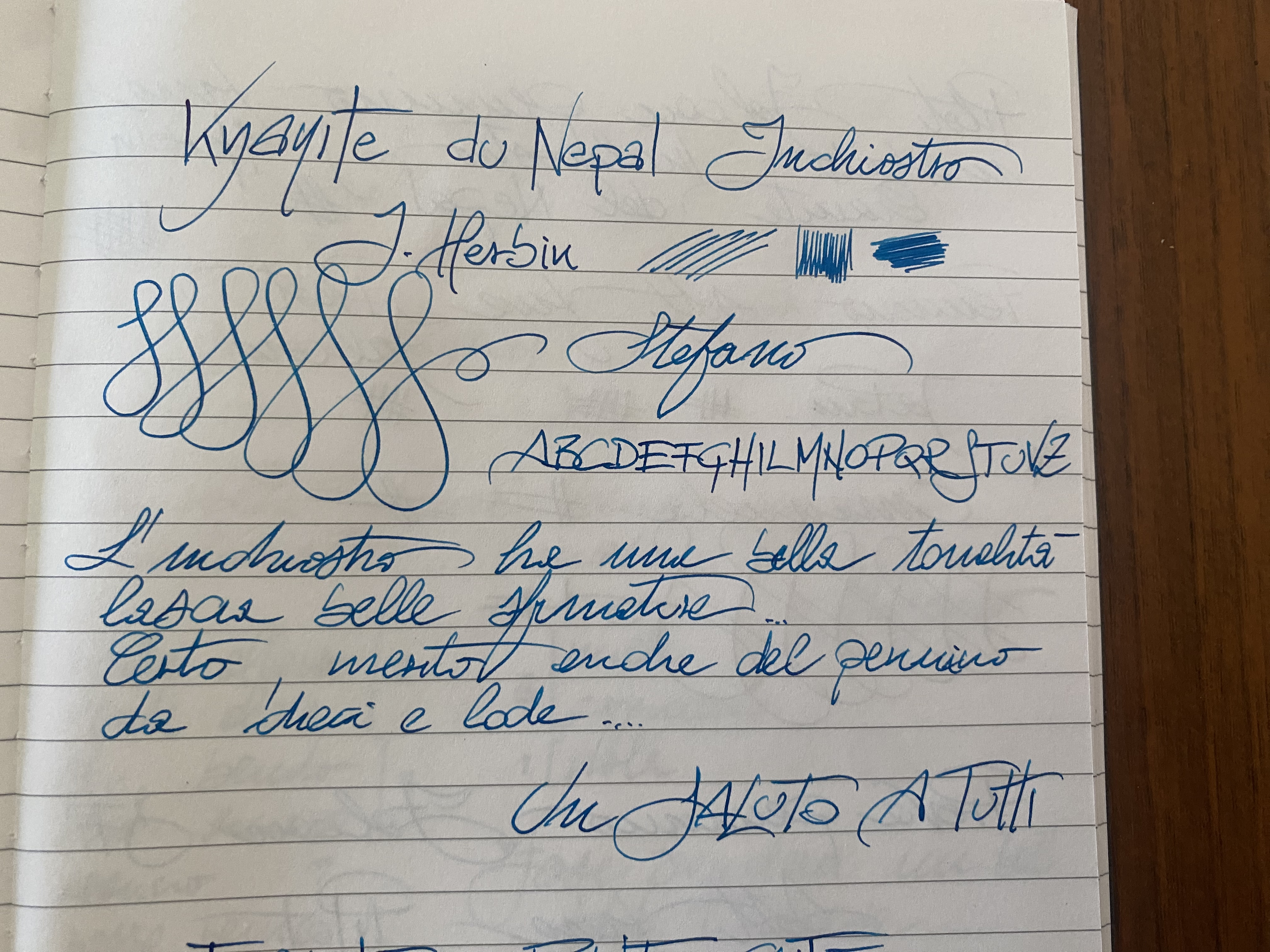 Su pennini morbidi/flessibili o comunque che offrano una variazione minima di tratto ha belle sfumature dal turchese all’azzurro scuro (che nelle mie foto non si vedono).