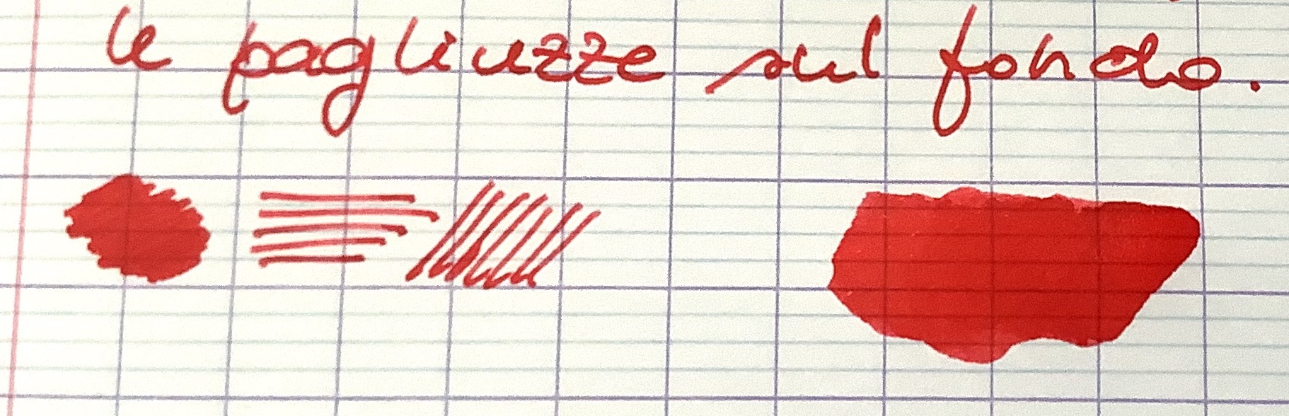 A me le pagliuzze non dànno fastidio, le apprezzo e le uso con qualunque penna e finora non ho avuto nessun problema a parte un flusso incostante sulle Duofold centennial, che tuttavia è presente con molti altri inchiostri, con pennini Italic M e Extra extra broad.