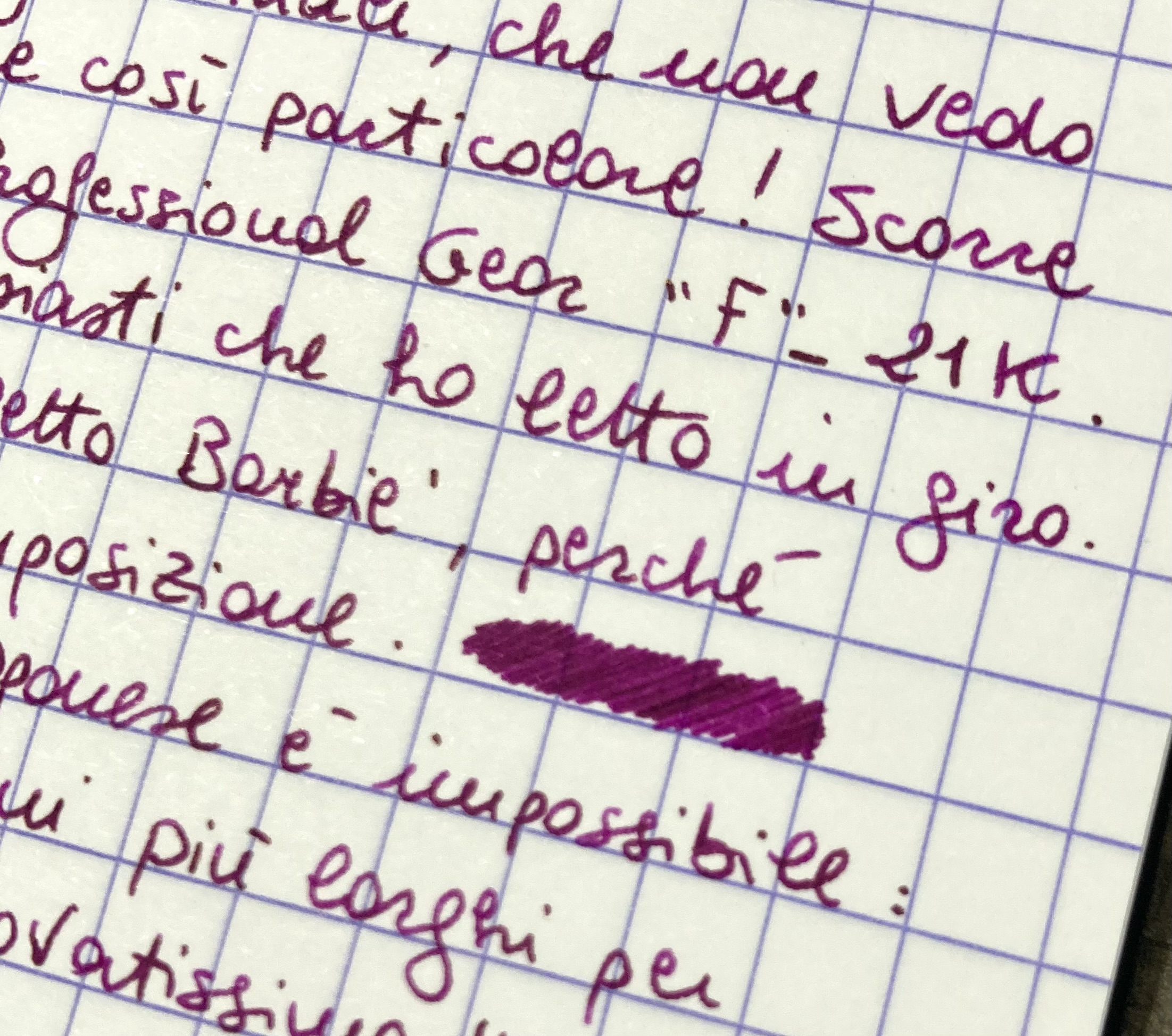 Prime lettere scritte con il famoso color che da lungo tempo desideravo provare. Beh, è un inchiostro che si fa notare ma non in modo pacchiano devo dire. Lo salva secondo me la buona percentuale di blu che contiene. Ottima scorrevolezza! Penso che lo userò più del previsto