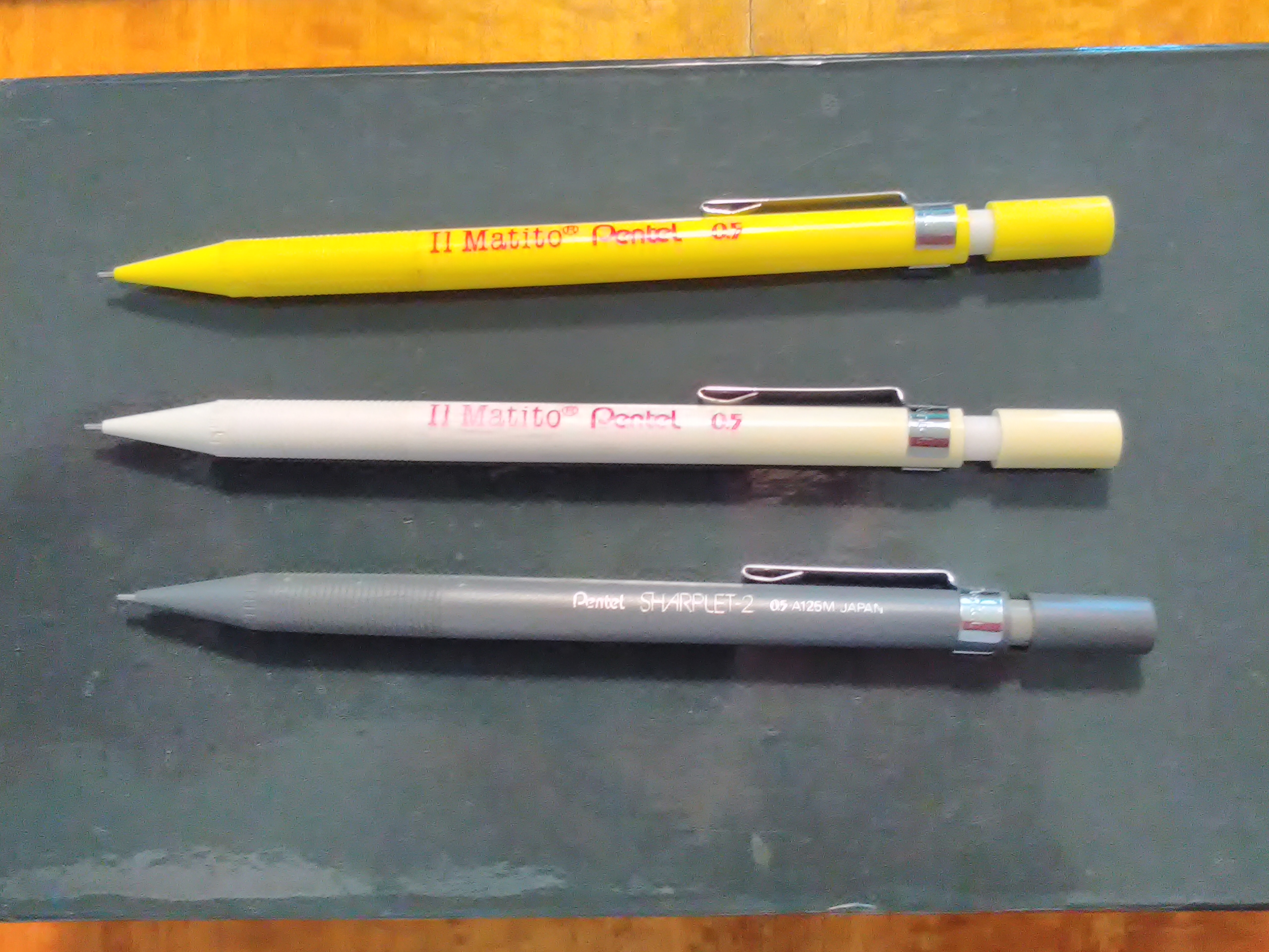 Il primo: portamine di bassa qualità (non è per forza correlato al costo), perché il sistema di avanzamento è particolare. Il "matito" della Pentel è una forza della natura. Ce ne ho uno che mi accompagna da circa trentacinque anni e guai a chi me lo tocca! Anche i Pilot e i Faber Castell in genere si difendono bene.