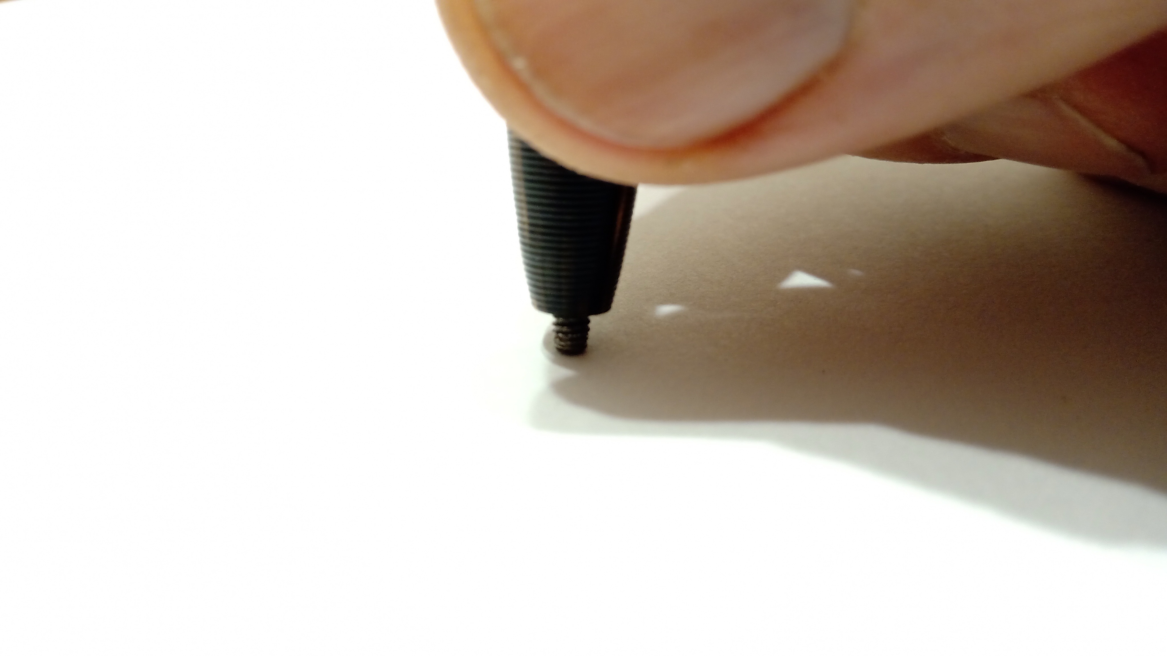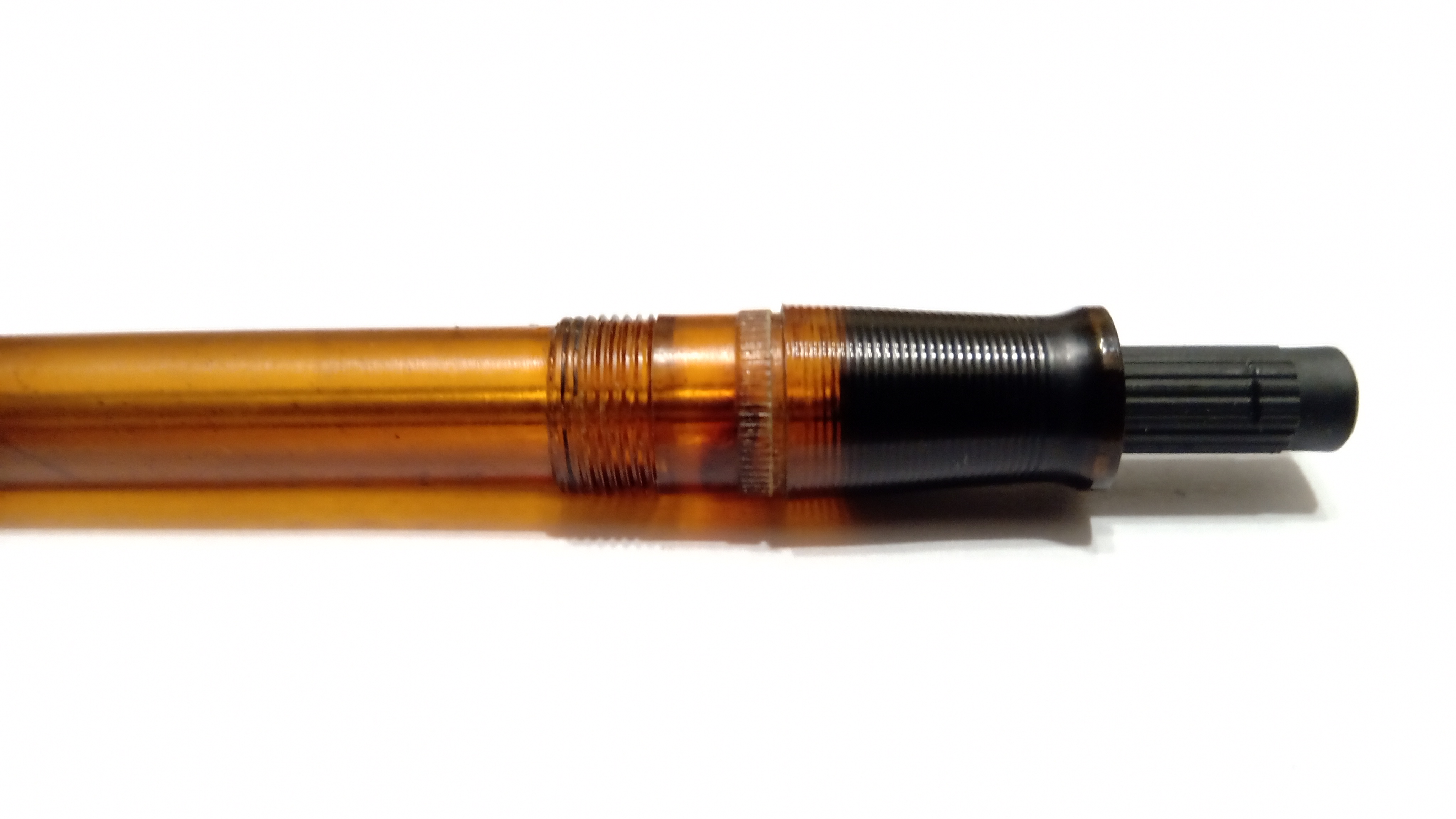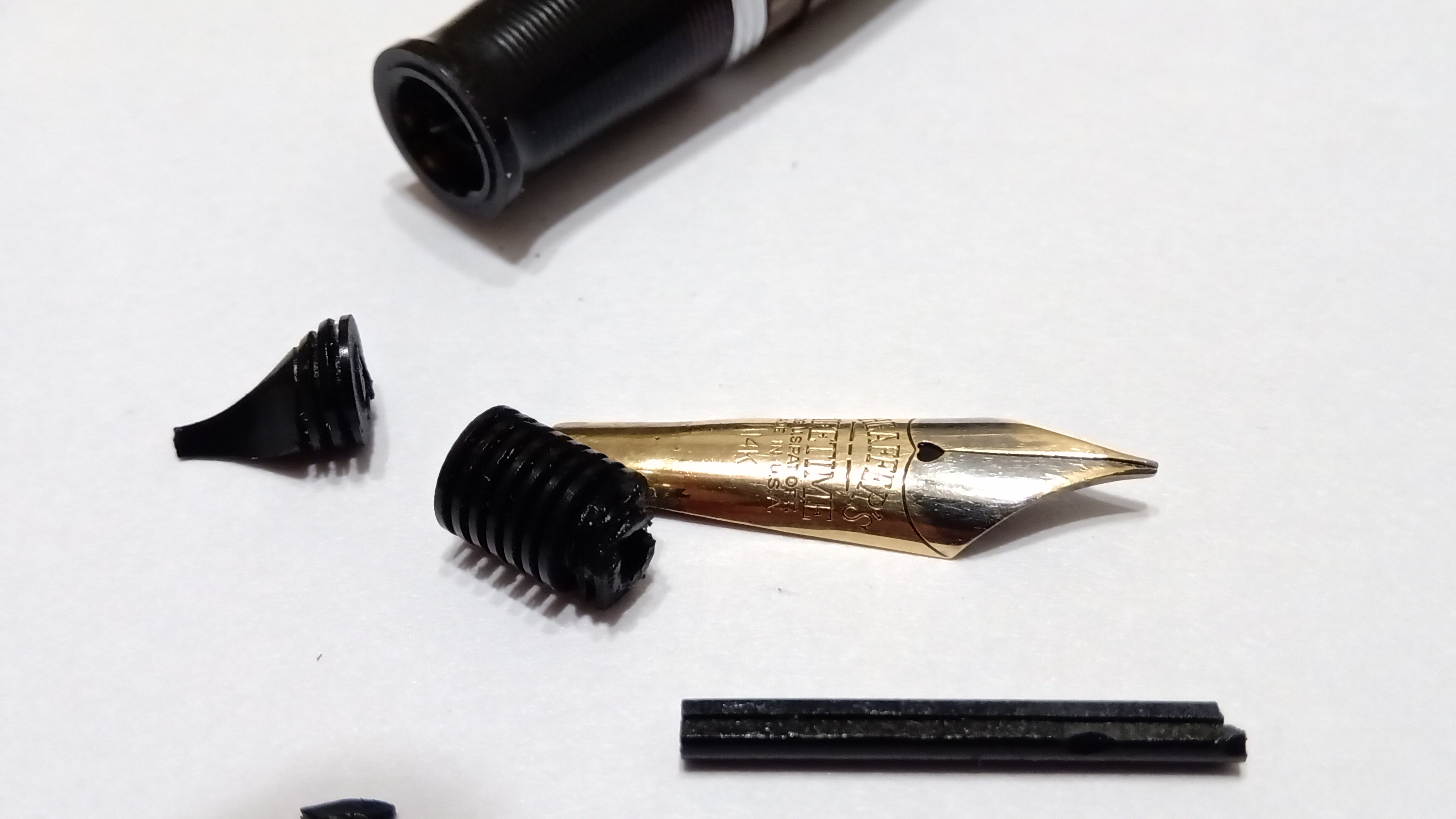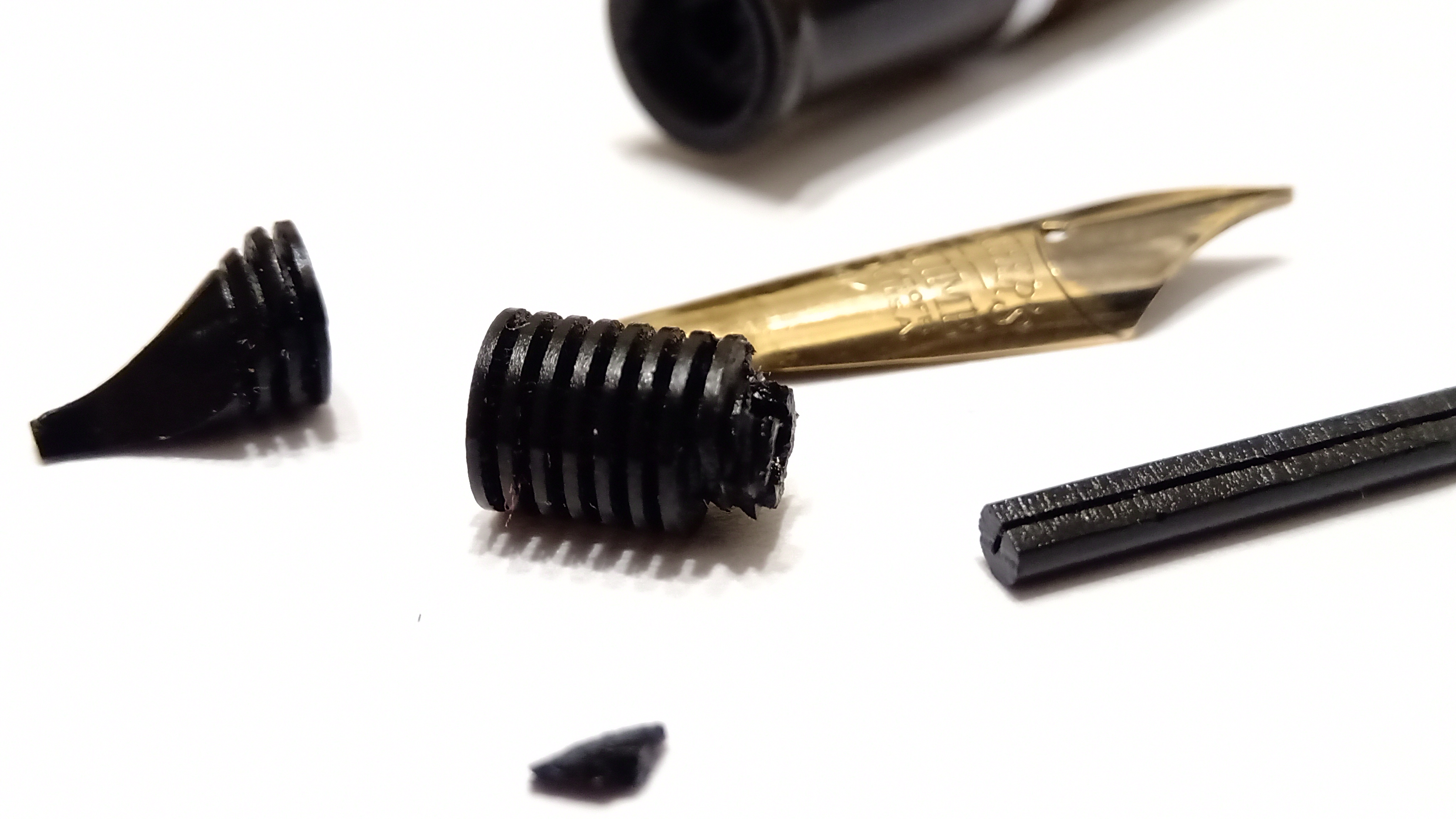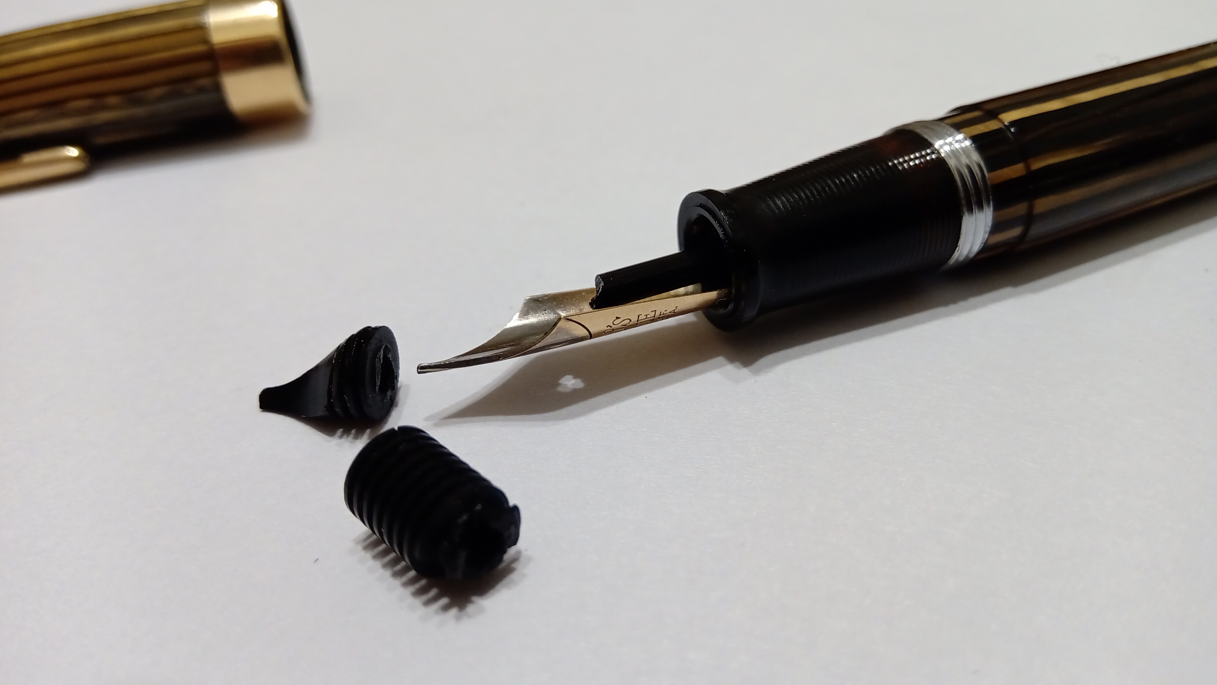 e poi ho proseguito attraverso l'alimentatore, sfilandolo con attenzione insieme al pennino dalla sua posizione nell'impugnatura (pensavo ad un successivo incollaggio)...