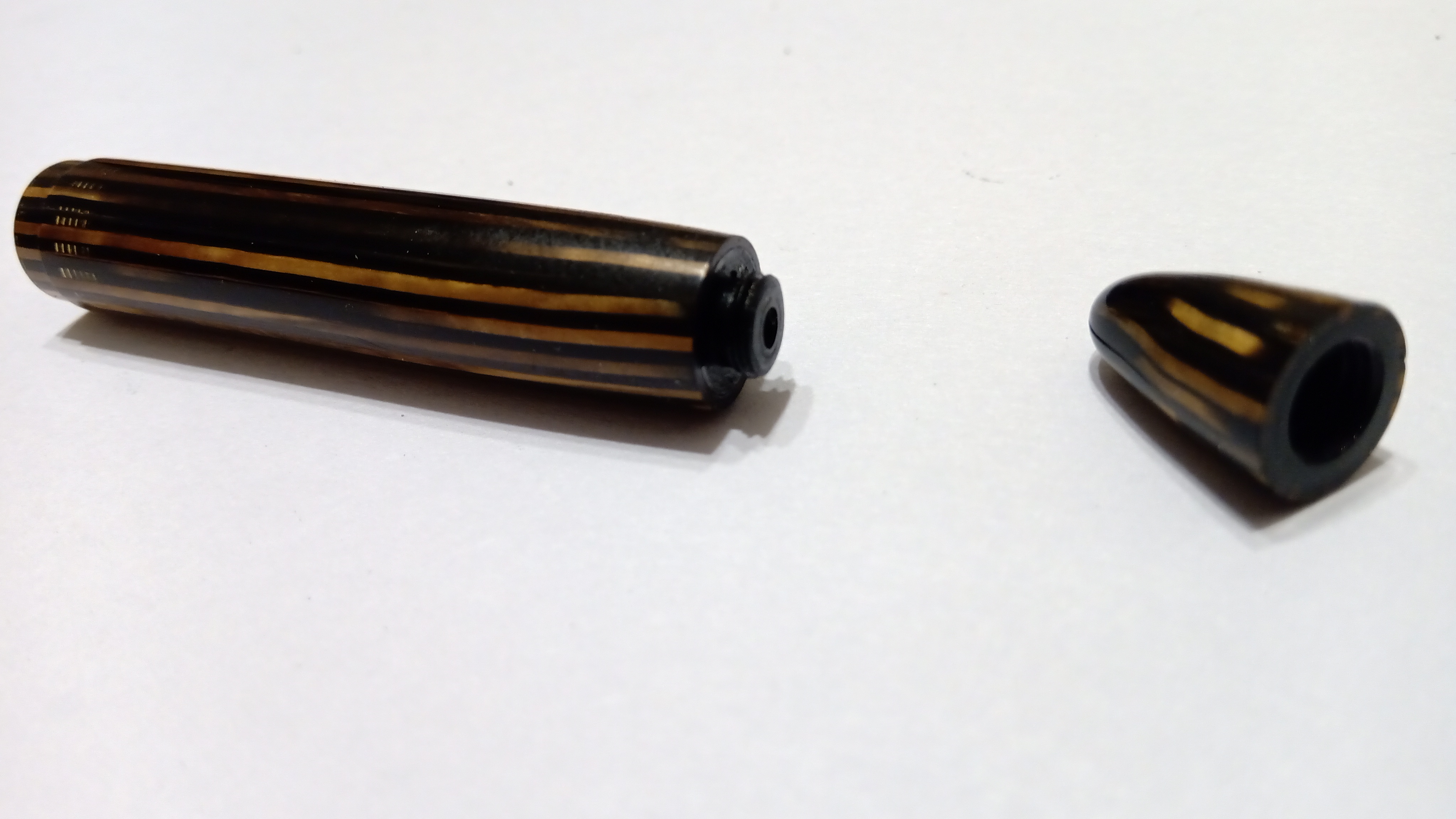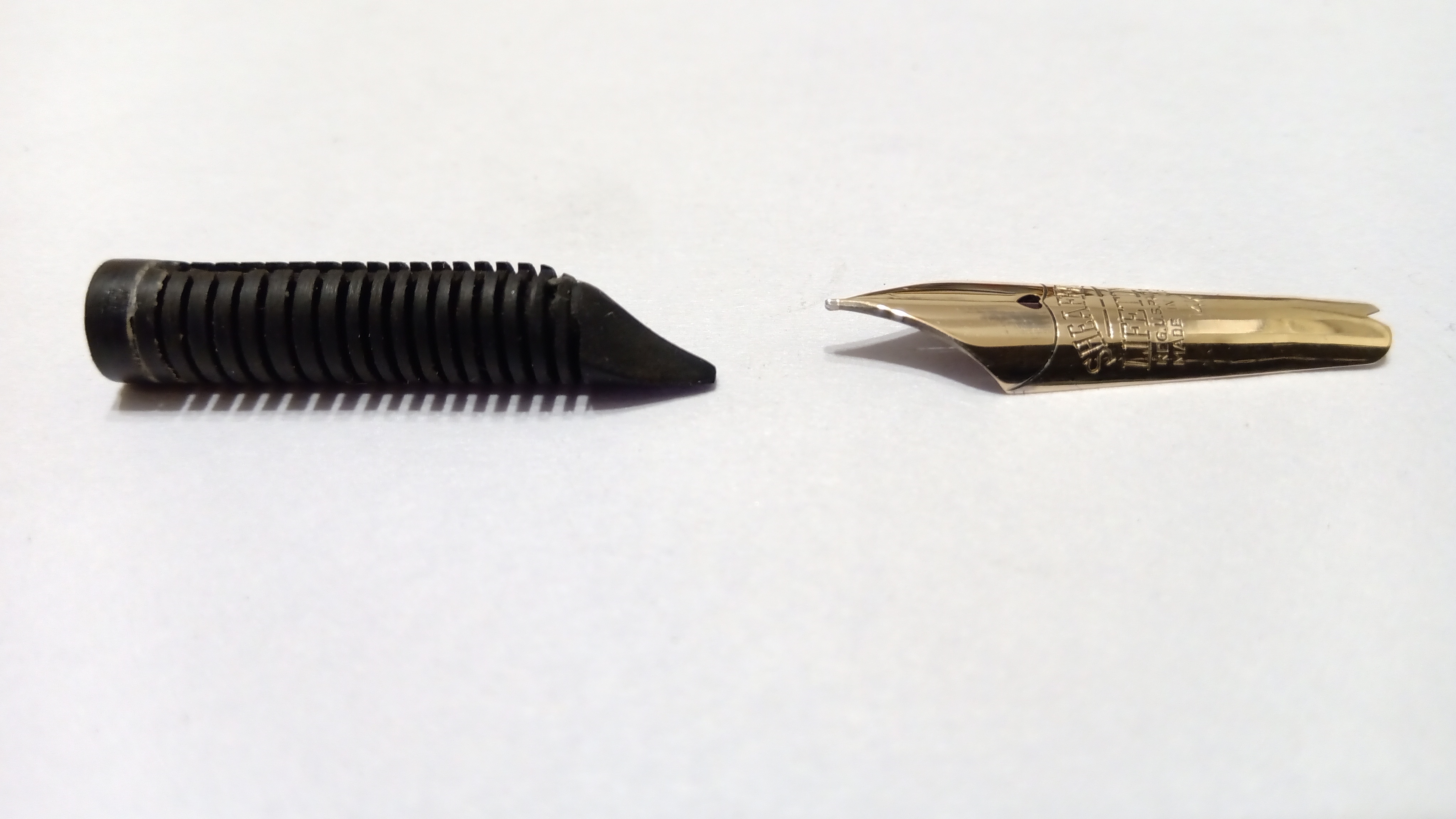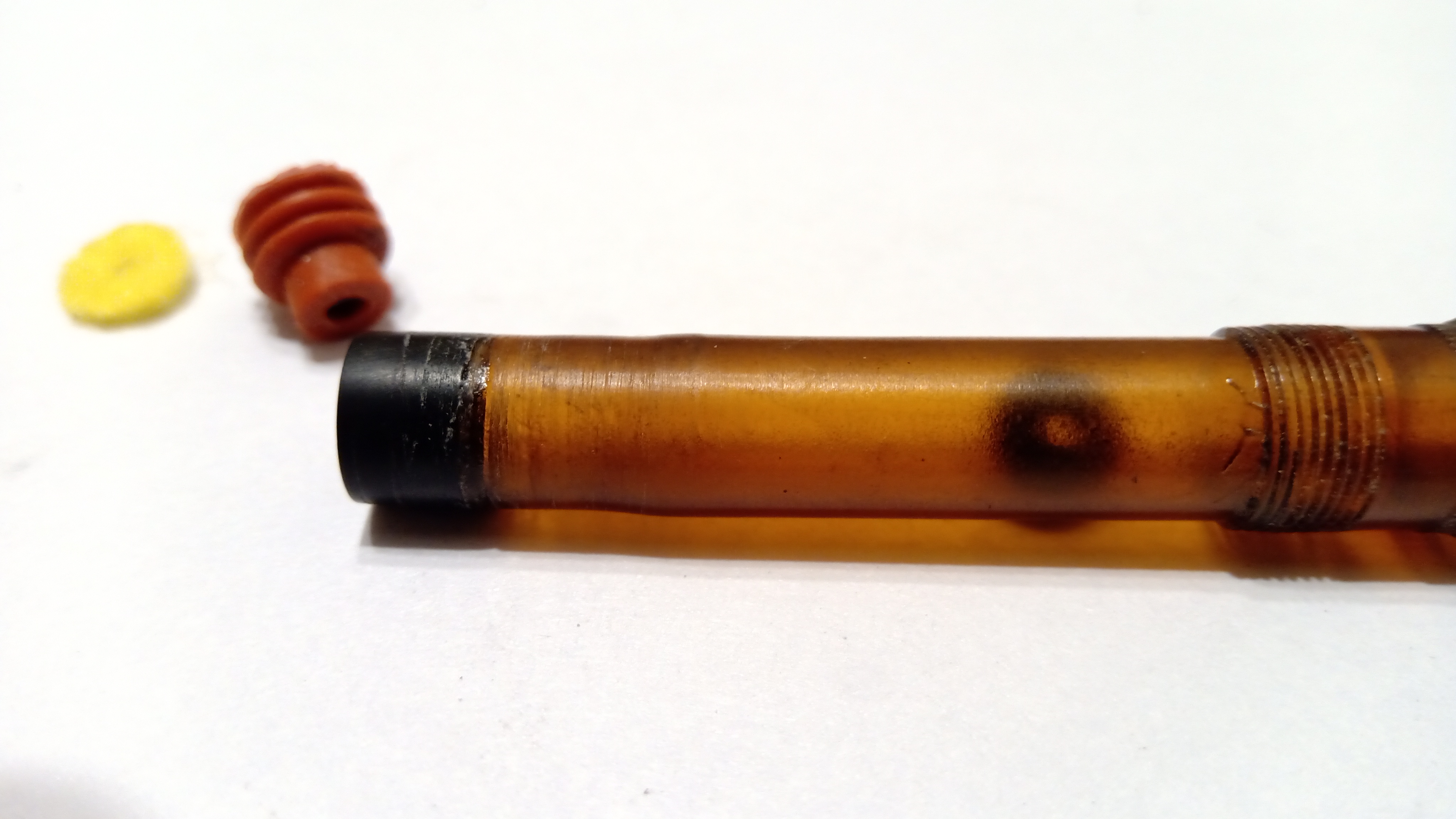 Ho quindi cercato tra la vecchia spazzatura nella mia scatola dei ricambi un alimentatore in ebanite Sheaffer's, ma ne ho trovato solo uno con un diametro e una lunghezza maggiori e una punta diversa. Con molta pazienza ho gradualmente ridotto il diametro, ridotto la lunghezza a quella dell'originale, e poi ho intagliato l'estremità secondo l'intaglio che avevano quei modelli di alimentatore...