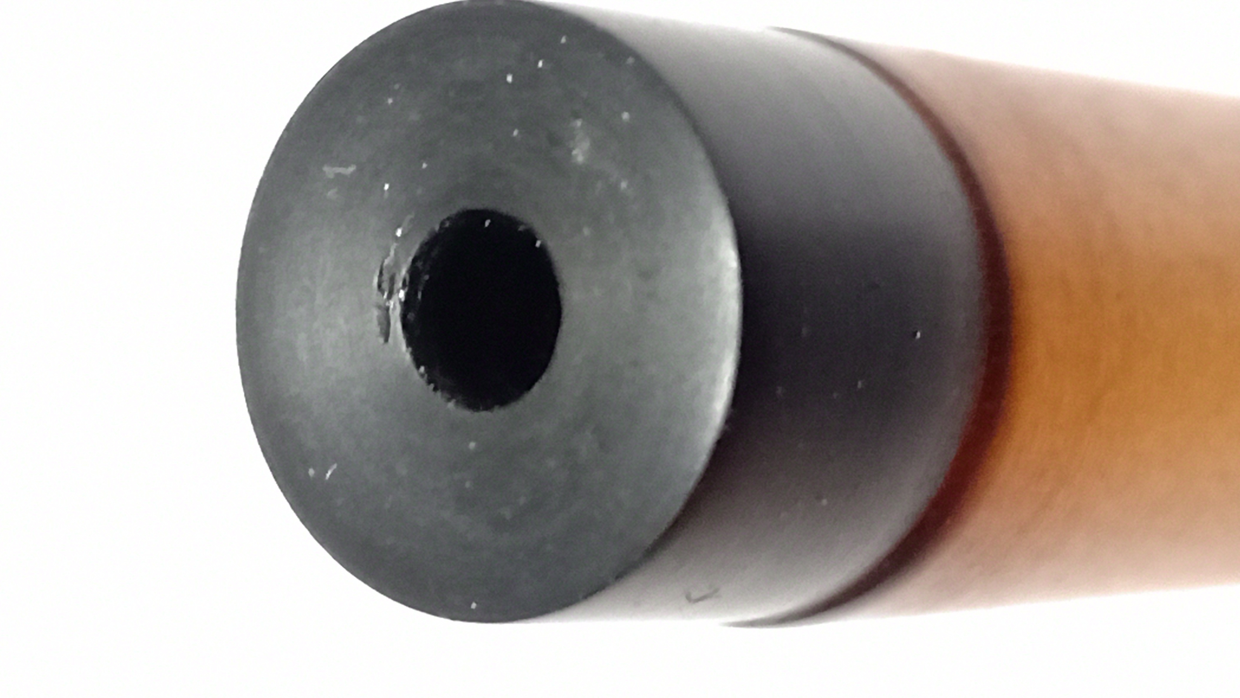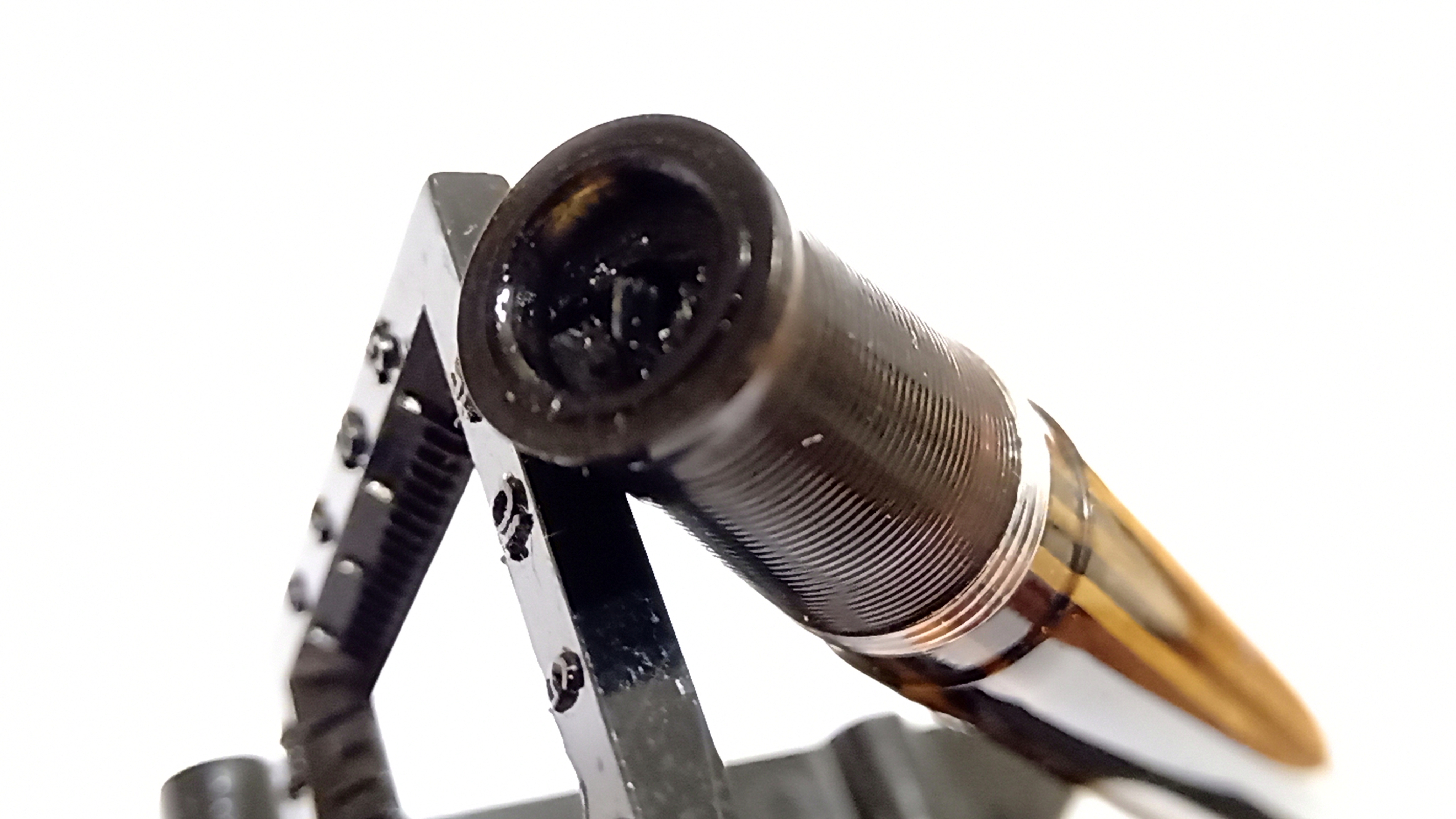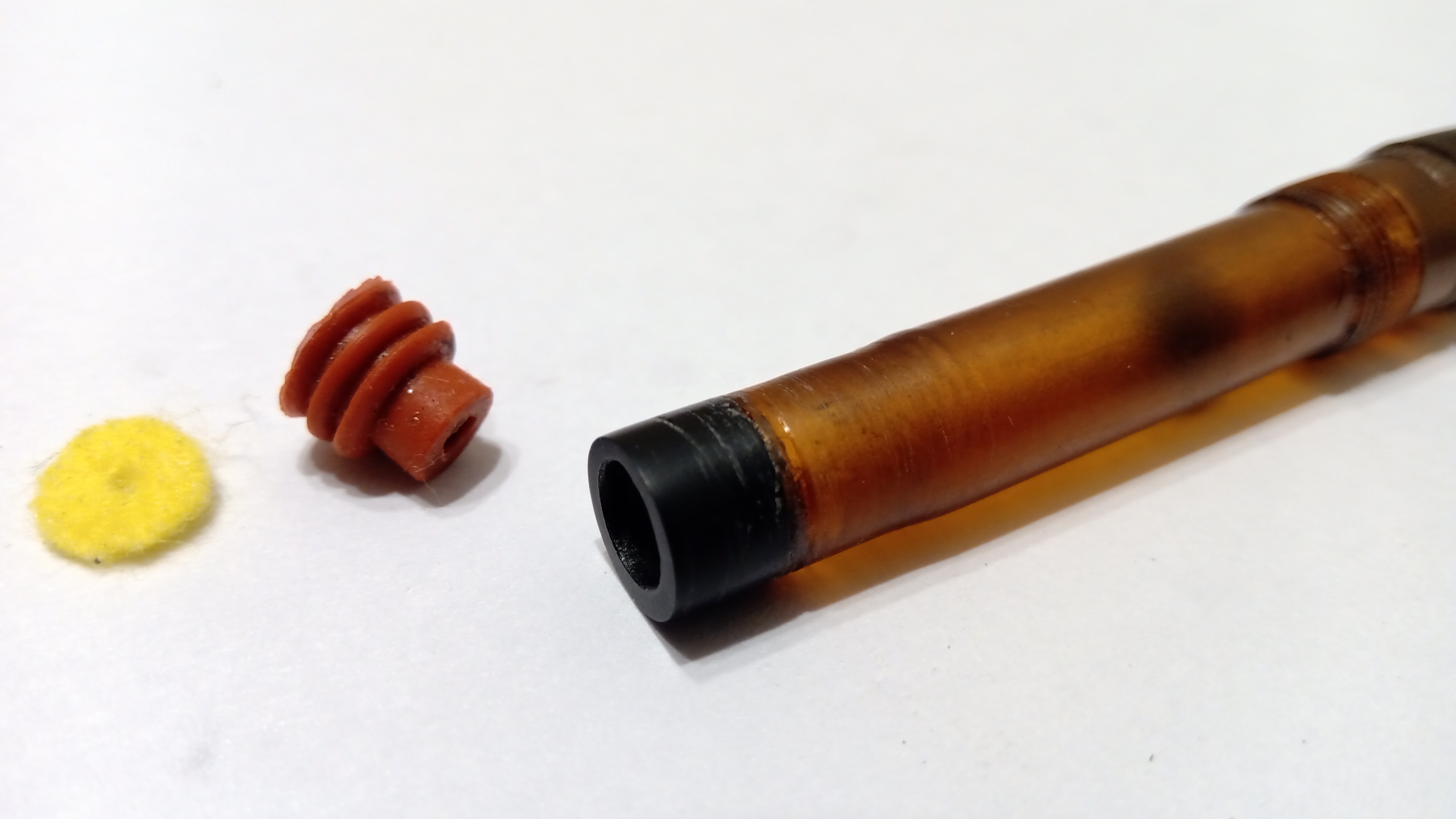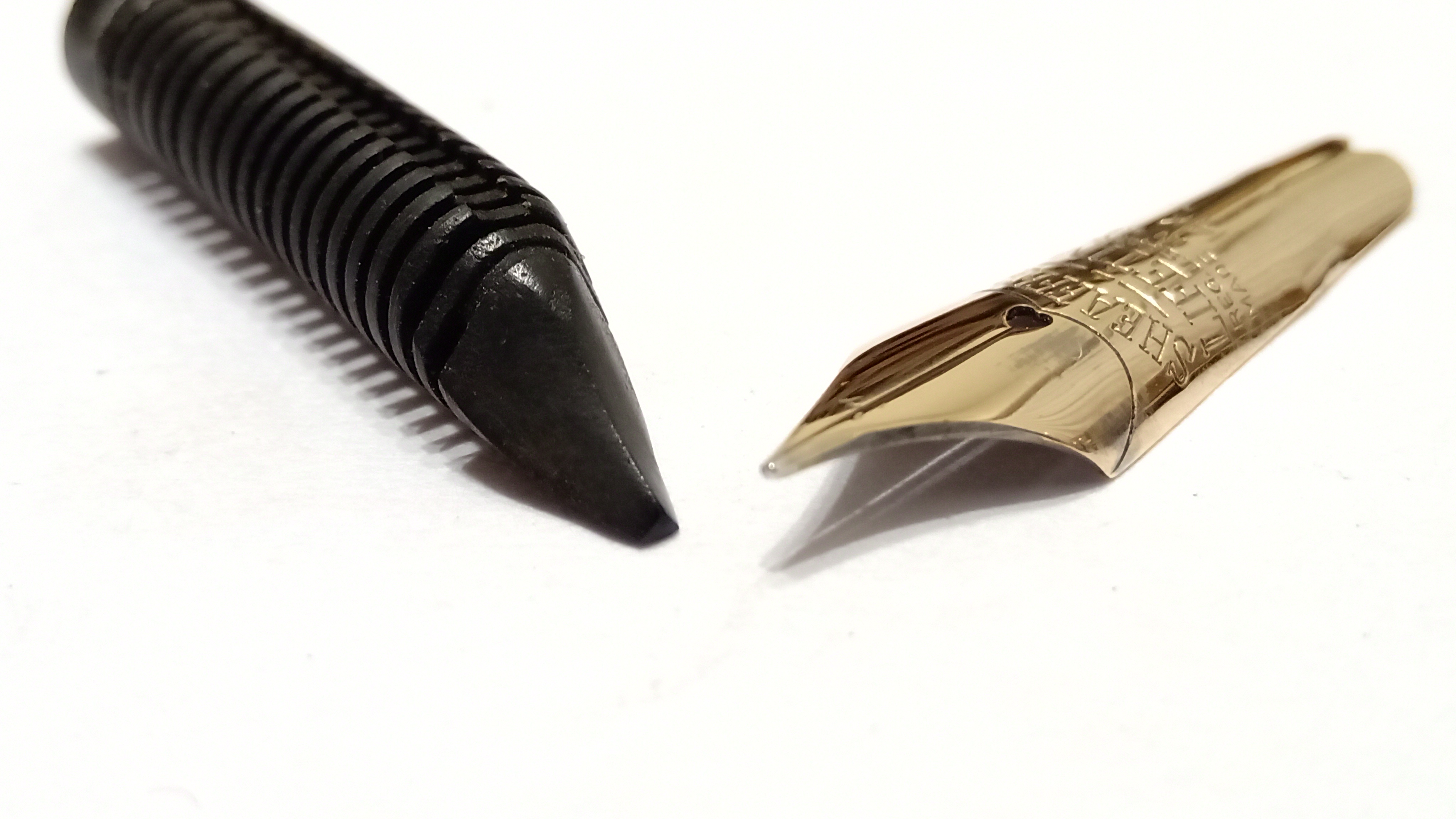 Ho quindi cercato tra la vecchia spazzatura nella mia scatola dei ricambi un alimentatore in ebanite Sheaffer's, ma ne ho trovato solo uno con un diametro e una lunghezza maggiori e una punta diversa. Con molta pazienza ho gradualmente ridotto il diametro, ridotto la lunghezza a quella dell'originale, e poi ho intagliato l'estremità secondo l'intaglio che avevano quei modelli di alimentatore...