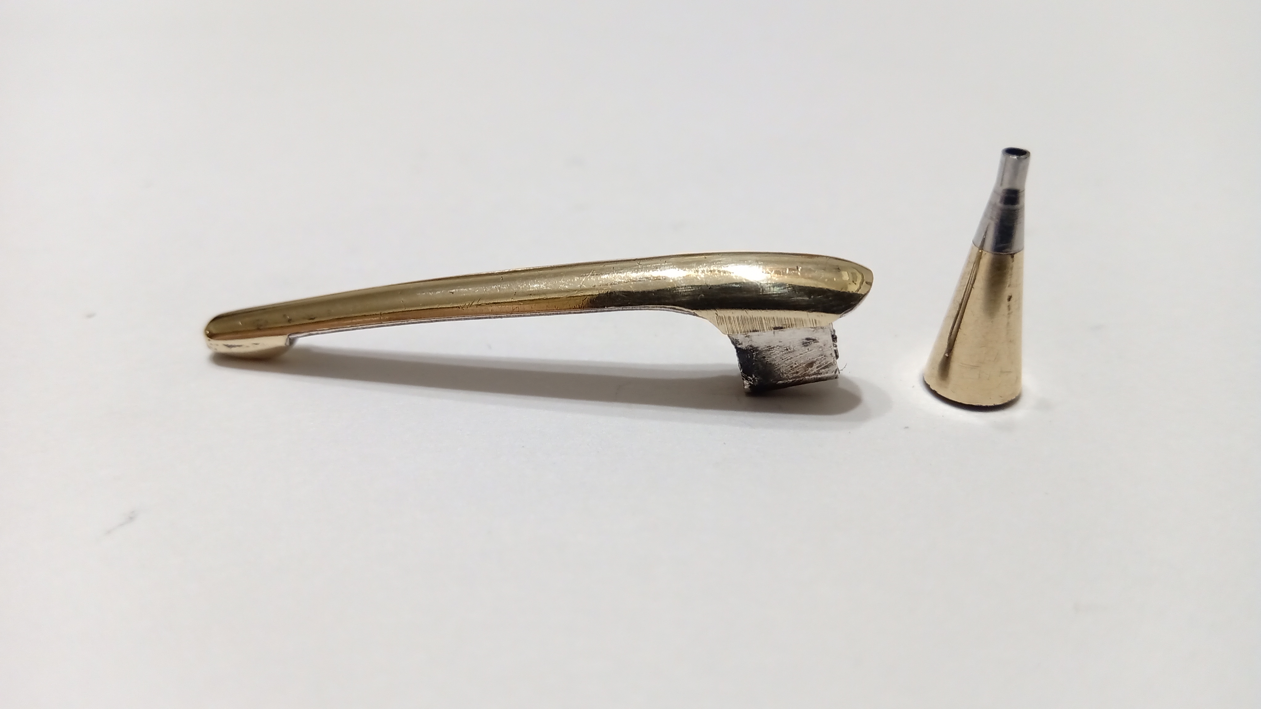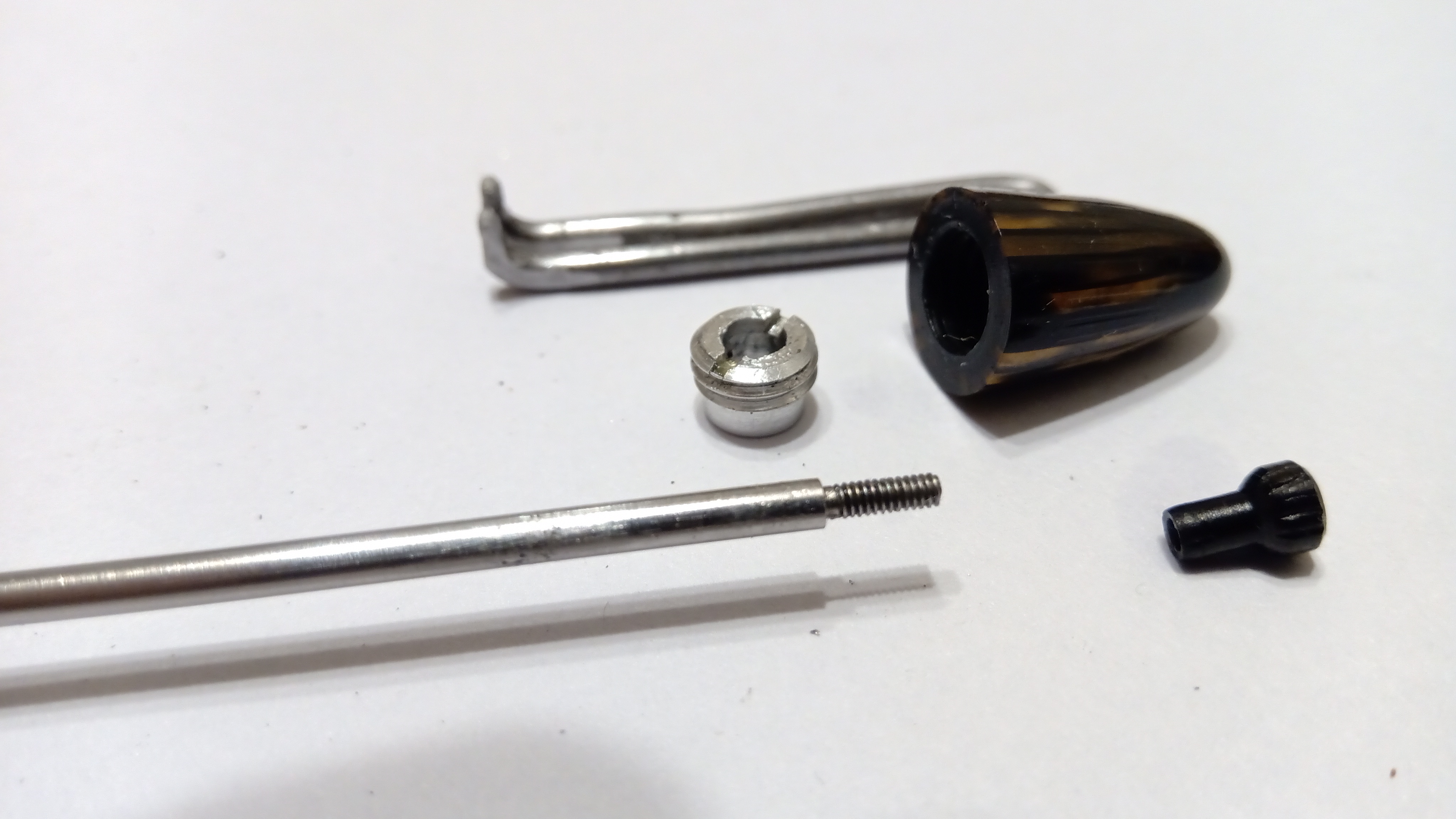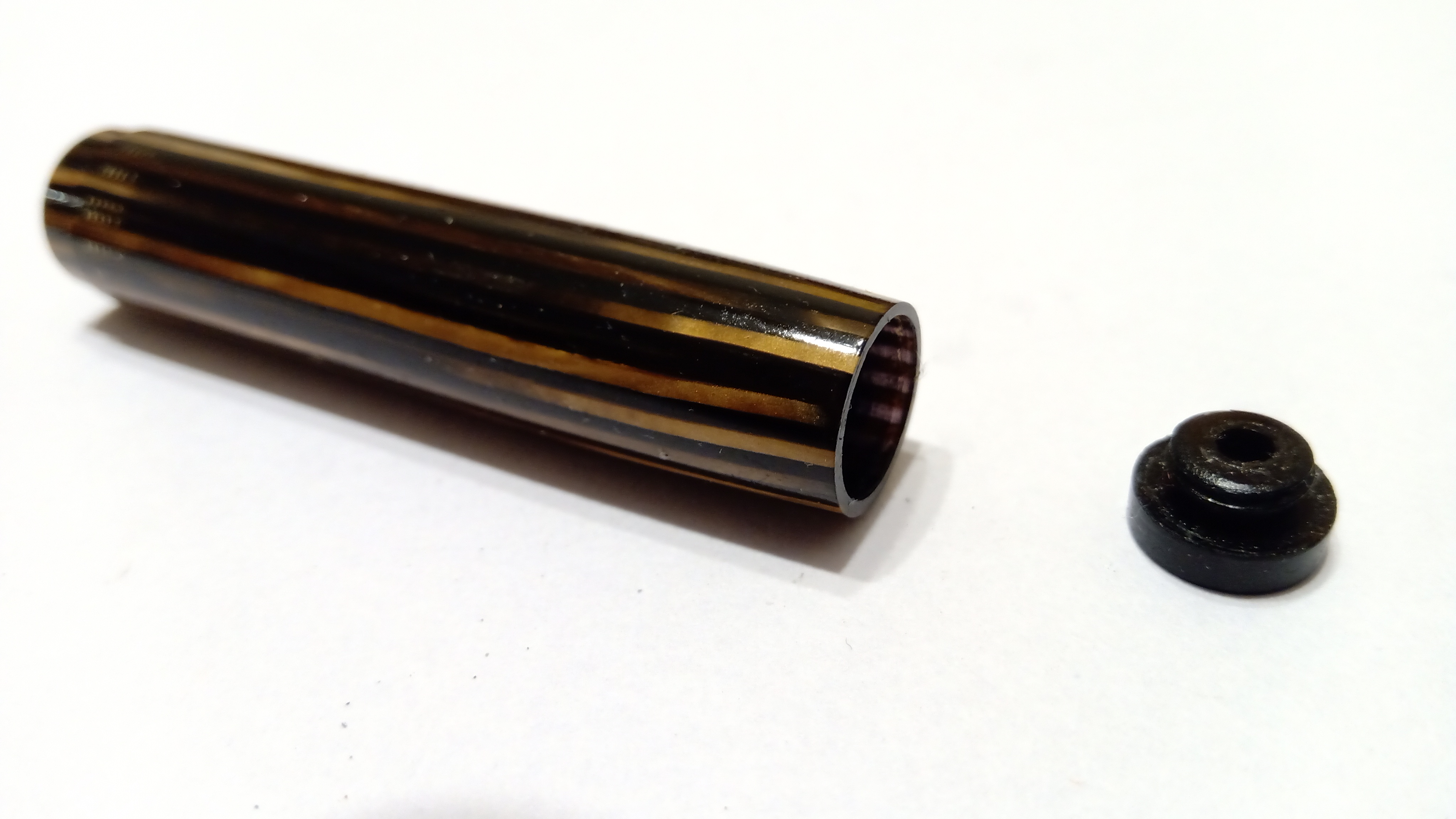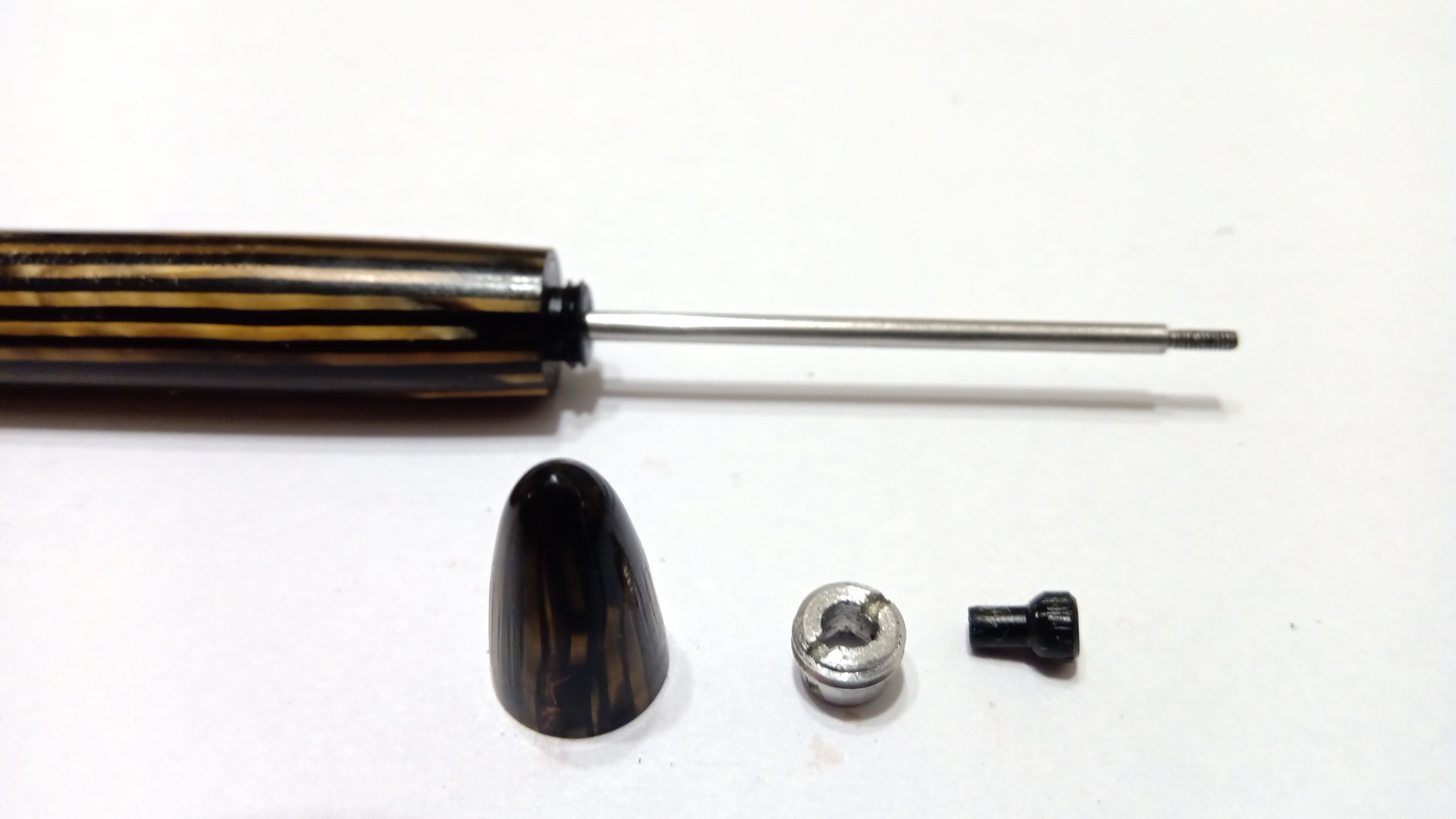 Ho continuato con il tappo cieco che funge da estremità dello stelo, utilizzando un po' di WD40 e uno strumento che ho realizzato appositamente per svitare l'anello di alluminio che fissa l'estremità dello stelo. Tolto l'anello si scopre la chiusura terminale che articola l'insieme, ed essendo di celluloide va svitata con estrema attenzione, facendo attenzione a non segnare con due pezzi di legno l'asta di acciaio, e la celluloide bloccare, se necessario, con un pezzo di gomma...