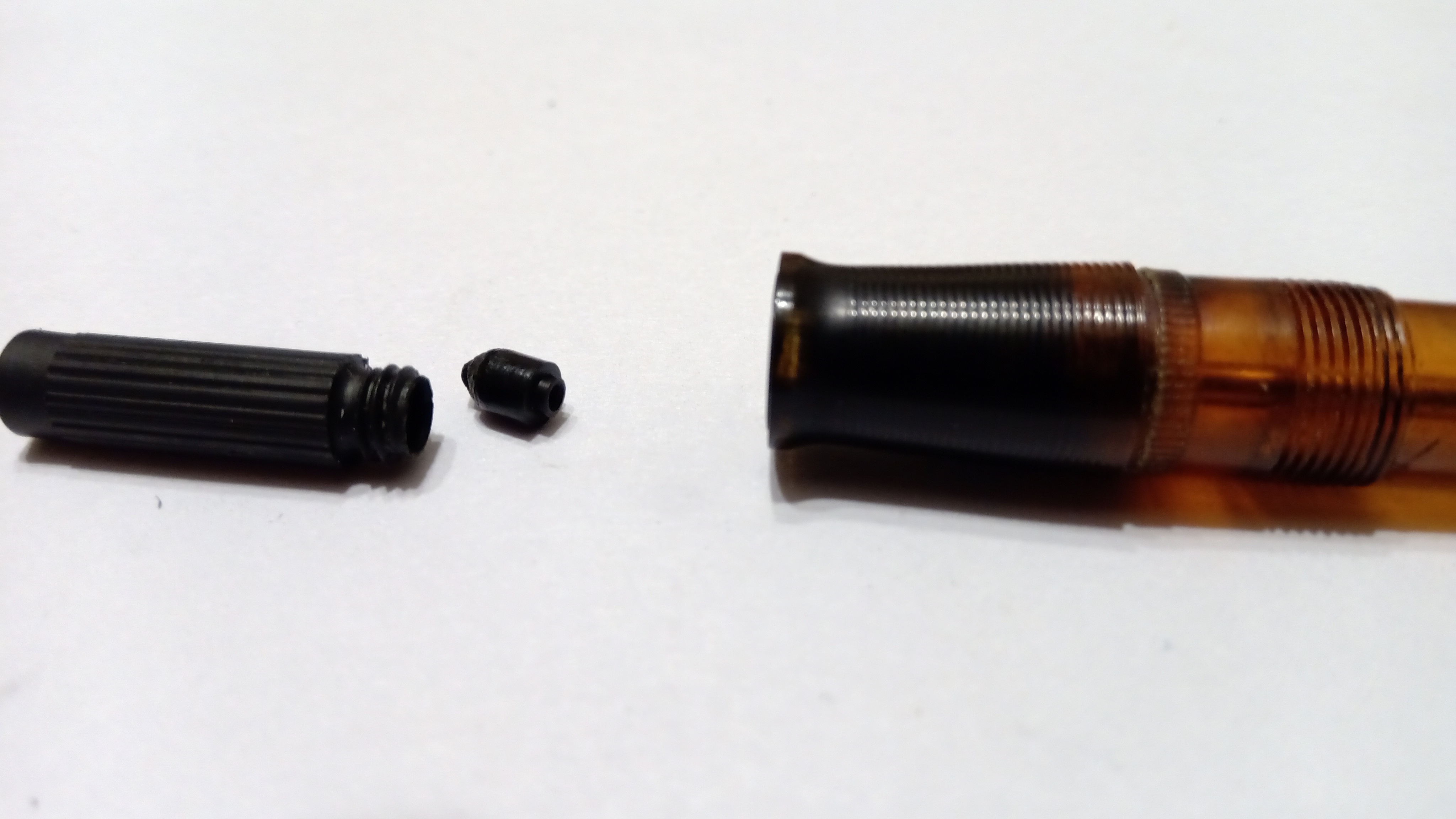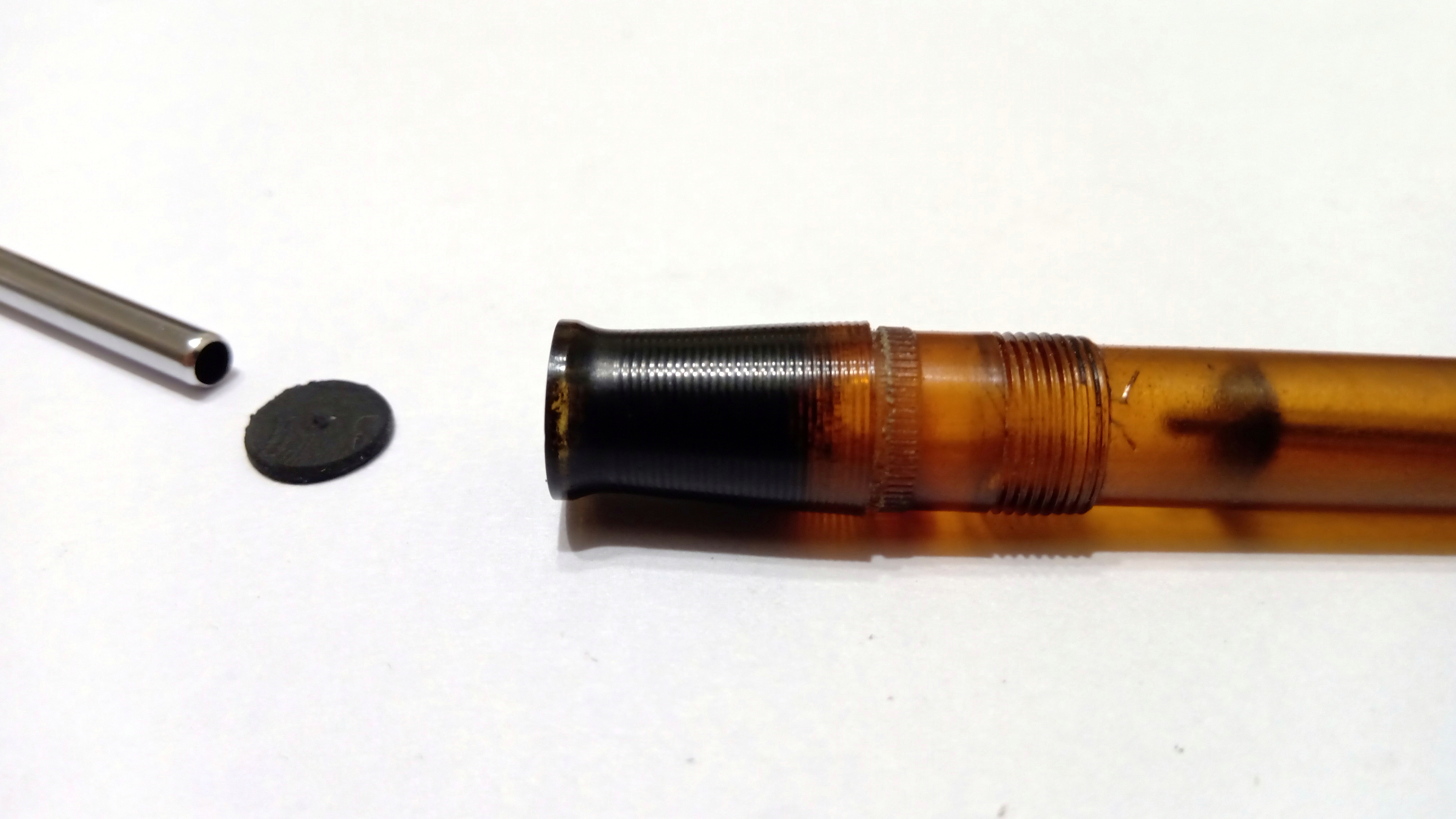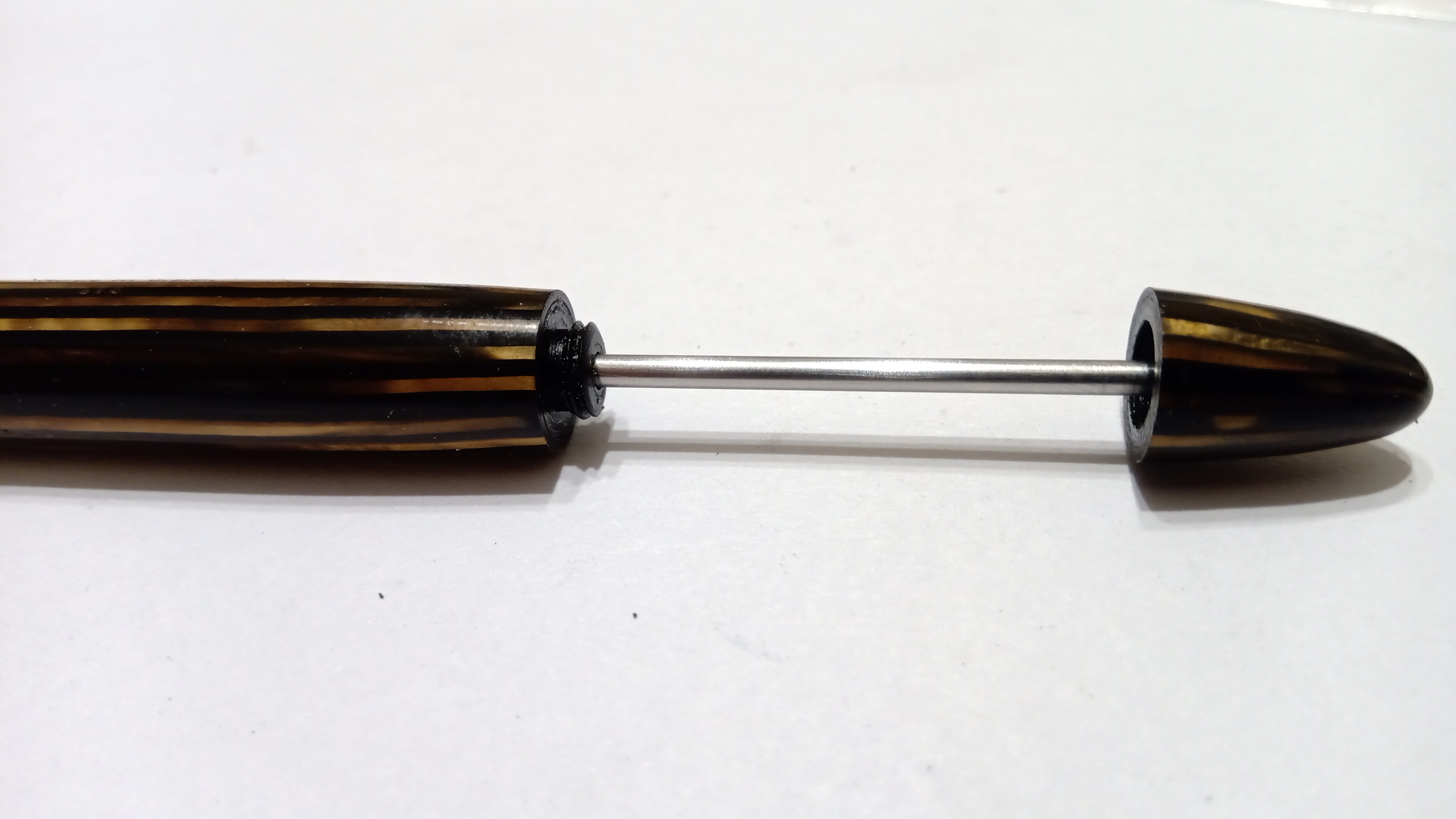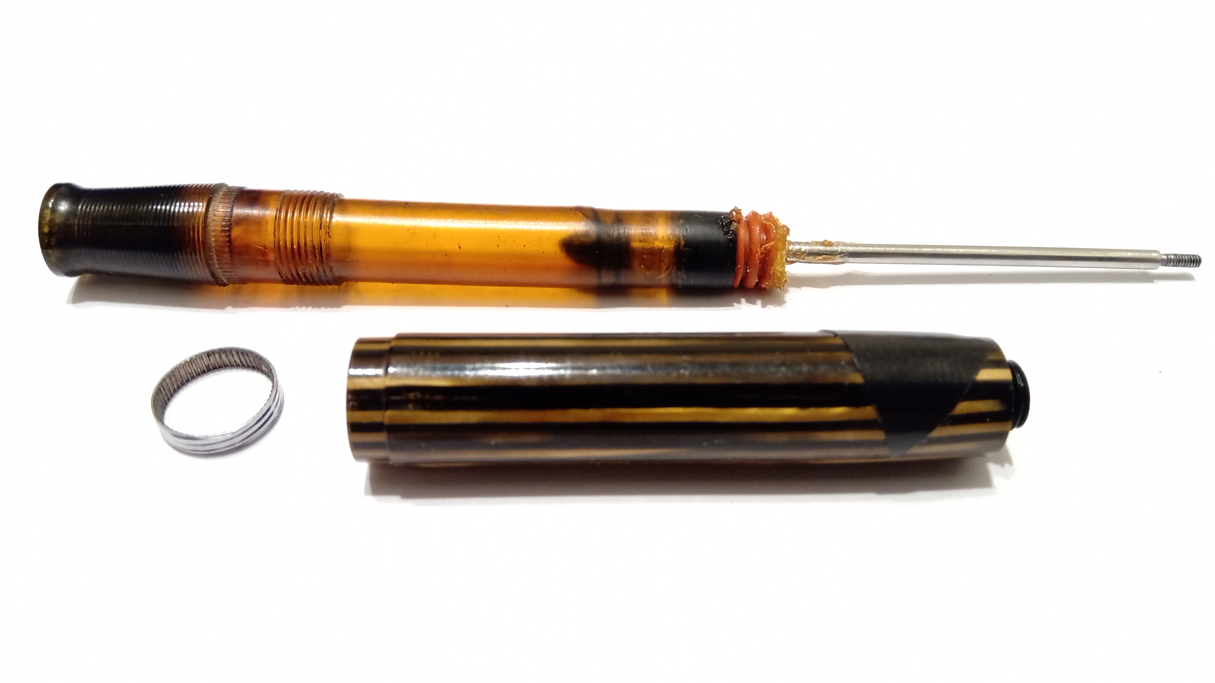 Proseguendo l'indagine ho anche potuto scoprire che l'idea di Sheaffer's nel posizionare questo manicotto, che era solidale con l'impugnatura e con il tappo di ritenzione dello stelo (cioè un set), era che il set fosse sostituibile o "usa e getta", senza dover pasticciare con il costoso fusto in celluloide laminata. Naturalmente forse non avevano pensato che un secolo dopo questi preziosi pezzi avrebbero continuato a funzionare e sarebbe stato quasi impossibile trovare un set sostitutivo.