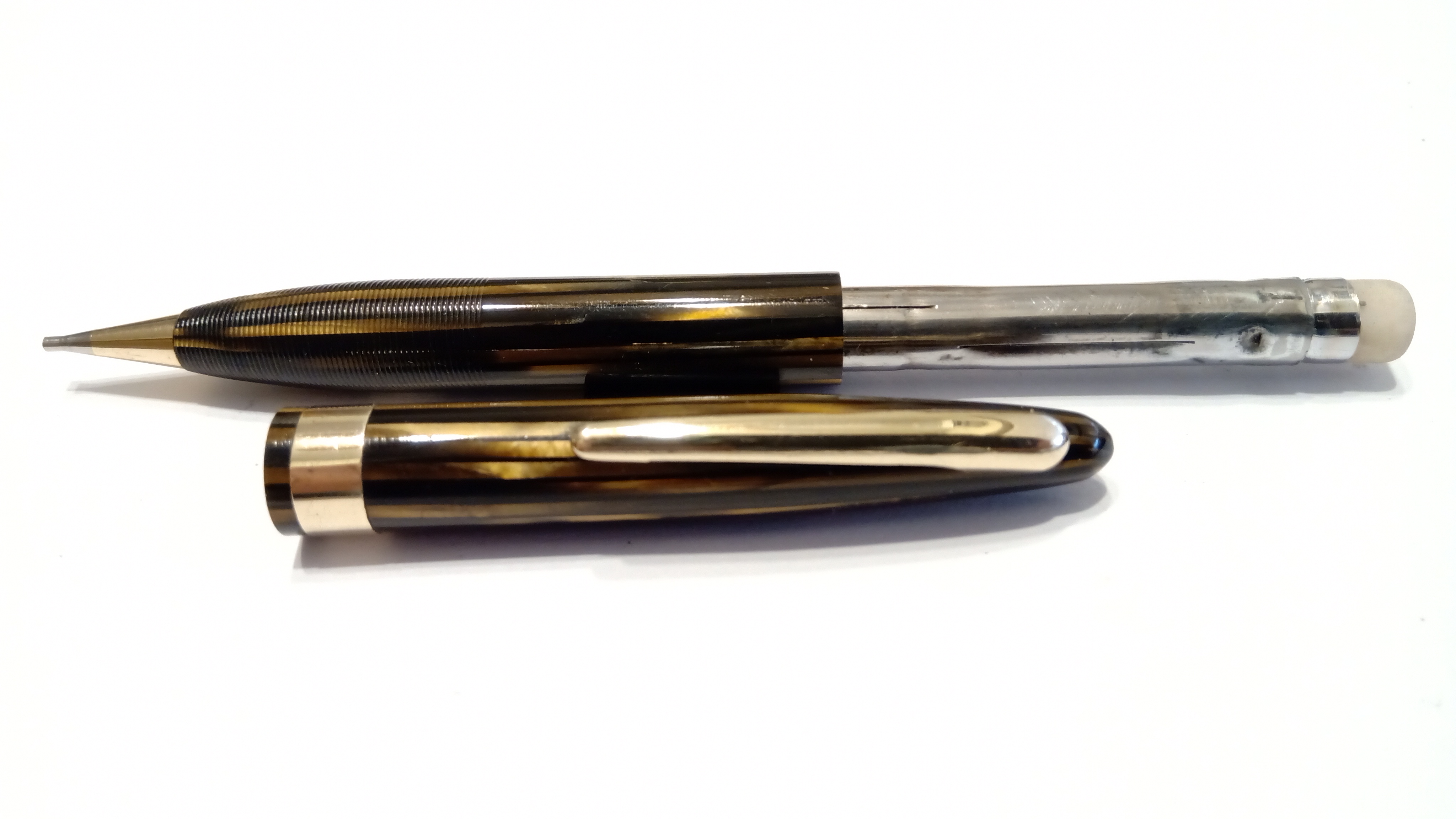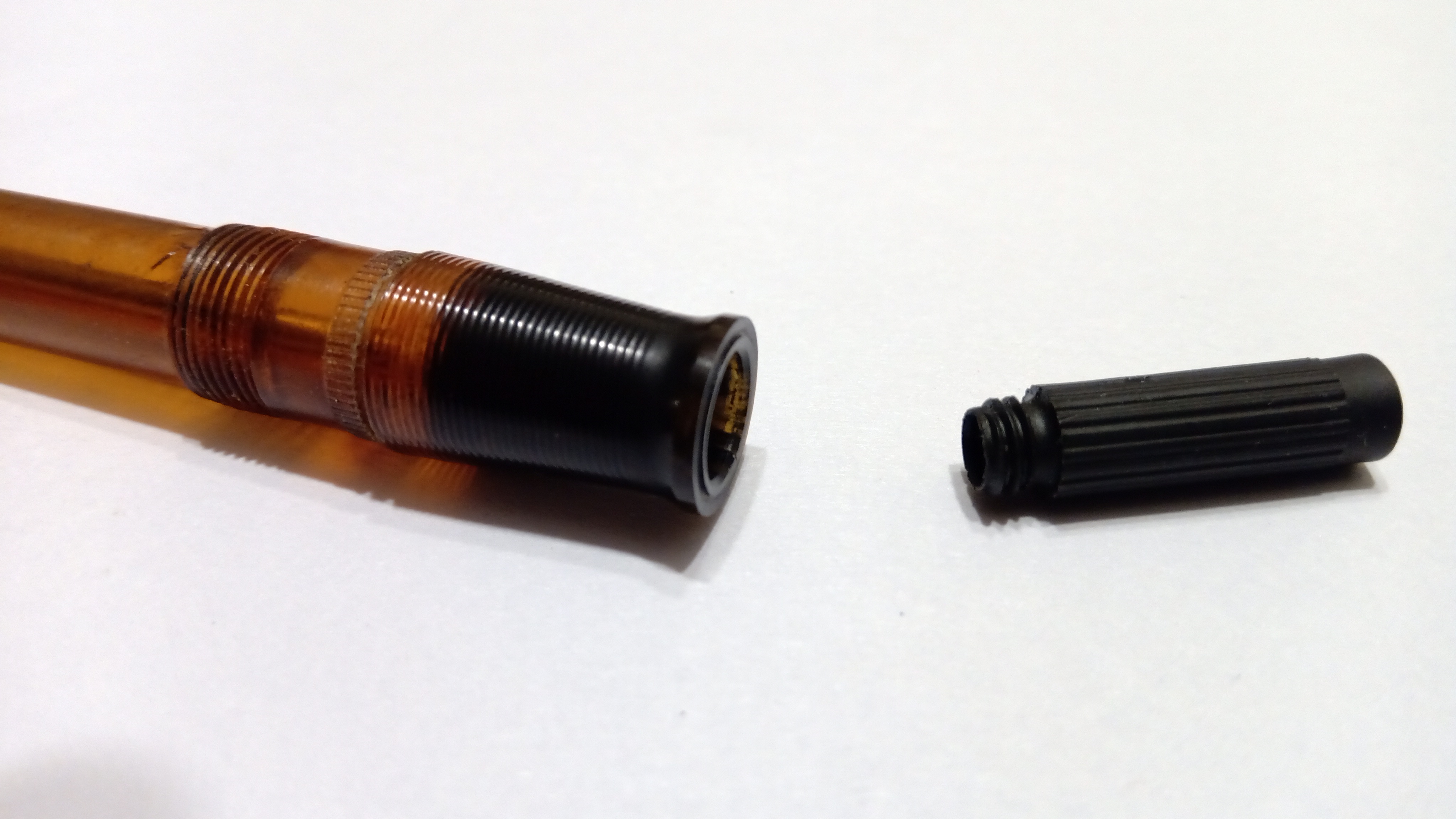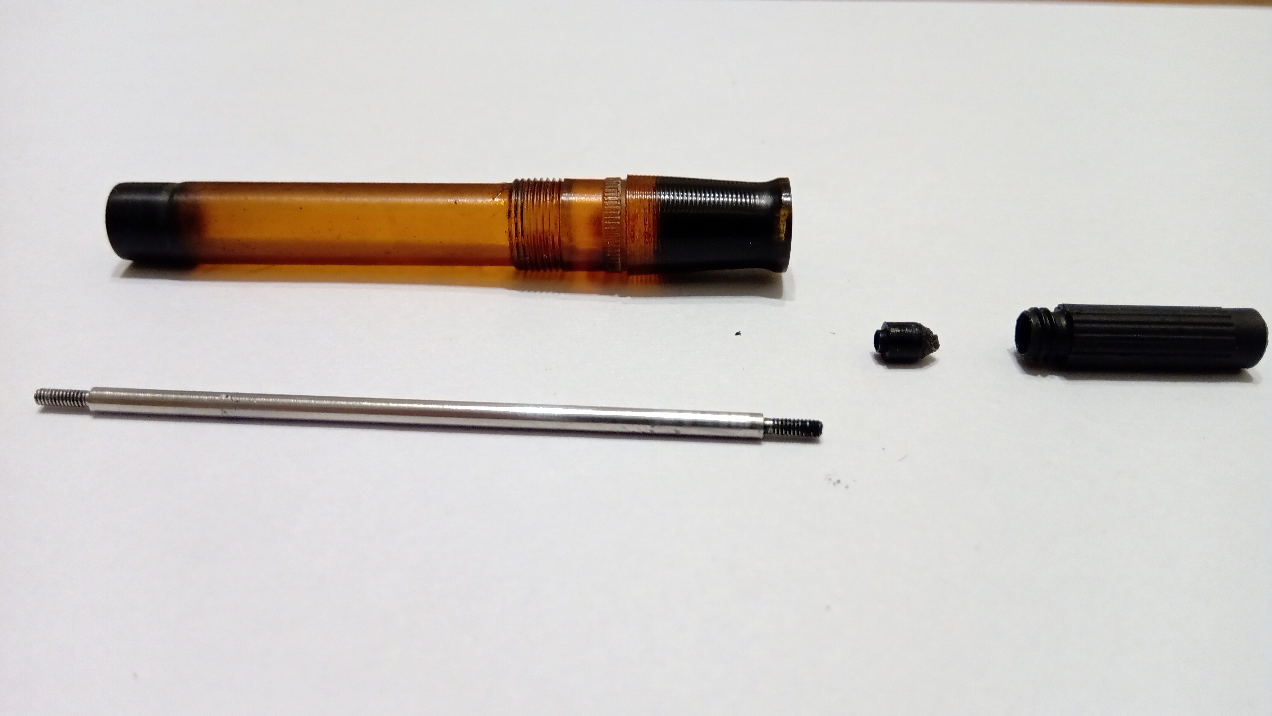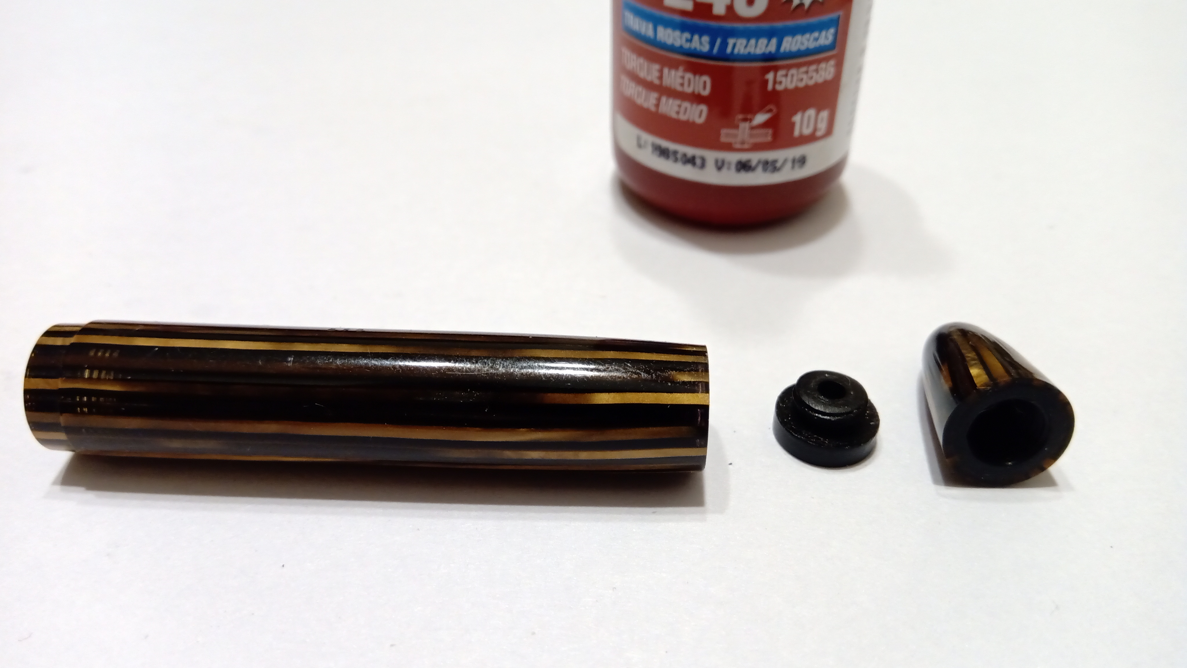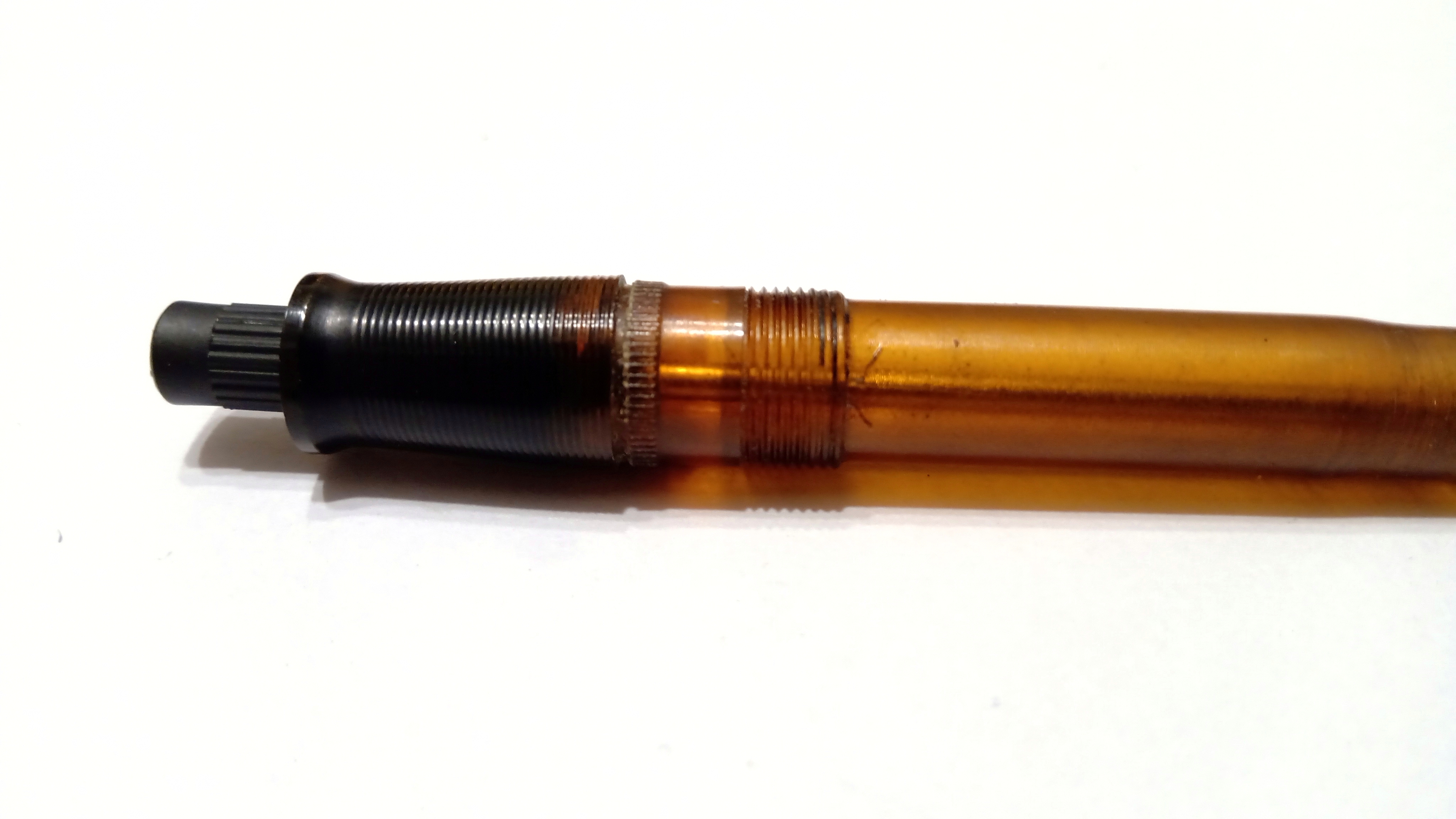 Proseguendo l'indagine ho anche potuto scoprire che l'idea di Sheaffer's nel posizionare questo manicotto, che era solidale con l'impugnatura e con il tappo di ritenzione dello stelo (cioè un set), era che il set fosse sostituibile o "usa e getta", senza dover pasticciare con il costoso fusto in celluloide laminata. Naturalmente forse non avevano pensato che un secolo dopo questi preziosi pezzi avrebbero continuato a funzionare e sarebbe stato quasi impossibile trovare un set sostitutivo.