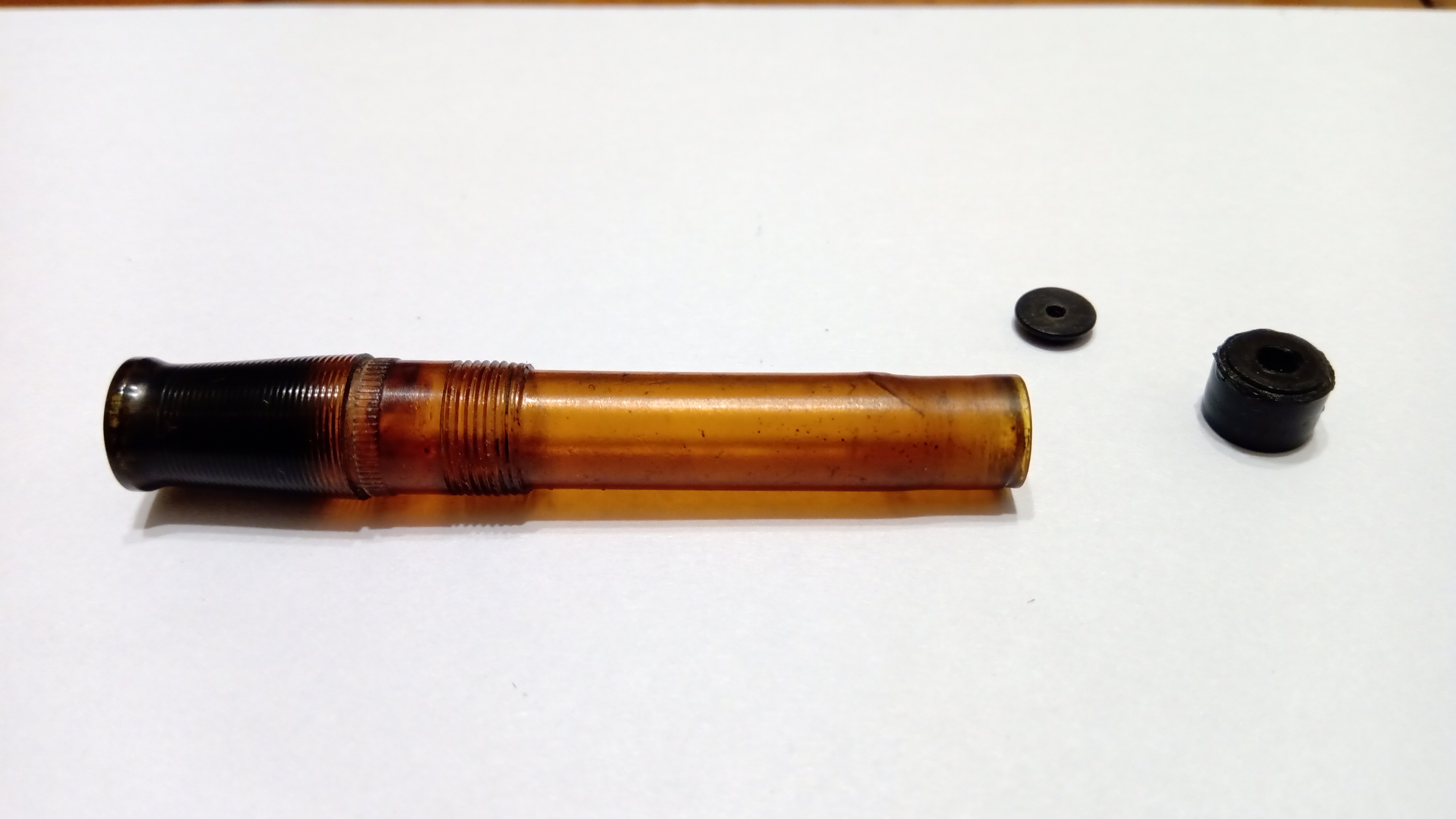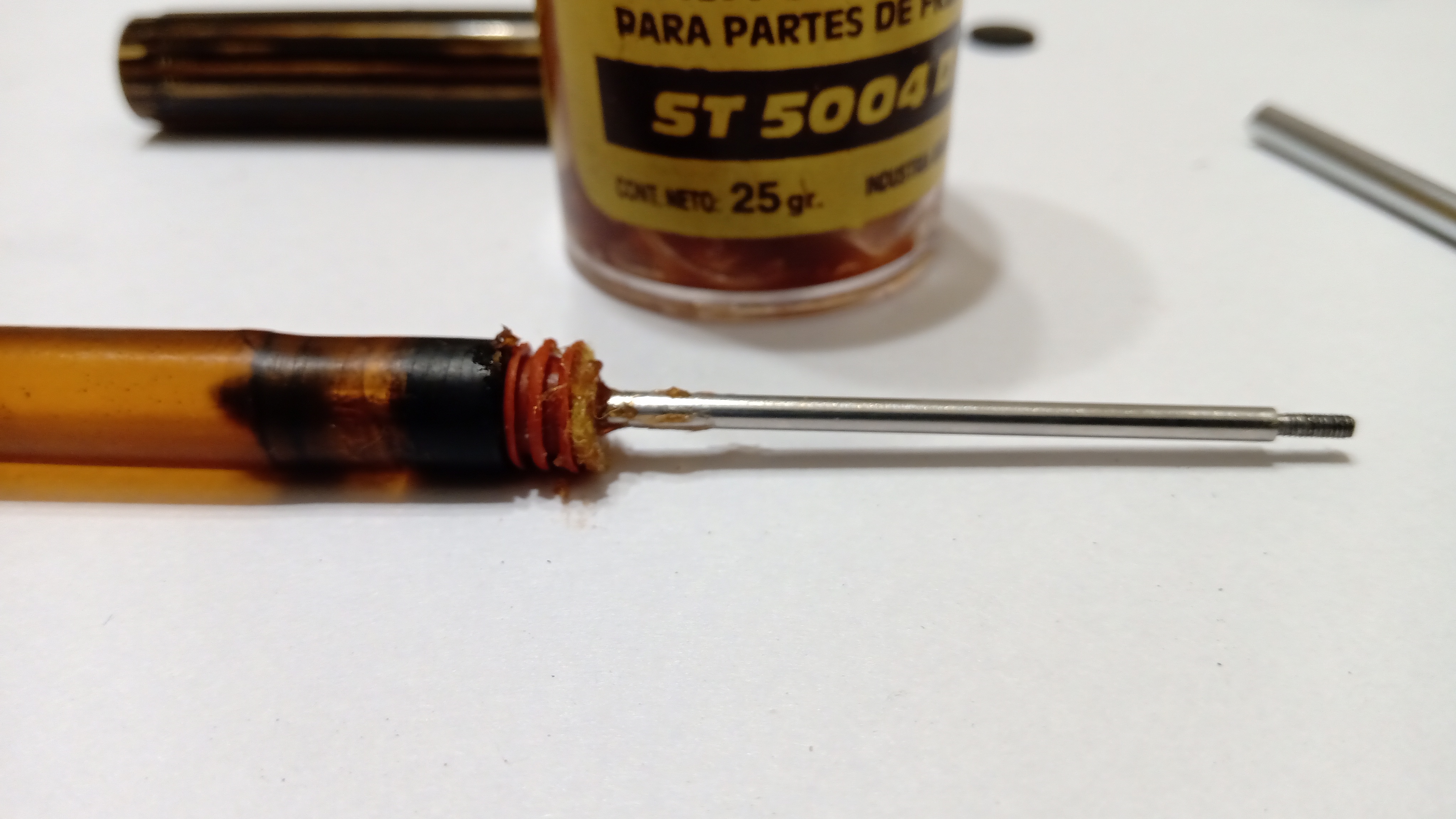 Con il calore e qualche piccolo colpetto dall'estremità dell'impugnatura utilizzando un'asta metallica, sono riuscito a staccare la capsula e rimuovere la rondella in celluloide che si trova all'estremità dello stelo o asta metallica. Questa rondella di celluloide è quella che supporta e fissa la rondella di gomma per generare il vuoto...