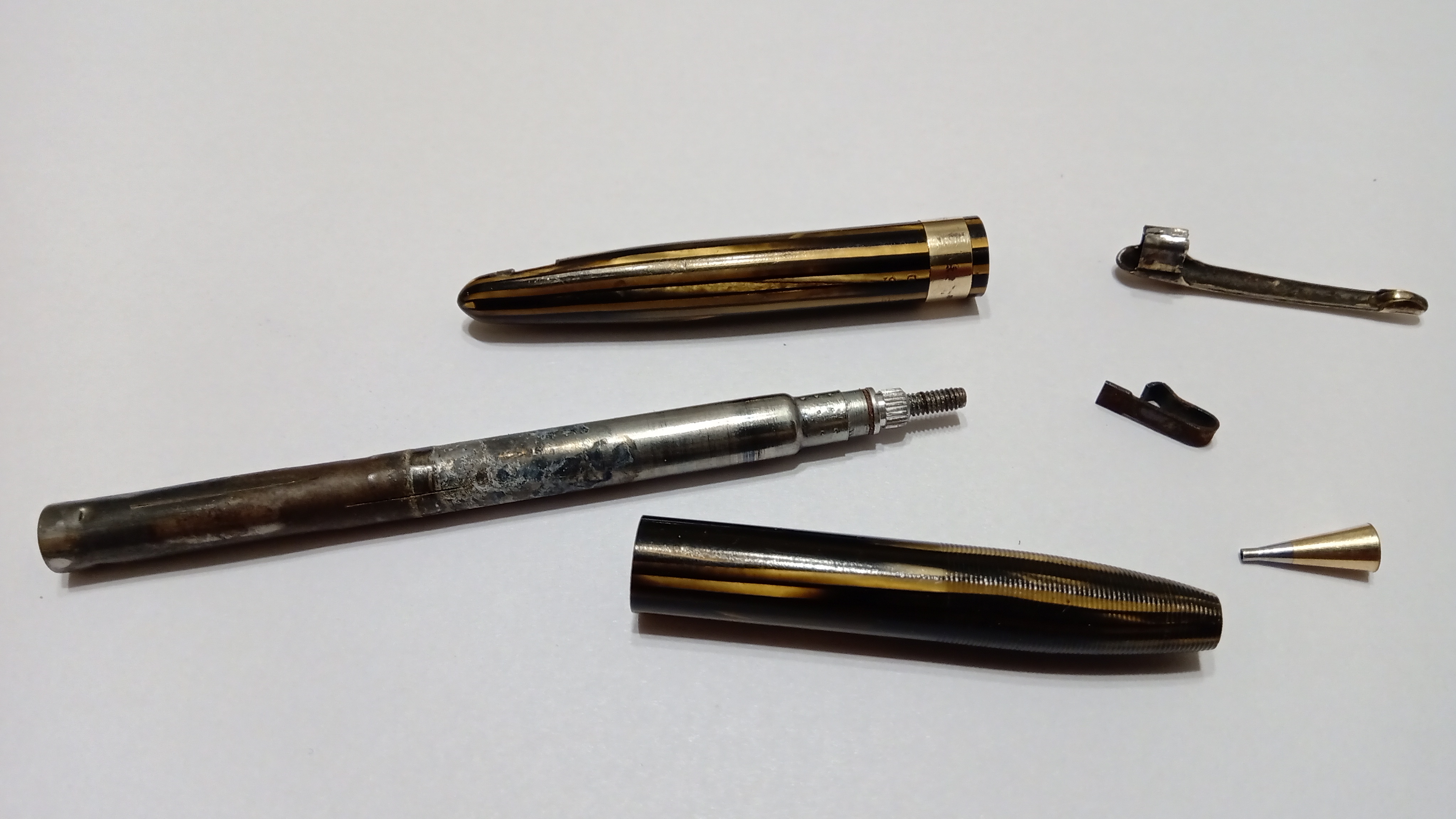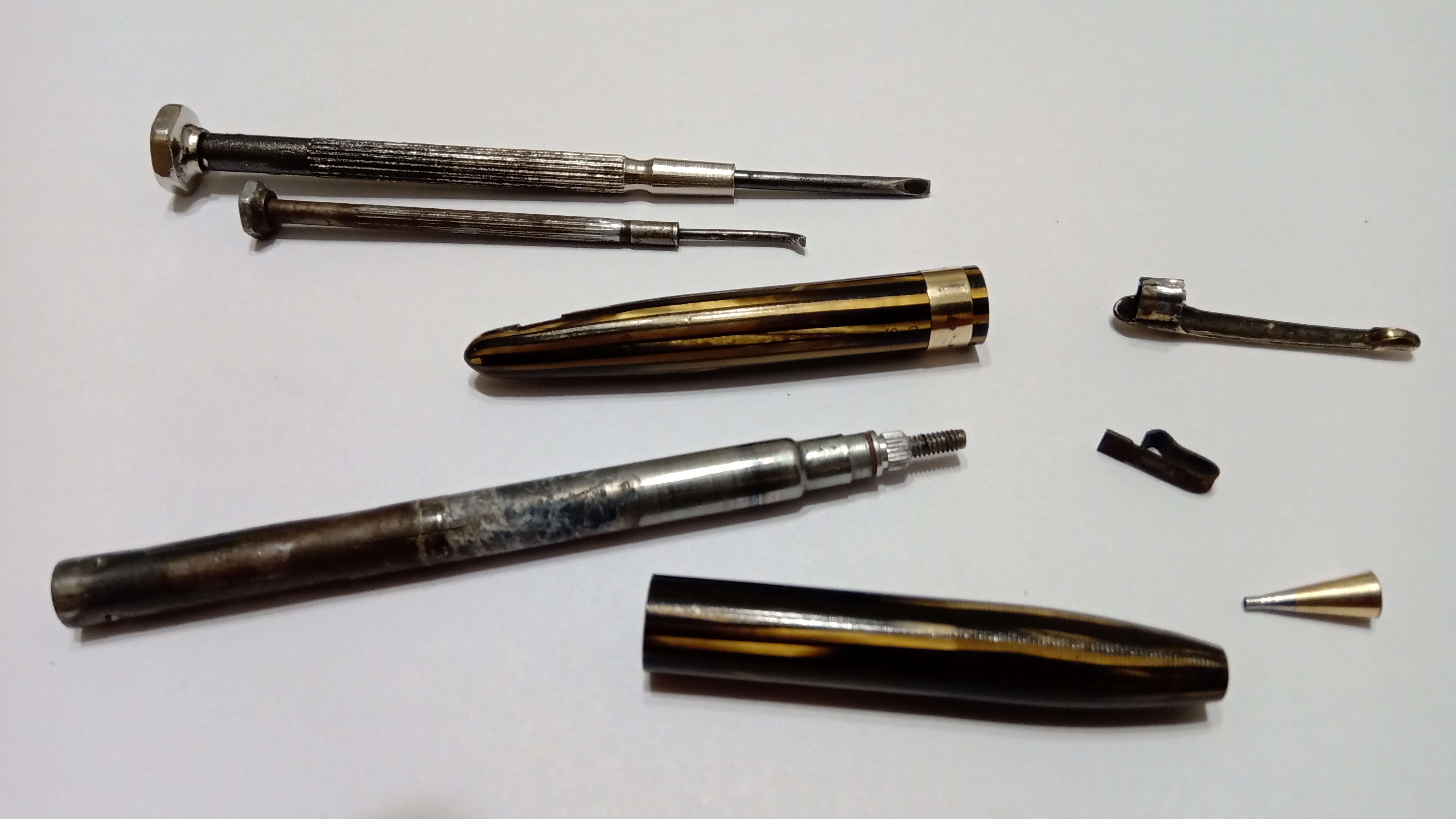 La parte esterna del laminato era in condizioni relativamente buone, così come l'impronta, ma l'alimentatore era completamente distrutto (cosa che il venditore mi aveva già avvisato), il pennino con le punte fuori livello e il sistema di caricamento completamente inutilizzabile ...
