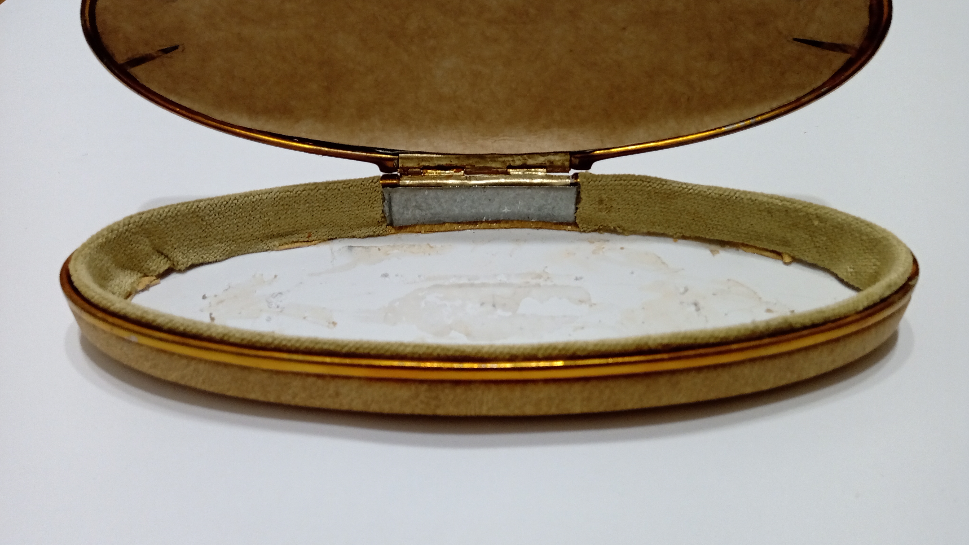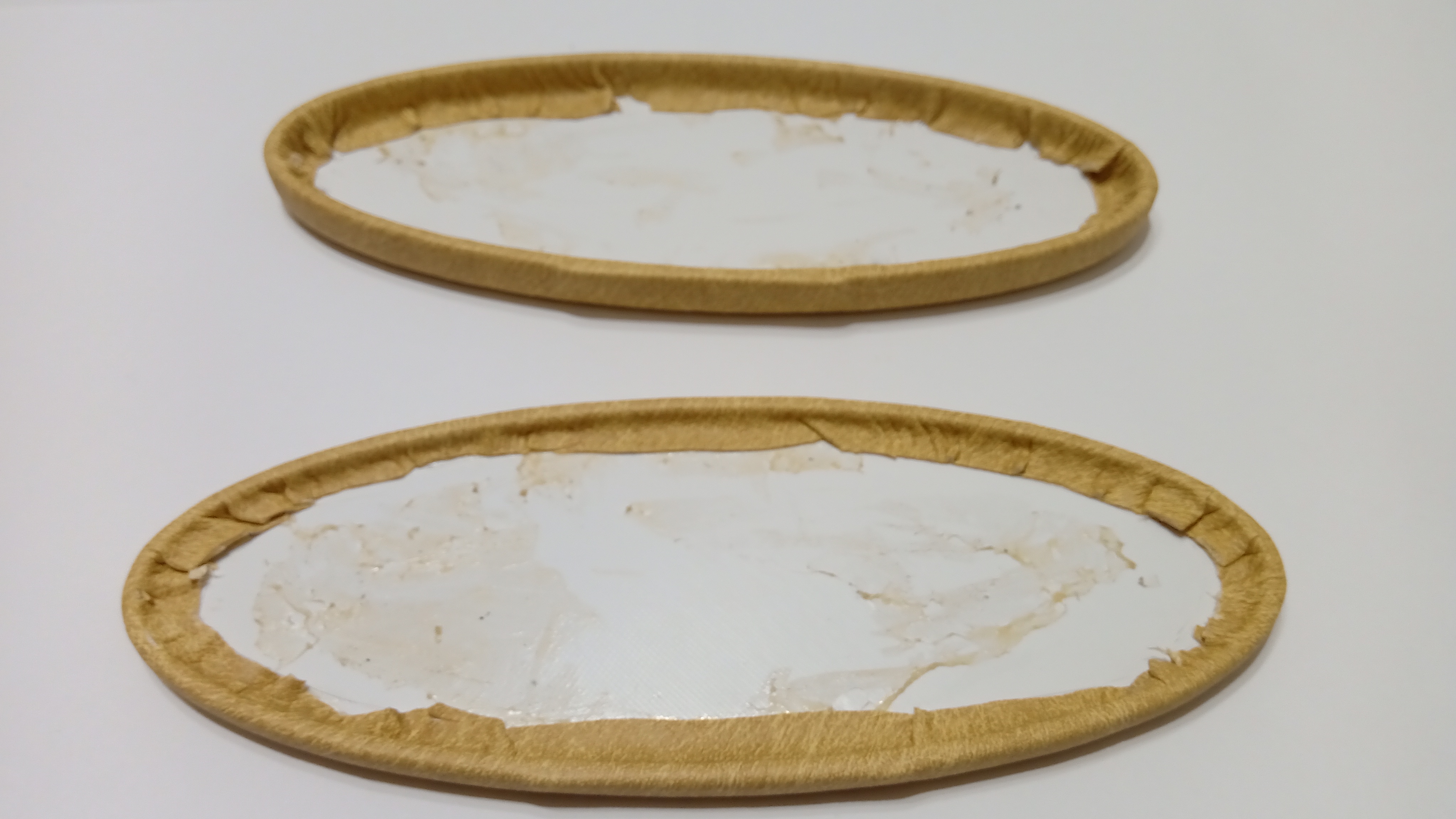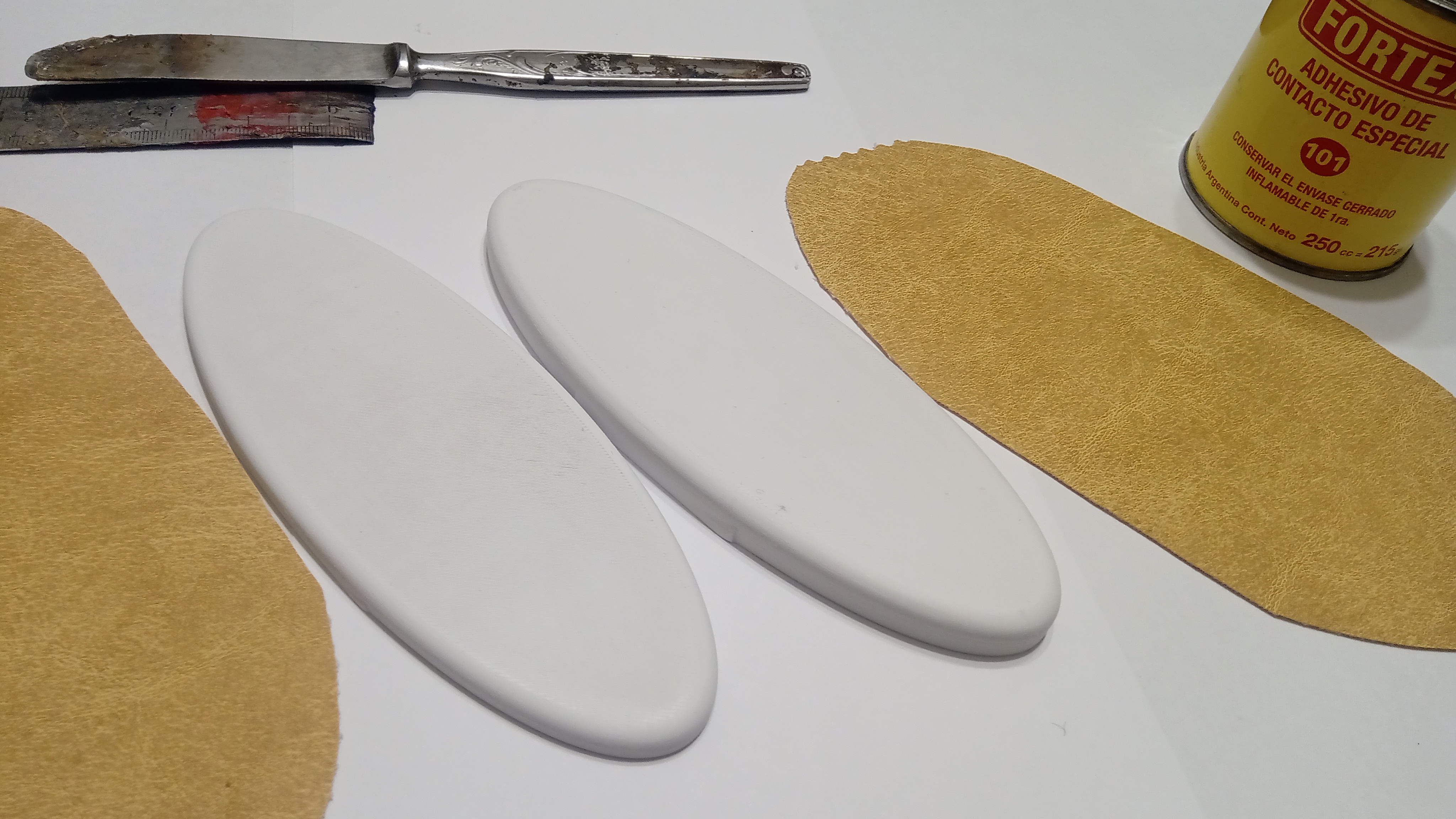 Nel passaggio successivo ho scelto una similpelle o una fodera simile alla fodera originale di uno di quei modelli ovali, che ho incollato con cemento a contatto a base di toluene, con molta pazienza e tendendo il materiale per evitare pieghe, sia sul coperchio che sulla base...
