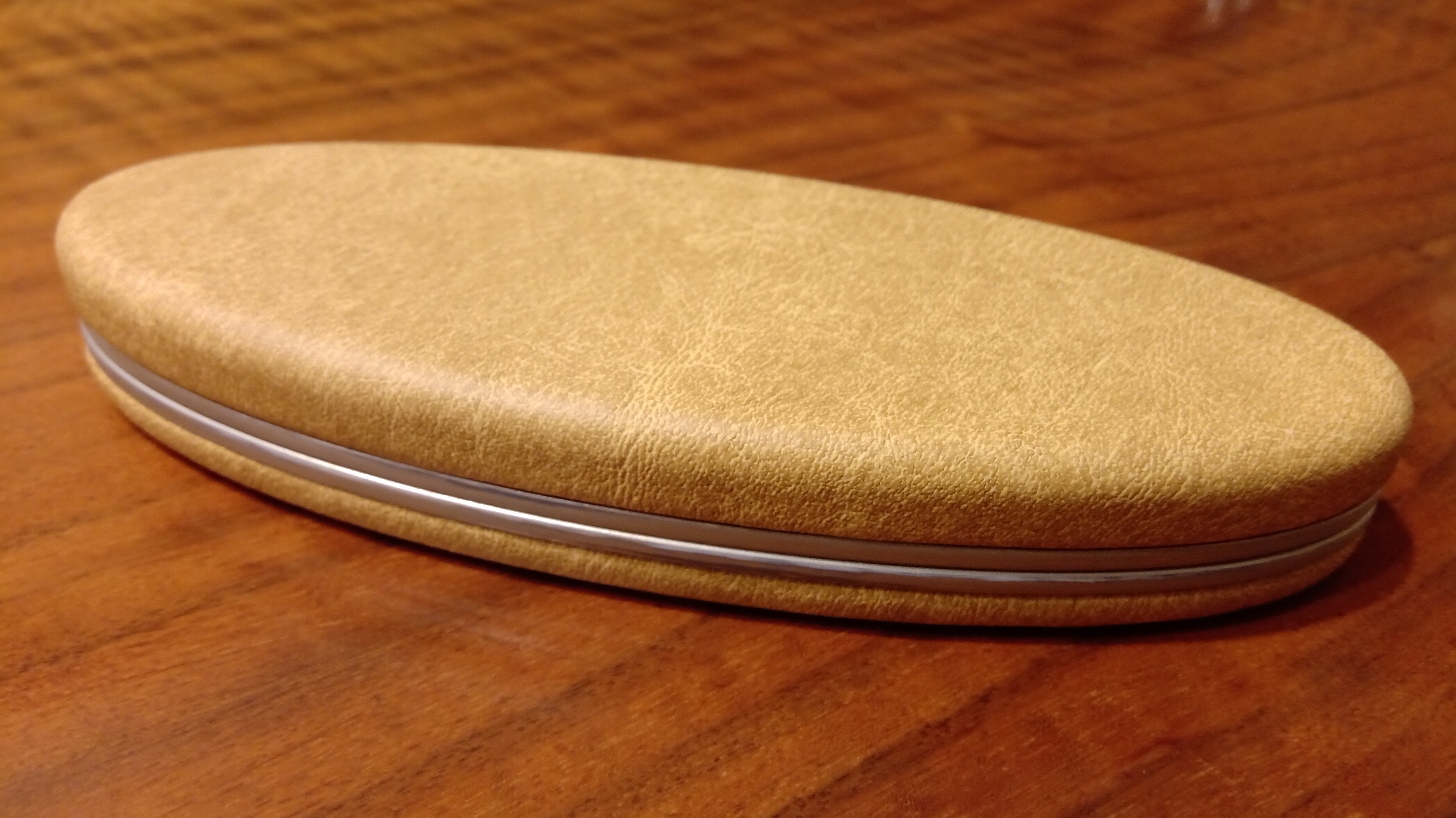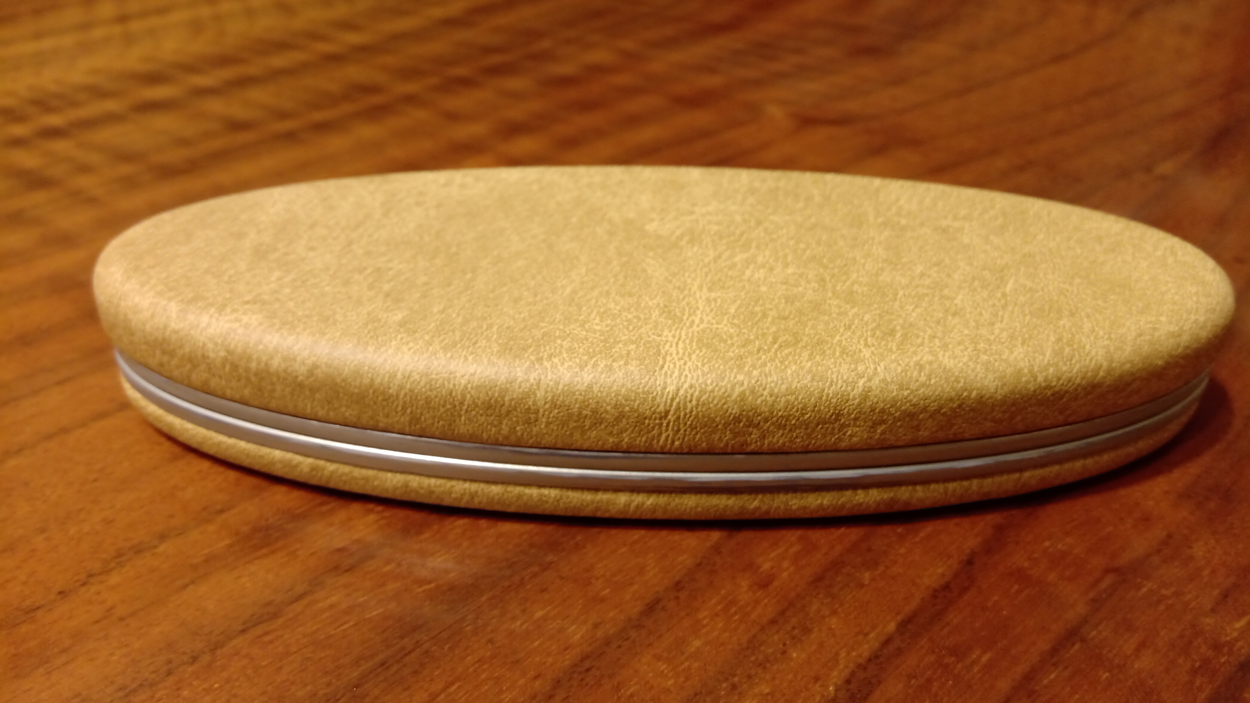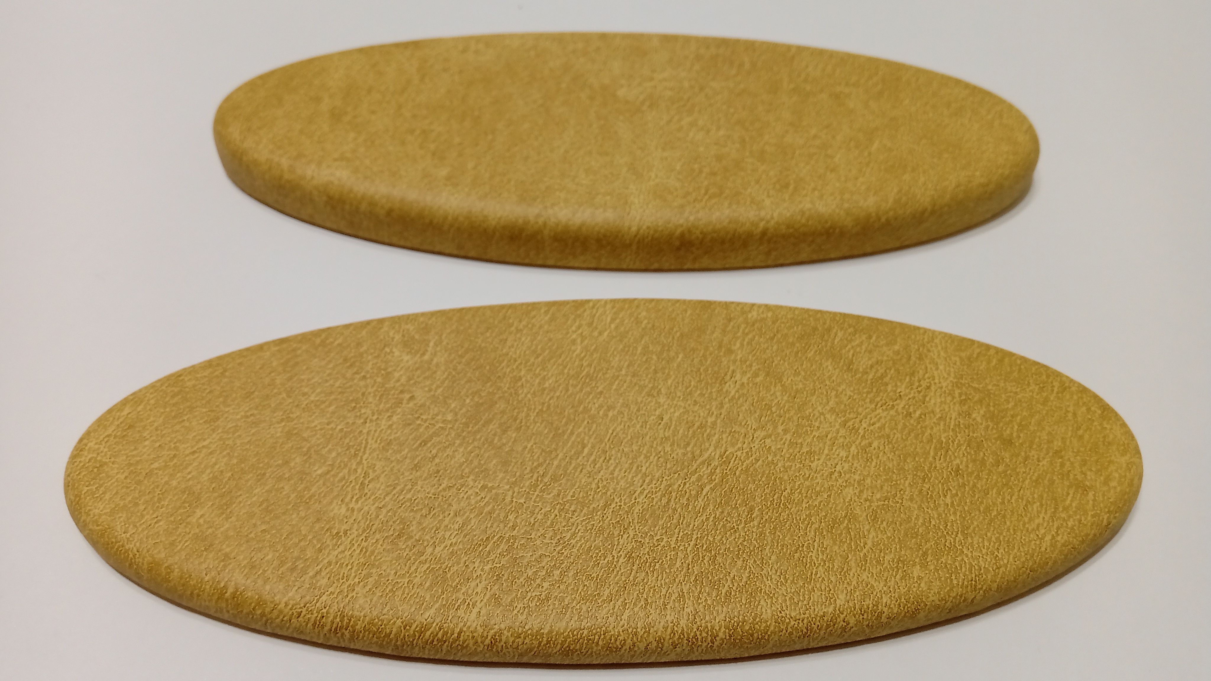 Nel passaggio successivo ho scelto una similpelle o una fodera simile alla fodera originale di uno di quei modelli ovali, che ho incollato con cemento a contatto a base di toluene, con molta pazienza e tendendo il materiale per evitare pieghe, sia sul coperchio che sulla base...