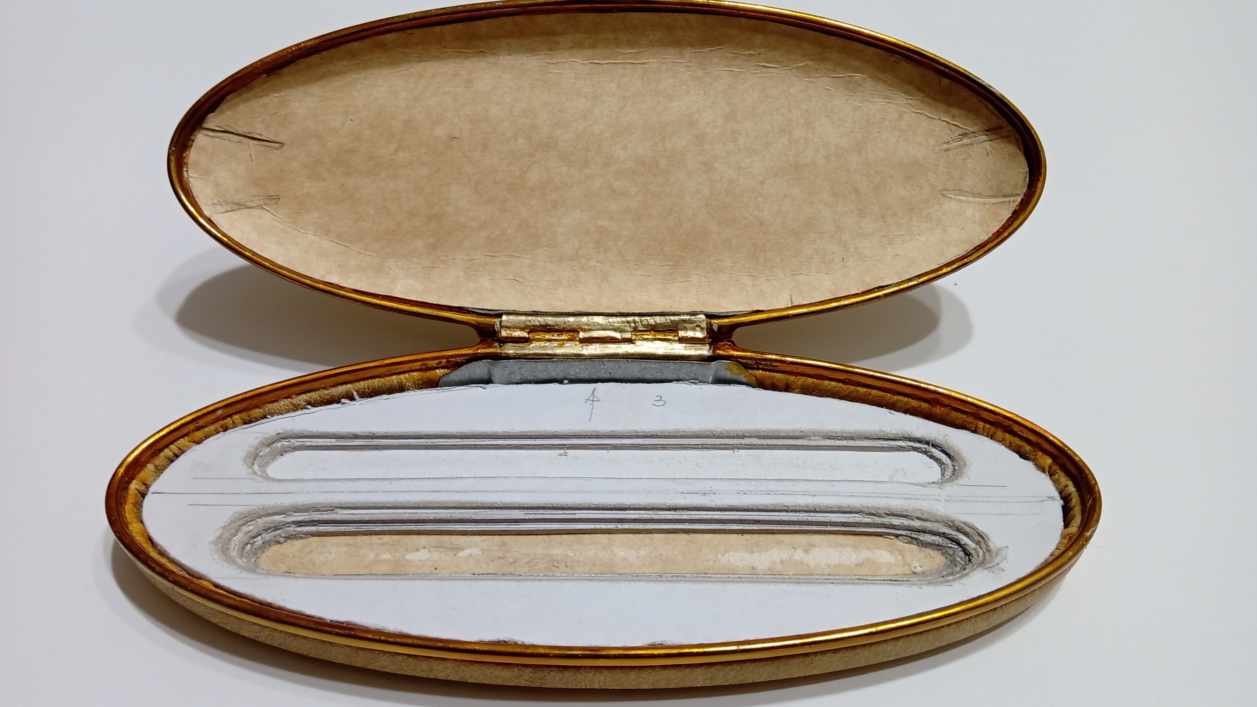 Ho dovuto realizzare anche una cerniera tipo cerniera de piano, in ottone e stagno, su misura per le dimensioni della scatola ovale, così come i supporti di base e il cartone e la scatola di cartone, dove sarebbero stati incollati i tessuti che sarebbero stati sotto le piume e il telo di copertura...