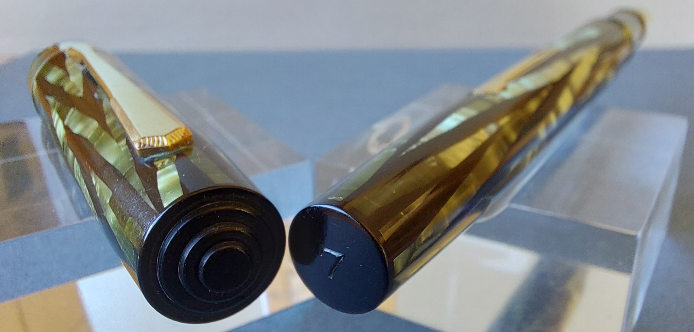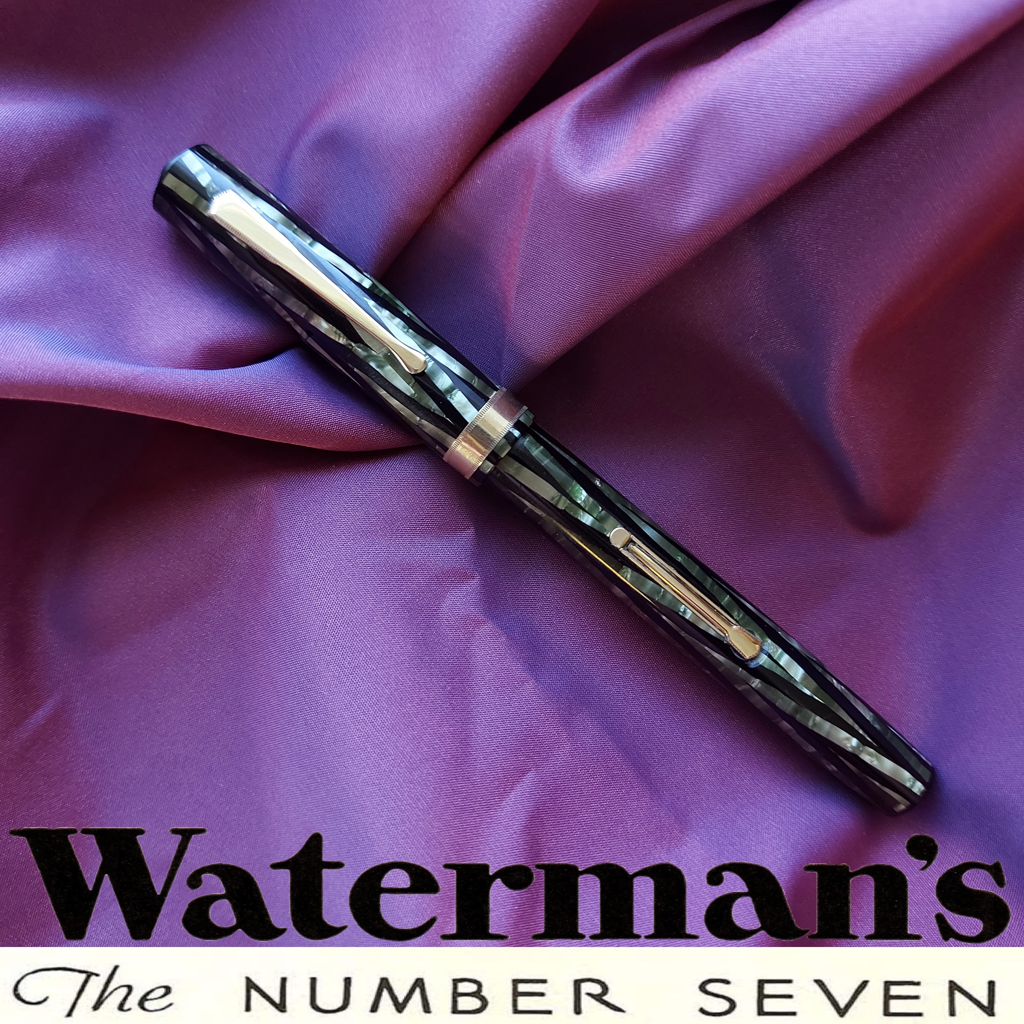 Lanciate dalla Casa una subito dopo l’altra, rispettivamente nel 1927 (con la <No.5> abbinata nel 1928) e nel 1933 (con la <No.5> abbinata che ricalca esattamente le forme della #94 in celluloide, ma solo in colore nero), le due stilografiche <No.7> ebbero in comune la loro forse unica (ma senz’altro primaria) ragion d’essere, ovvero la messa a disposizione del rivoluzionario sistema di «Pennini con Codice dei Colori» (https://www.fountainpen.it/Waterman_Nib_Color_Code), in cui a ciascuna delle (prima 6 poi) 7 punte disponibili veniva associato un diverso colore (in un decennio se ne poterono contare in totale fino a 9, forse 10). Entrambe le penne furono studiate con la possibilità di riconoscere anche a penna chiusa tali pennini (connotati da un caratteristico foro a “buco della serratura”) grazie ad un richiamo del colore appropriato posto all’esterno della stilografica.
