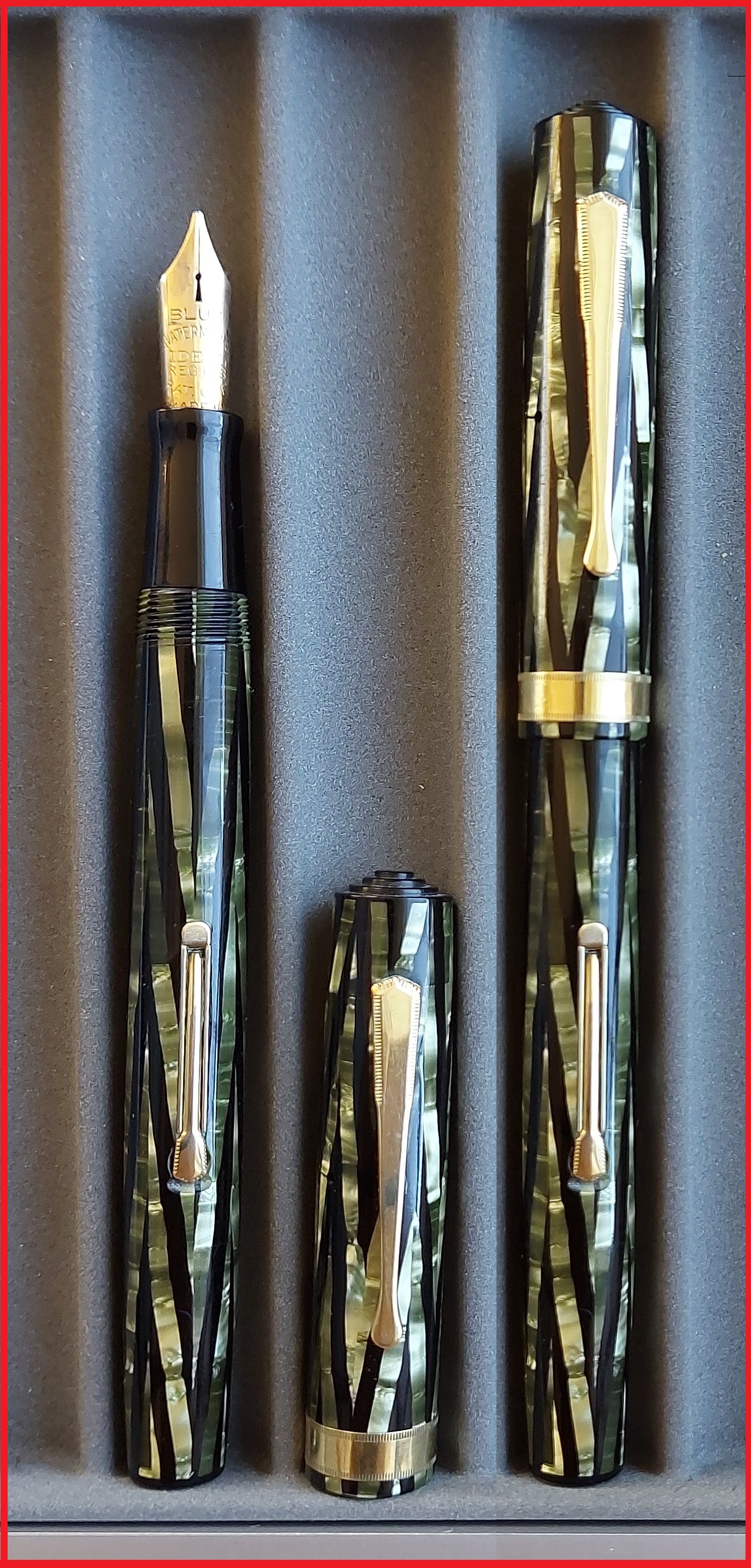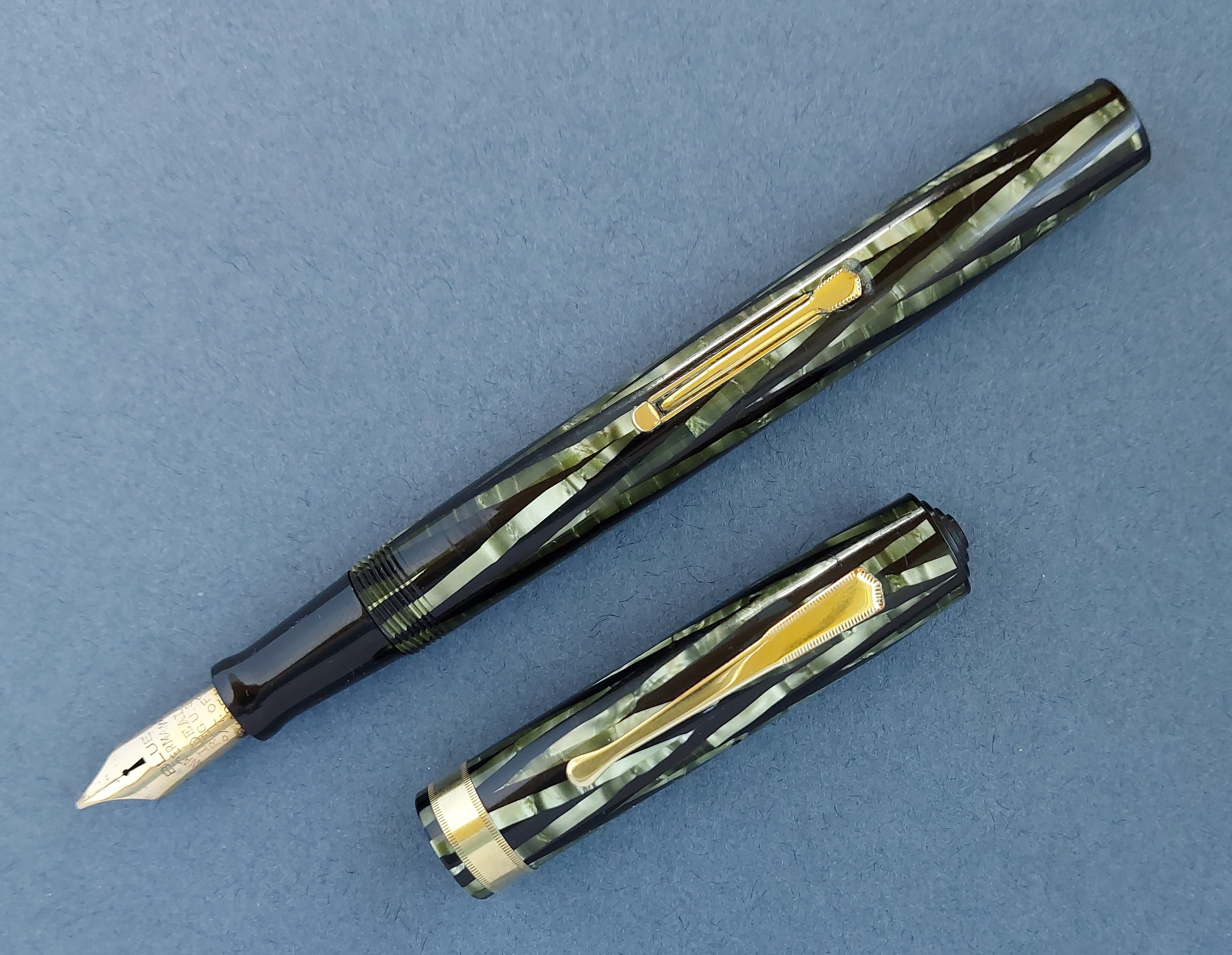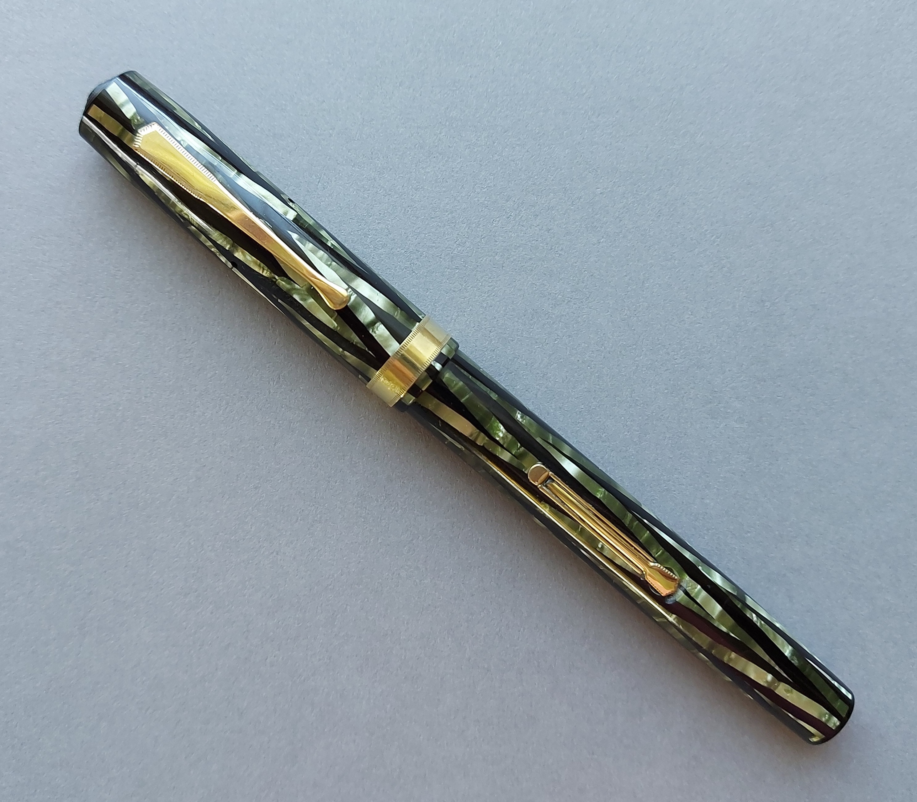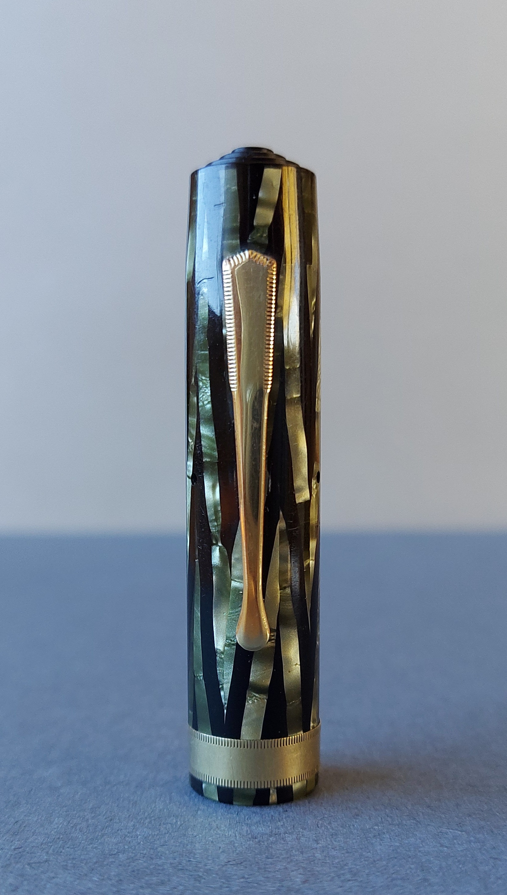 La penna WATERMAN’S NUMBER SEVEN in celluloide “Emerald Ray” tornita dal pieno con terminali e sezione in celluloide nera, cappuccio a vite con clip, parti metalliche laminate in oro, pennino Waterman’s <BLUE> in oro 14 carati, caricamento a levetta, produzione U.S.A. anno 1935.