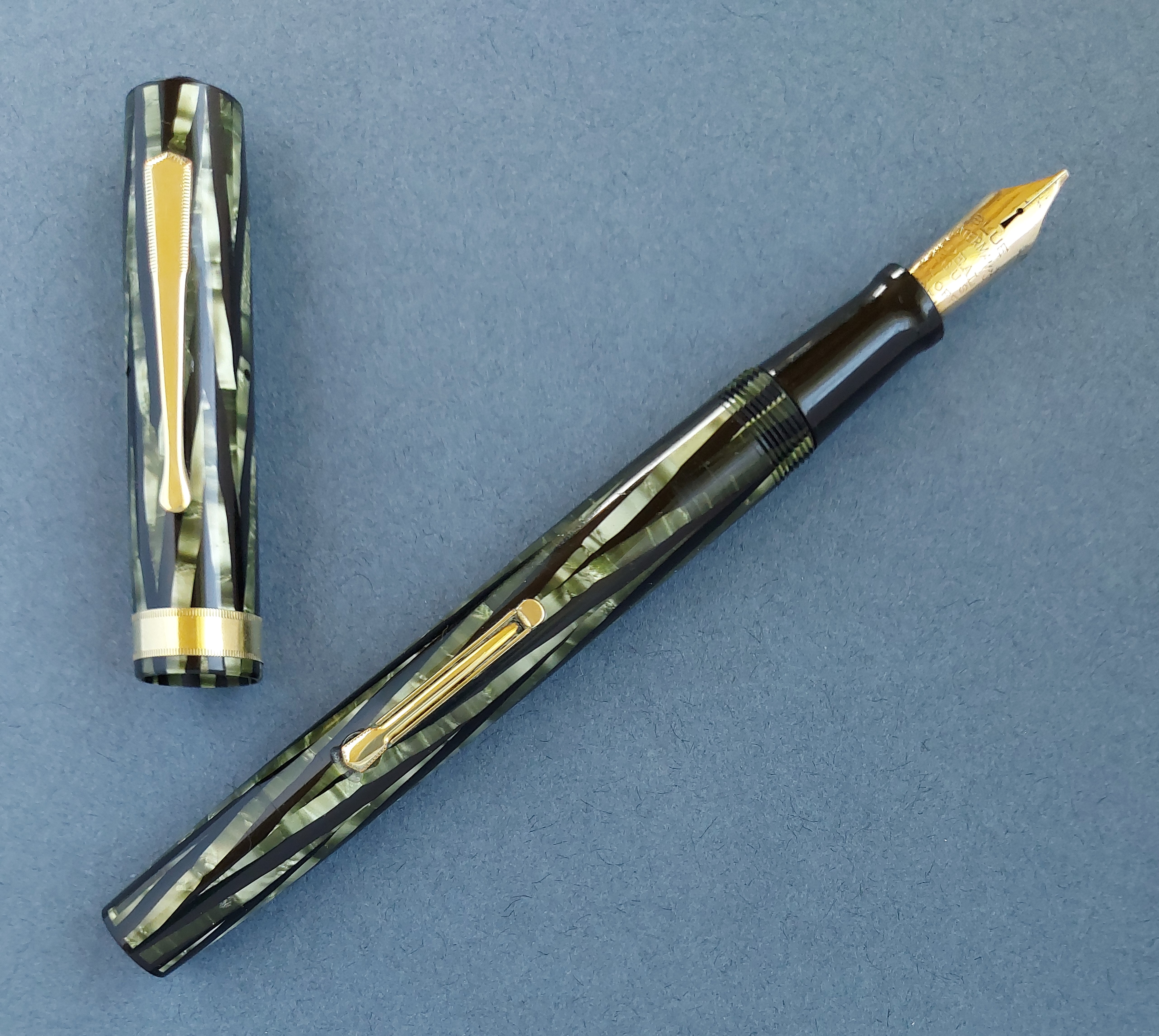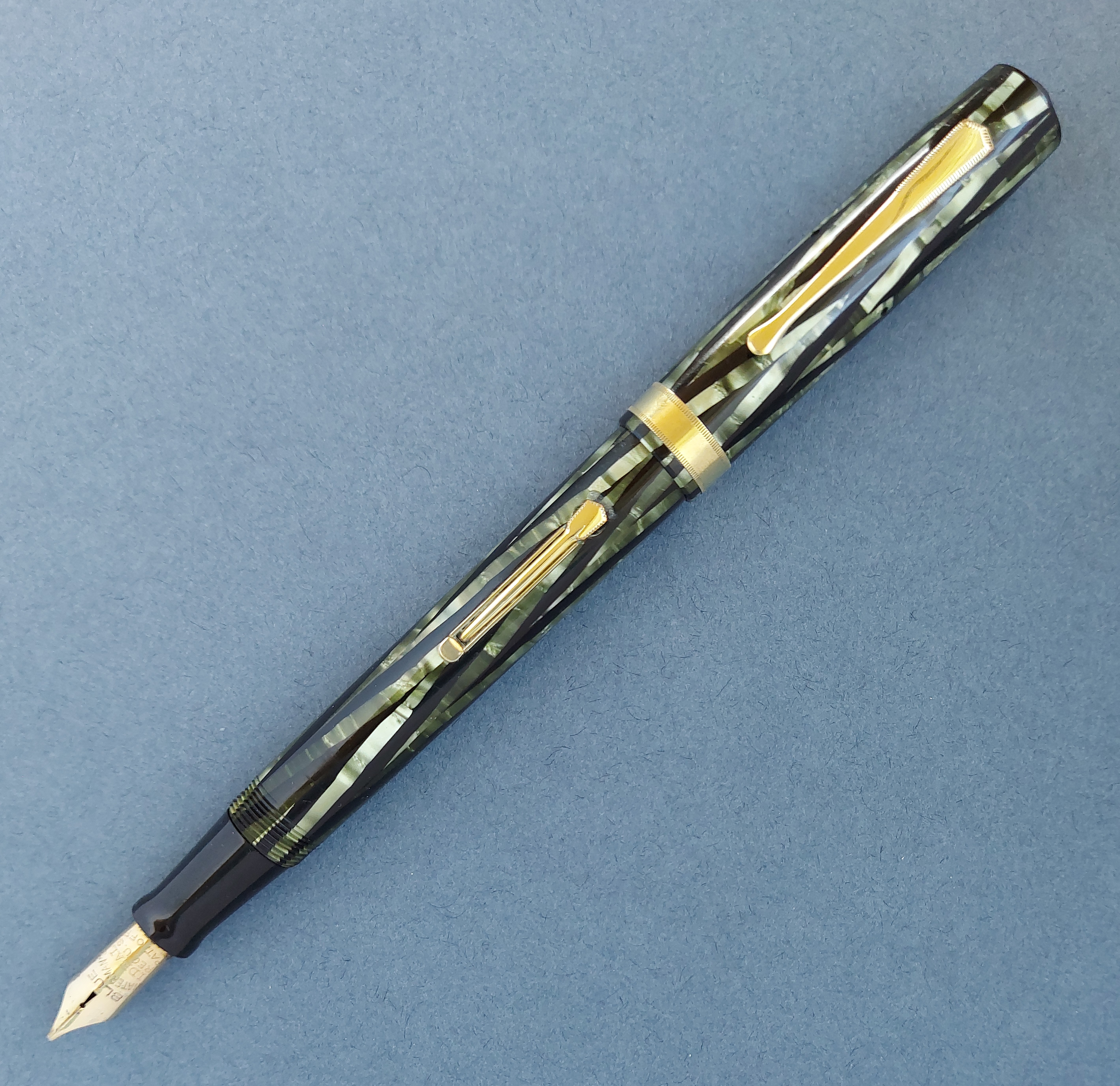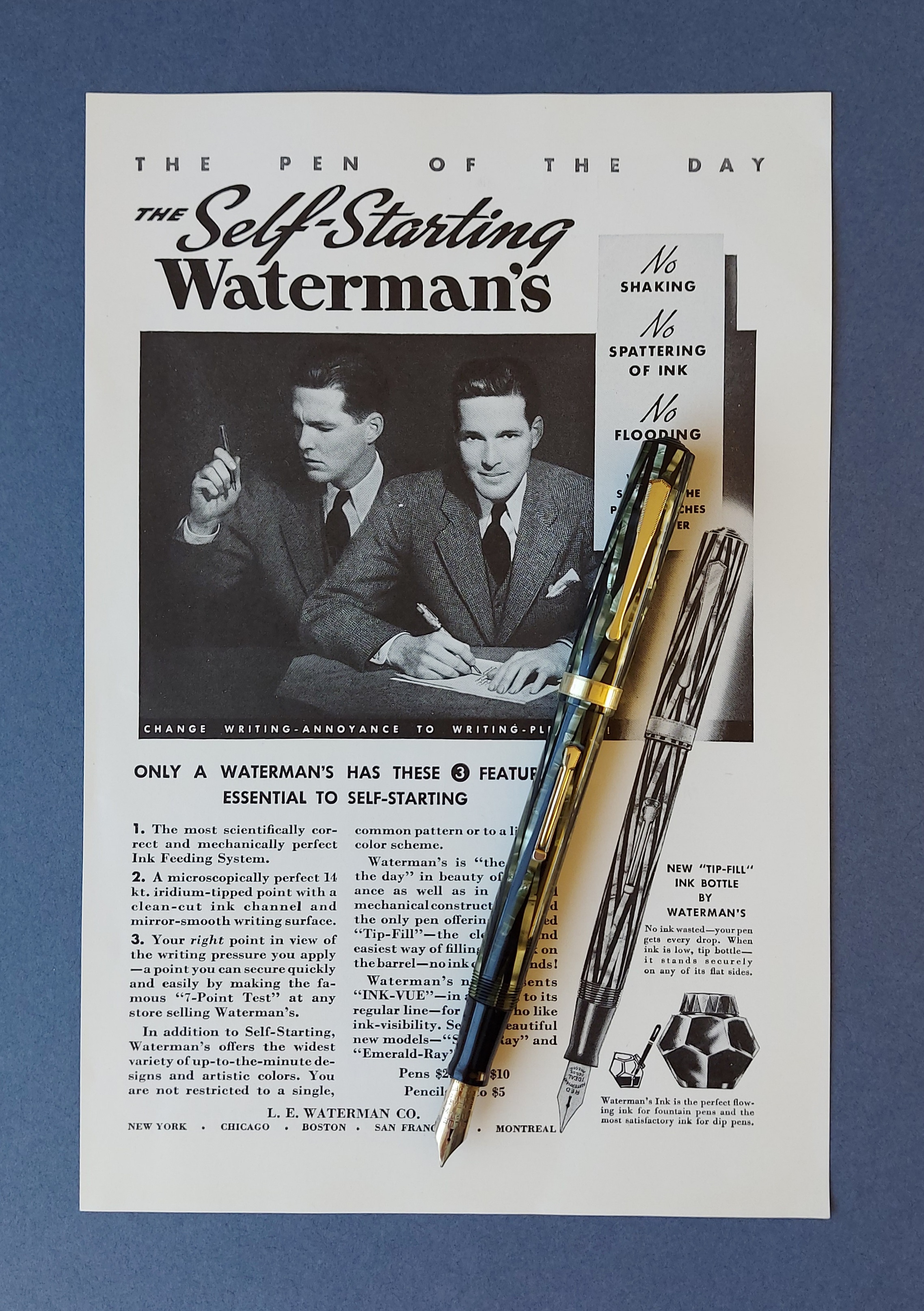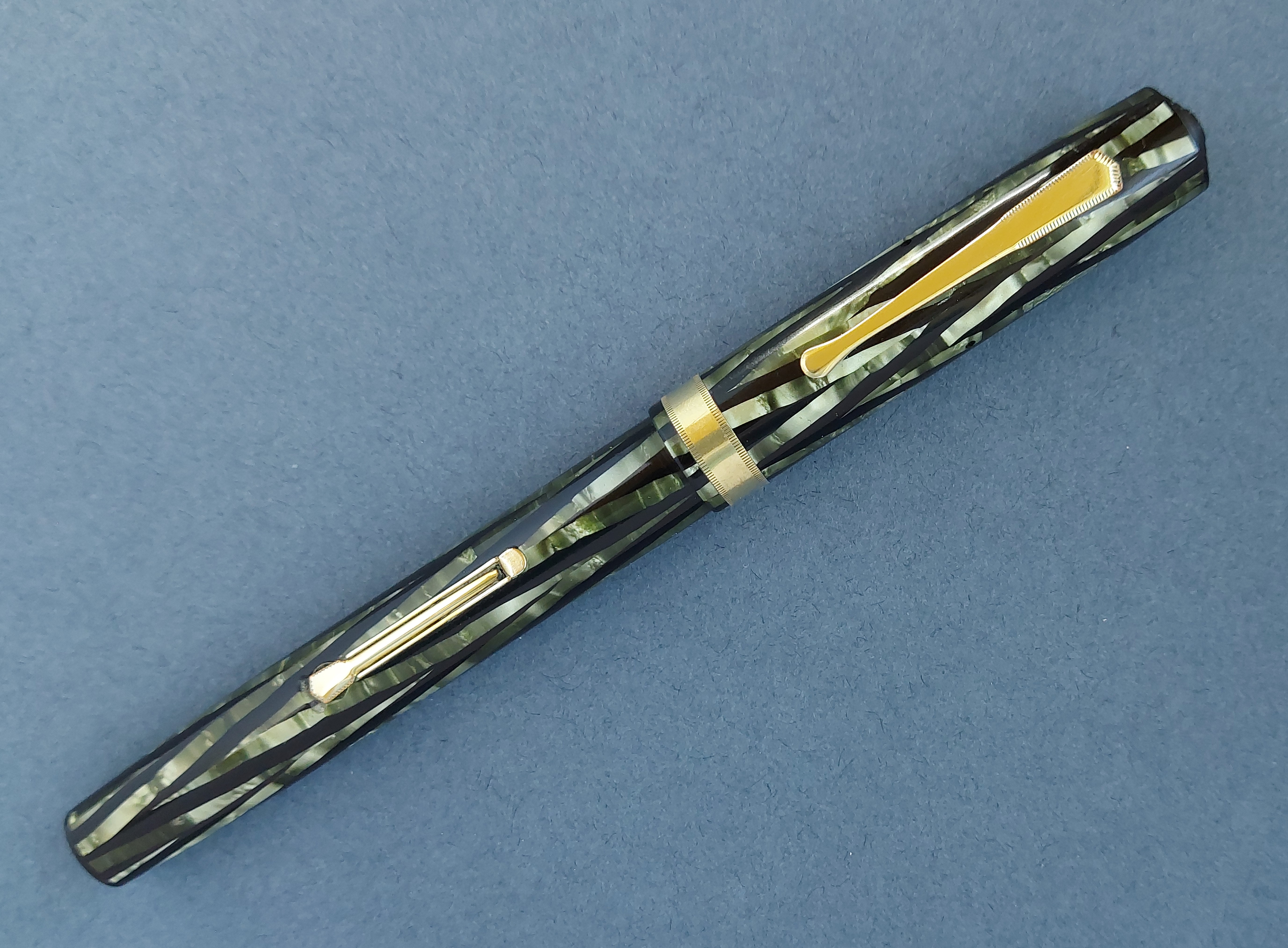 La penna WATERMAN’S NUMBER SEVEN in celluloide “Emerald Ray” tornita dal pieno con terminali e sezione in celluloide nera, cappuccio a vite con clip, parti metalliche laminate in oro, pennino Waterman’s <BLUE> in oro 14 carati, caricamento a levetta, produzione U.S.A. anno 1935.