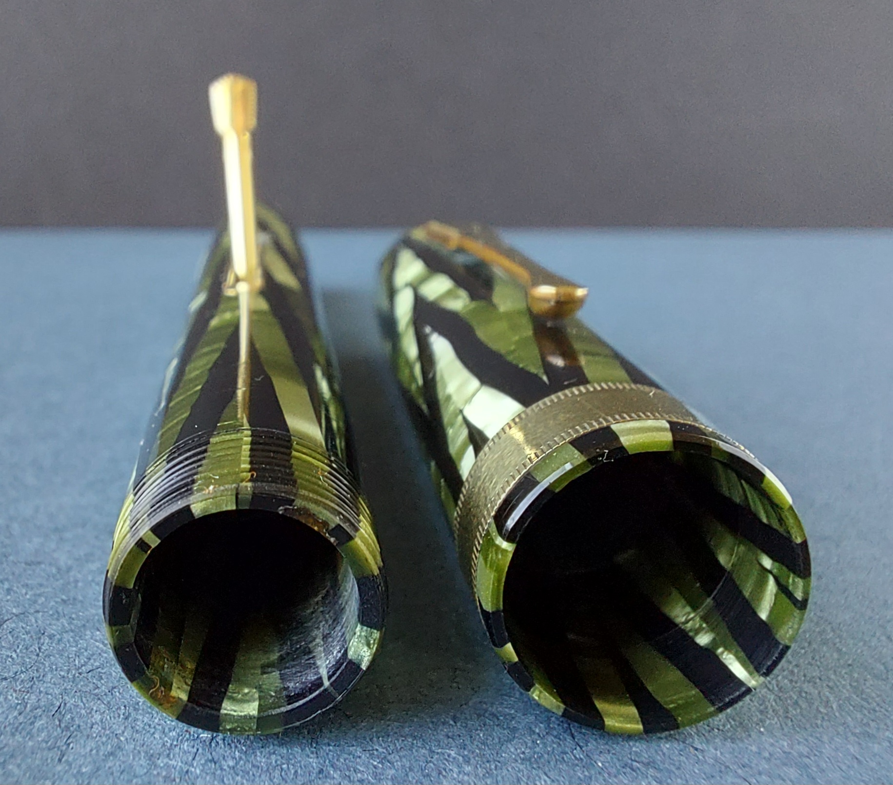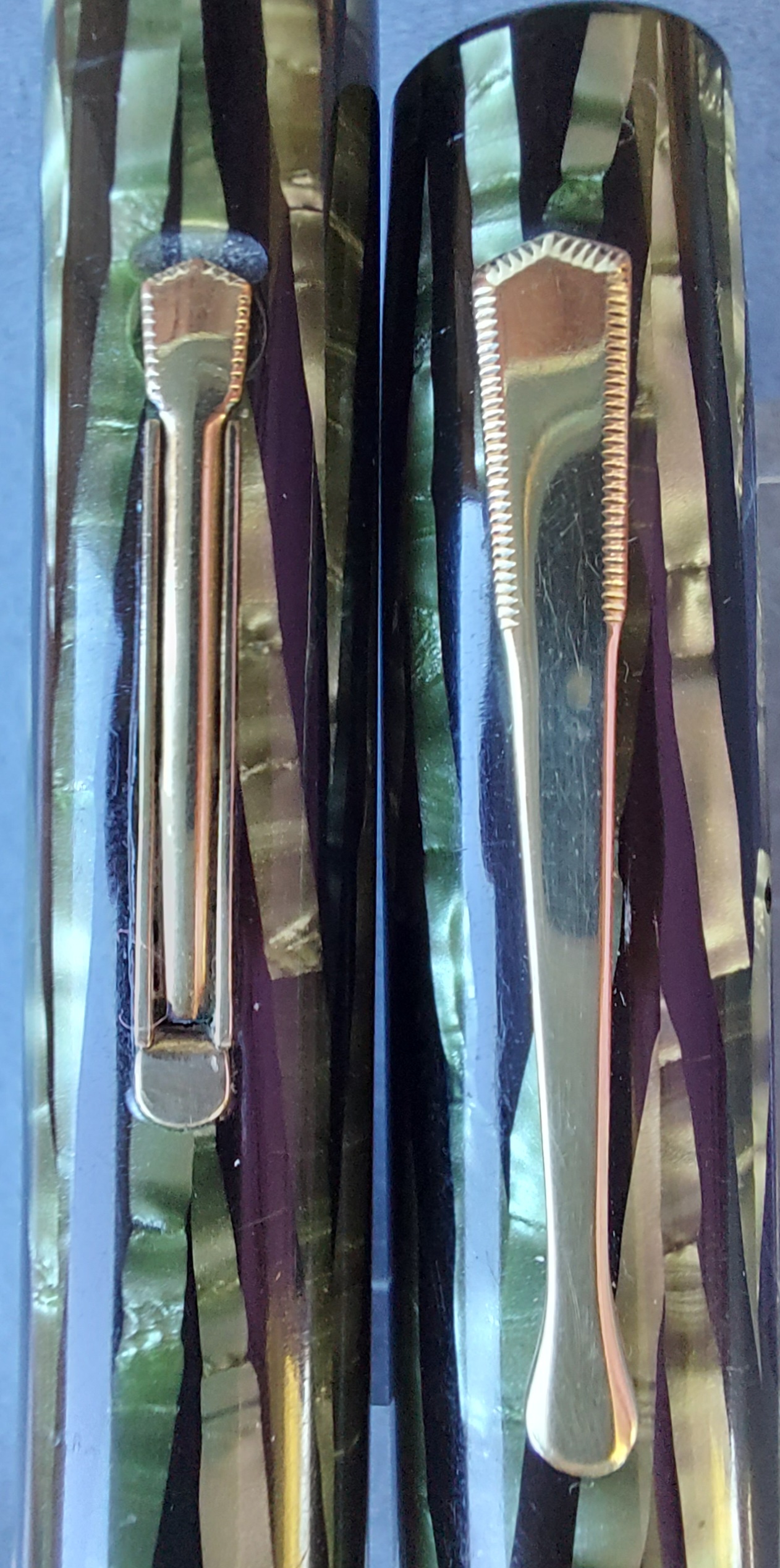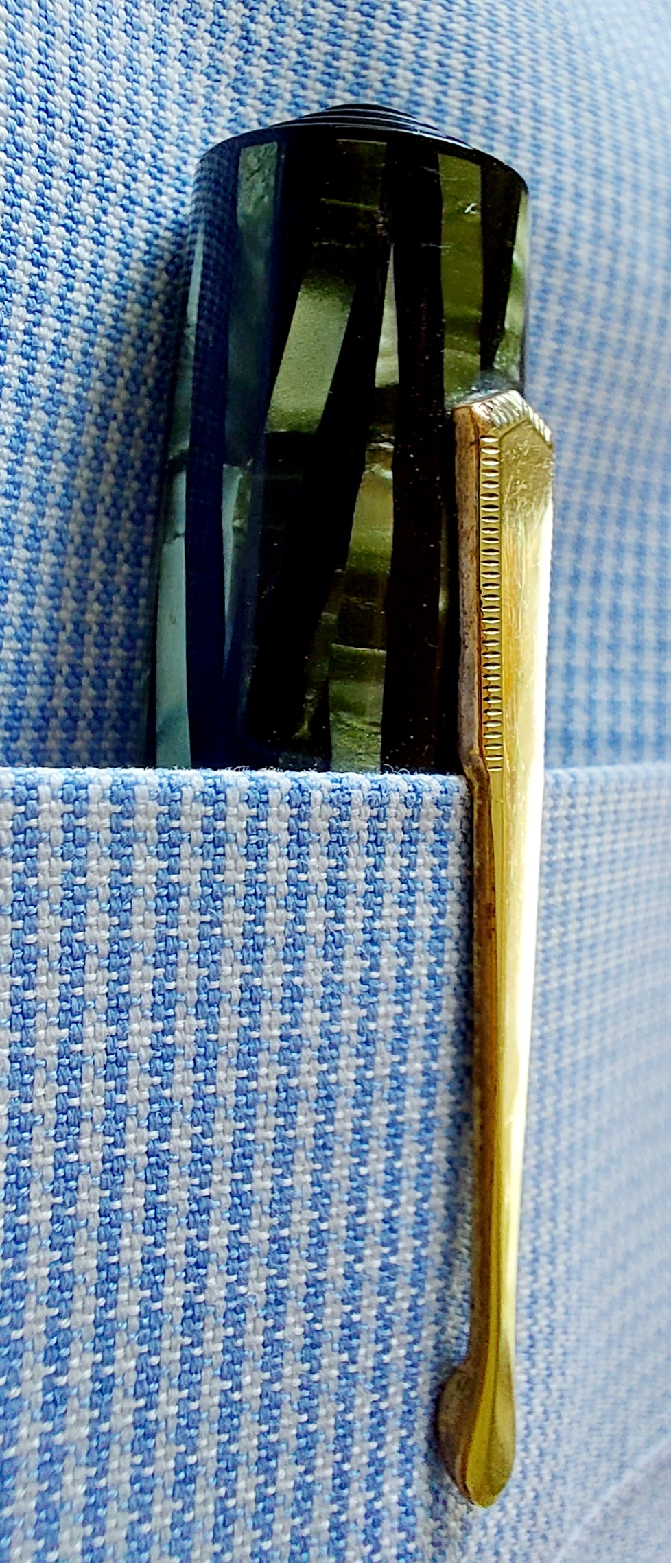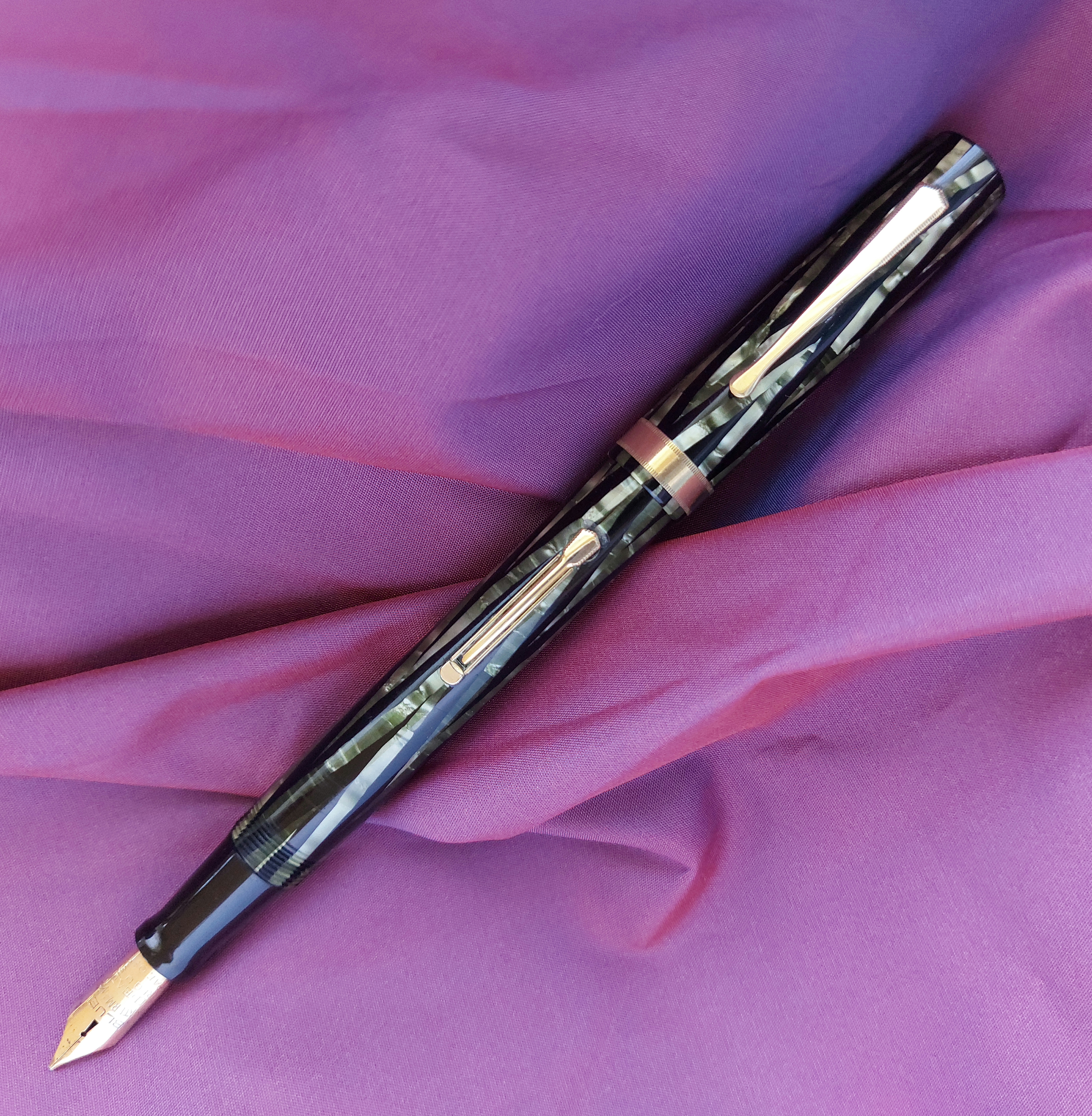 La penna WATERMAN’S NUMBER SEVEN in celluloide “Emerald Ray” tornita dal pieno con terminali e sezione in celluloide nera, cappuccio a vite con clip, parti metalliche laminate in oro, pennino Waterman’s <BLUE> in oro 14 carati, caricamento a levetta, produzione U.S.A. anno 1935.