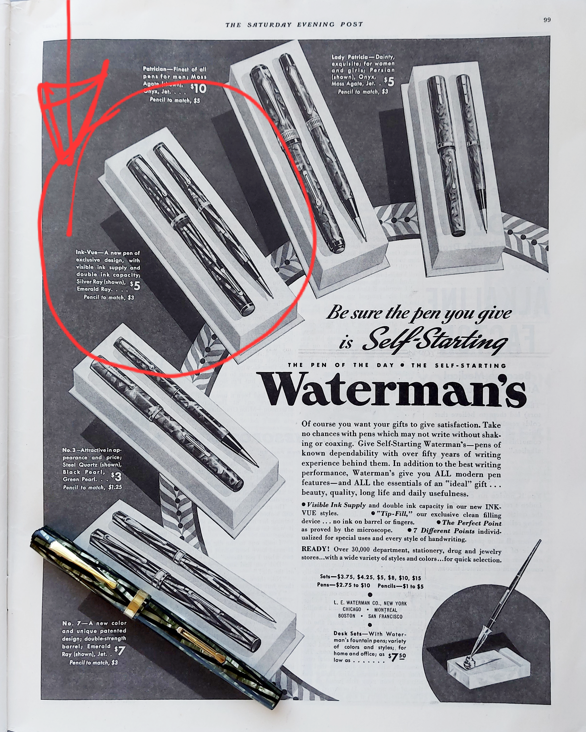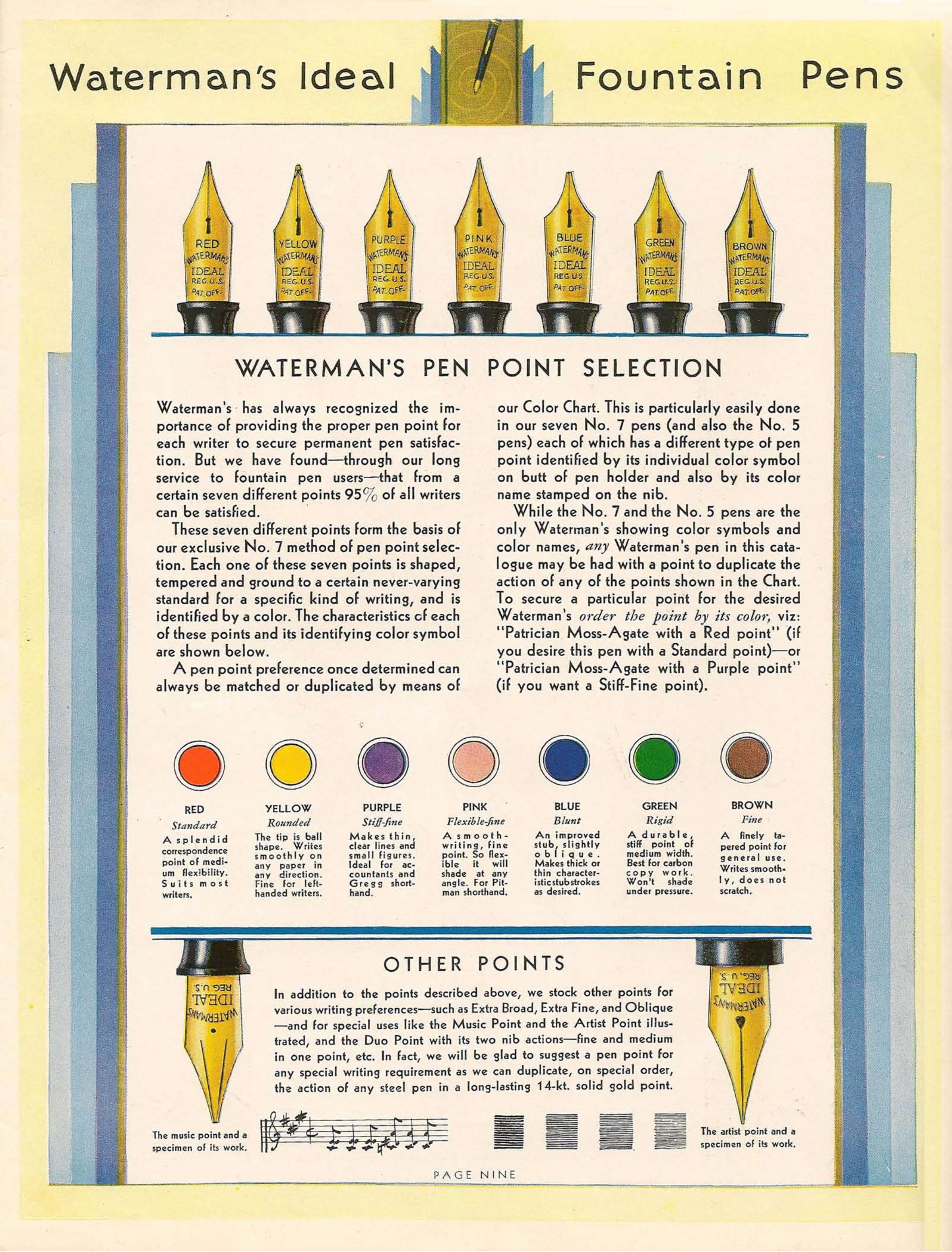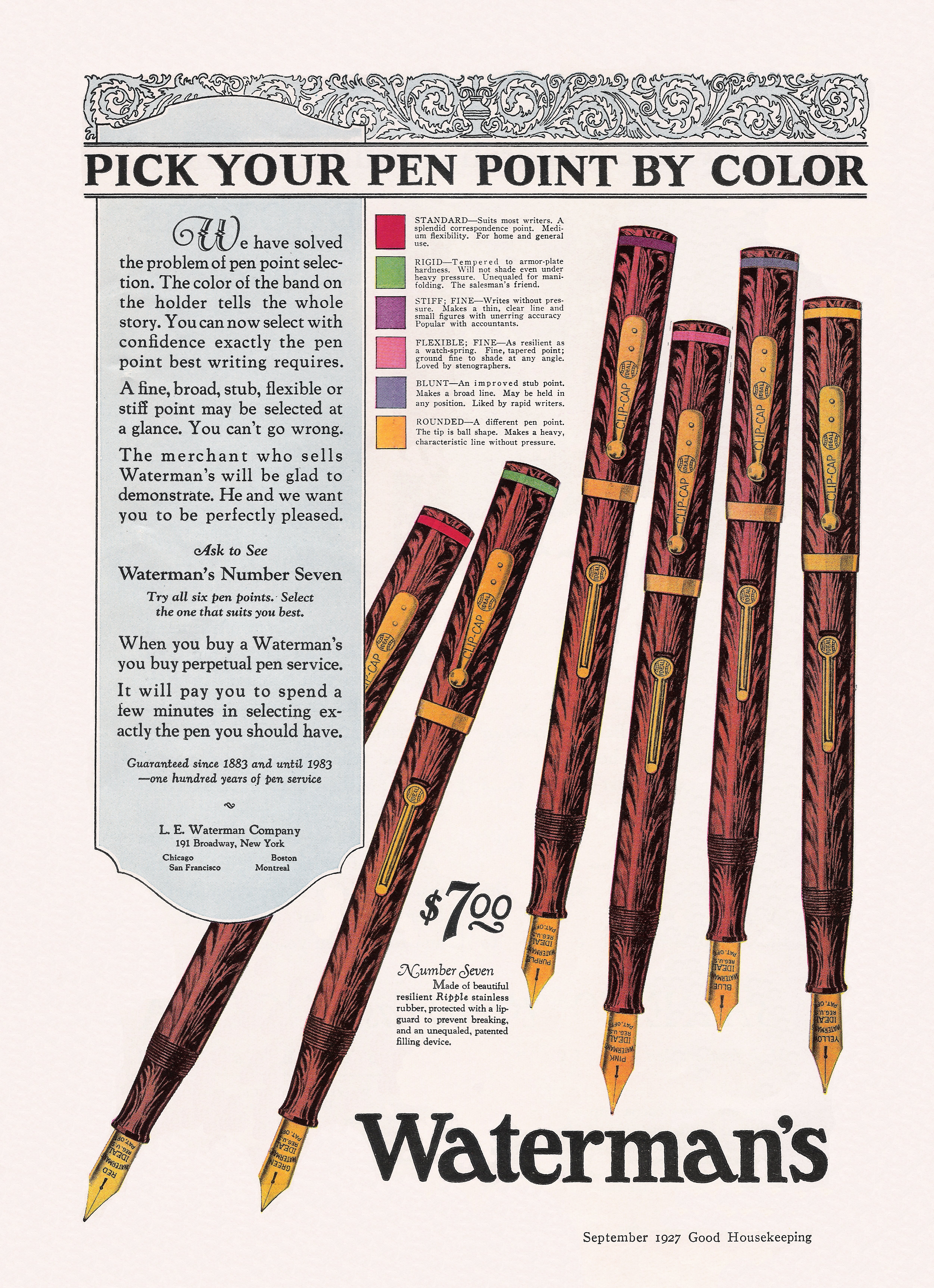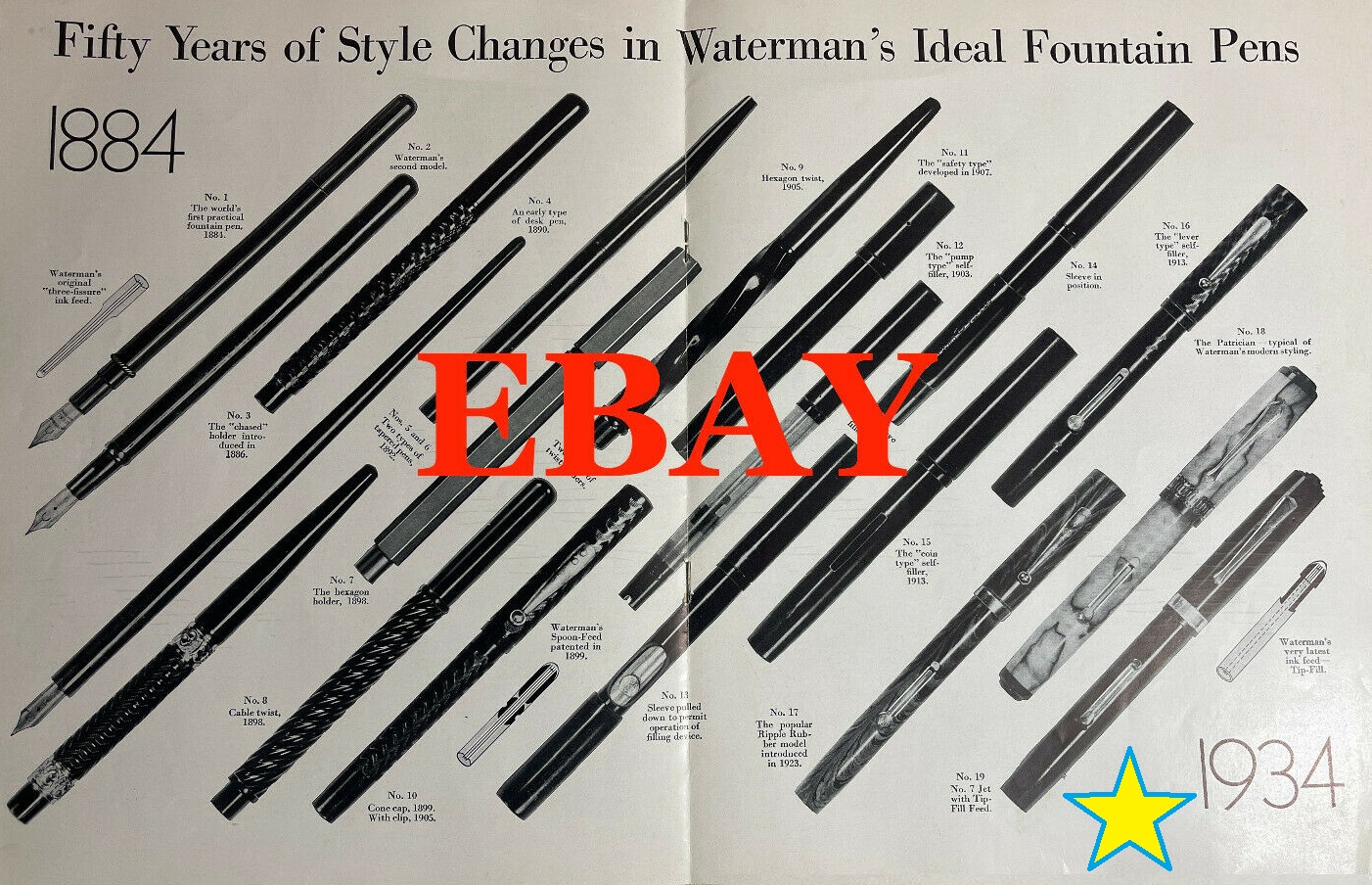 • L’evoluzione di questo primo modello, proposta circa sei anni dopo, a partire dal 1933, fu una penna affatto diversa, e venne anche definita dalla pubblicità come <Improved No.7> (cioè <No.7 migliorata>): di dimensioni leggermente inferiori, in stile elegantemente streamlined, realizzata in celluloide (soltanto nera, per i primi due anni dal debutto), con il codice dei colori dei pennini espresso da un circoletto colorato inserito nel fondello, la stilografica montava il nuovissimo alimentatore “Tip-Fill”. Waterman's Catalog 1933, p.8 (fonte PCA)