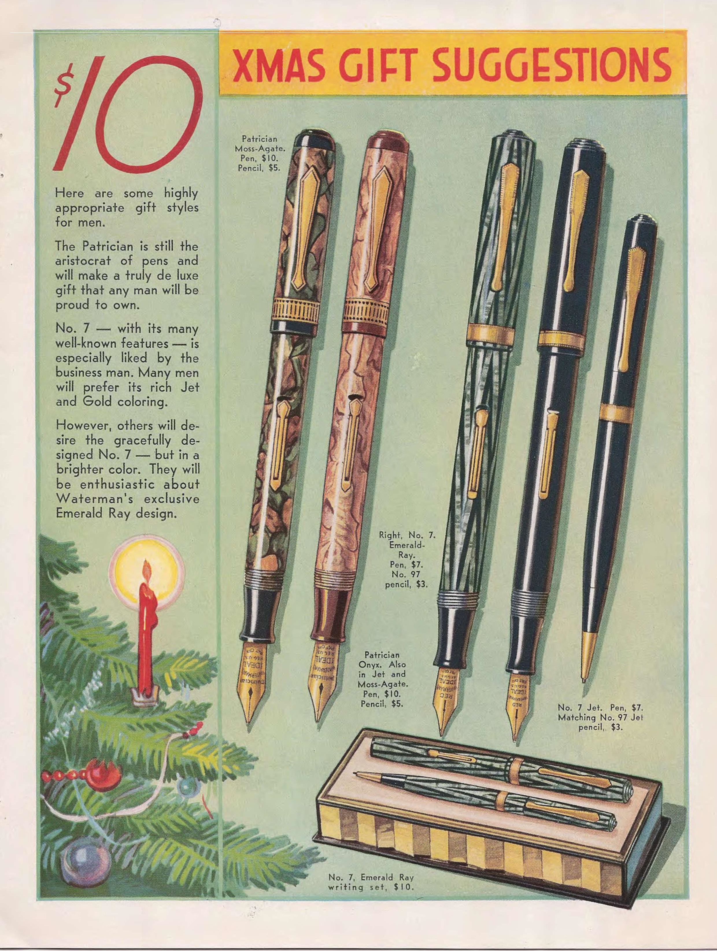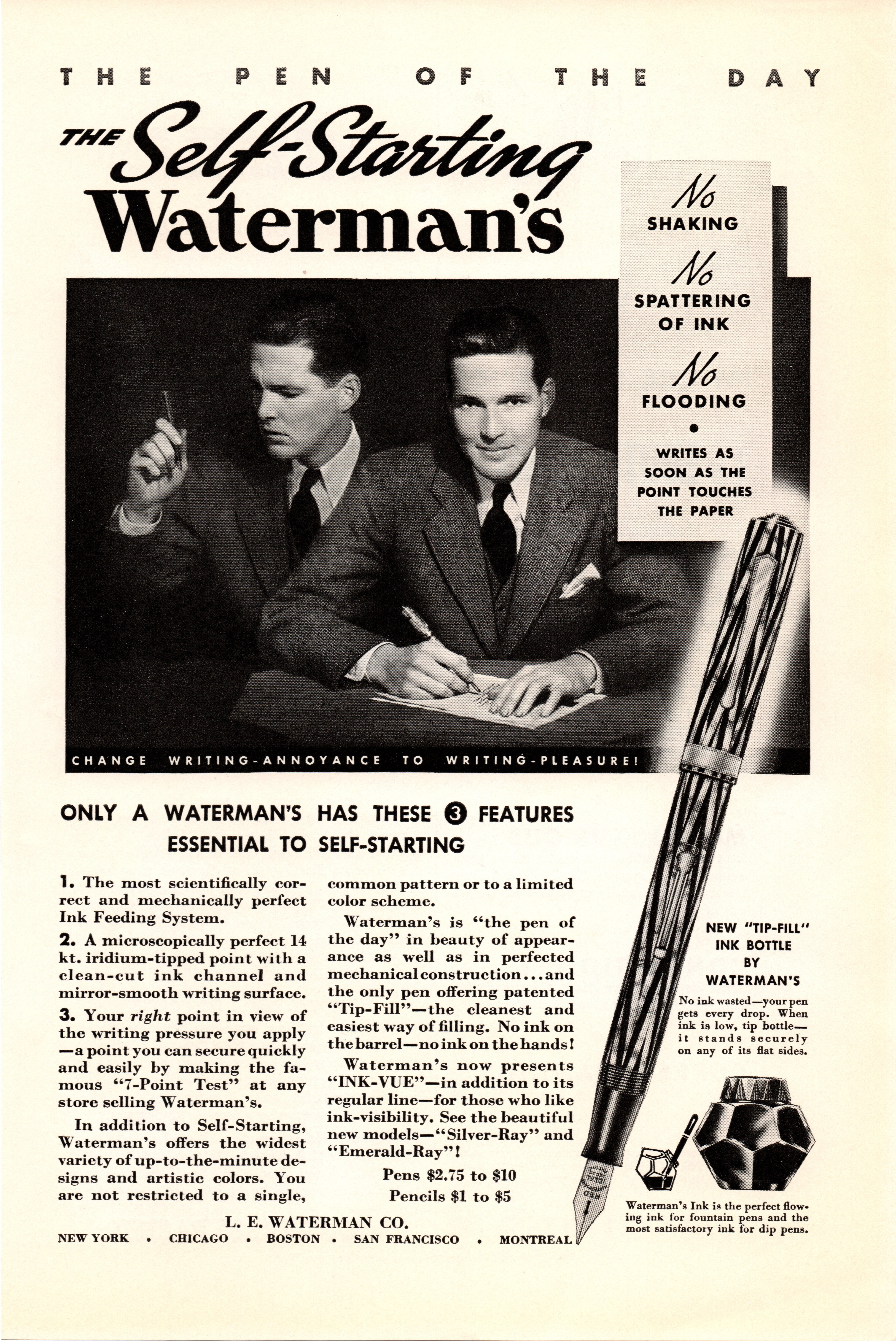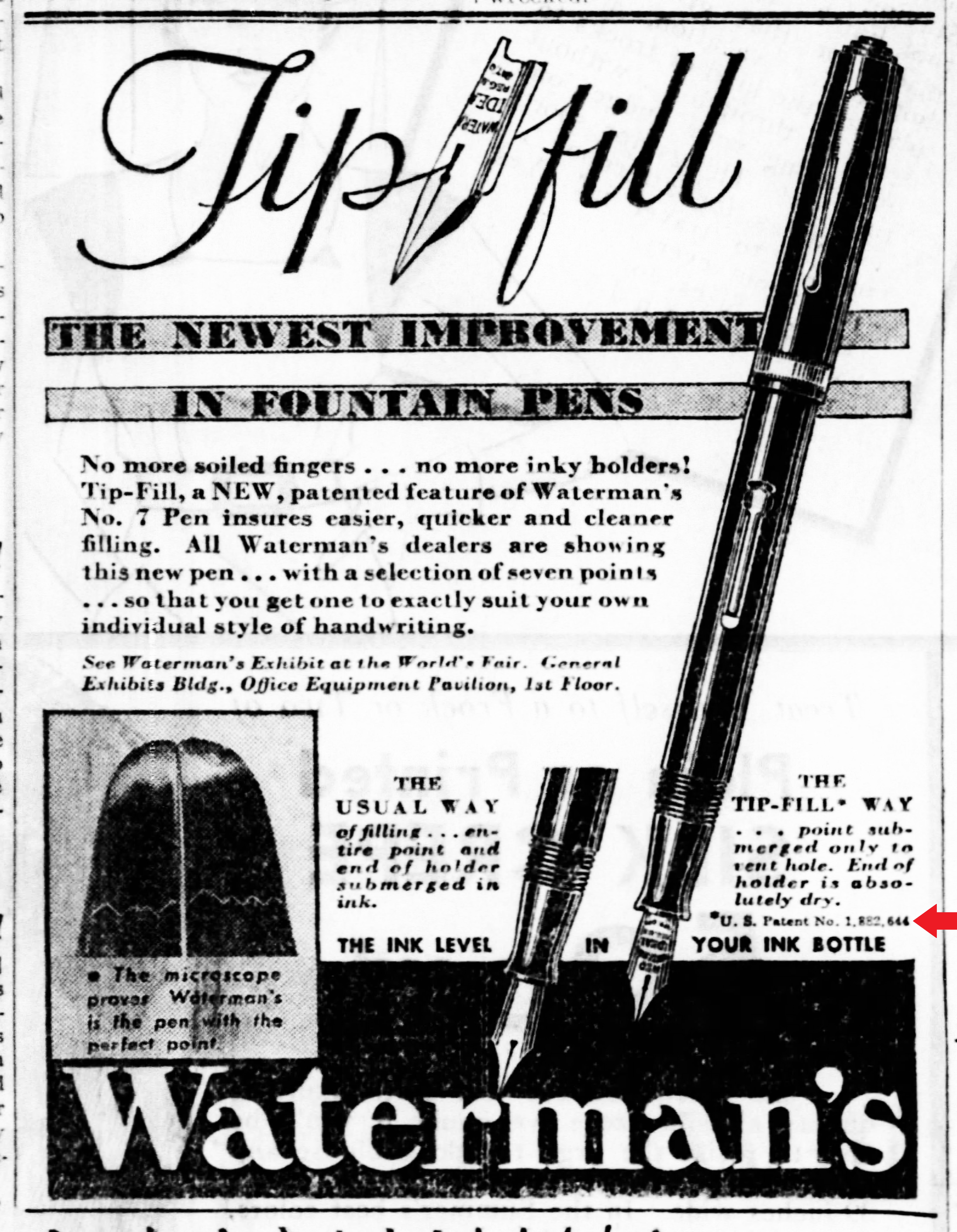 • L’evoluzione di questo primo modello, proposta circa sei anni dopo, a partire dal 1933, fu una penna affatto diversa, e venne anche definita dalla pubblicità come <Improved No.7> (cioè <No.7 migliorata>): di dimensioni leggermente inferiori, in stile elegantemente streamlined, realizzata in celluloide (soltanto nera, per i primi due anni dal debutto), con il codice dei colori dei pennini espresso da un circoletto colorato inserito nel fondello, la stilografica montava il nuovissimo alimentatore “Tip-Fill”. Waterman's Catalog 1933, p.8 (fonte PCA)