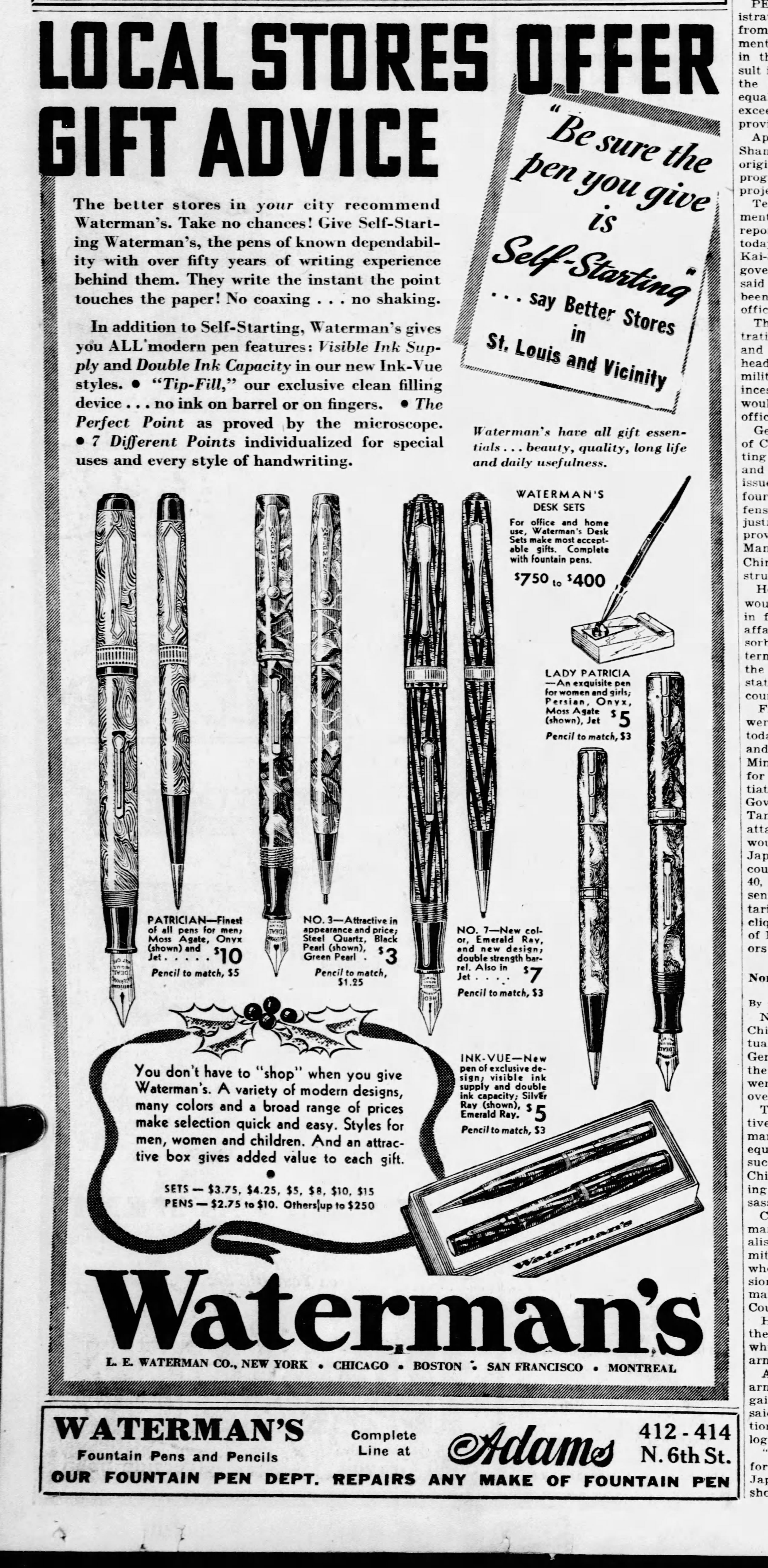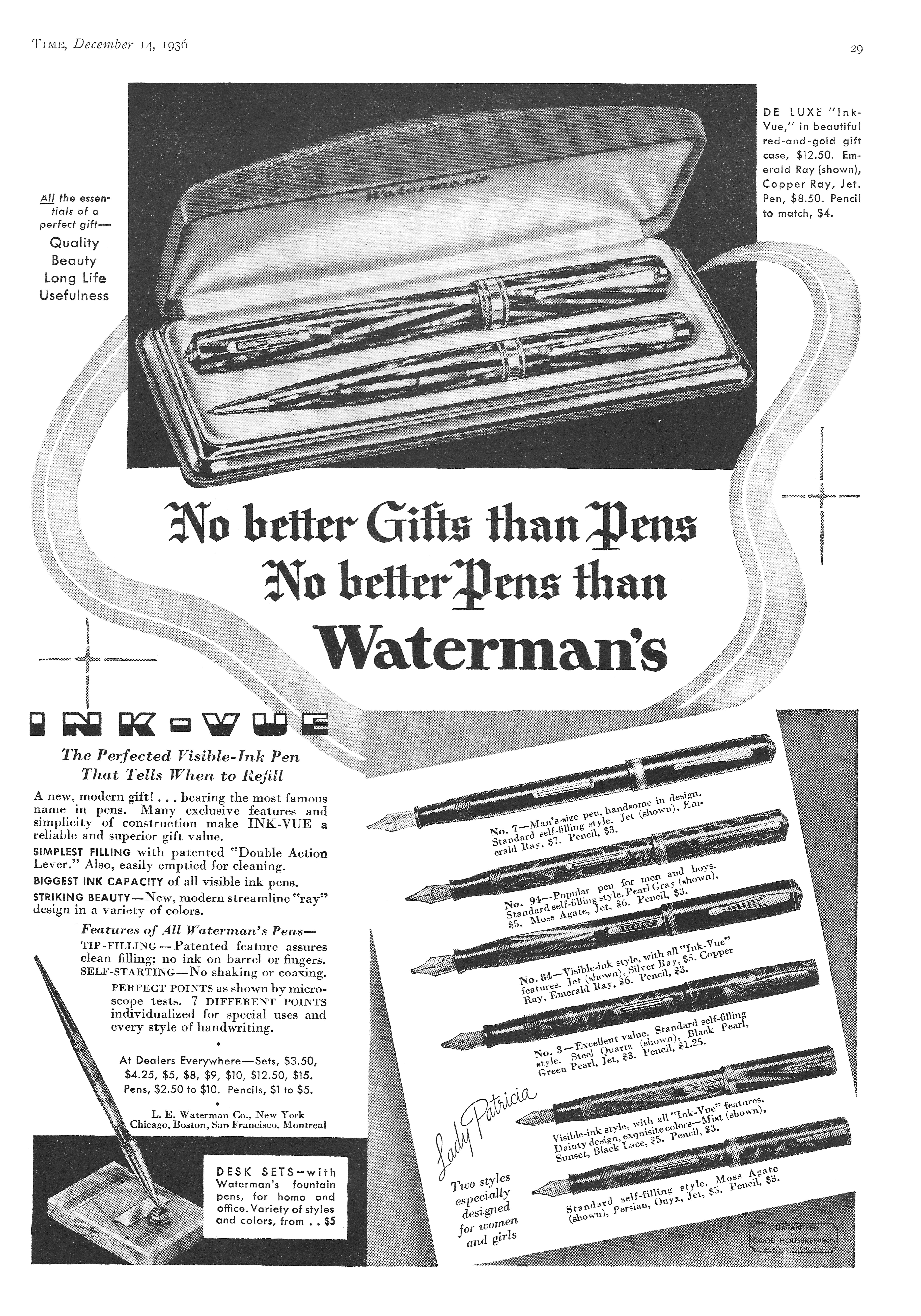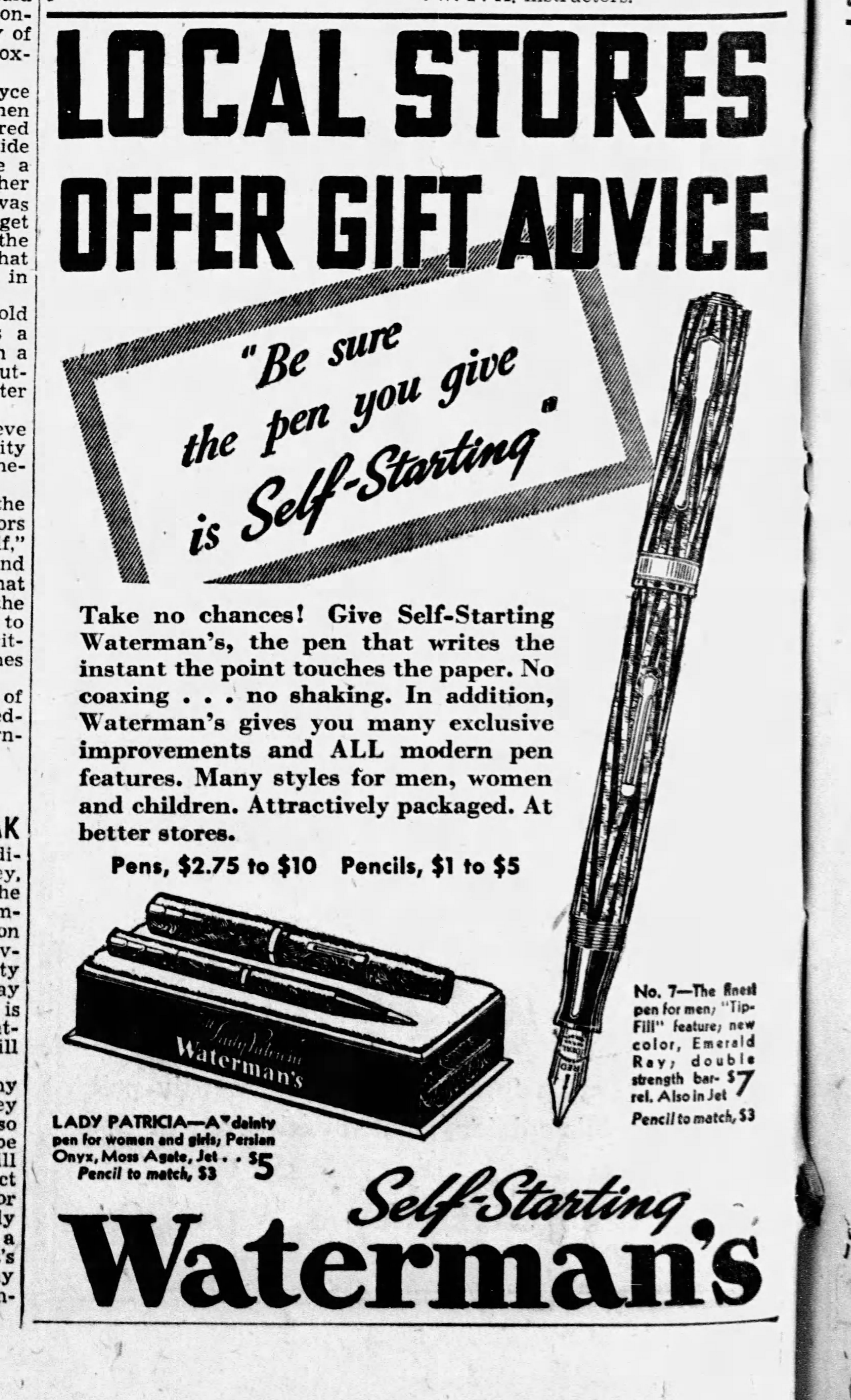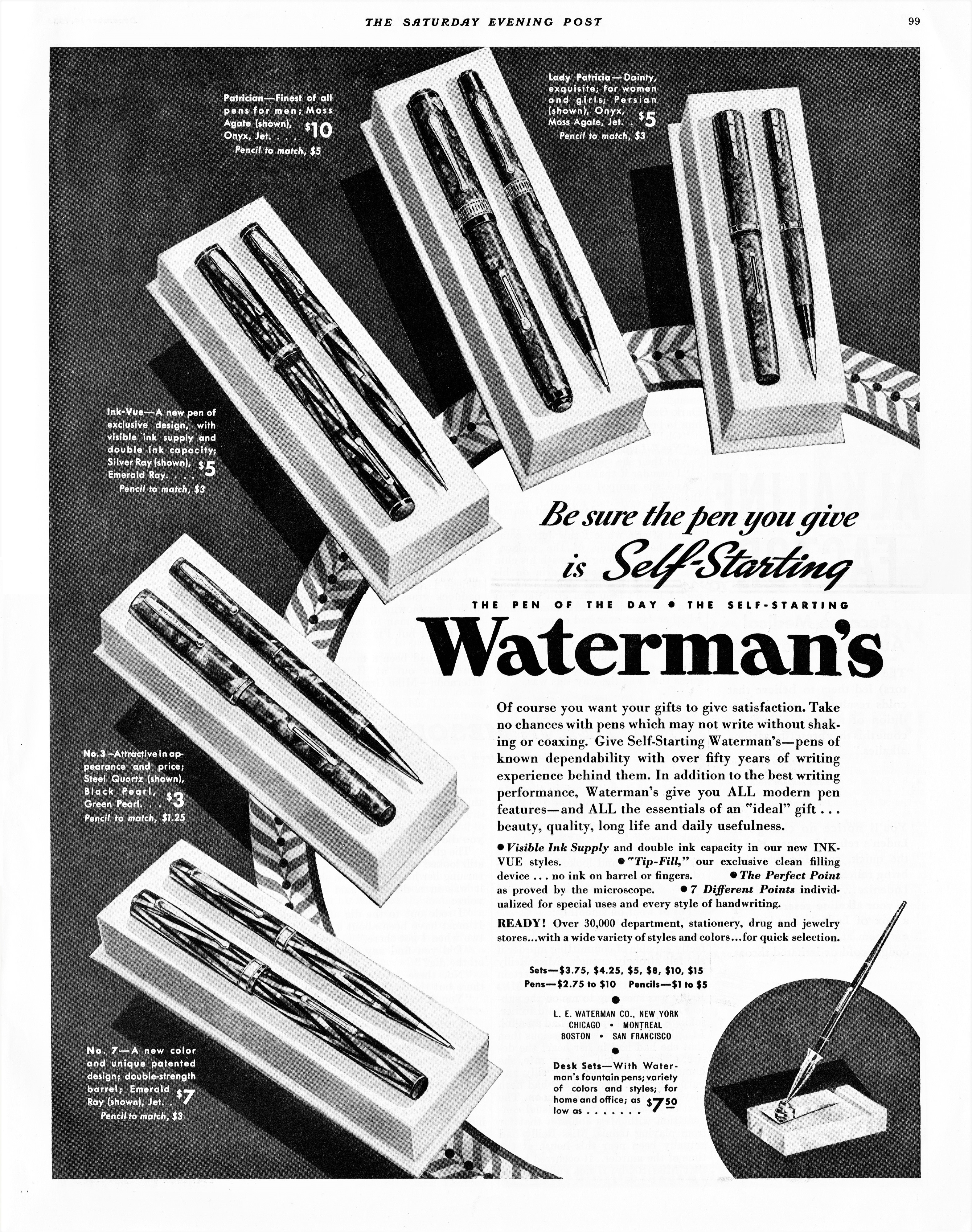 • L’evoluzione di questo primo modello, proposta circa sei anni dopo, a partire dal 1933, fu una penna affatto diversa, e venne anche definita dalla pubblicità come <Improved No.7> (cioè <No.7 migliorata>): di dimensioni leggermente inferiori, in stile elegantemente streamlined, realizzata in celluloide (soltanto nera, per i primi due anni dal debutto), con il codice dei colori dei pennini espresso da un circoletto colorato inserito nel fondello, la stilografica montava il nuovissimo alimentatore “Tip-Fill”. Waterman's Catalog 1933, p.8 (fonte PCA)