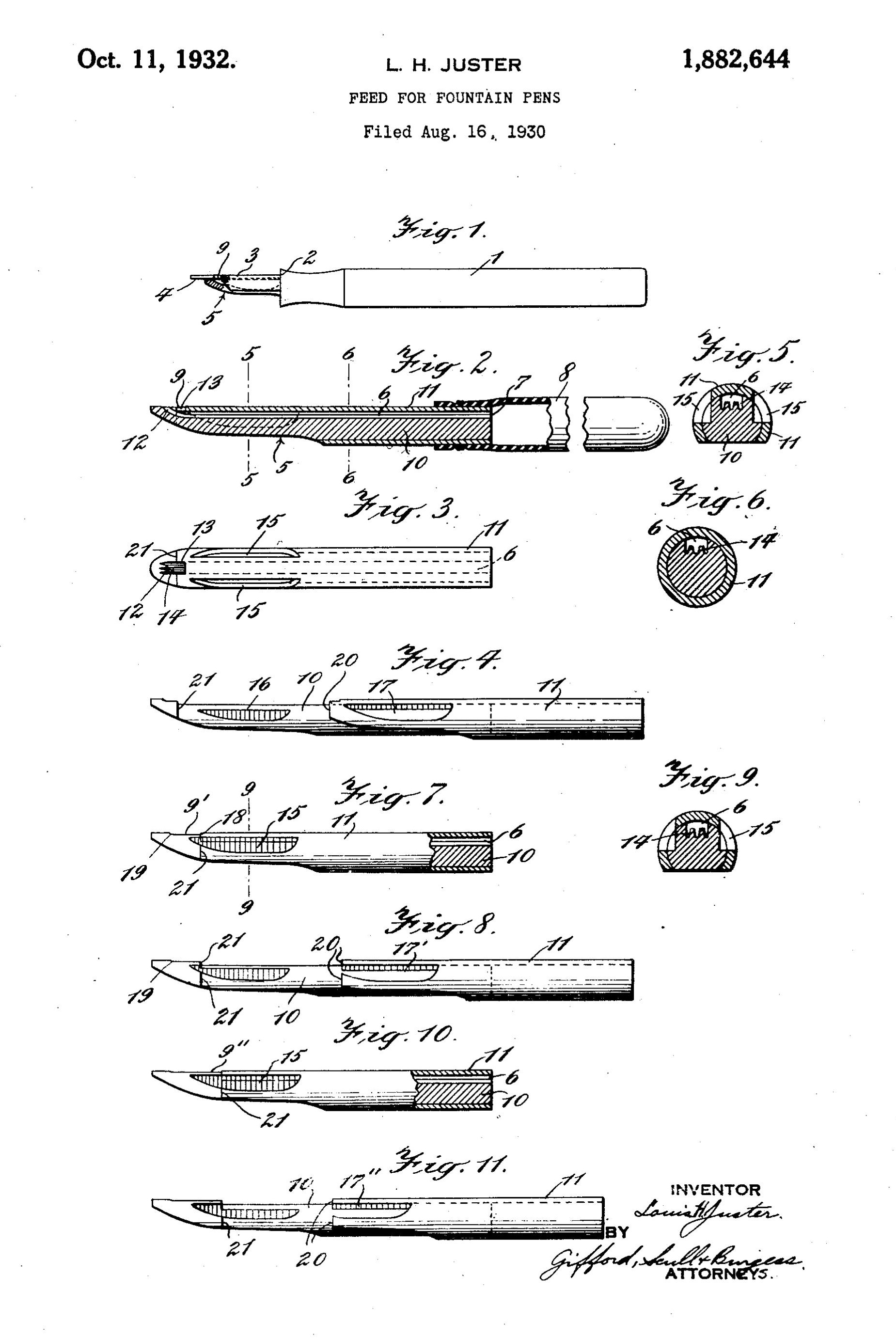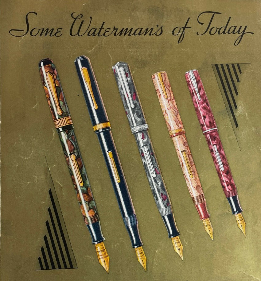 • Il primo modello (uscito nel 1927) era di grandi dimensioni (pari a quelle di una #55), posizionato all’epoca del lancio al top della gamma della Casa, in un tradizionale stile flat top (https://www.fountainpen.it/Flat_top), realizzato nella esclusiva ebanite Ripple, con un anellino colorato sul cappuccio che identificava il pennino montato. 1927-09-Waterman-Ripple (dal Wiki)