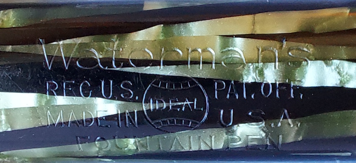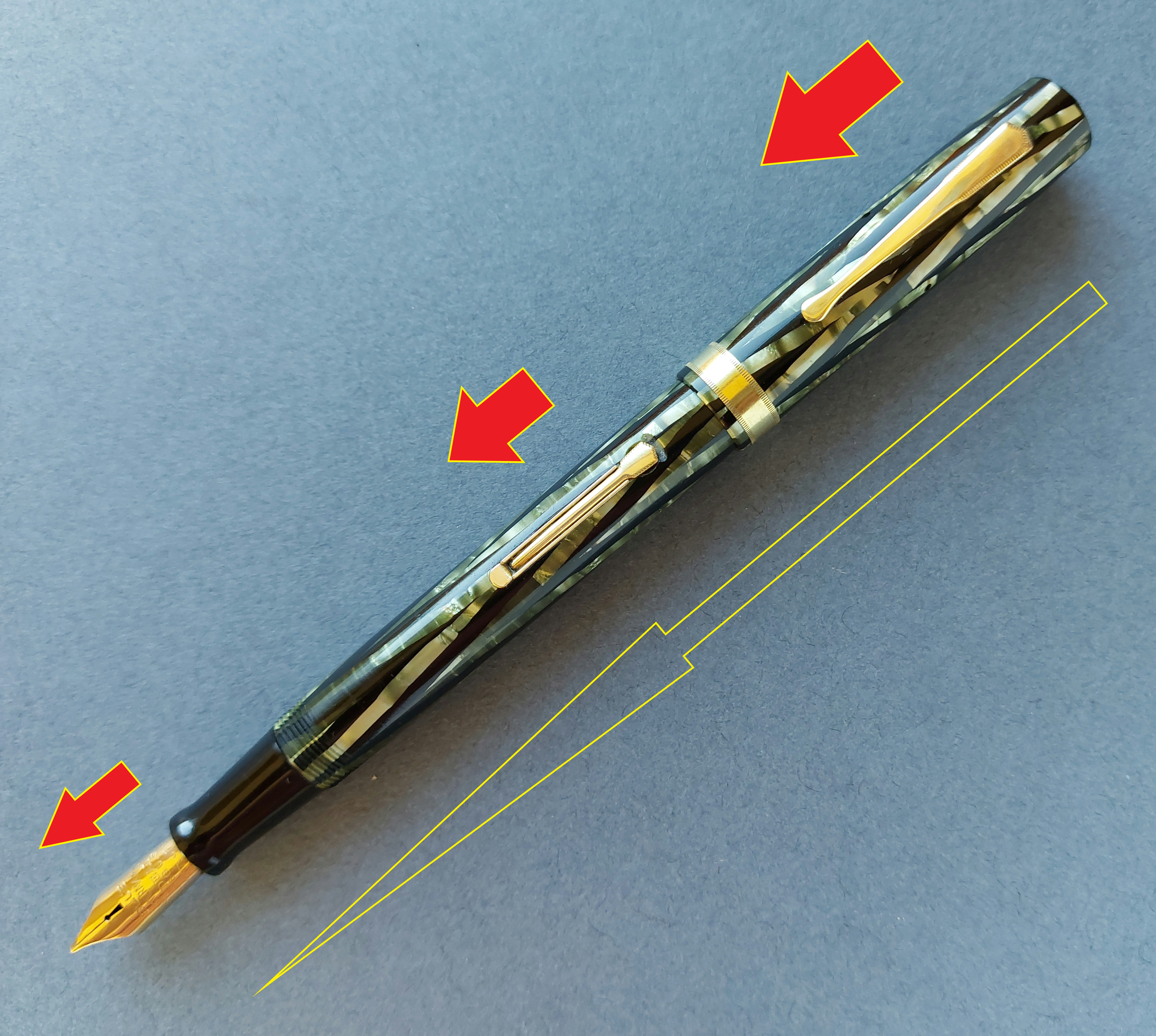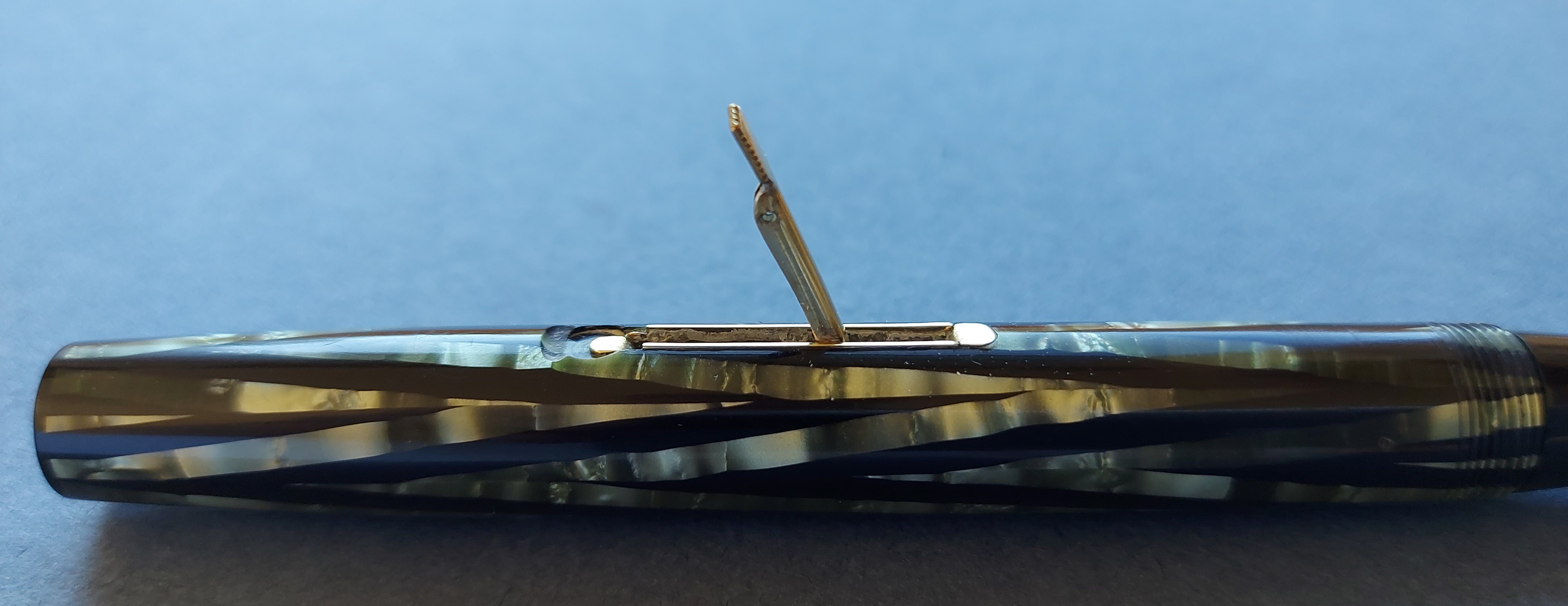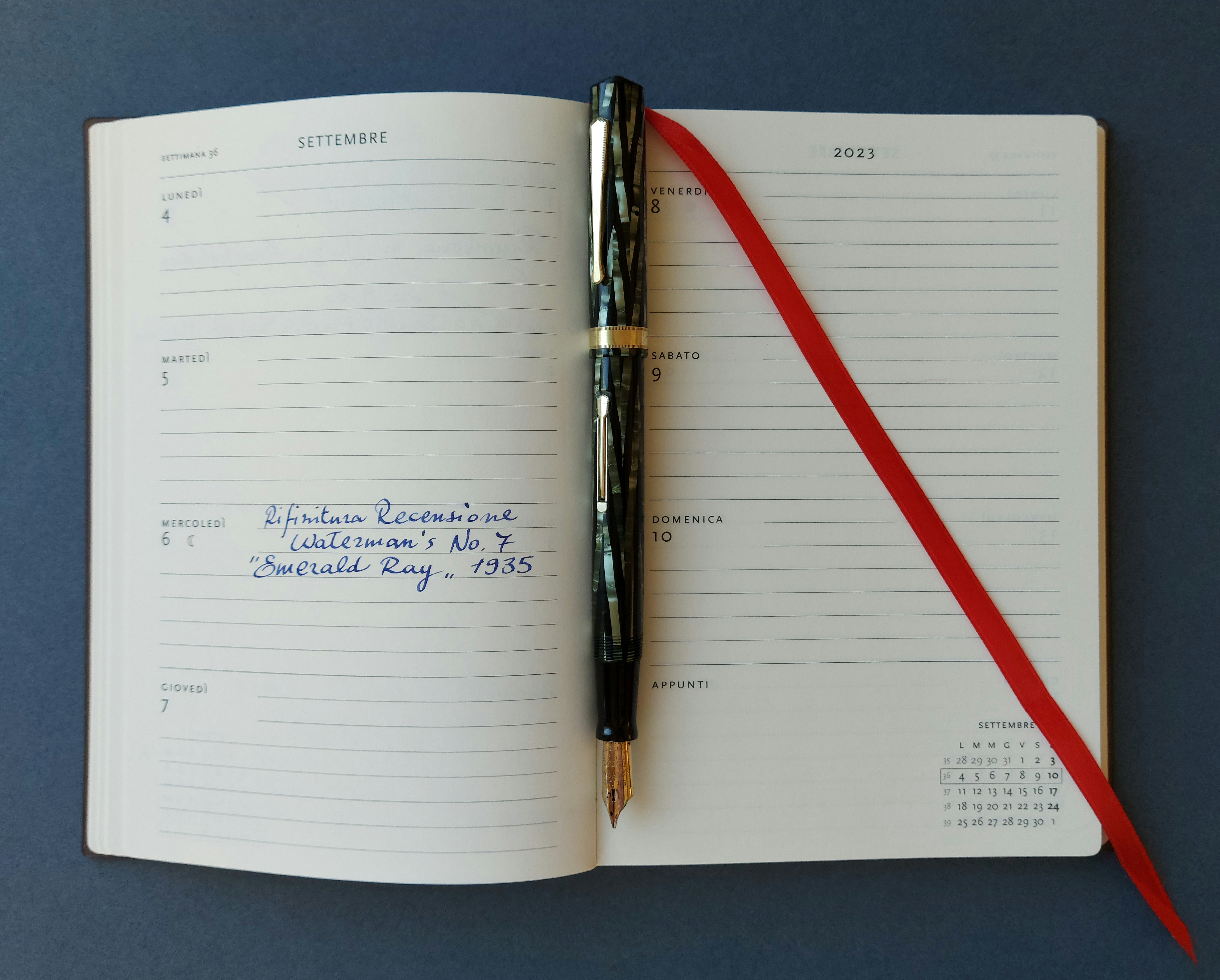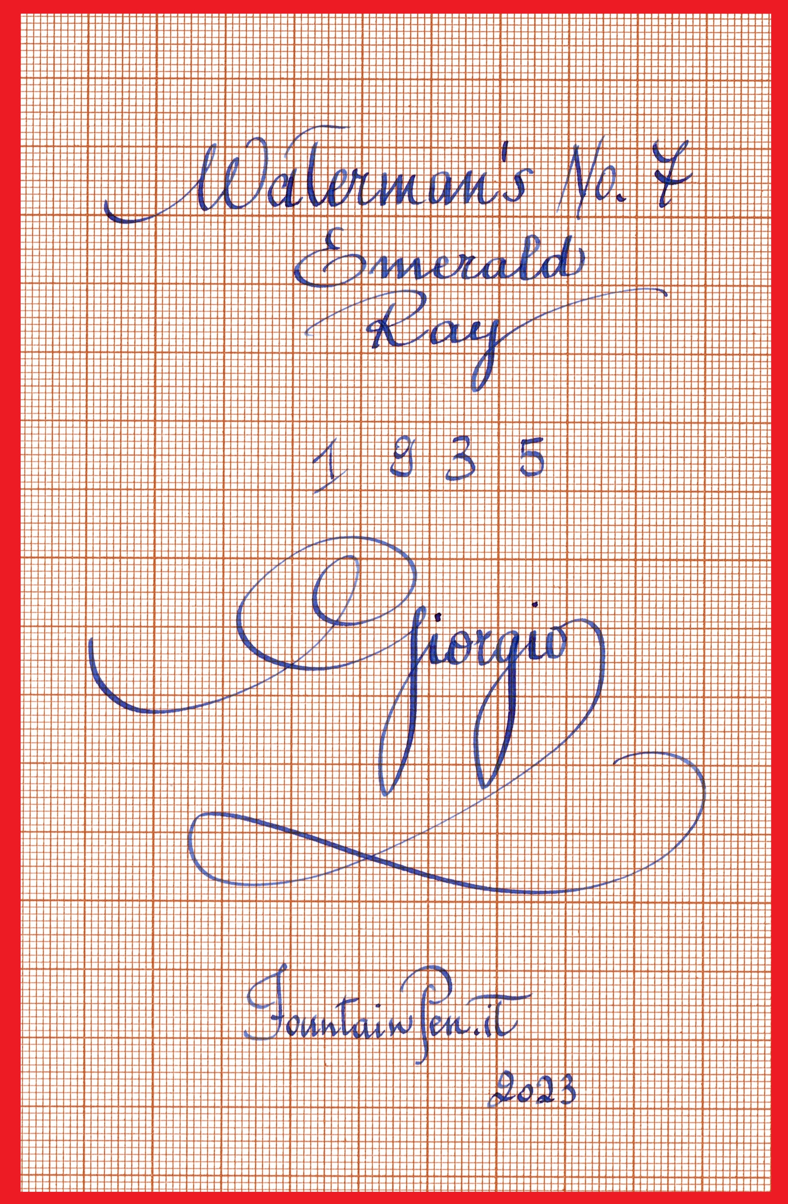 La penna oggetto della mia recensione è una <No.7> appartenente a questa seconda tipologia nell’unica colorazione diversa dal nero prodotta dalla Casa, che fu presentata nel 1935 in occasione del lancio della esclusiva celluloide brevettata “RAY” (che andrà ad equipaggiare anche la nuova gamma “Ink-Vue”, le prime penne “trasparenti” della Waterman).