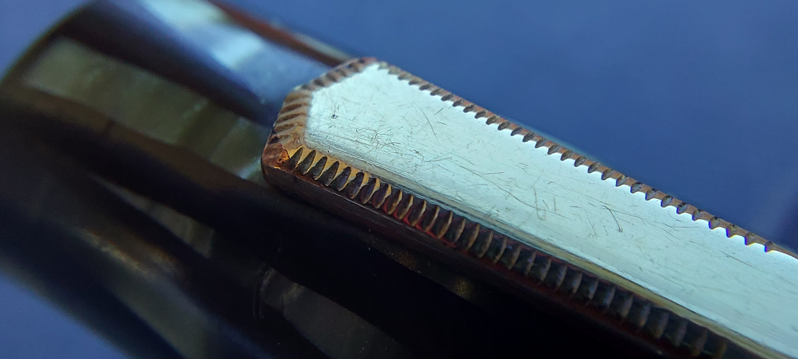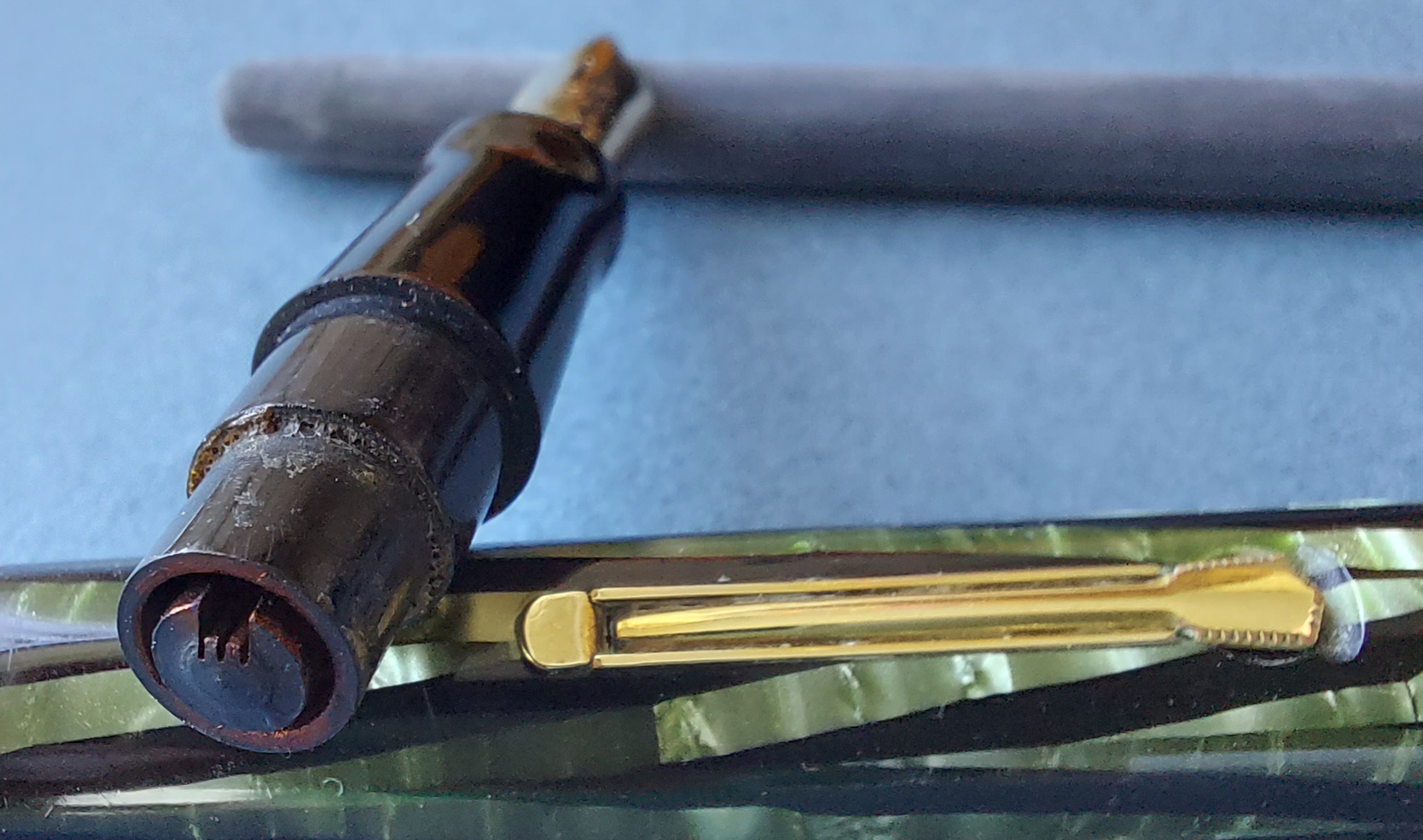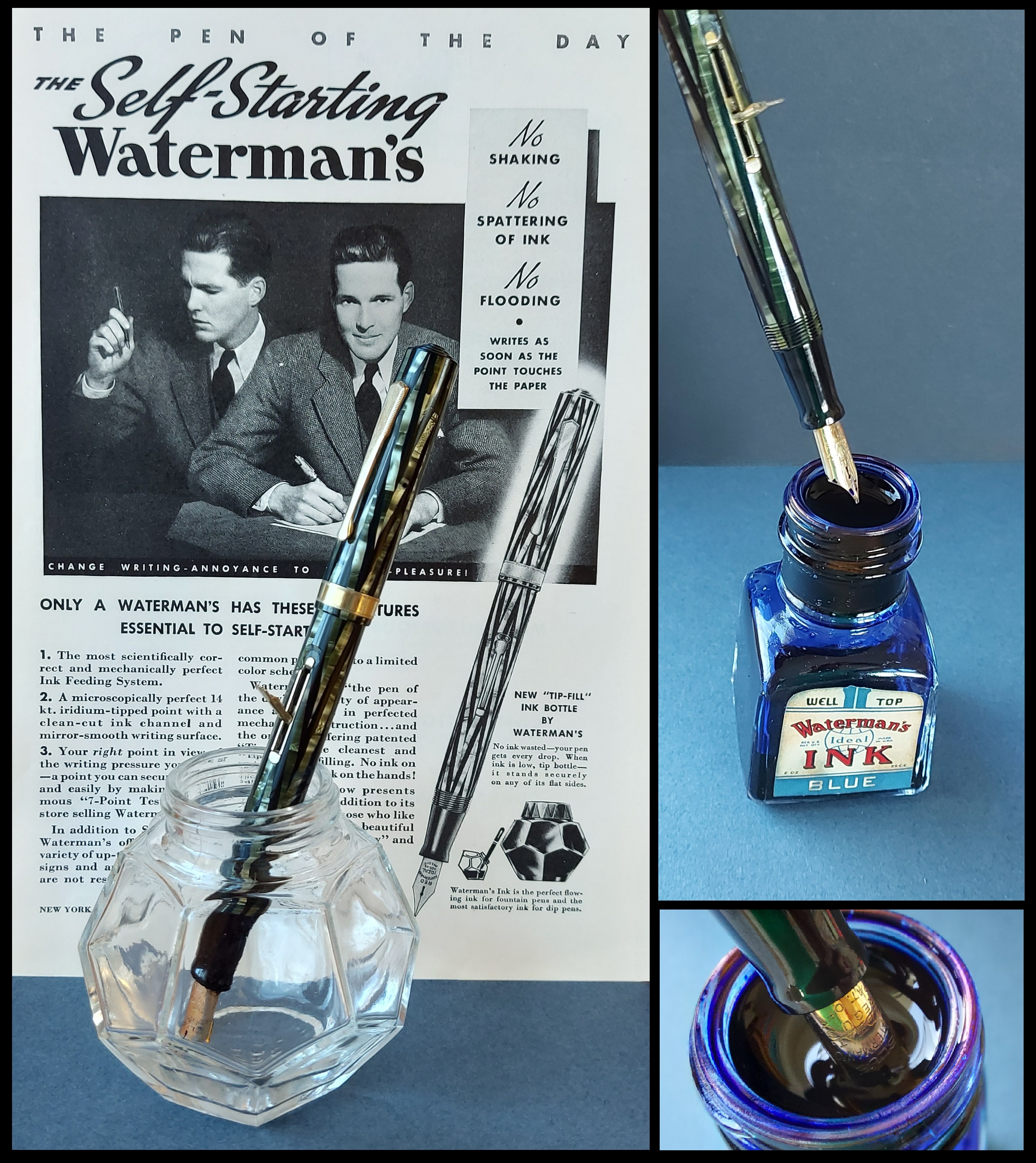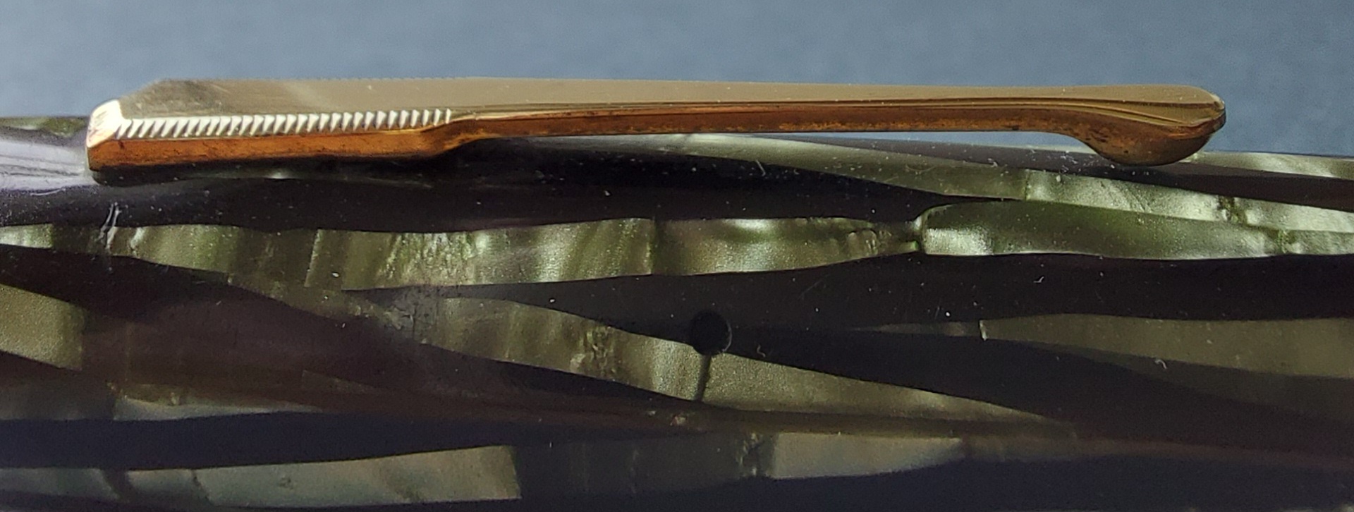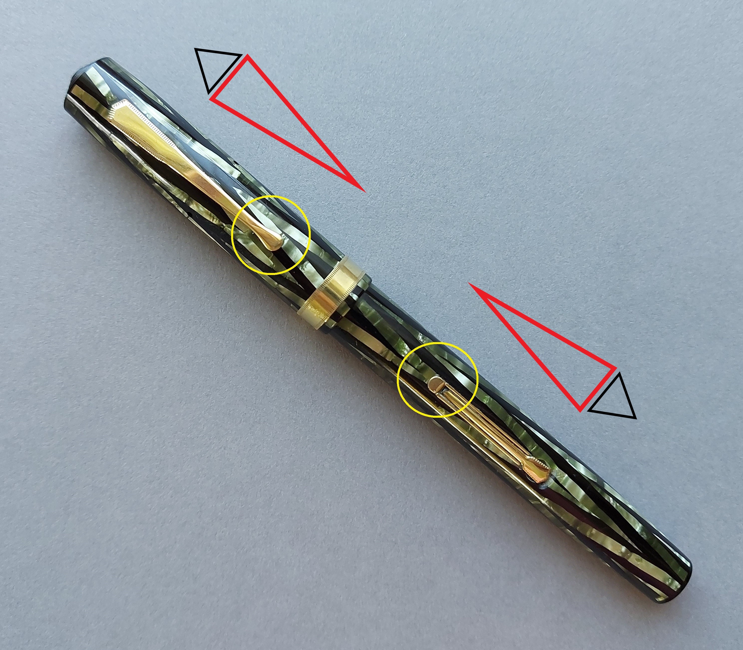 La penna oggetto della mia recensione è una <No.7> appartenente a questa seconda tipologia nell’unica colorazione diversa dal nero prodotta dalla Casa, che fu presentata nel 1935 in occasione del lancio della esclusiva celluloide brevettata “RAY” (che andrà ad equipaggiare anche la nuova gamma “Ink-Vue”, le prime penne “trasparenti” della Waterman).