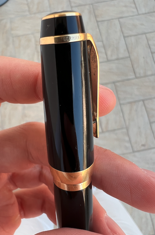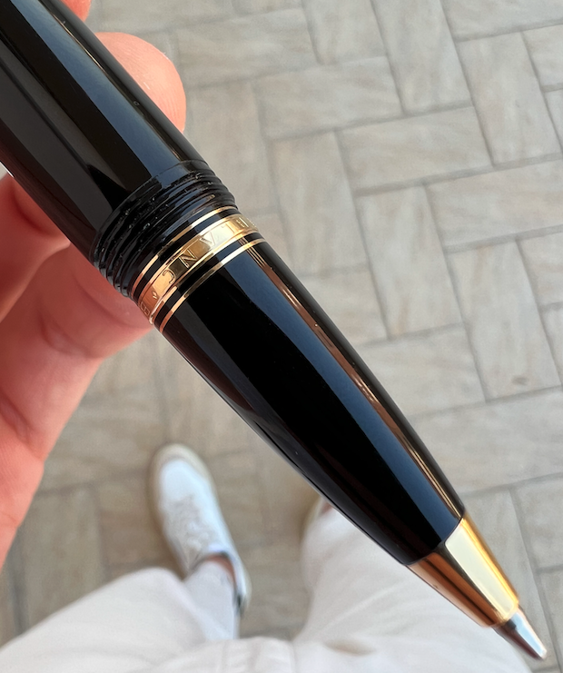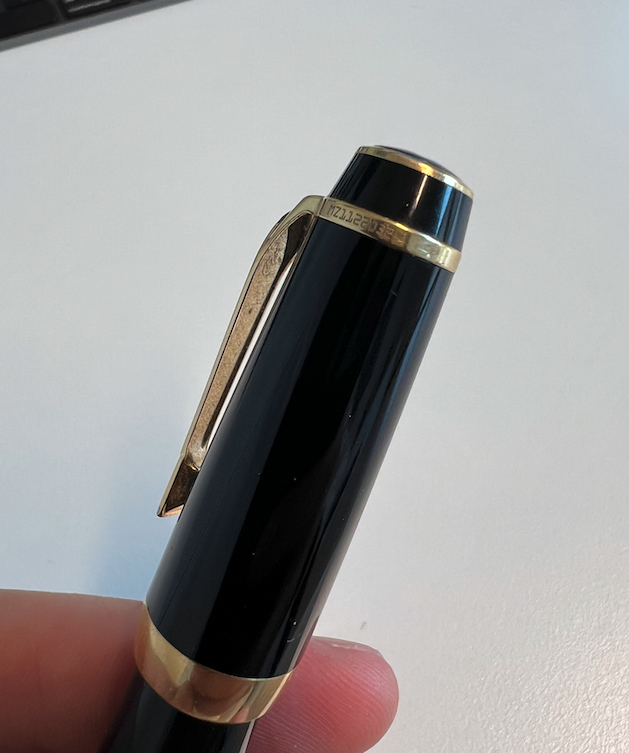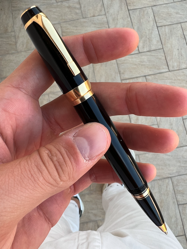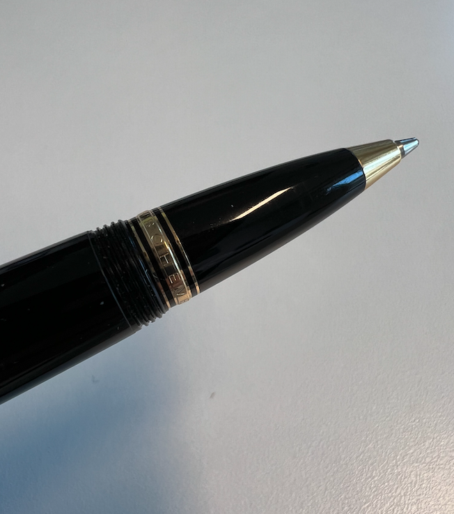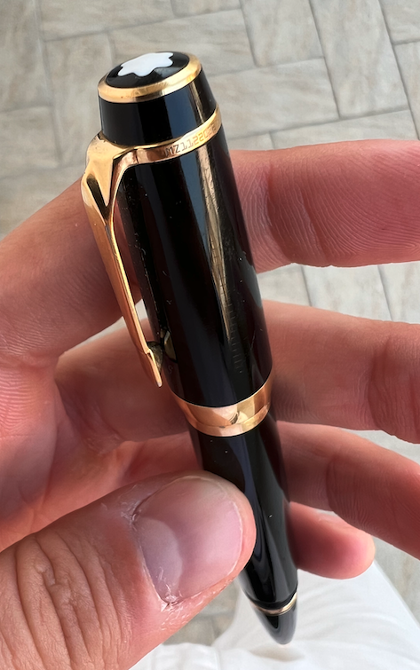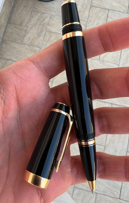 La penna in questione è qui sotto. Ovviamente è vissuta, usata allo sfinimento da me negli ultimi 15 anni come vi dicevo. La cartuccia interna originale era marchiata Montblanc ma ricordo di averla sostituita con una in plastica presa da una penna a caso almeno 12/13 anni fa. Operazione che appunto faccio almeno una volta ogni 2 anni.