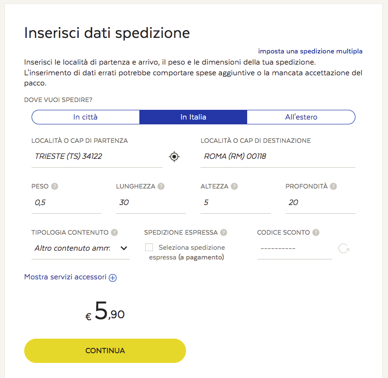 Poste delivery WEB (fai tutto online) a € 5,90 a cui aggiungere € 1,00 per ritiro presso di te (facoltativo, puoi portare tu il