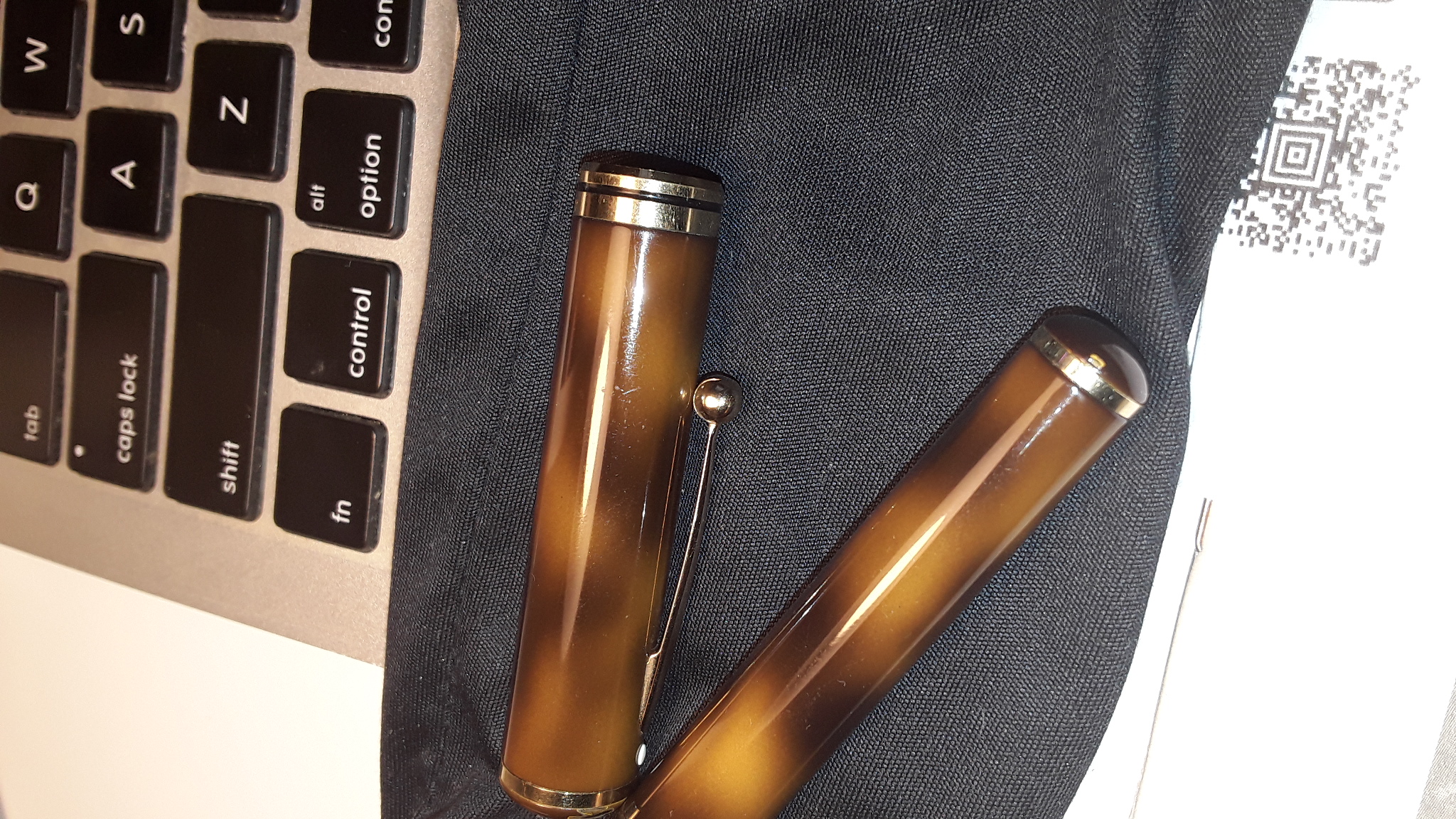 Per intanto scrive veramente bene...il pennino, 18kt, dovrebbe essere un F....non ho trovato nessun riscontro a questa ipotesi....La stoprovando, sempre per intinzione, con inchiostro Montblanc Bordeaux...non penso sia il piu adatto, troppo fluido credo, ma le prime impressioni sono molto buone. La penna da una bella impressione di solidità e sembra pesare 36gr completamente scarica, con la sola cartuccia originale vuota......lo so, dovrei imparare a fare foto migliori...scusatemi...r