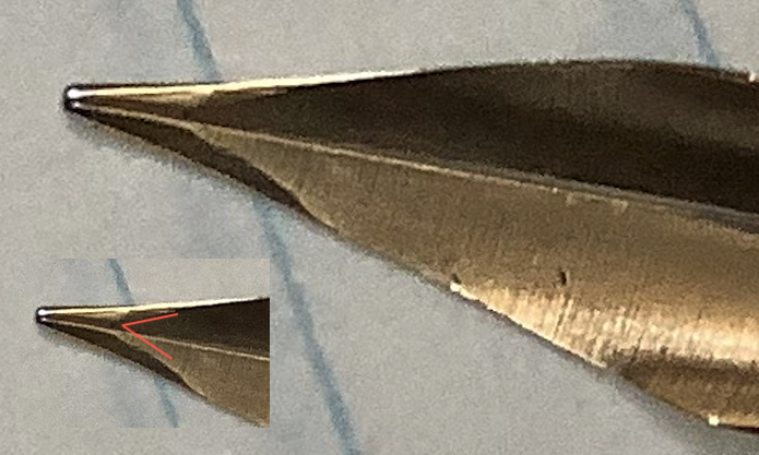 Come dicevo altrove, avevo appunto letto che anche al giorno d'oggi ancora si usa modificare il foro in modo da allungare il taglio tra i rebbi, il ché aggiungerebbe un po' di flessibilità aumentando la lunghezza della parte "libera" dei rebbi. Il foro a chiave farebbe appunto questo, dato che la parte tonda resta dov'è normalmente il foro, e il taglio a chiave si estende indietro verso il piede del pennino.