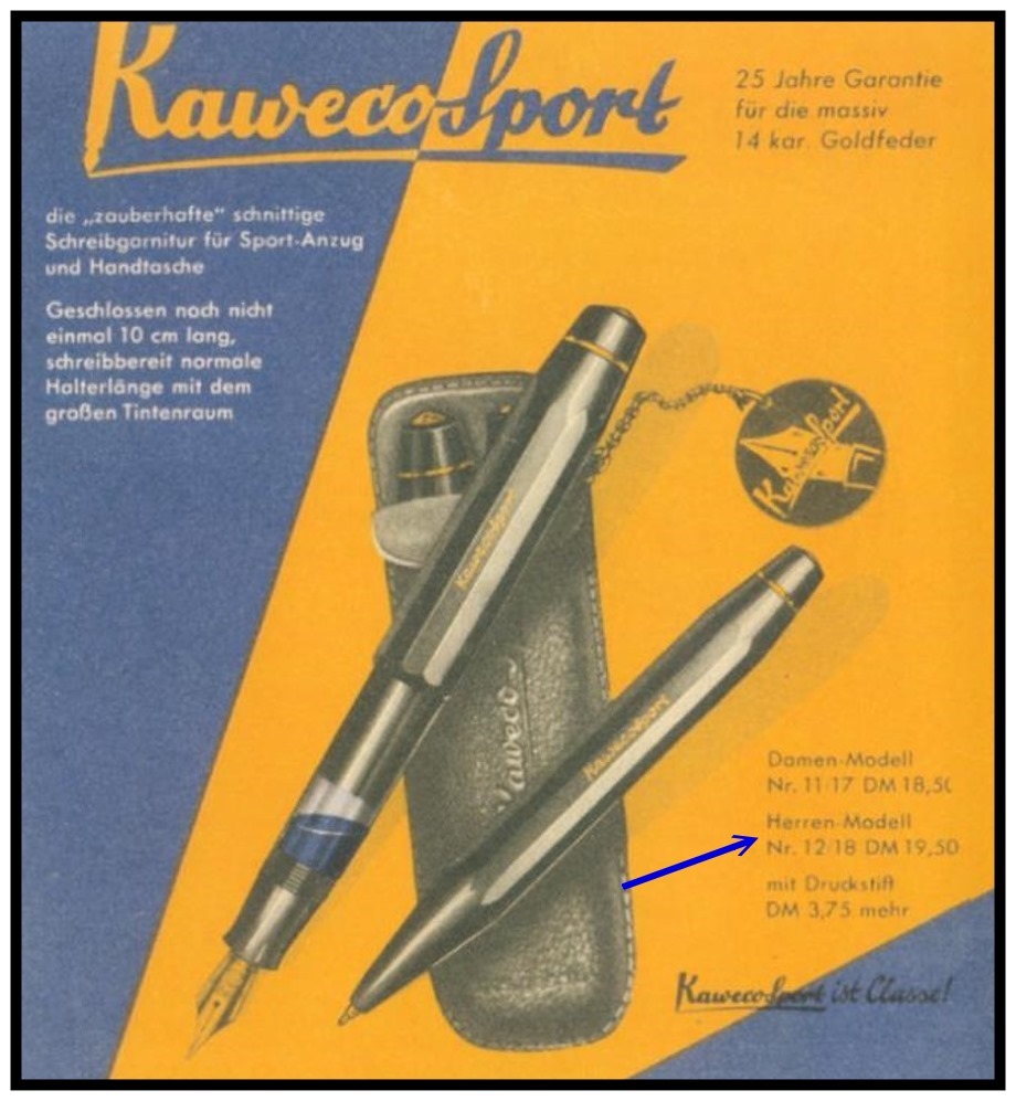 Ed è in quell'anno (almeno credo) che la Kaweco, nota marca tedesca di stilografiche, opera la ristilizzazione del modello Sport, introducendo la versione lady e, soprattutto, mutando il colore della finestrella semitrasparente per il controllo del livello d'inchiostro da verde ad azzurro (tale dettaglio verrà riproosto in seguito nella versione 12G e V16.